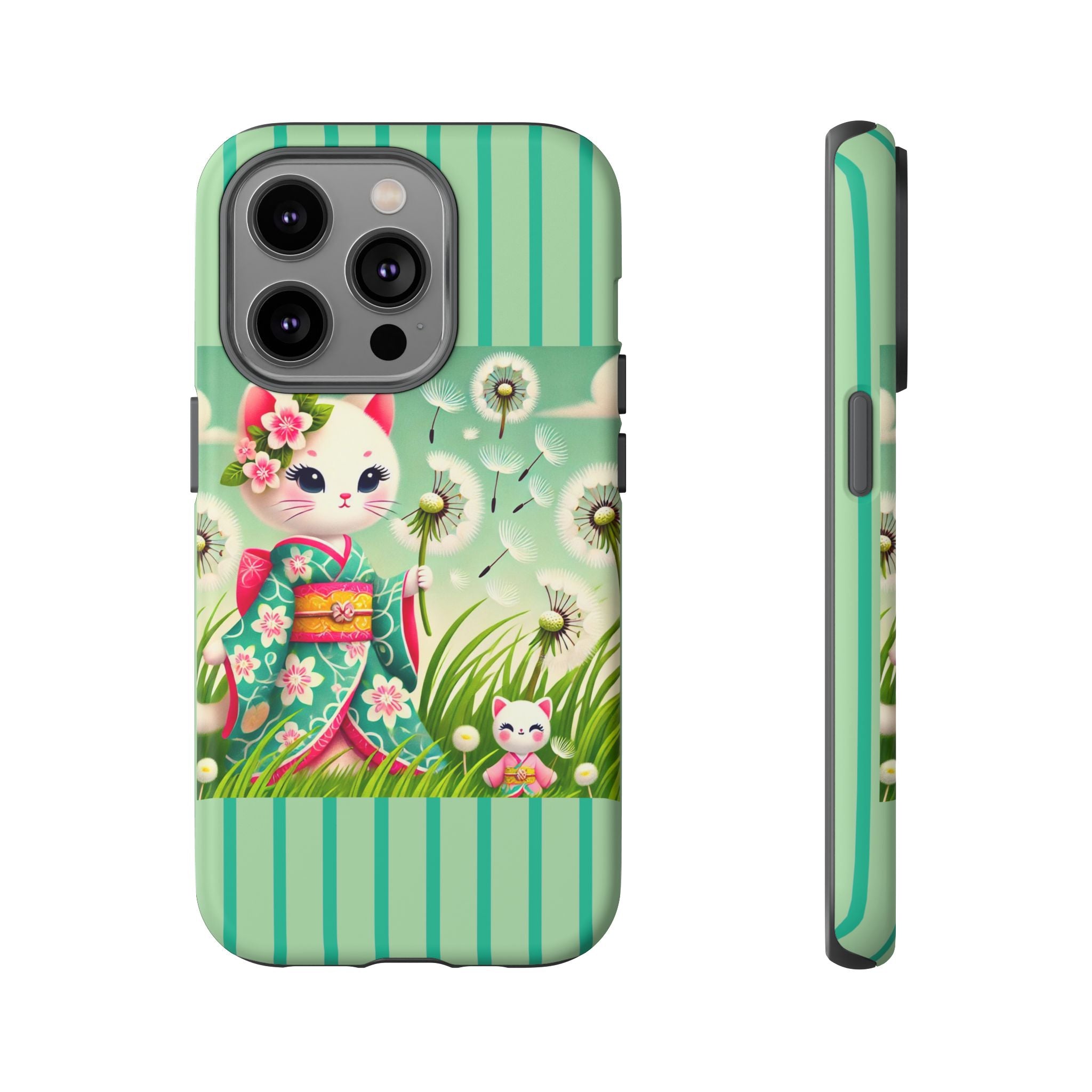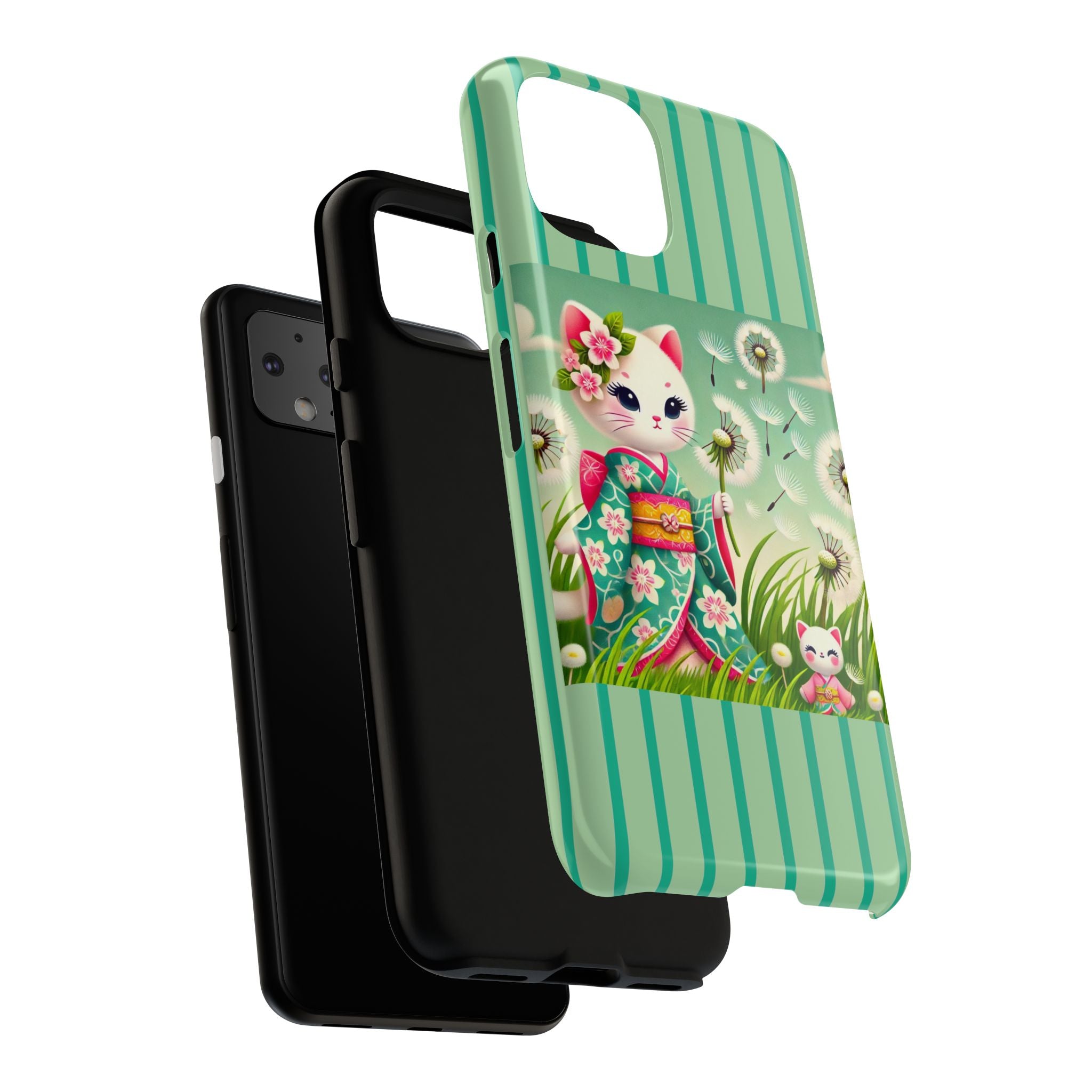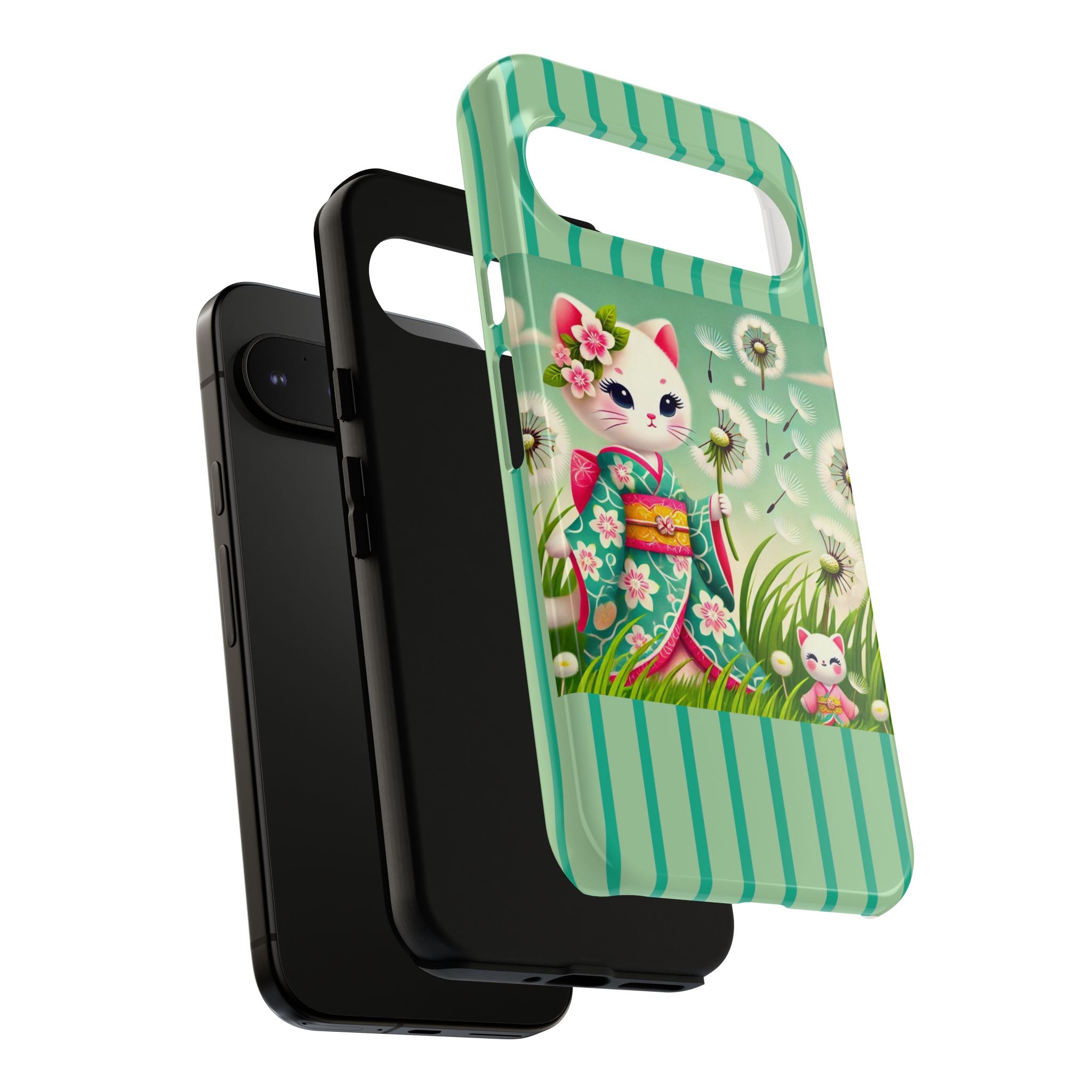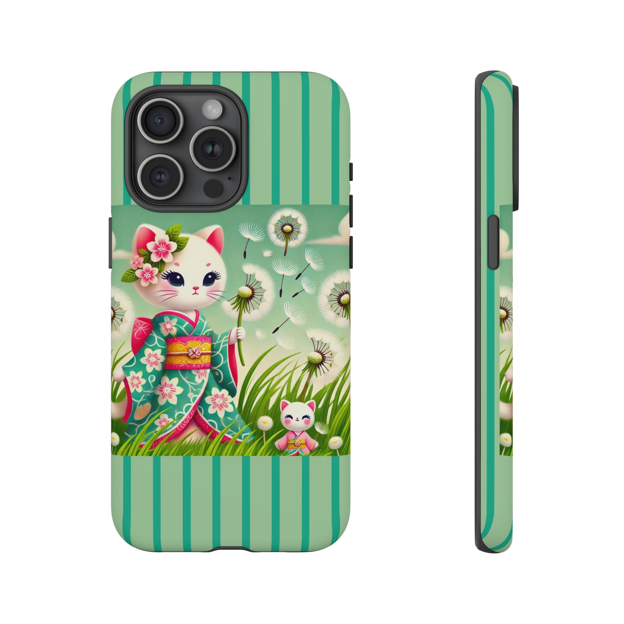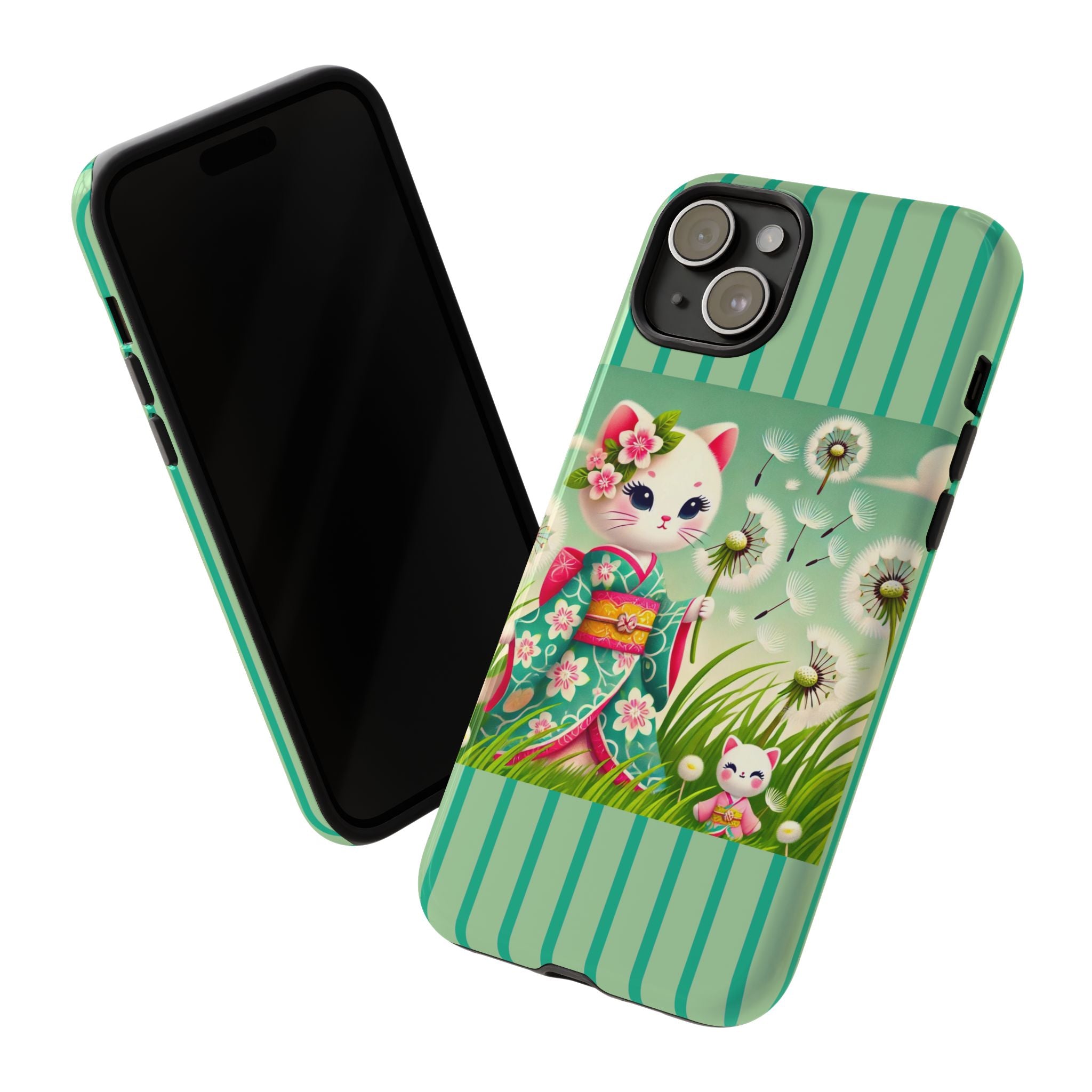 Add a touch of calm charm to your day with our Geisha Kitten and the Dandelion Phone Cases. Designed for iPhone, Samsung Galaxy, and Google Pixel devices, these premium-quality cases combine everyday protection with the gentle beauty of whimsical art. The design features a serene illustration of a geisha kitten and her tiny kitten doll, both dressed in matching kimonos, surrounded by tall swaying grass and drifting dandelion seeds. The soft colors and delicate details create a dreamy, tranquil mood that transforms your phone into a peaceful work of art.