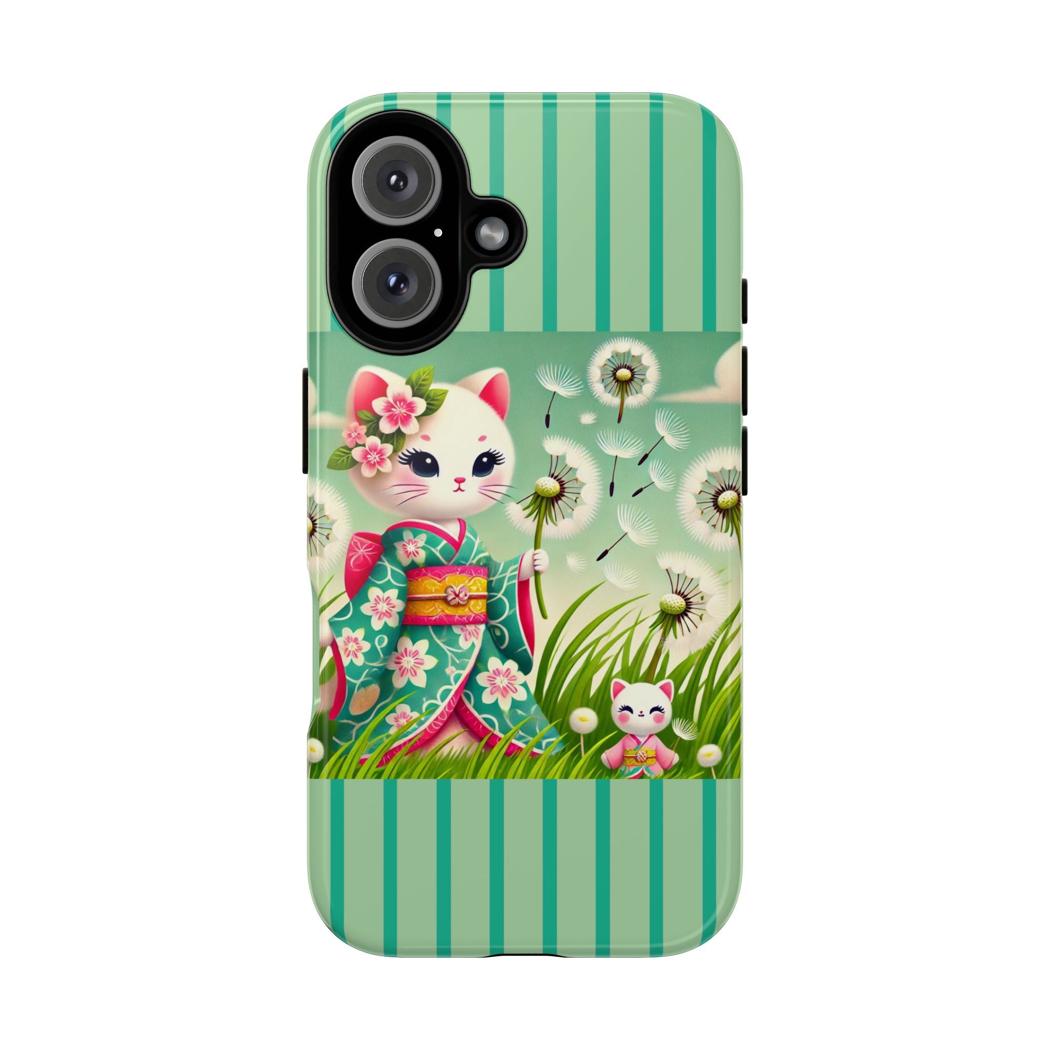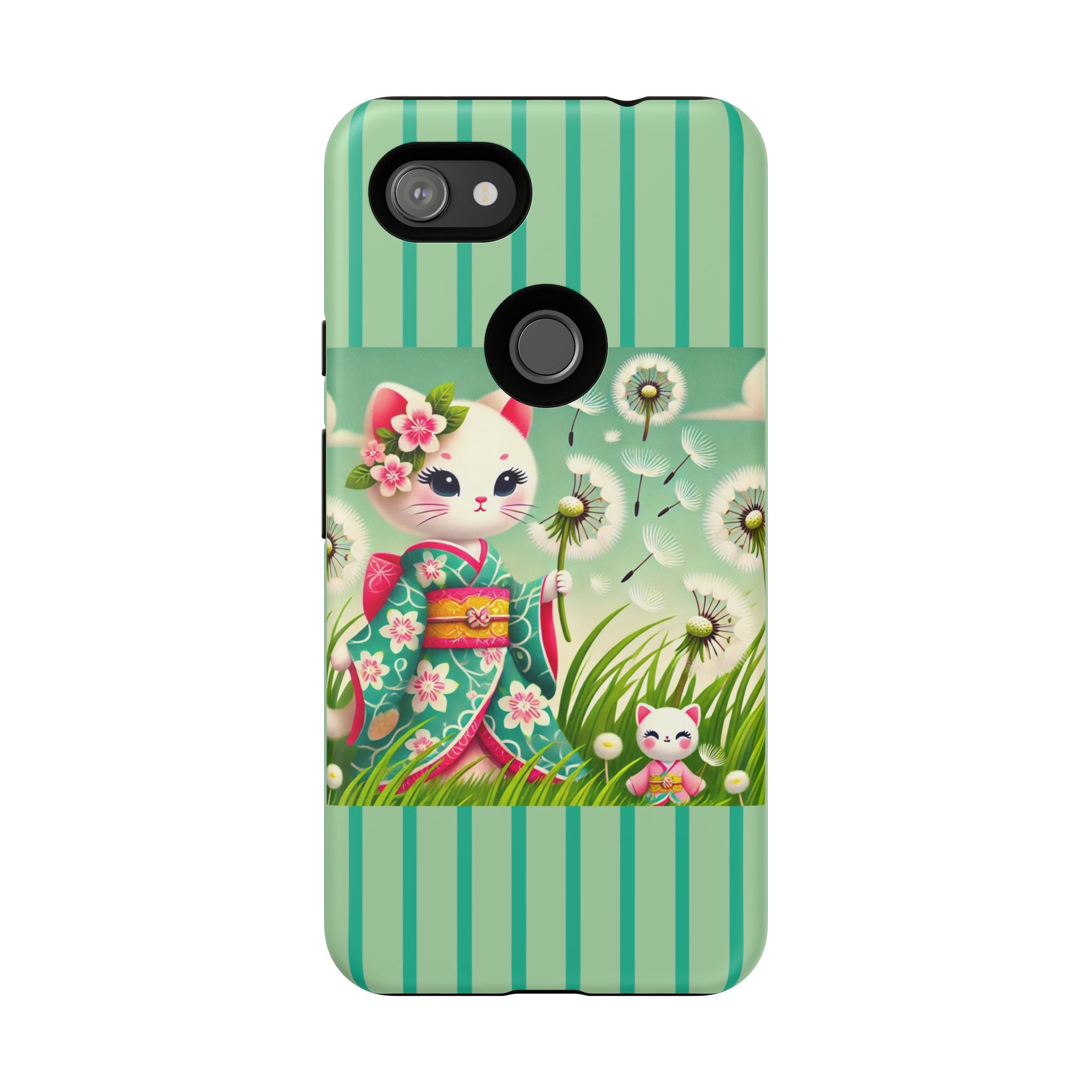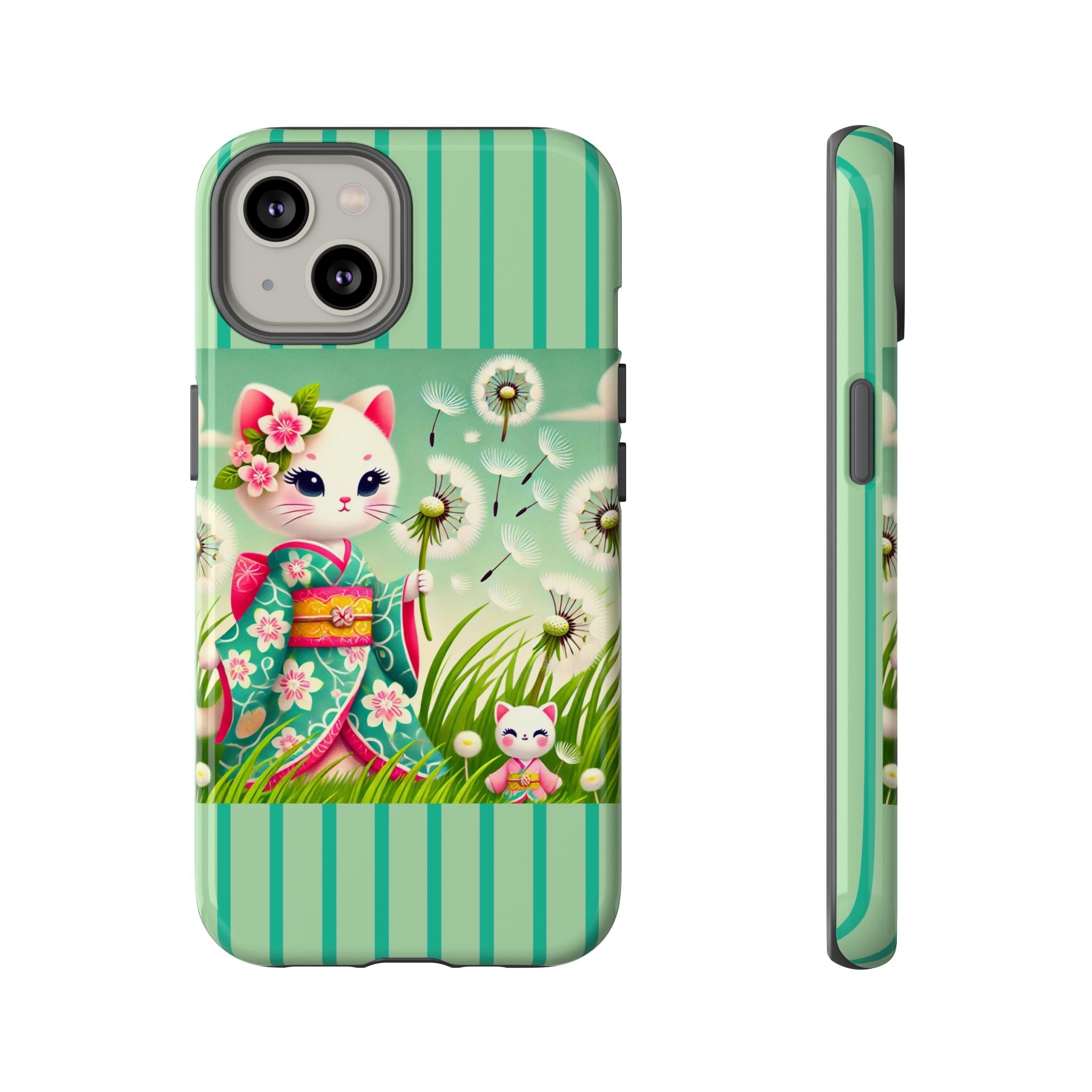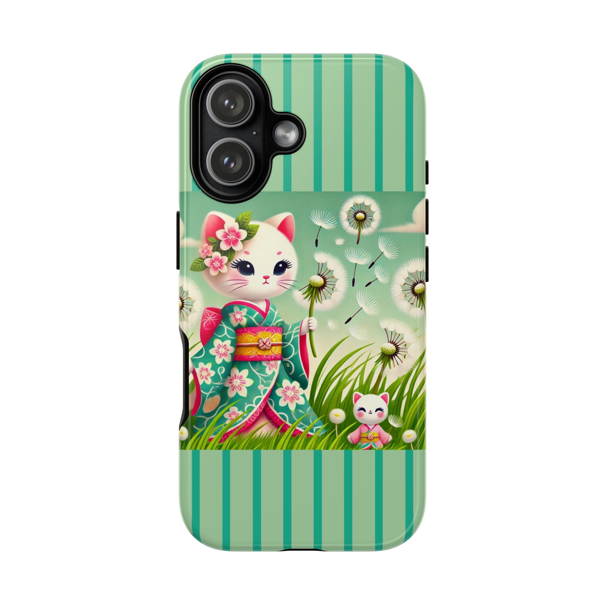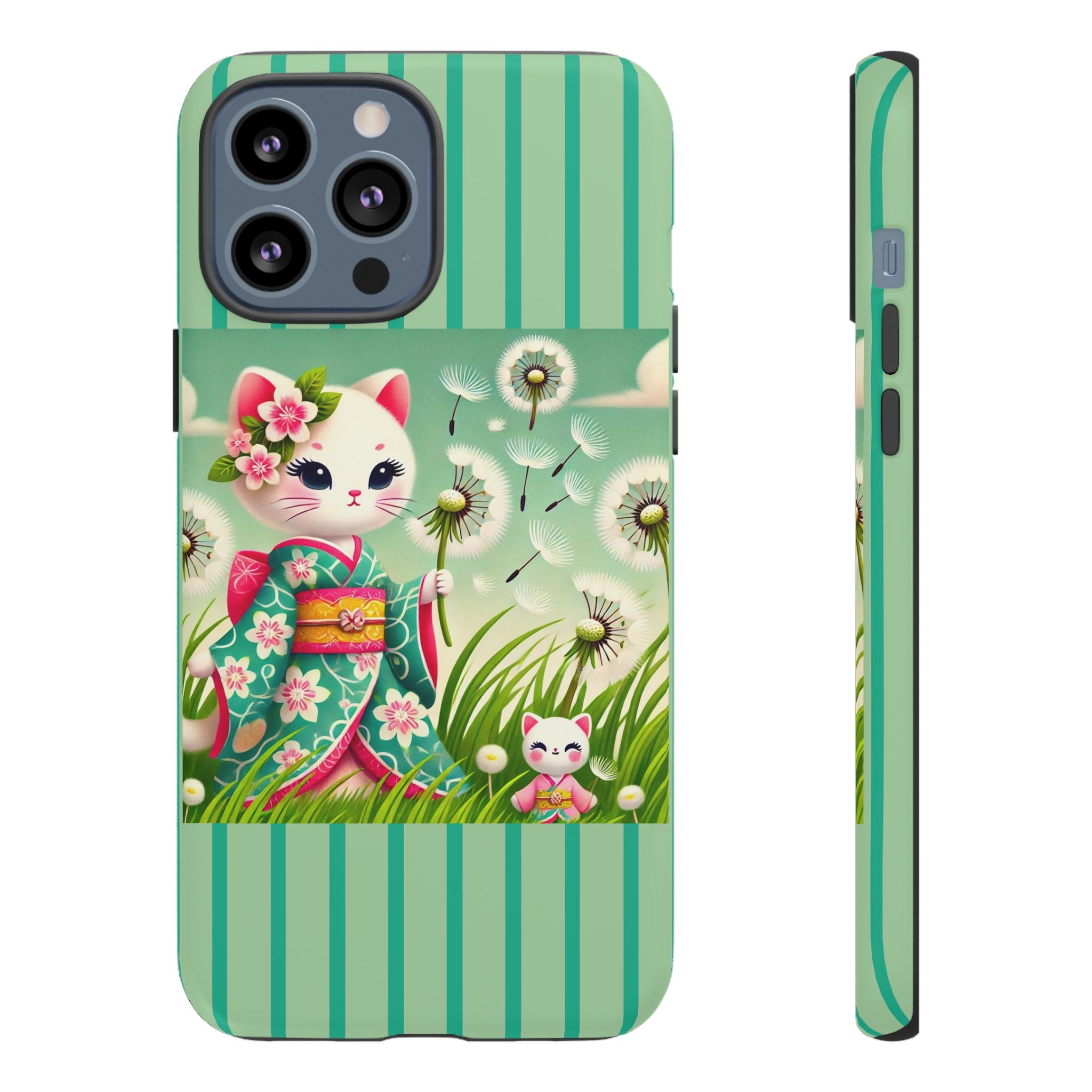 Add a touch of calm charm to your day with our Geisha Kitten and the Dandelion Phone Cases. Designed for iPhone, Samsung Galaxy, and Google Pixel devices, these premium-quality cases combine everyday protection with the gentle beauty of whimsical art. The design features a serene illustration of a geisha kitten and her tiny kitten doll, both dressed in matching kimonos, surrounded by tall swaying grass and drifting dandelion seeds. The soft colors and delicate details create a dreamy, tranquil mood that transforms your phone into a peaceful work of art.