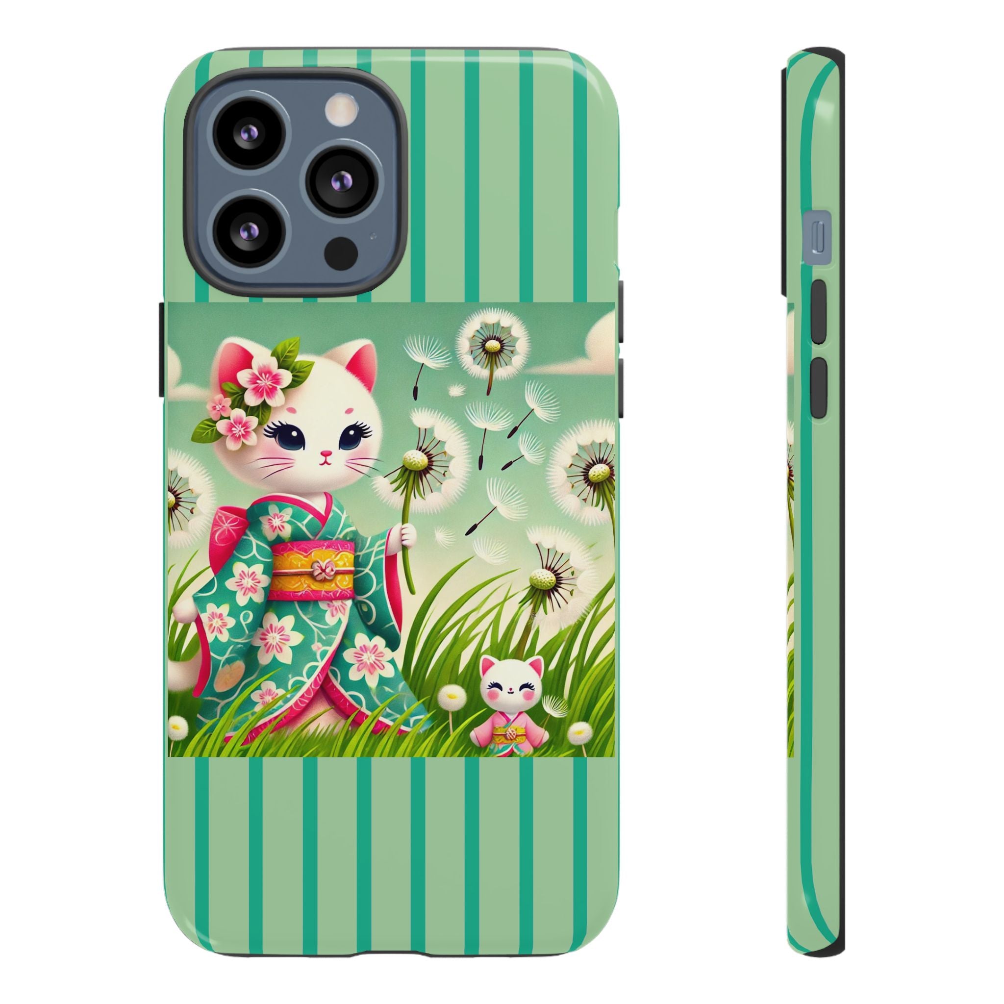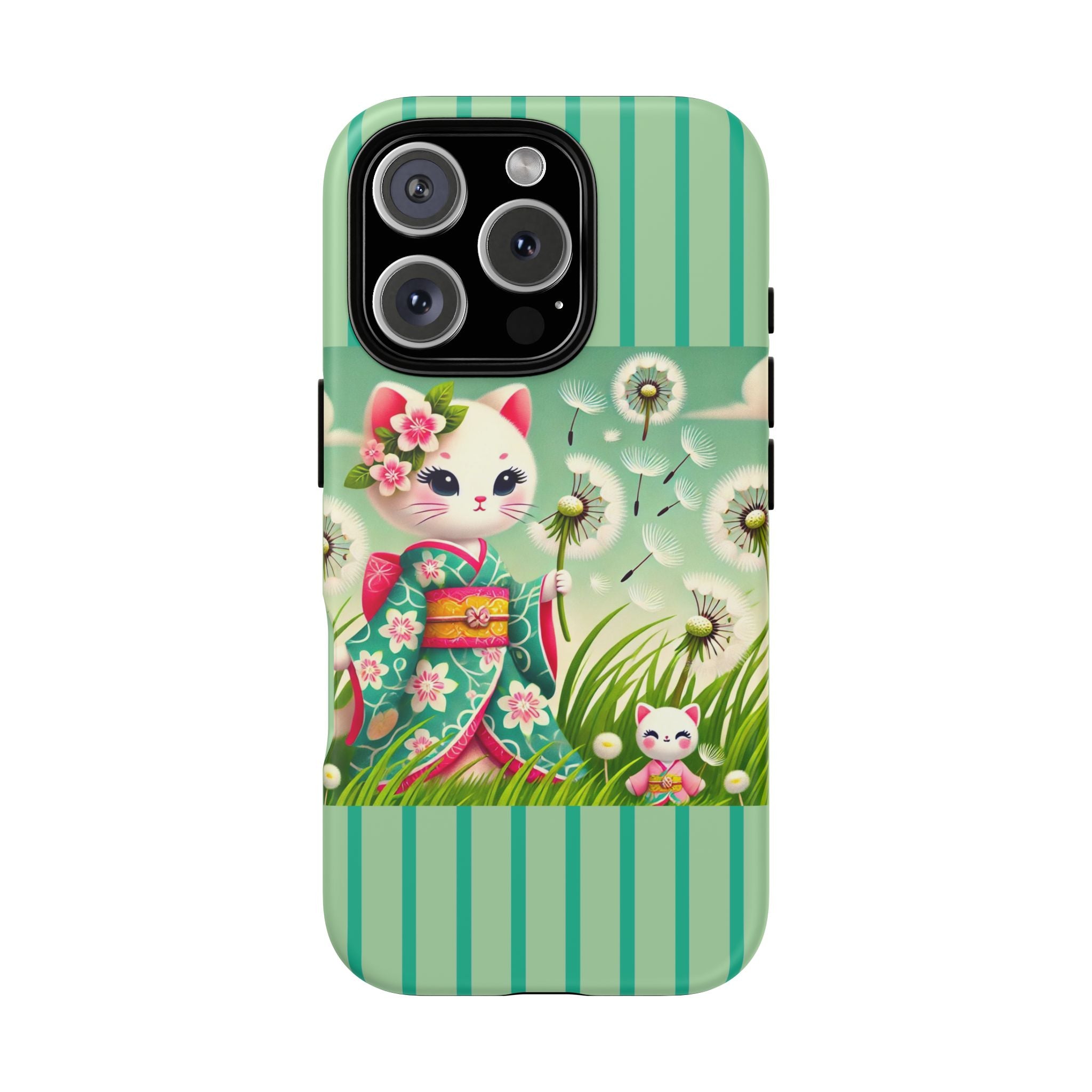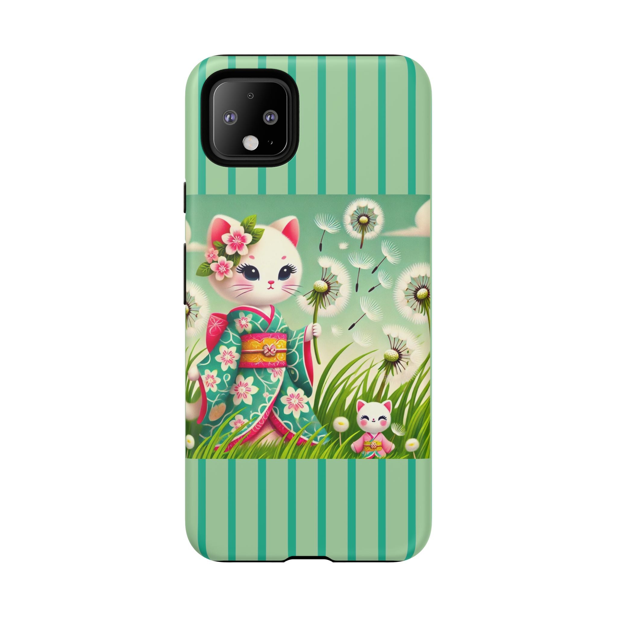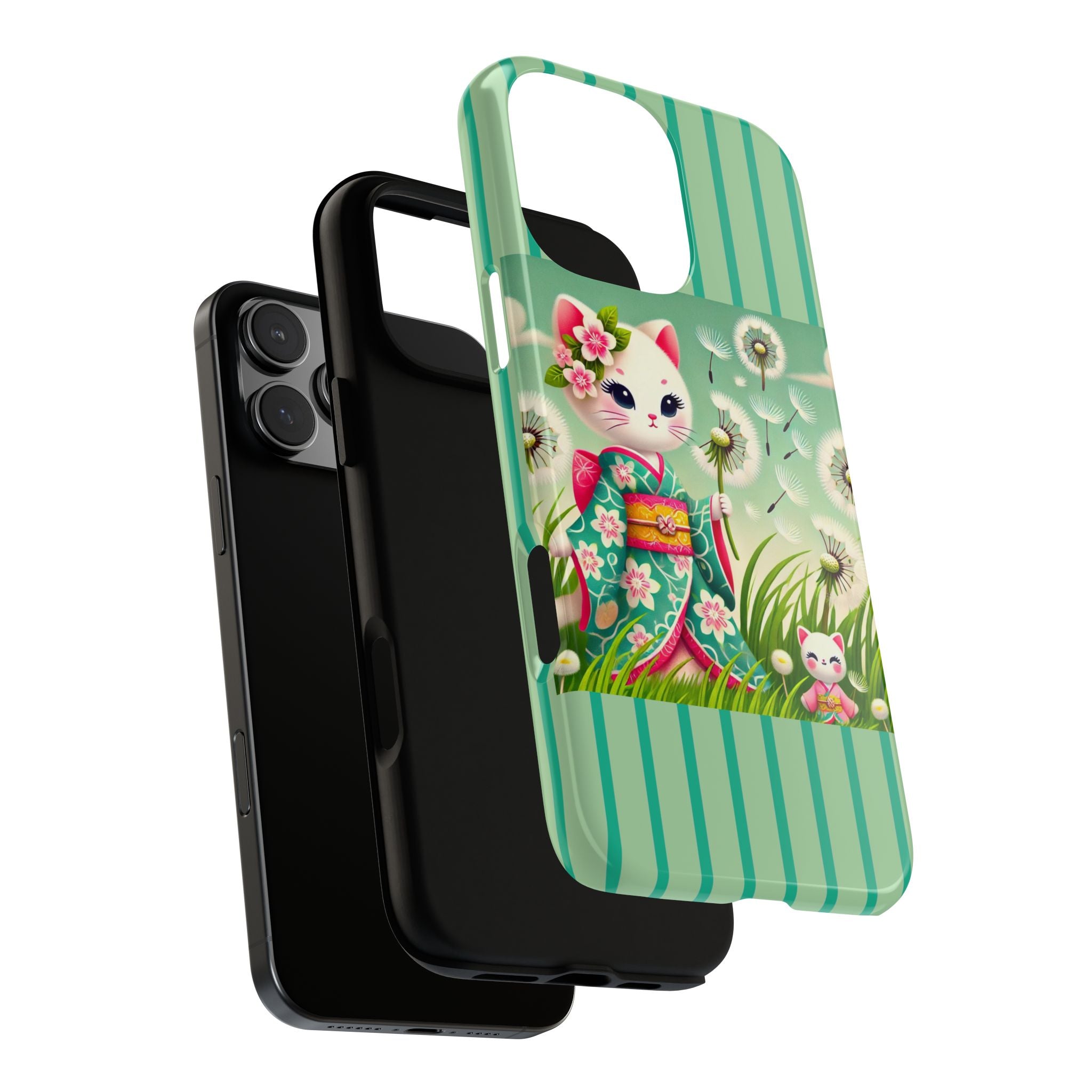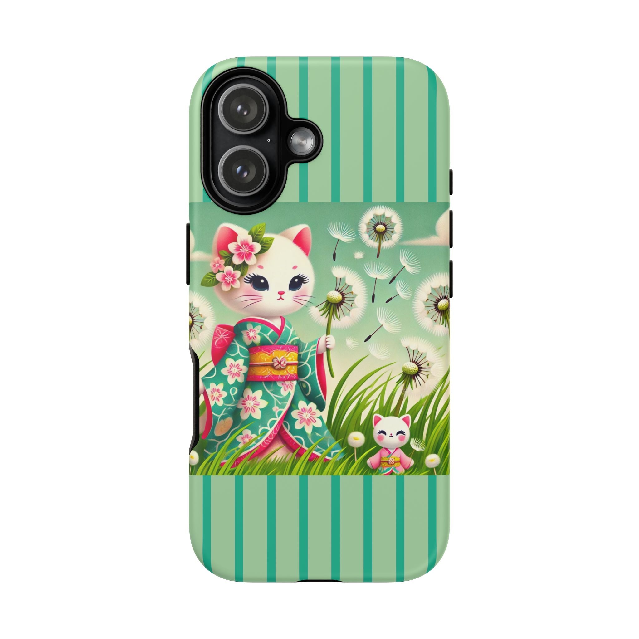 Add a touch of calm charm to your day with our Geisha Kitten and the Dandelion Phone Cases. Designed for iPhone, Samsung Galaxy, and Google Pixel devices, these premium-quality cases combine everyday protection with the gentle beauty of whimsical art. The design features a serene illustration of a geisha kitten and her tiny kitten doll, both dressed in matching kimonos, surrounded by tall swaying grass and drifting dandelion seeds. The soft colors and delicate details create a dreamy, tranquil mood that transforms your phone into a peaceful work of art.