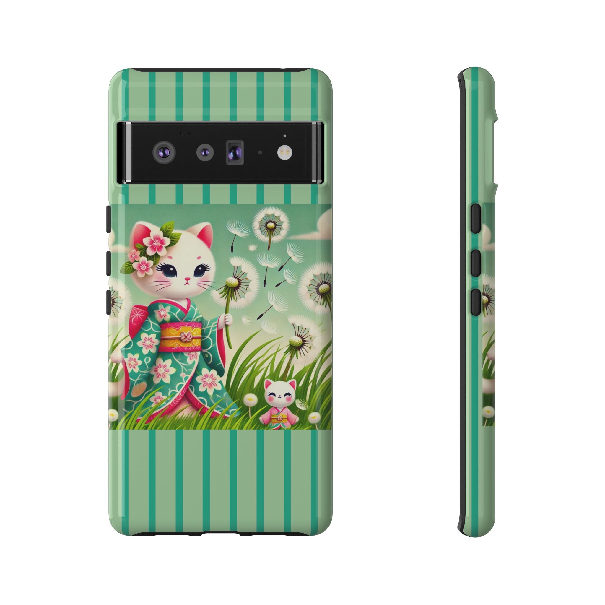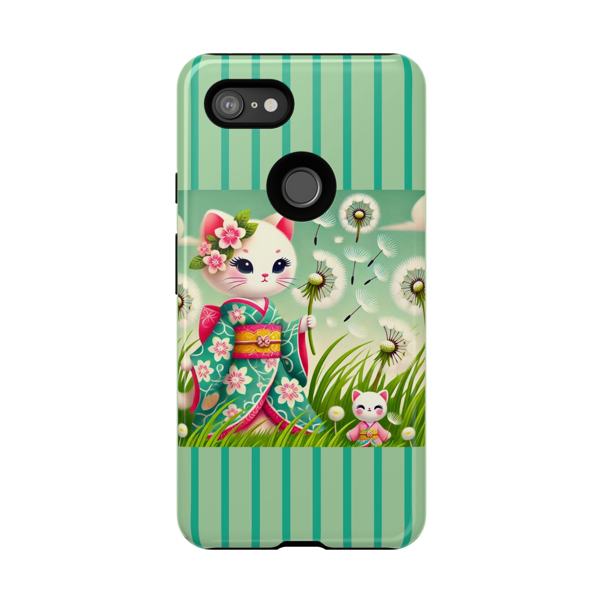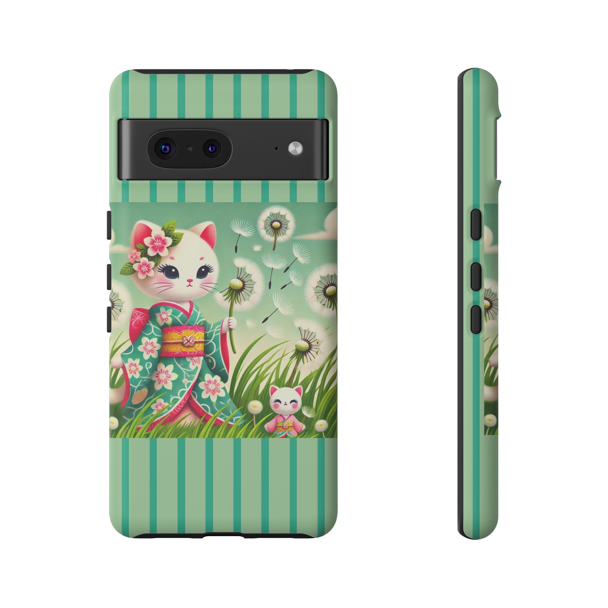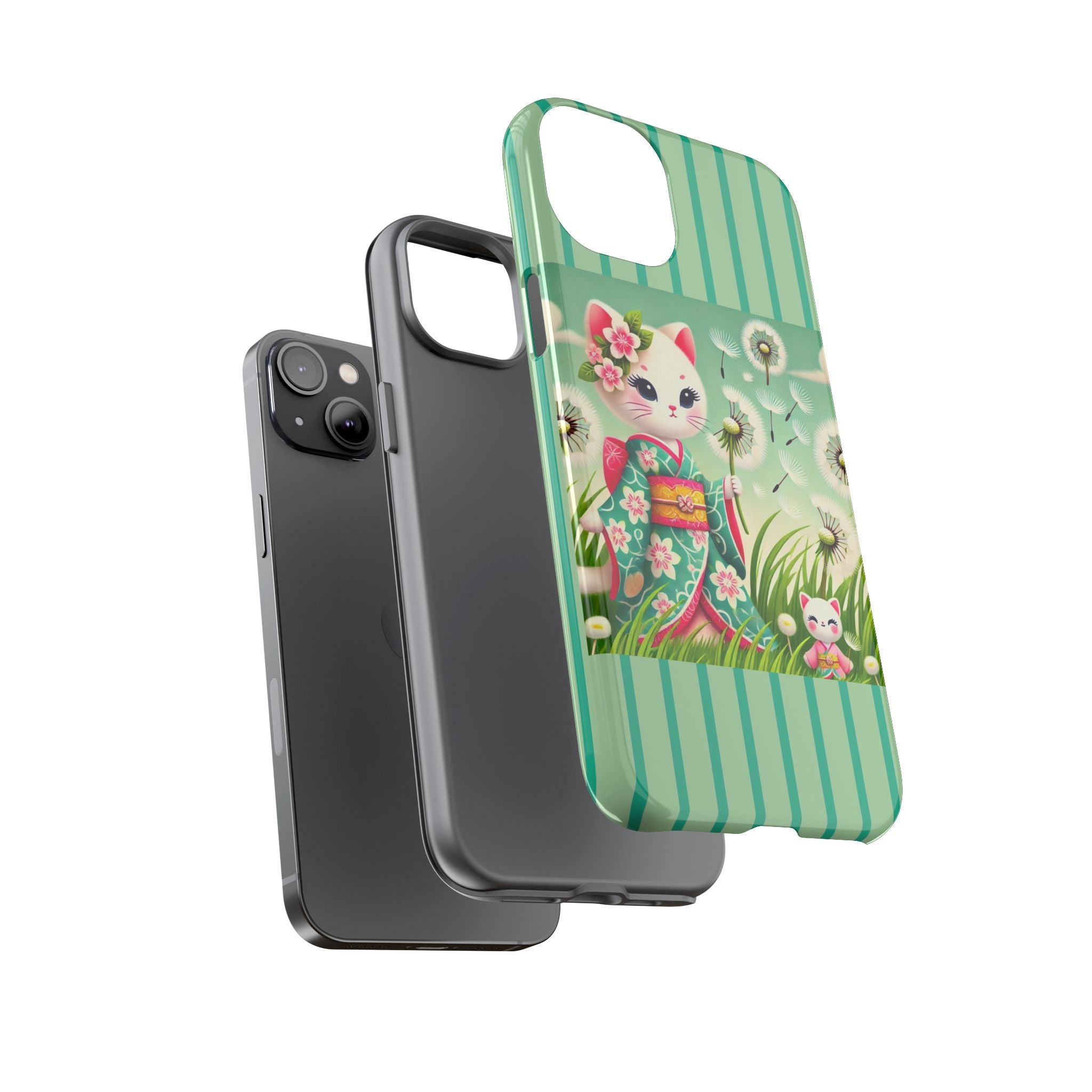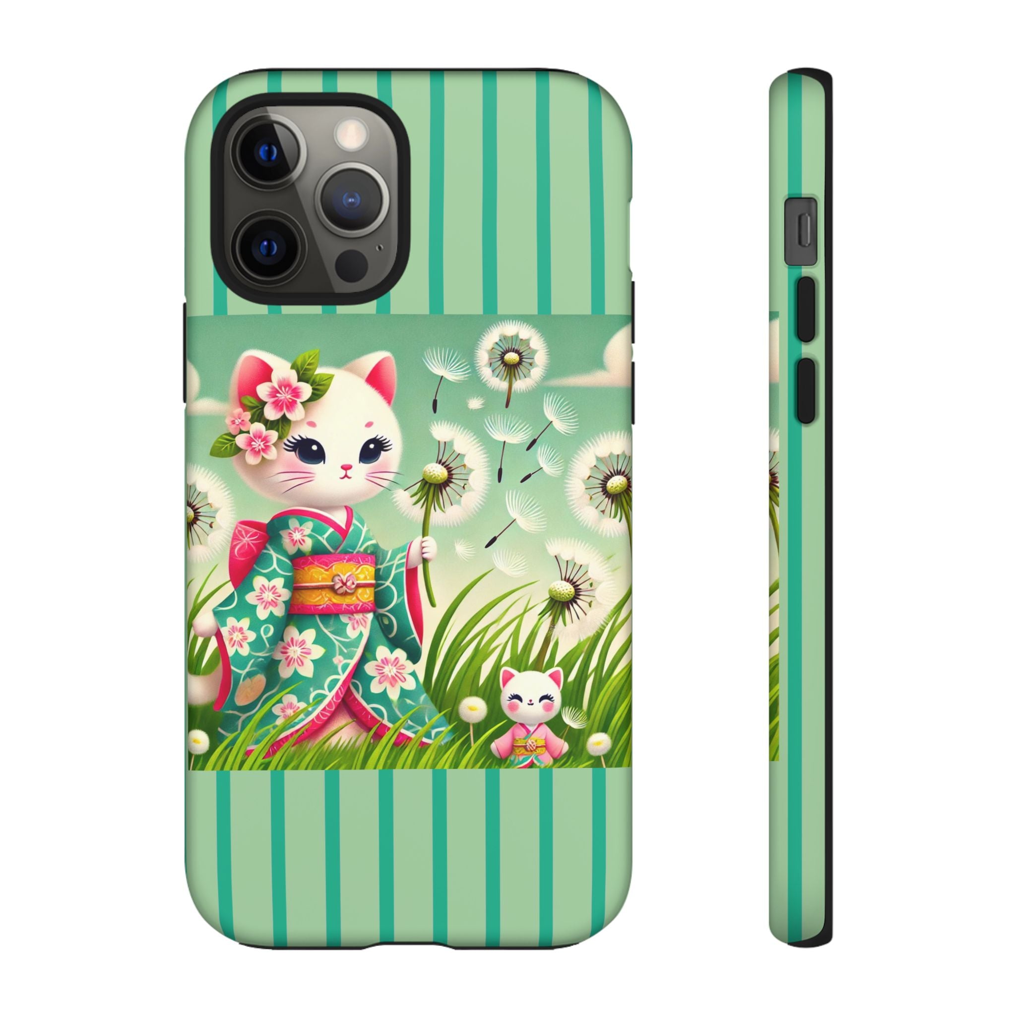 Add a touch of calm charm to your day with our Geisha Kitten and the Dandelion Phone Cases. Designed for iPhone, Samsung Galaxy, and Google Pixel devices, these premium-quality cases combine everyday protection with the gentle beauty of whimsical art. The design features a serene illustration of a geisha kitten and her tiny kitten doll, both dressed in matching kimonos, surrounded by tall swaying grass and drifting dandelion seeds. The soft colors and delicate details create a dreamy, tranquil mood that transforms your phone into a peaceful work of art.
