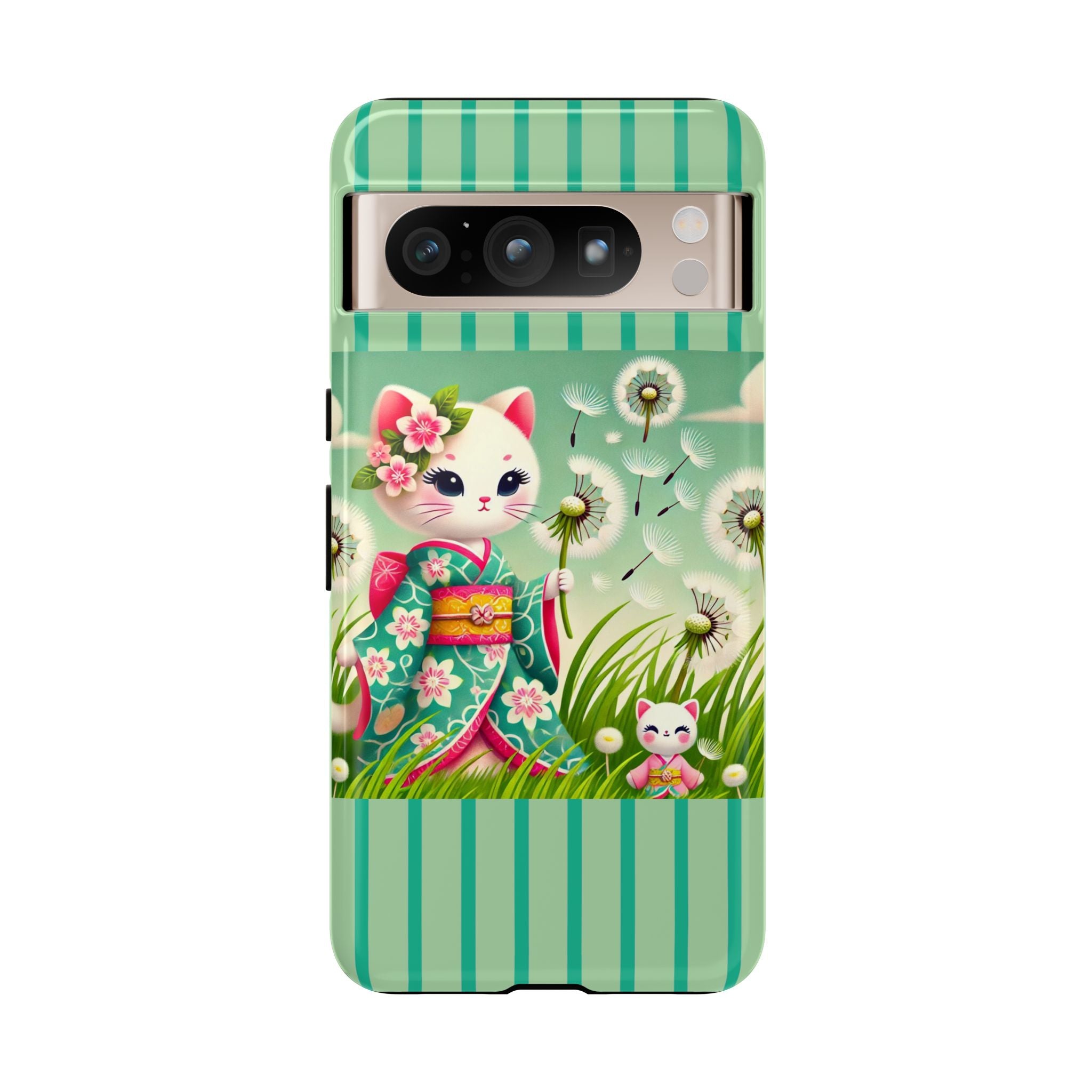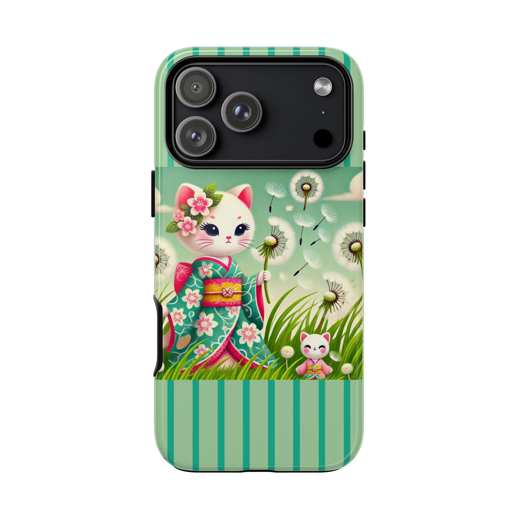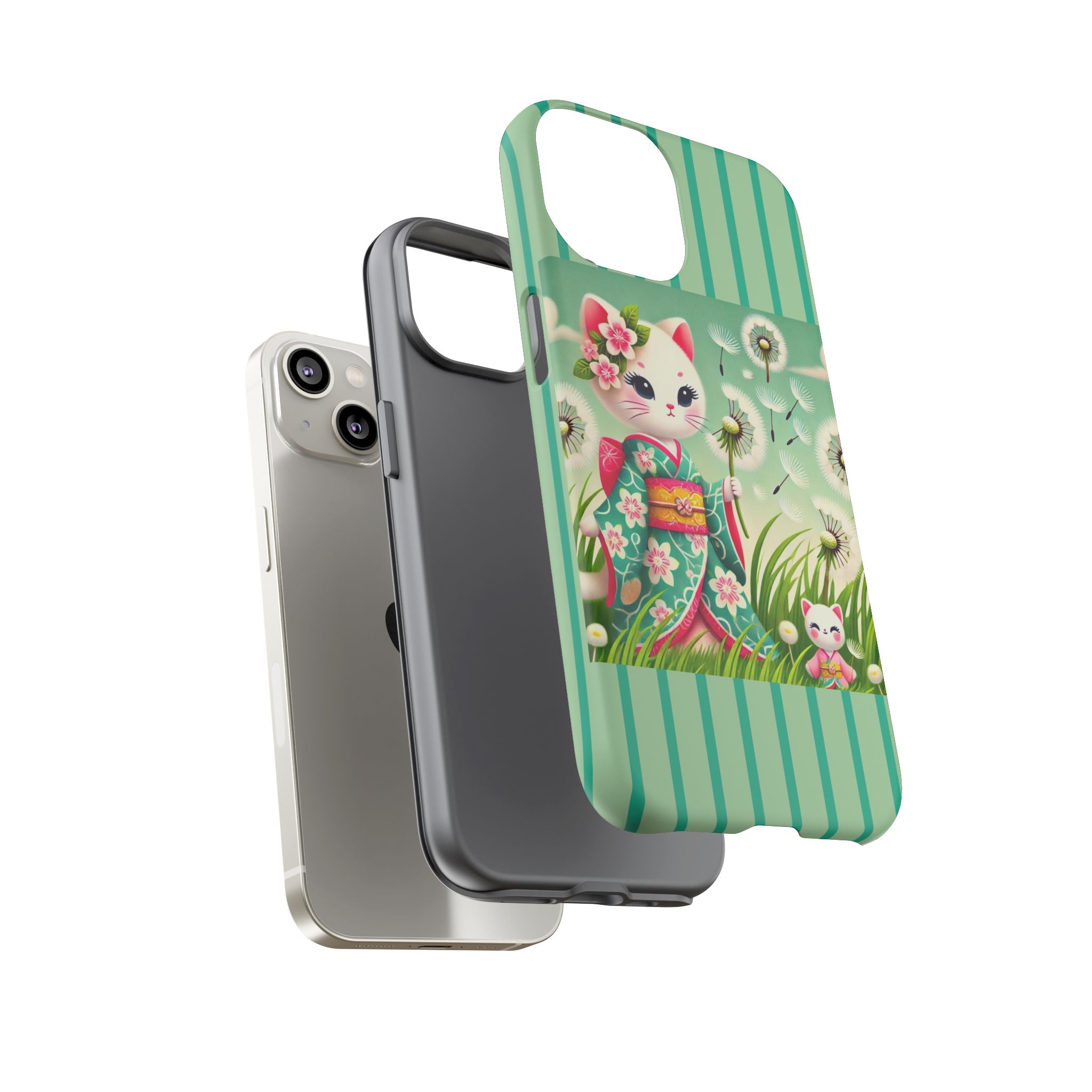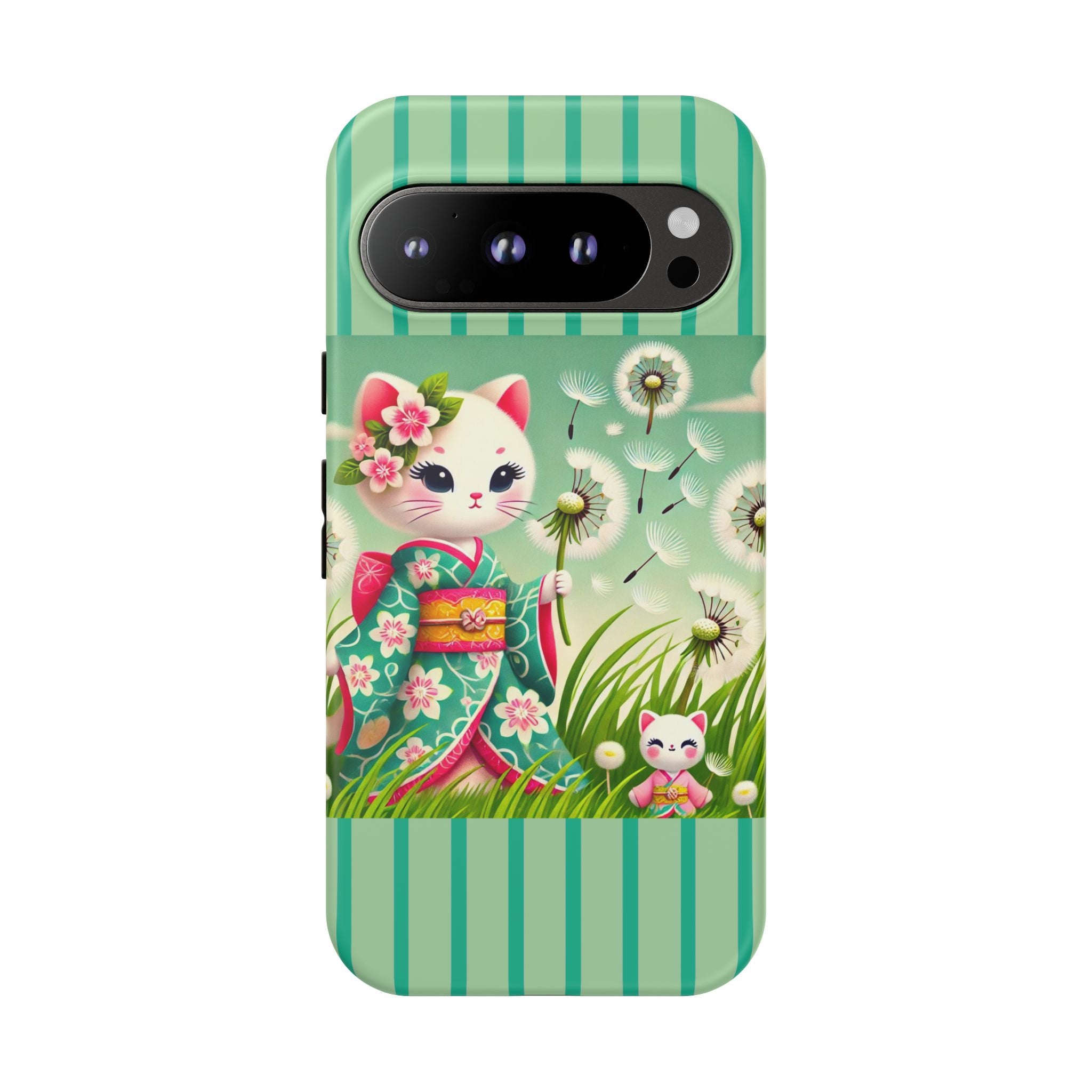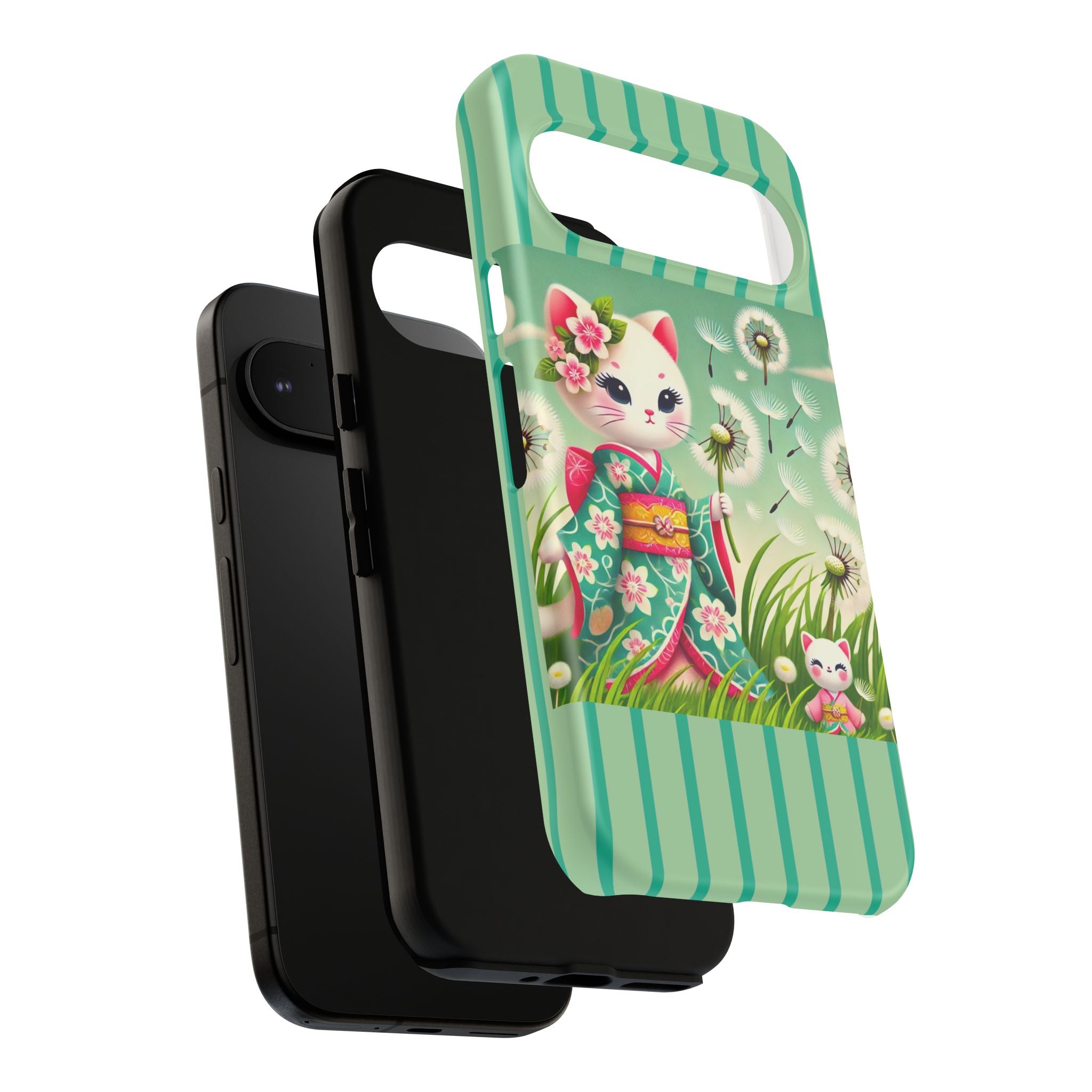 Add a touch of calm charm to your day with our Geisha Kitten and the Dandelion Phone Cases. Designed for iPhone, Samsung Galaxy, and Google Pixel devices, these premium-quality cases combine everyday protection with the gentle beauty of whimsical art. The design features a serene illustration of a geisha kitten and her tiny kitten doll, both dressed in matching kimonos, surrounded by tall swaying grass and drifting dandelion seeds. The soft colors and delicate details create a dreamy, tranquil mood that transforms your phone into a peaceful work of art.