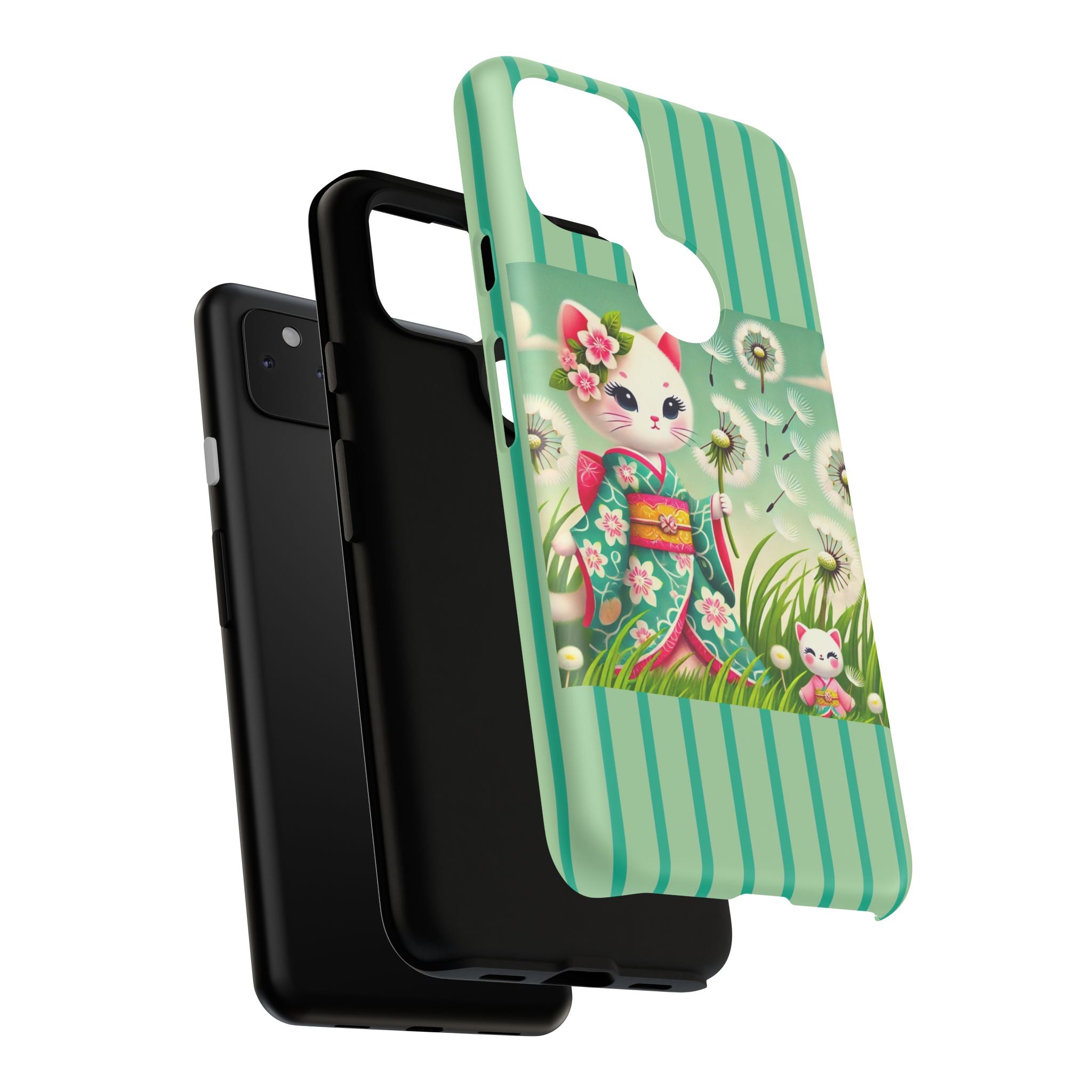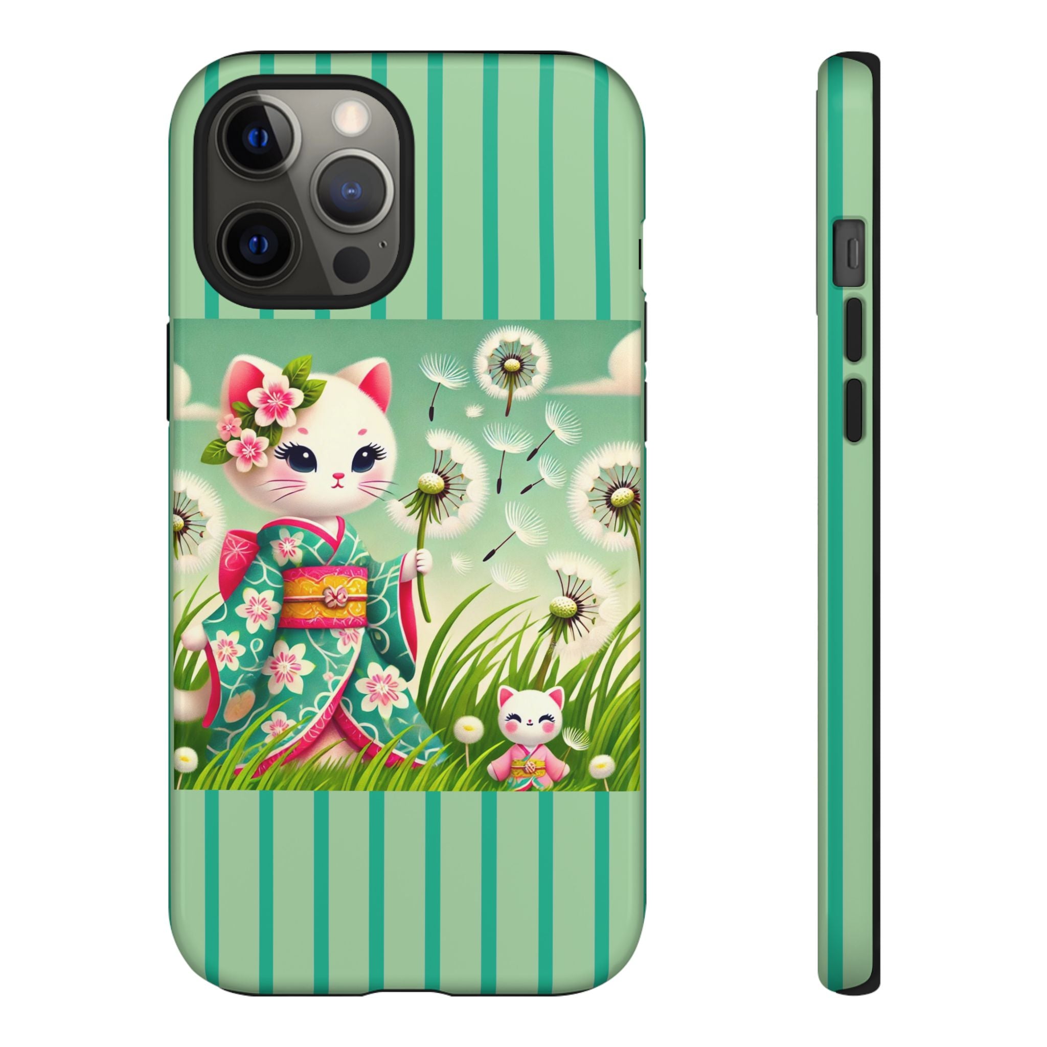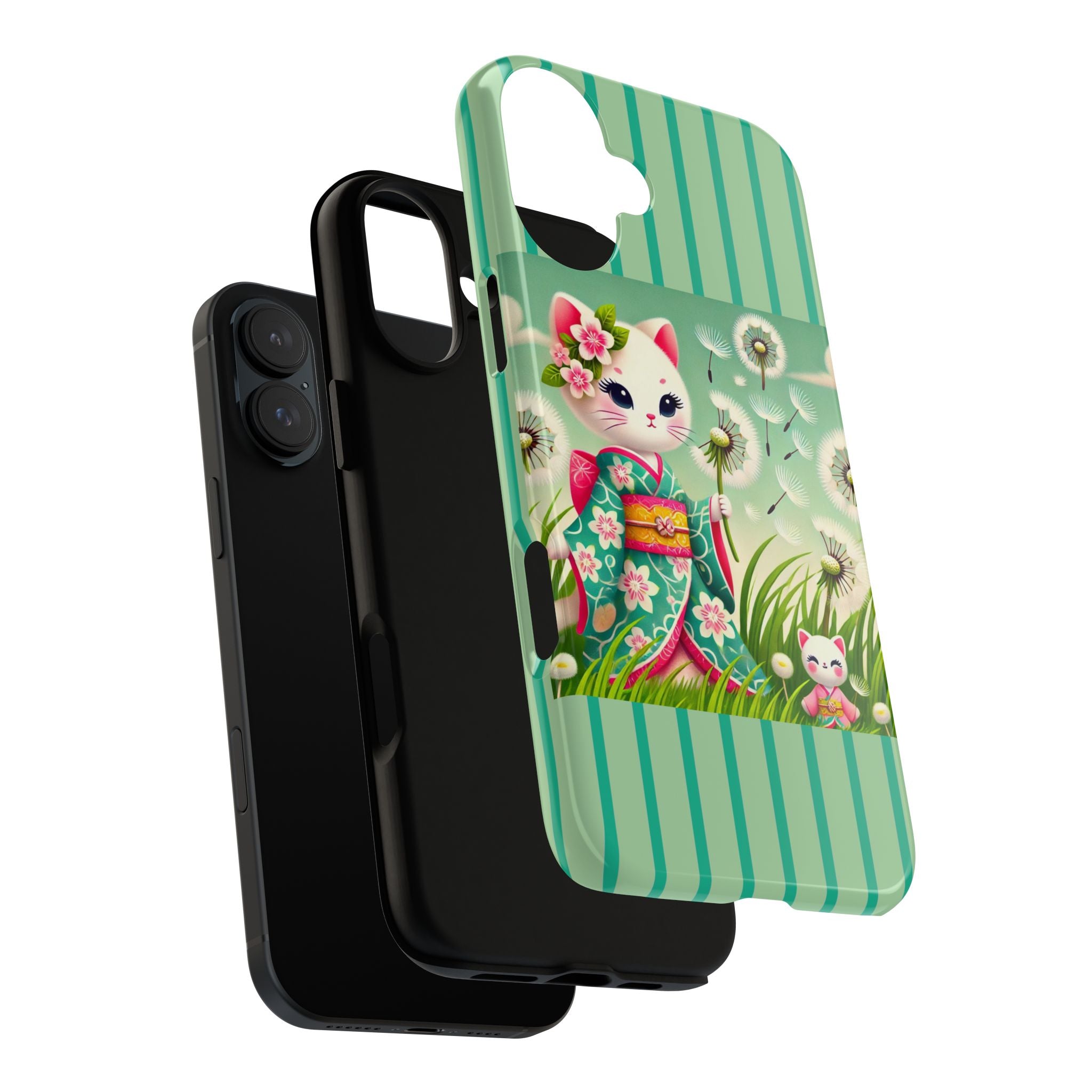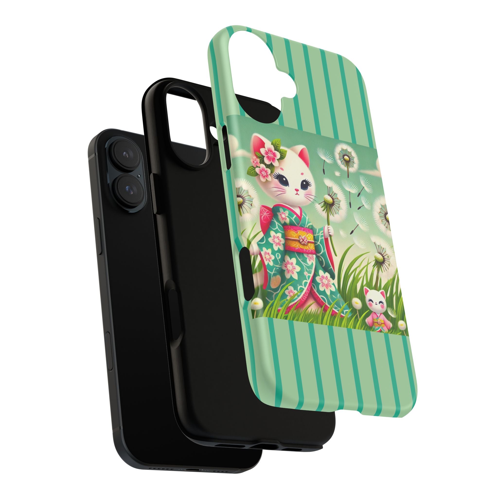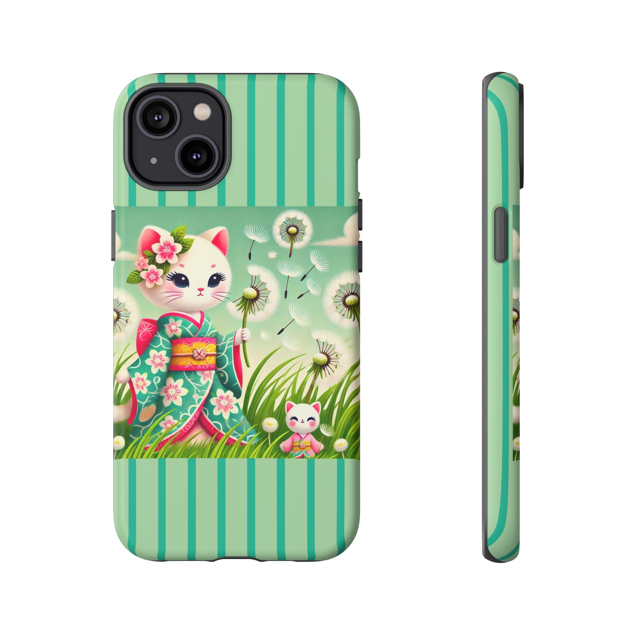 Add a touch of calm charm to your day with our Geisha Kitten and the Dandelion Phone Cases. Designed for iPhone, Samsung Galaxy, and Google Pixel devices, these premium-quality cases combine everyday protection with the gentle beauty of whimsical art. The design features a serene illustration of a geisha kitten and her tiny kitten doll, both dressed in matching kimonos, surrounded by tall swaying grass and drifting dandelion seeds. The soft colors and delicate details create a dreamy, tranquil mood that transforms your phone into a peaceful work of art.