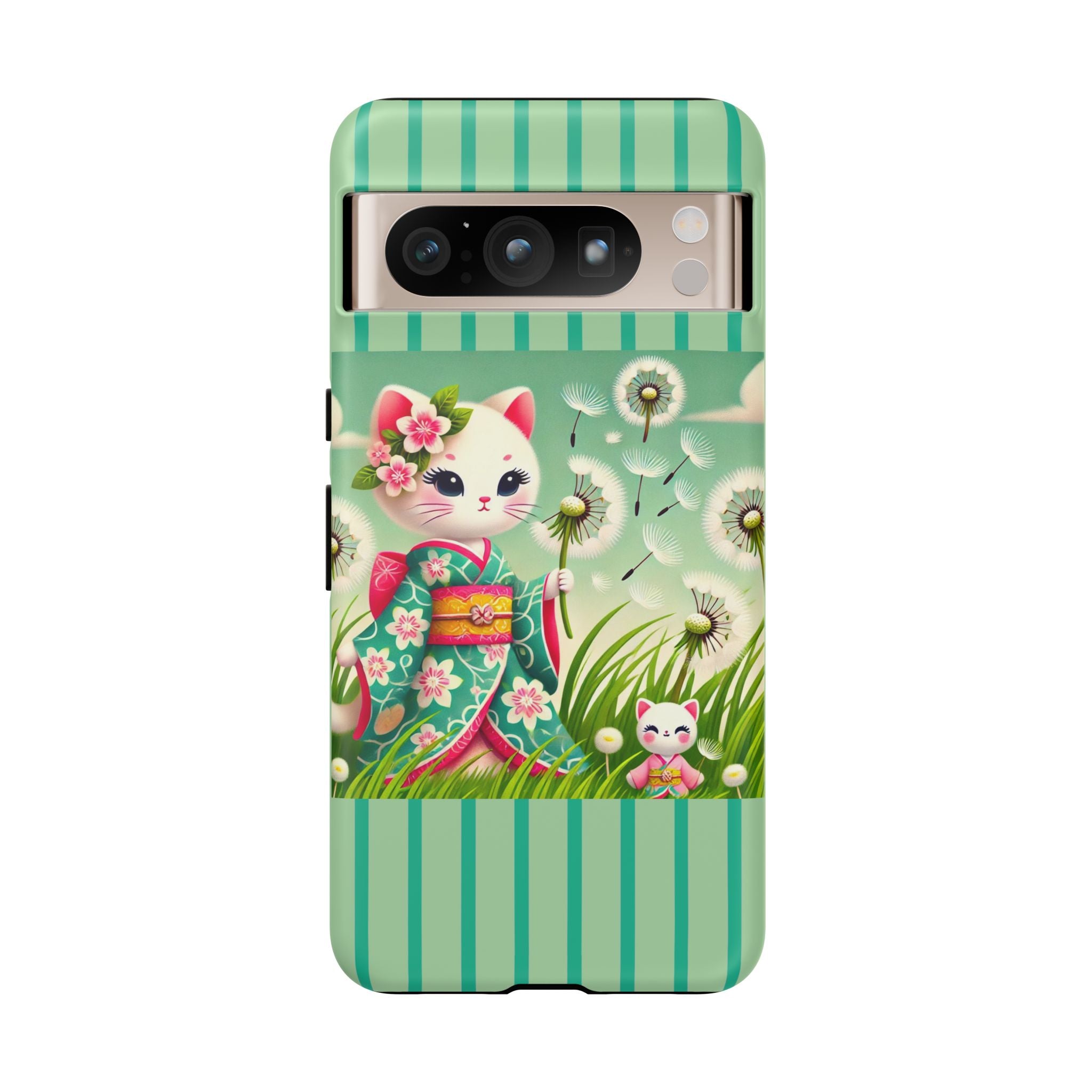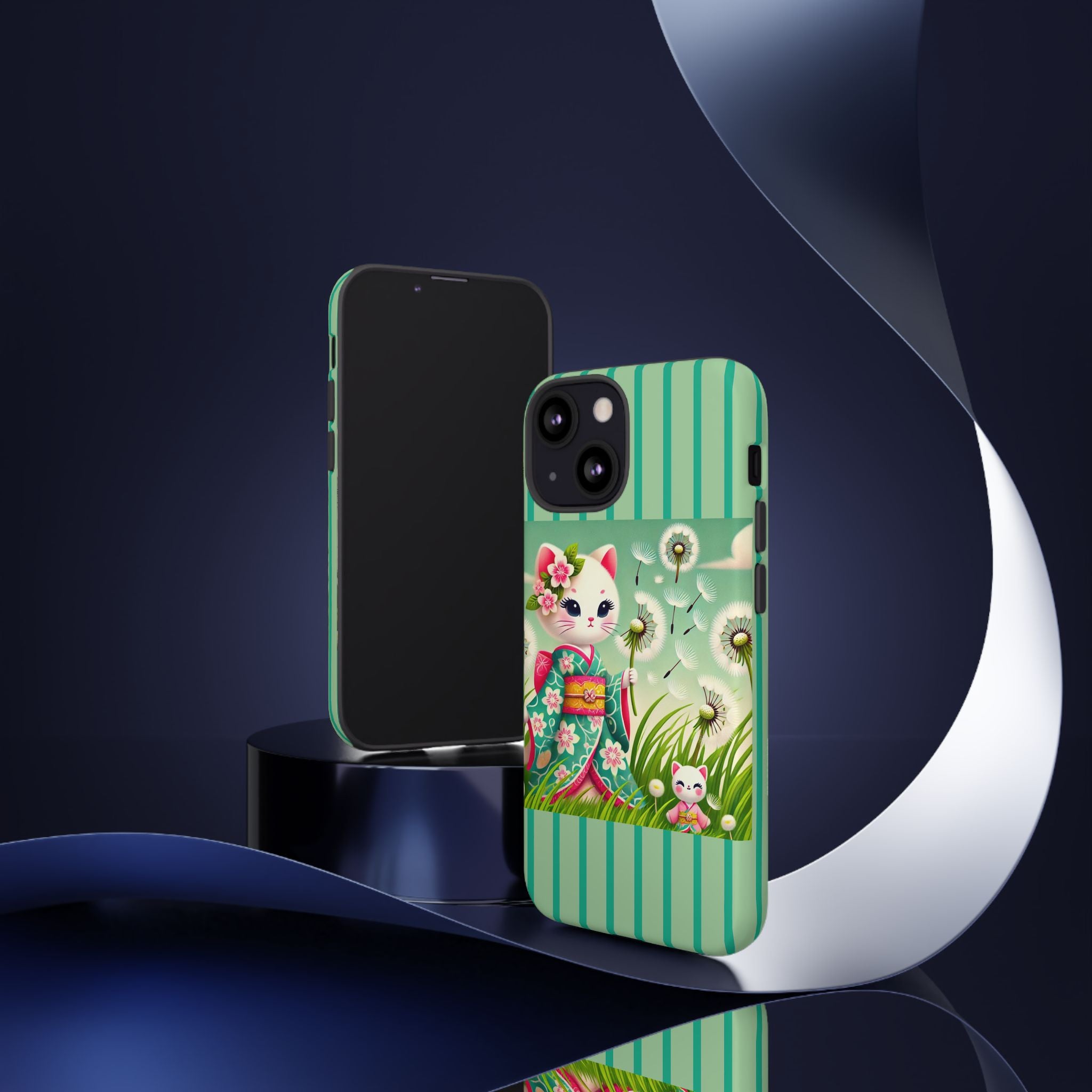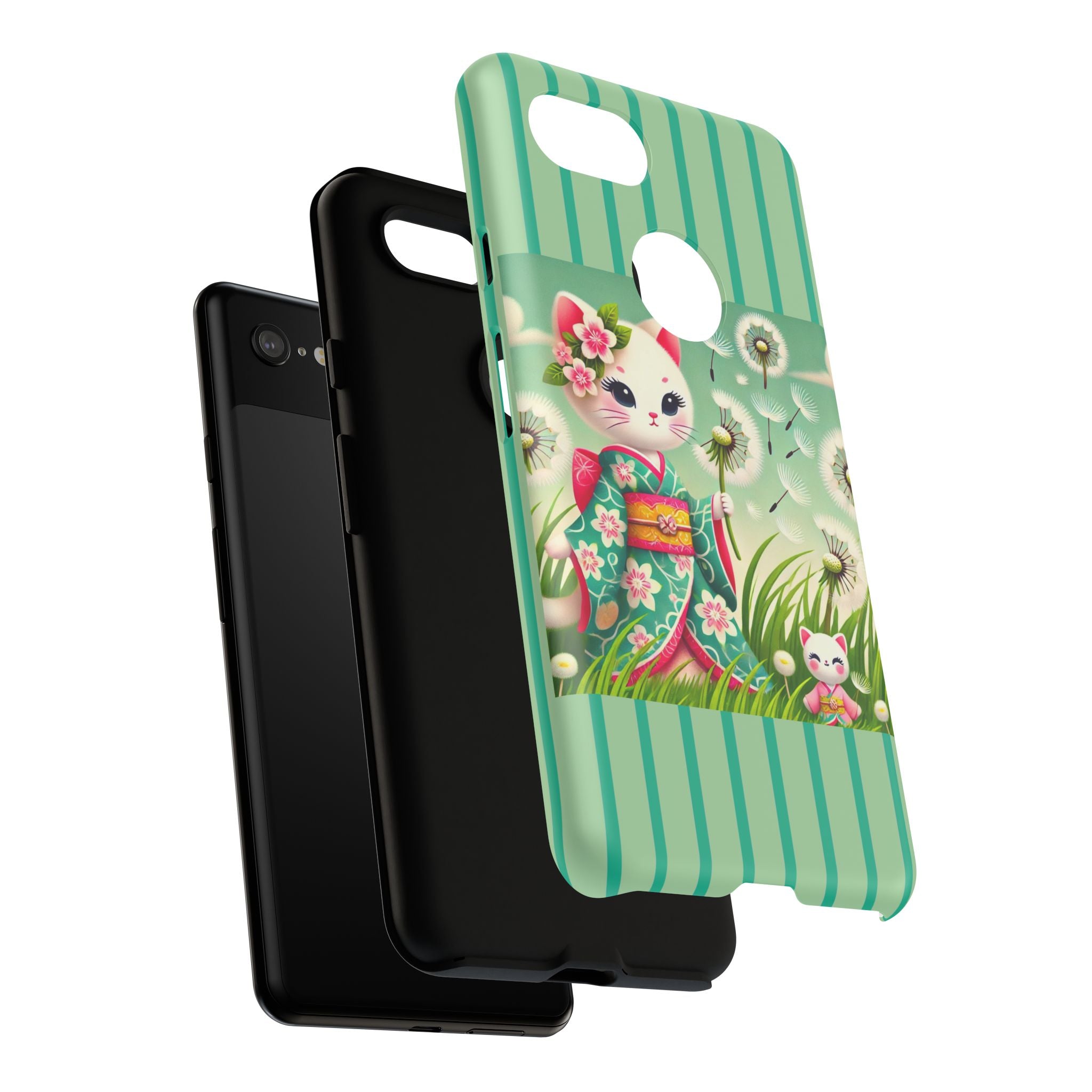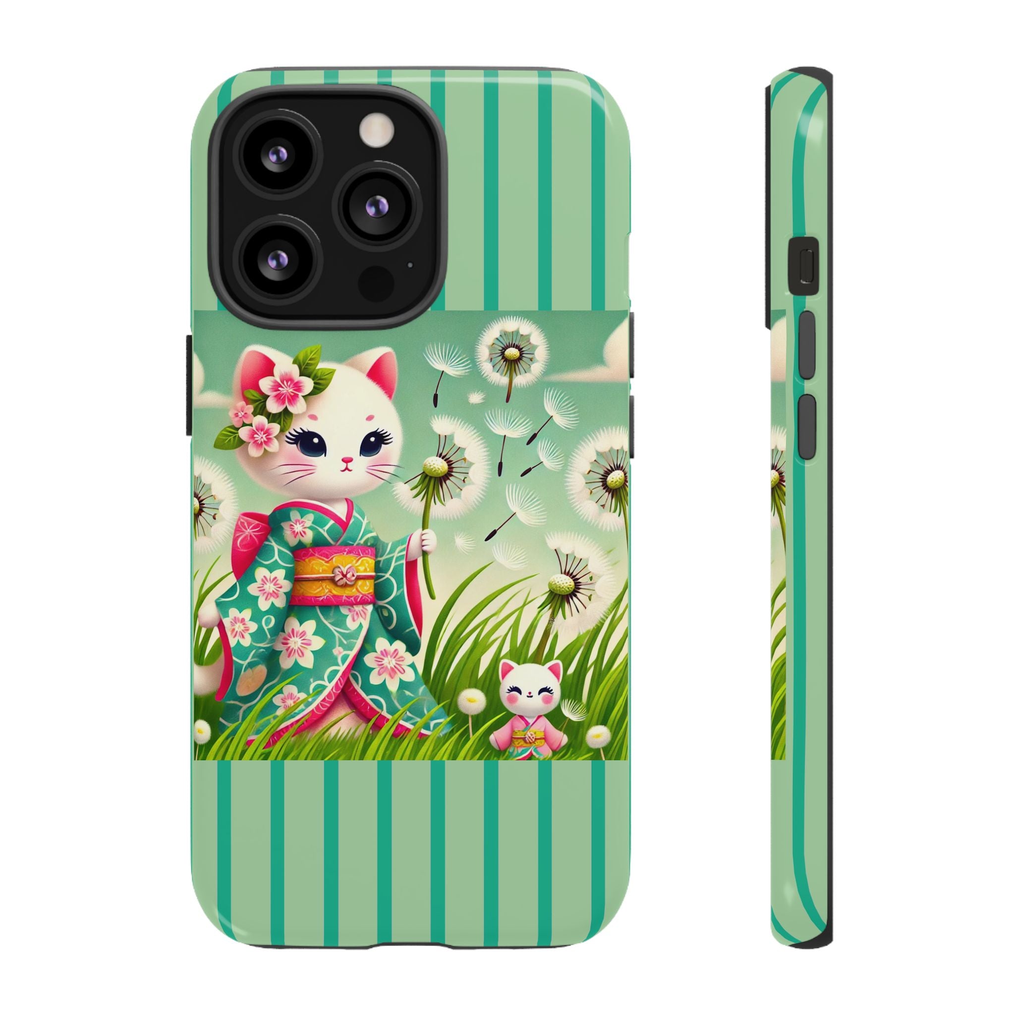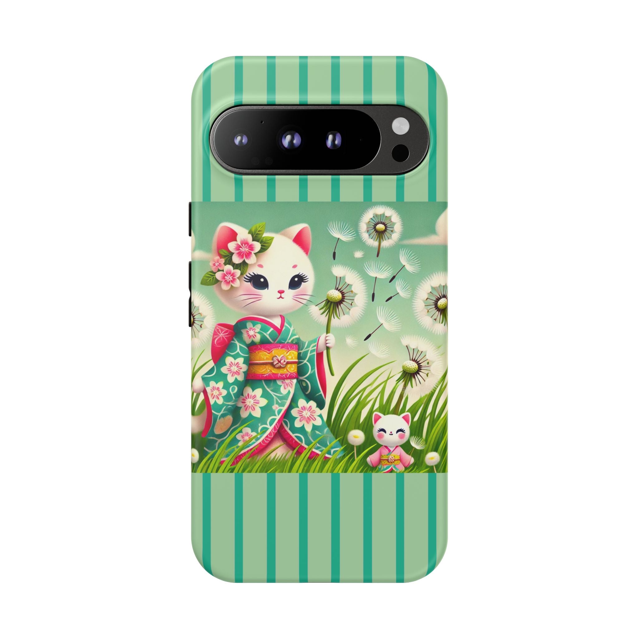 Add a touch of calm charm to your day with our Geisha Kitten and the Dandelion Phone Cases. Designed for iPhone, Samsung Galaxy, and Google Pixel devices, these premium-quality cases combine everyday protection with the gentle beauty of whimsical art. The design features a serene illustration of a geisha kitten and her tiny kitten doll, both dressed in matching kimonos, surrounded by tall swaying grass and drifting dandelion seeds. The soft colors and delicate details create a dreamy, tranquil mood that transforms your phone into a peaceful work of art.