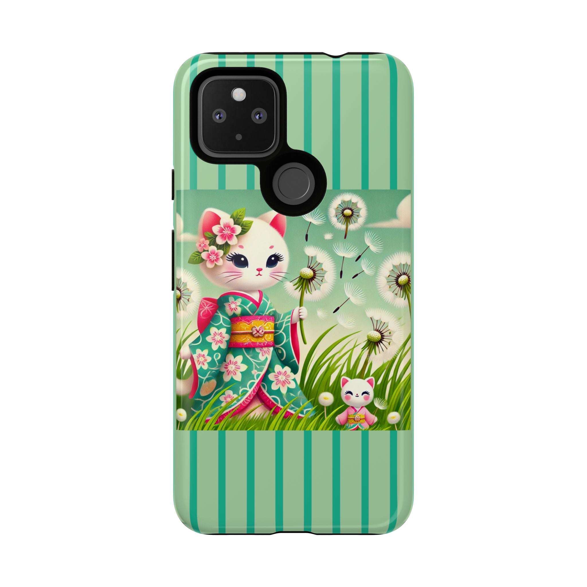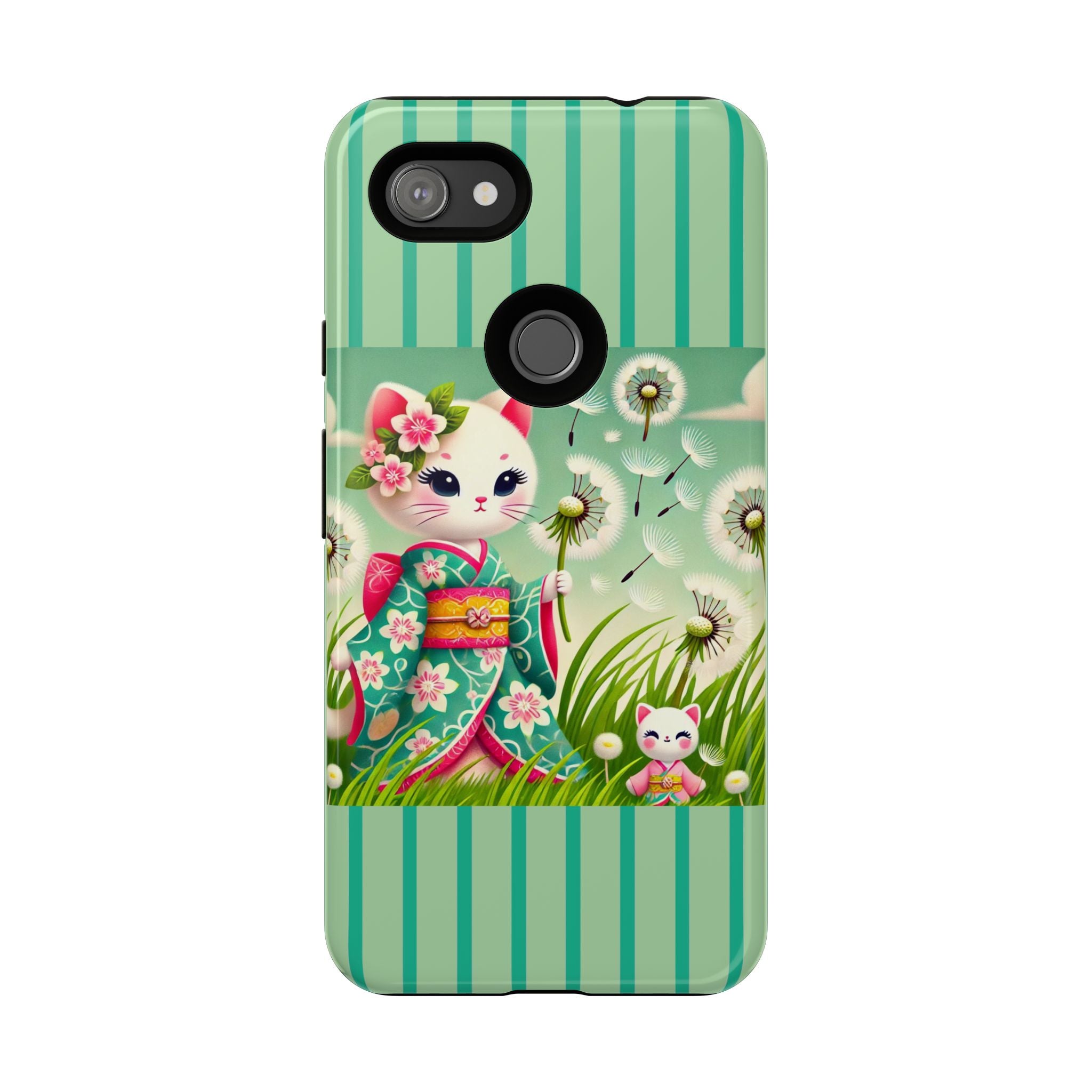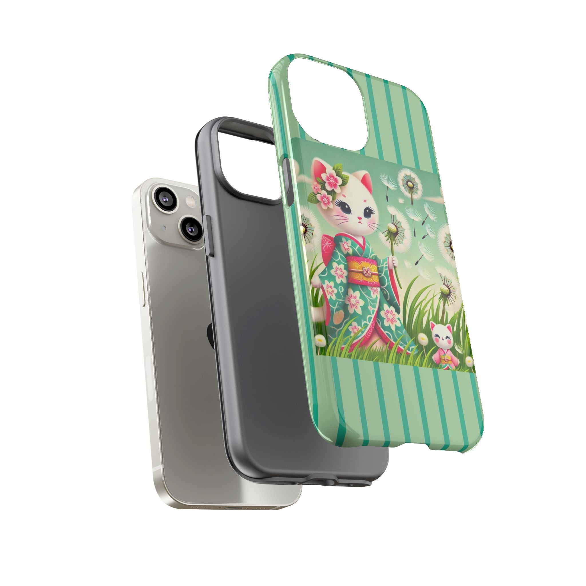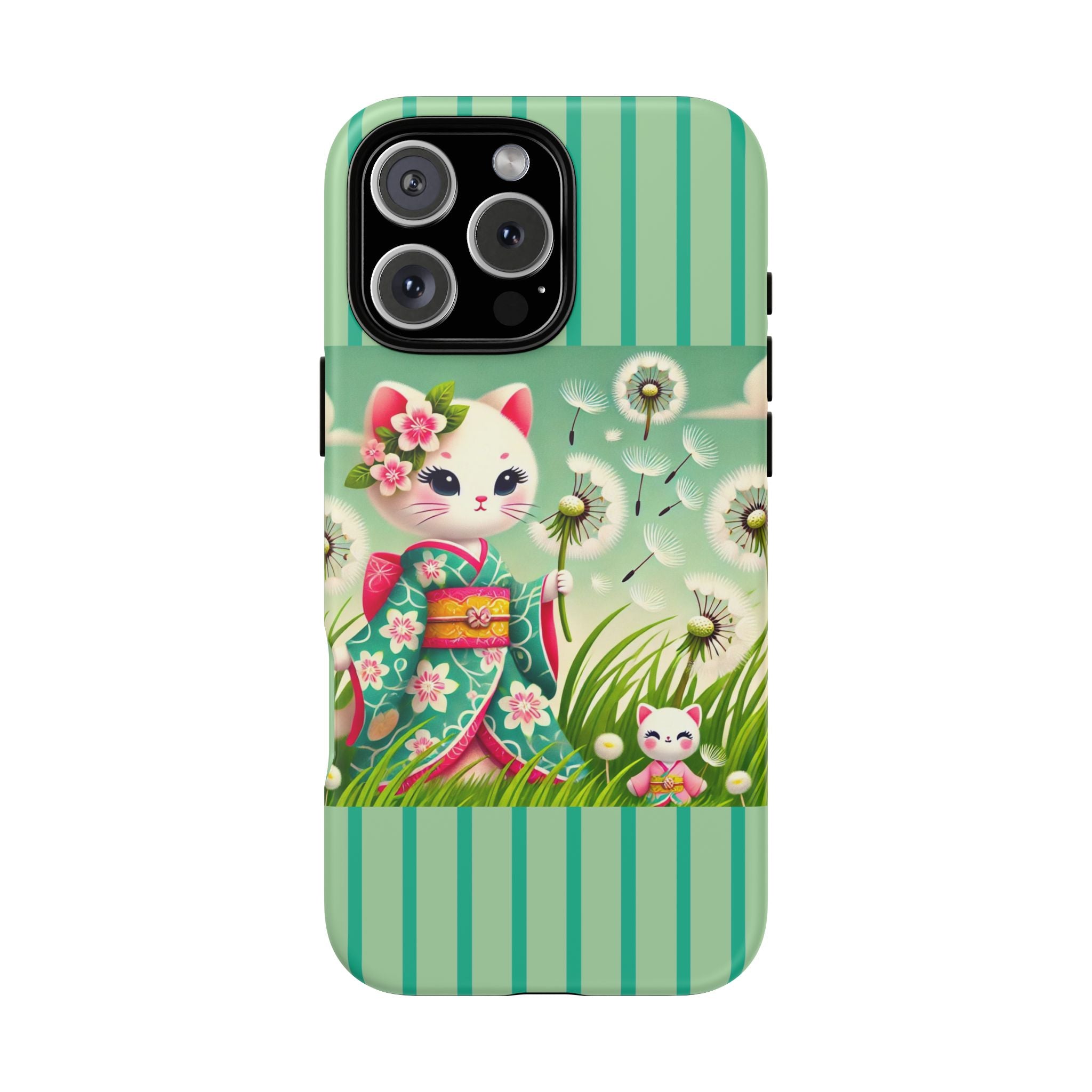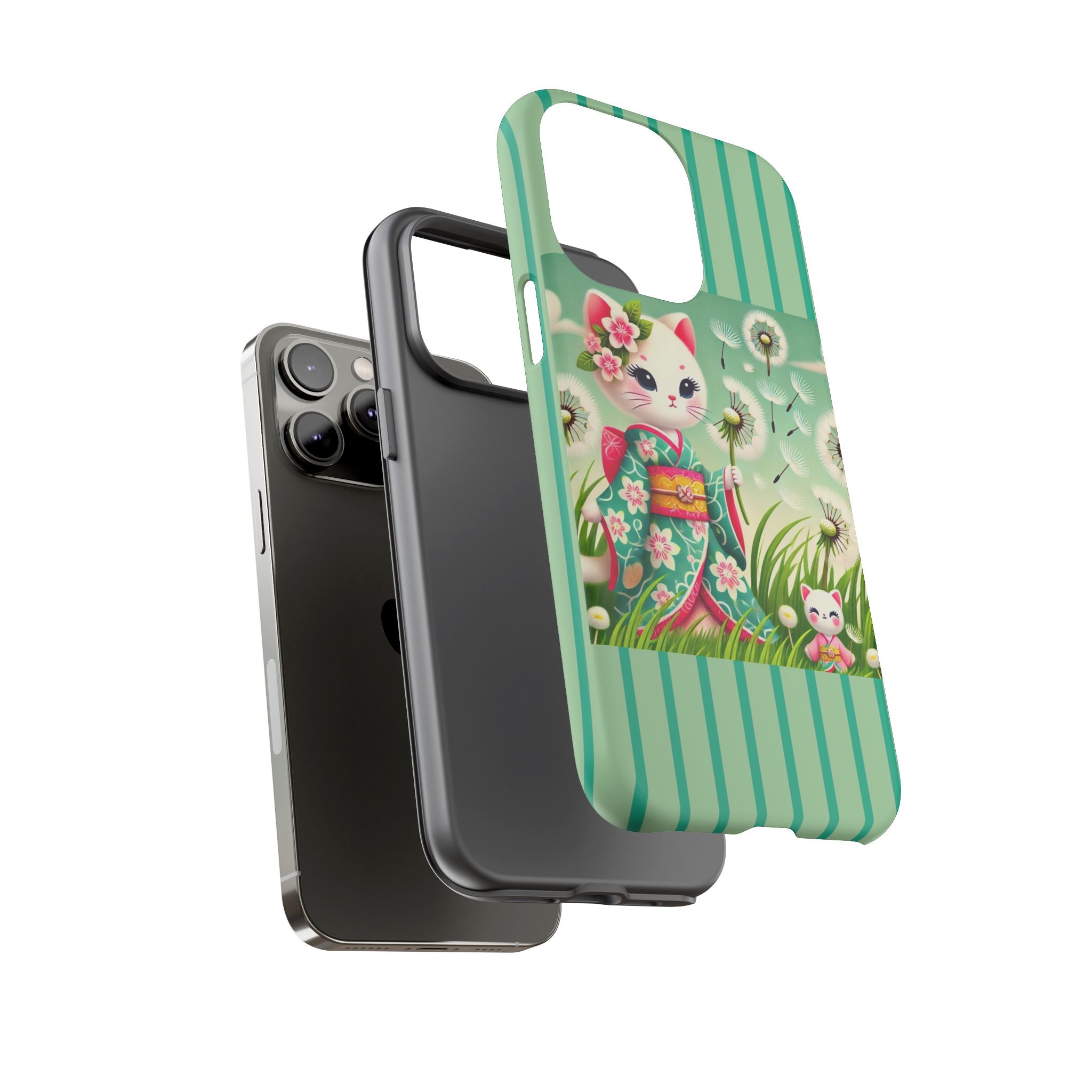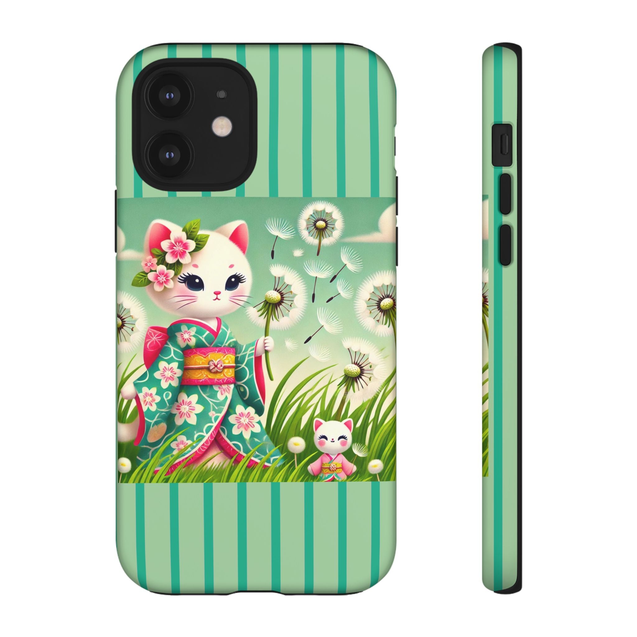 Add a touch of calm charm to your day with our Geisha Kitten and the Dandelion Phone Cases. Designed for iPhone, Samsung Galaxy, and Google Pixel devices, these premium-quality cases combine everyday protection with the gentle beauty of whimsical art. The design features a serene illustration of a geisha kitten and her tiny kitten doll, both dressed in matching kimonos, surrounded by tall swaying grass and drifting dandelion seeds. The soft colors and delicate details create a dreamy, tranquil mood that transforms your phone into a peaceful work of art.