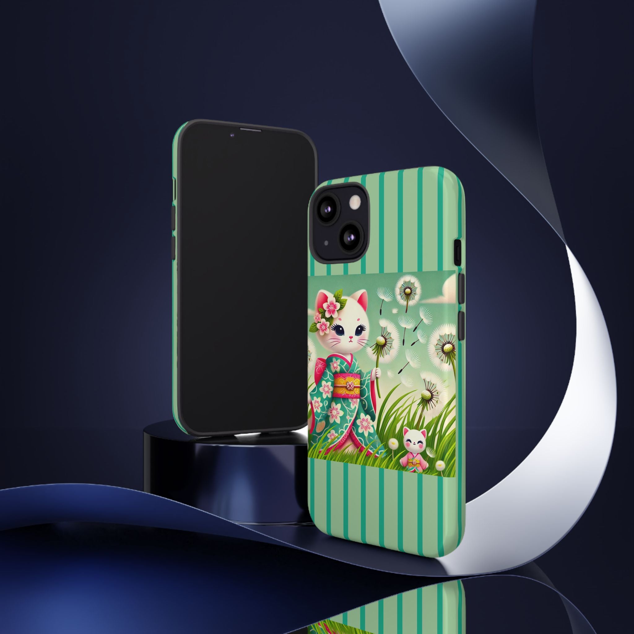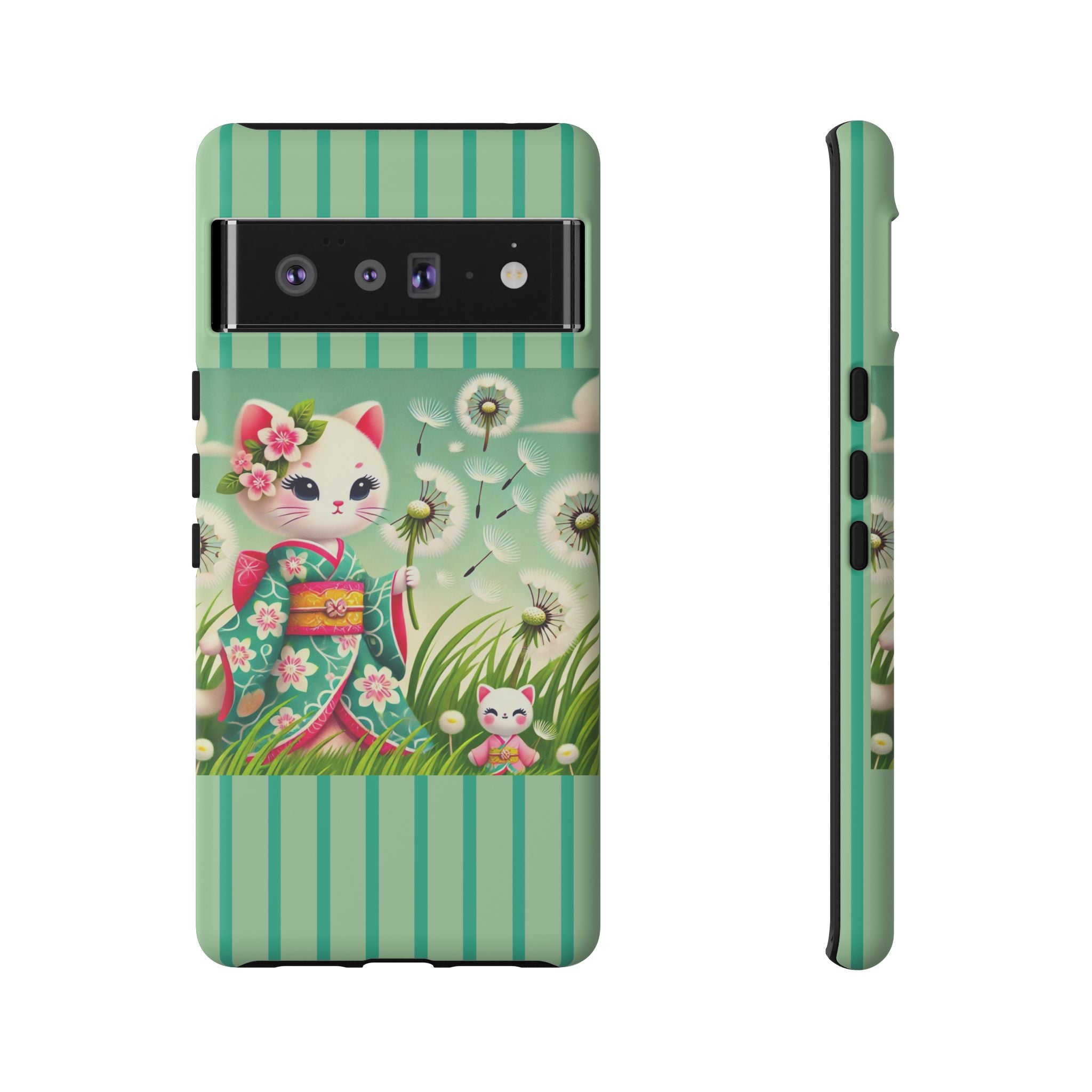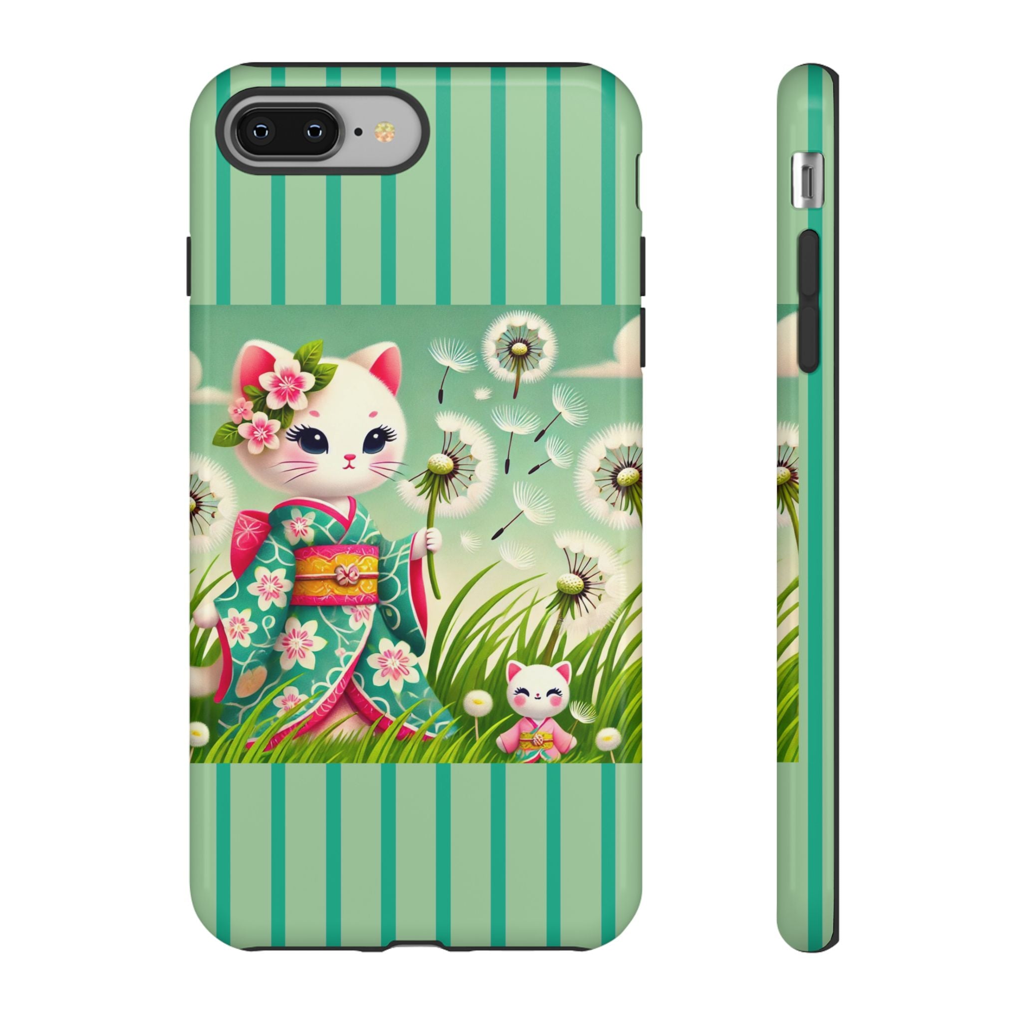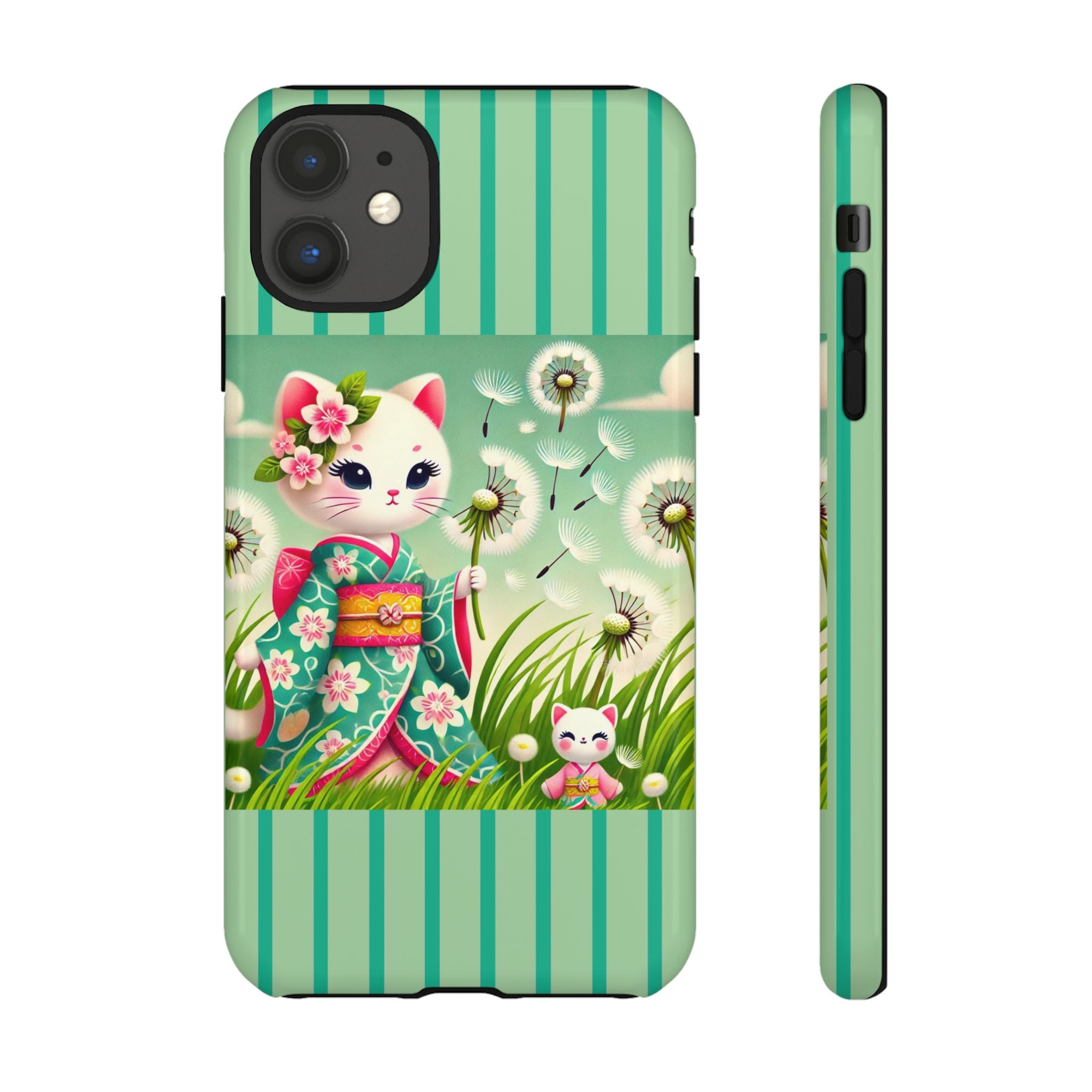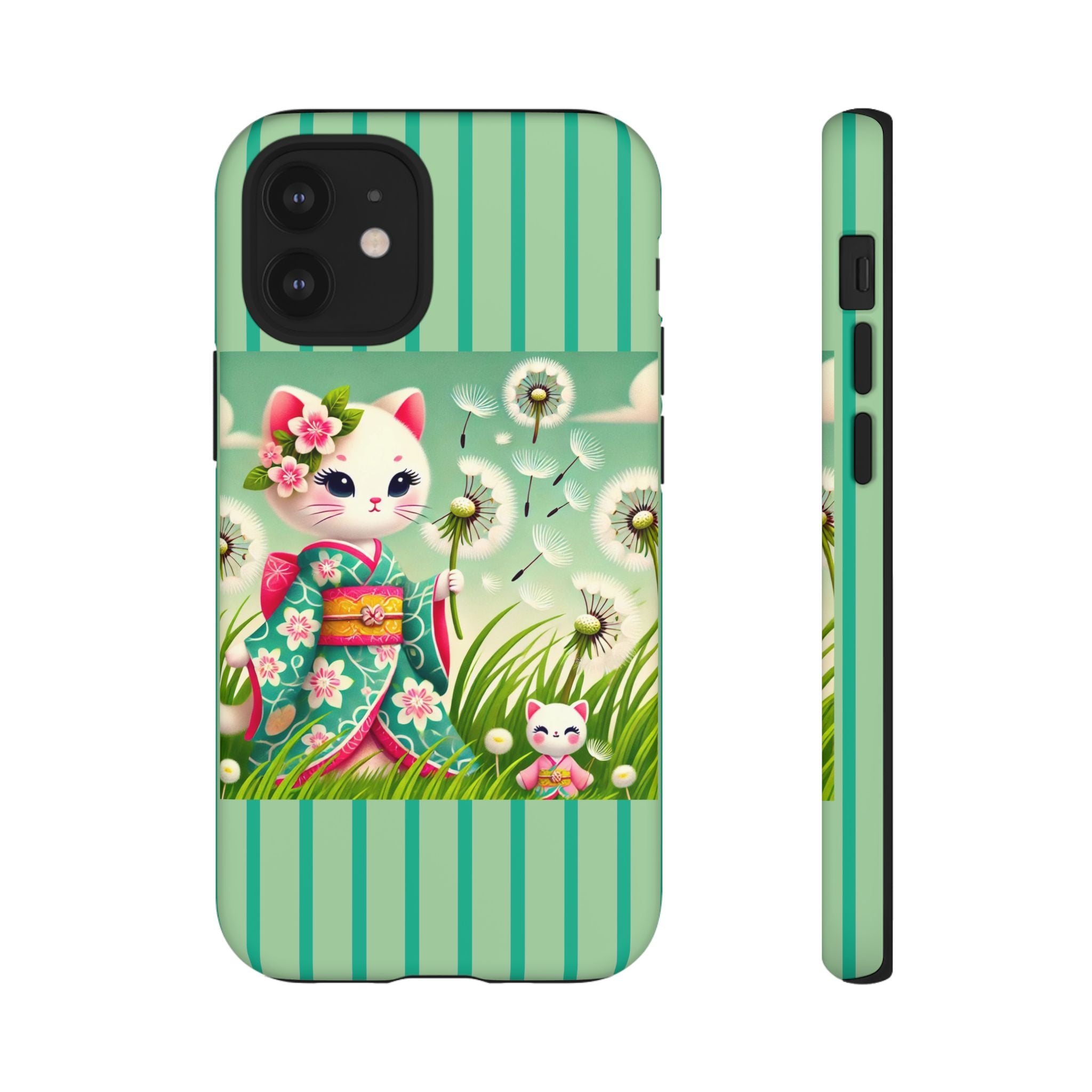 Add a touch of calm charm to your day with our Geisha Kitten and the Dandelion Phone Cases. Designed for iPhone, Samsung Galaxy, and Google Pixel devices, these premium-quality cases combine everyday protection with the gentle beauty of whimsical art. The design features a serene illustration of a geisha kitten and her tiny kitten doll, both dressed in matching kimonos, surrounded by tall swaying grass and drifting dandelion seeds. The soft colors and delicate details create a dreamy, tranquil mood that transforms your phone into a peaceful work of art.