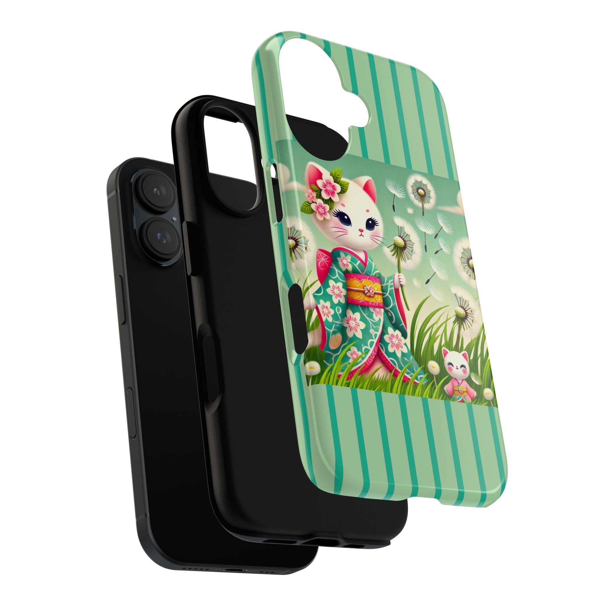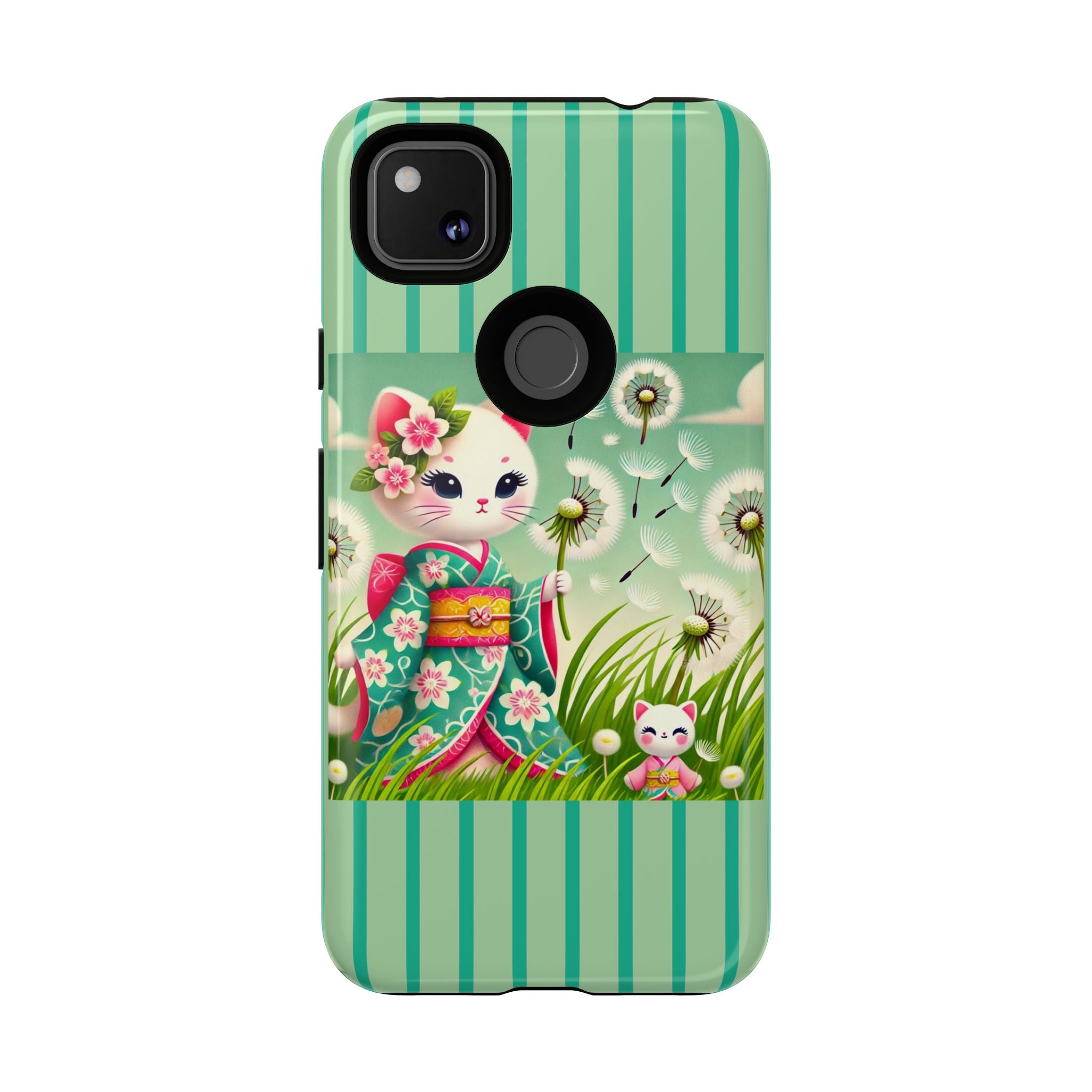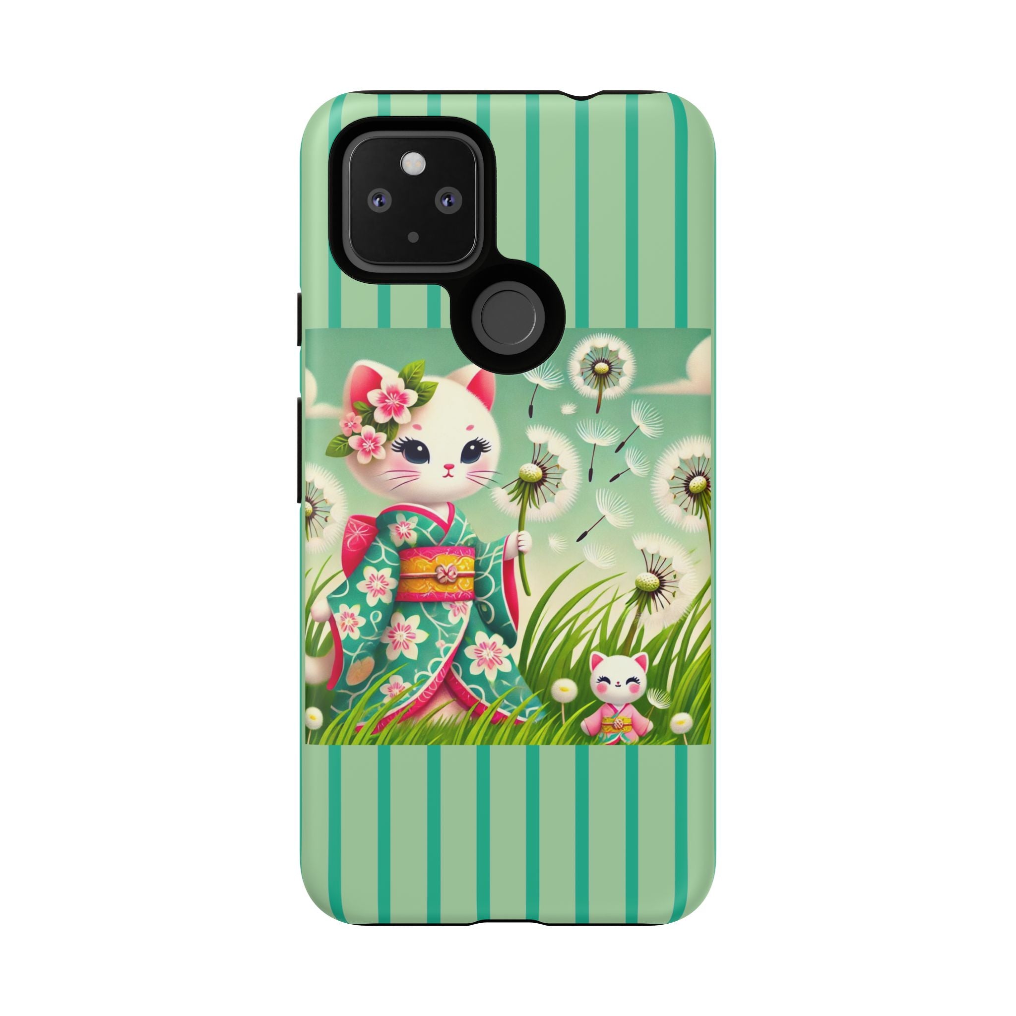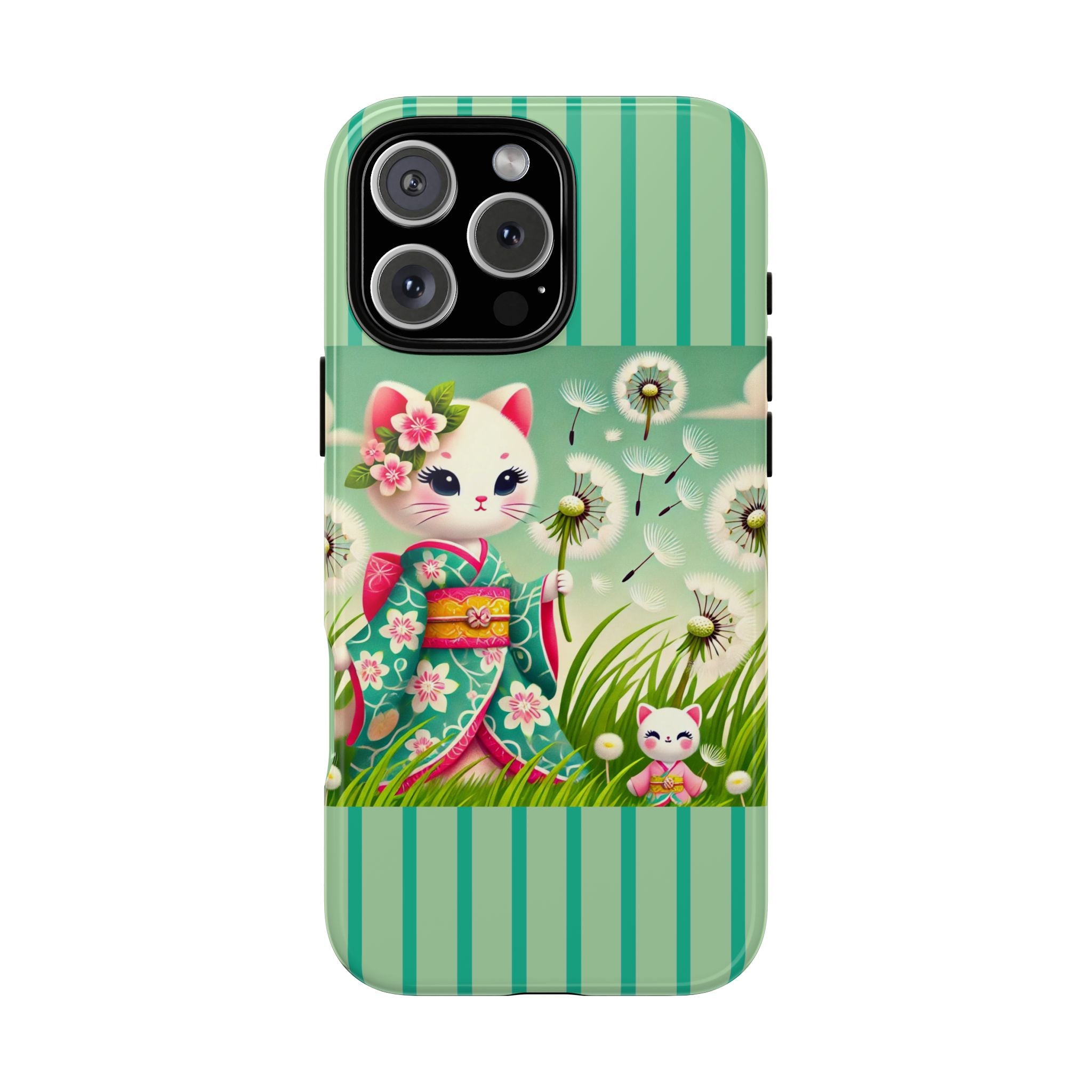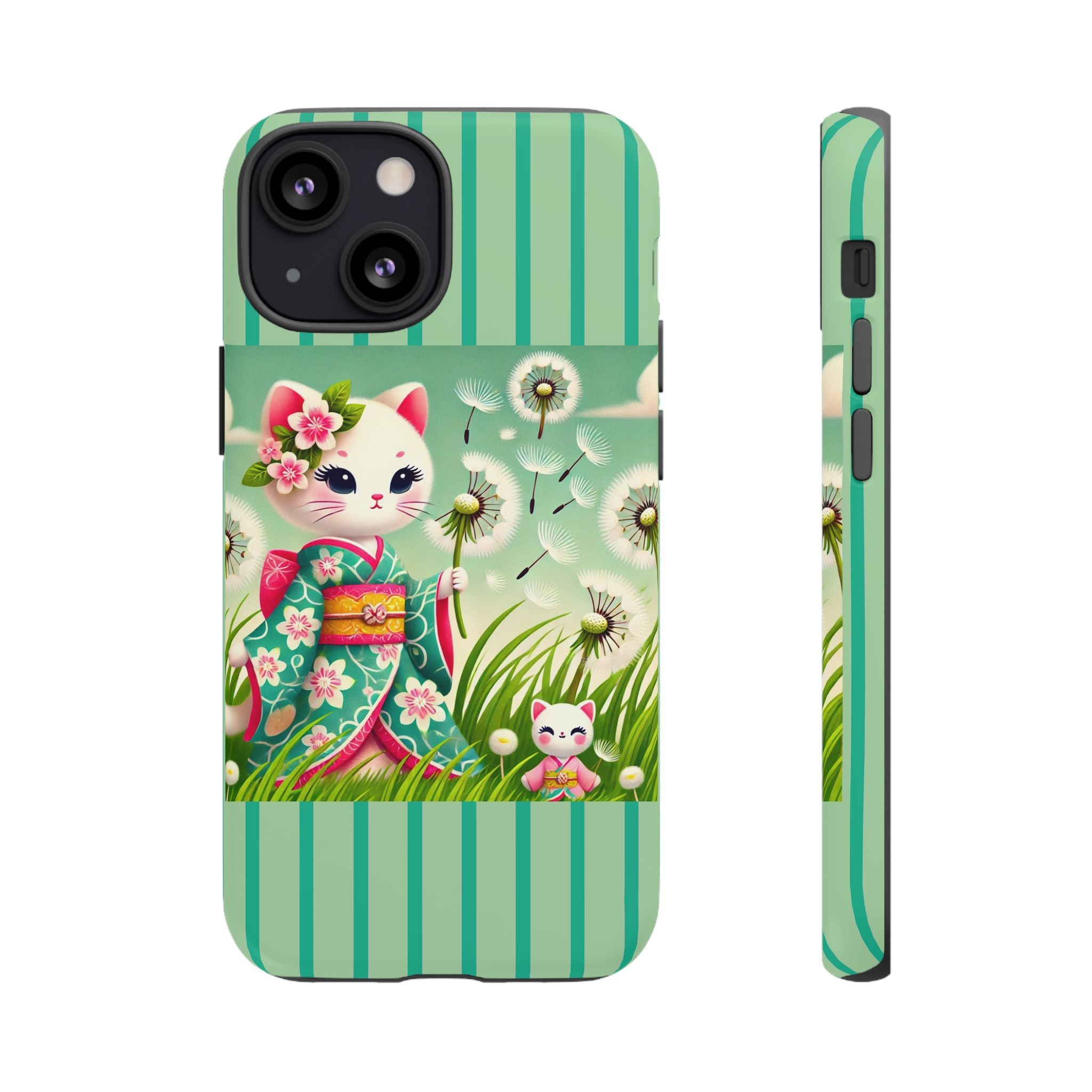 Add a touch of calm charm to your day with our Geisha Kitten and the Dandelion Phone Cases. Designed for iPhone, Samsung Galaxy, and Google Pixel devices, these premium-quality cases combine everyday protection with the gentle beauty of whimsical art. The design features a serene illustration of a geisha kitten and her tiny kitten doll, both dressed in matching kimonos, surrounded by tall swaying grass and drifting dandelion seeds. The soft colors and delicate details create a dreamy, tranquil mood that transforms your phone into a peaceful work of art.