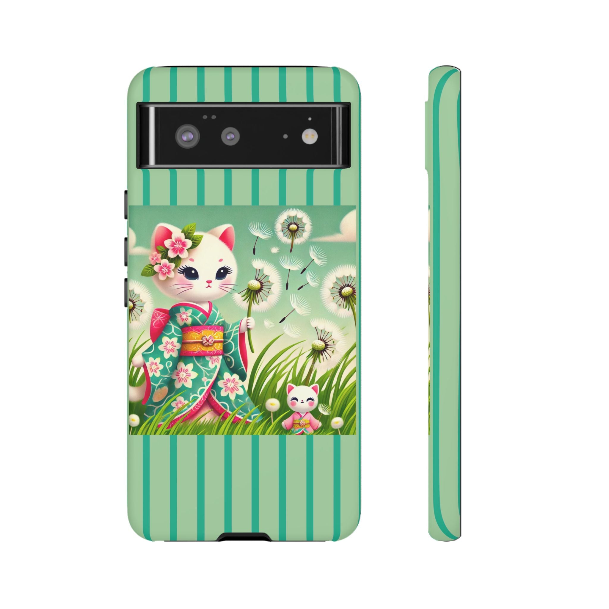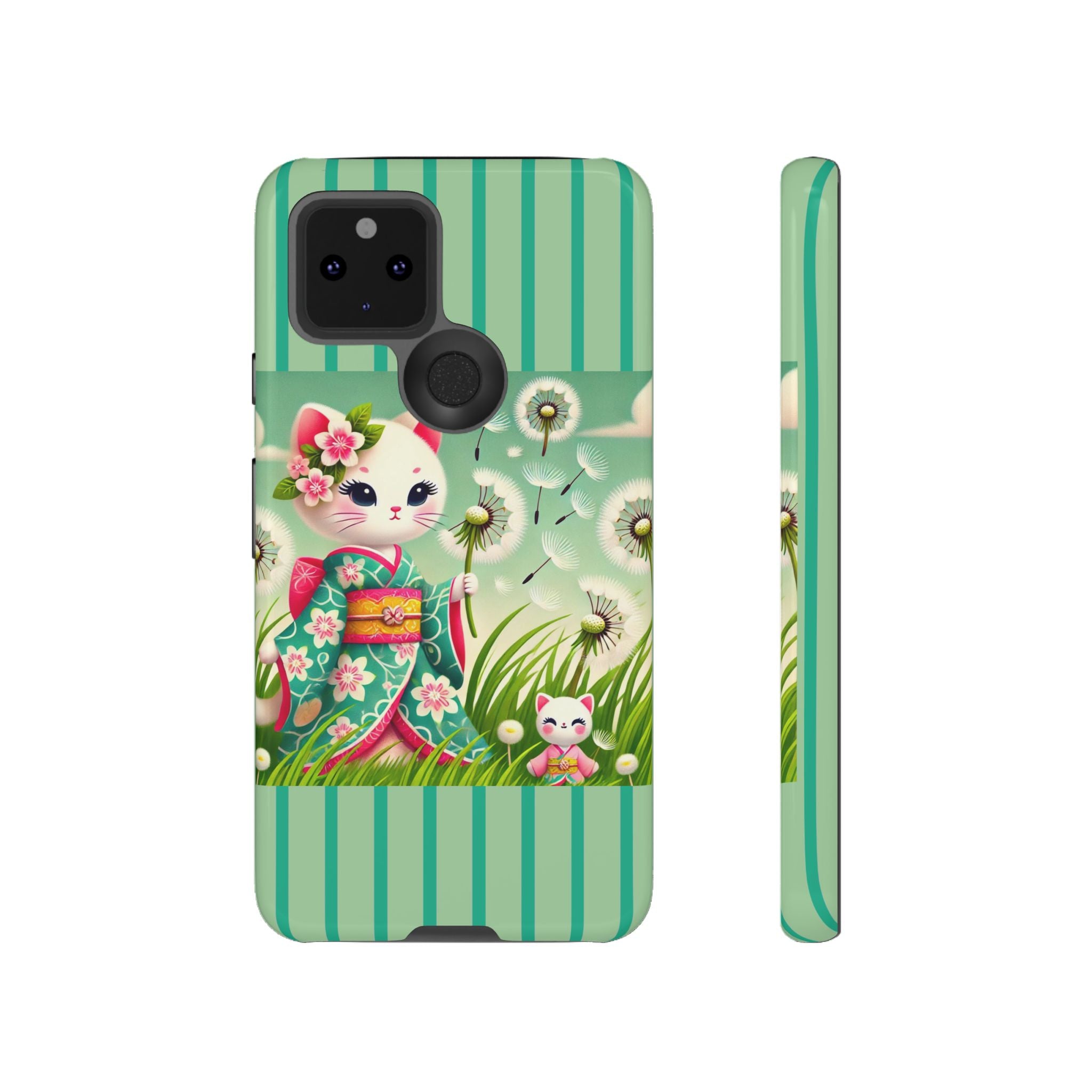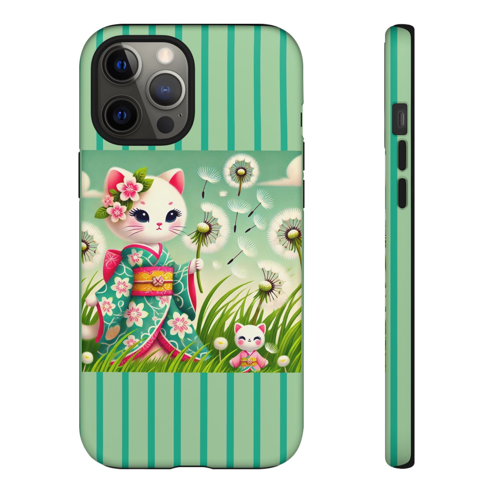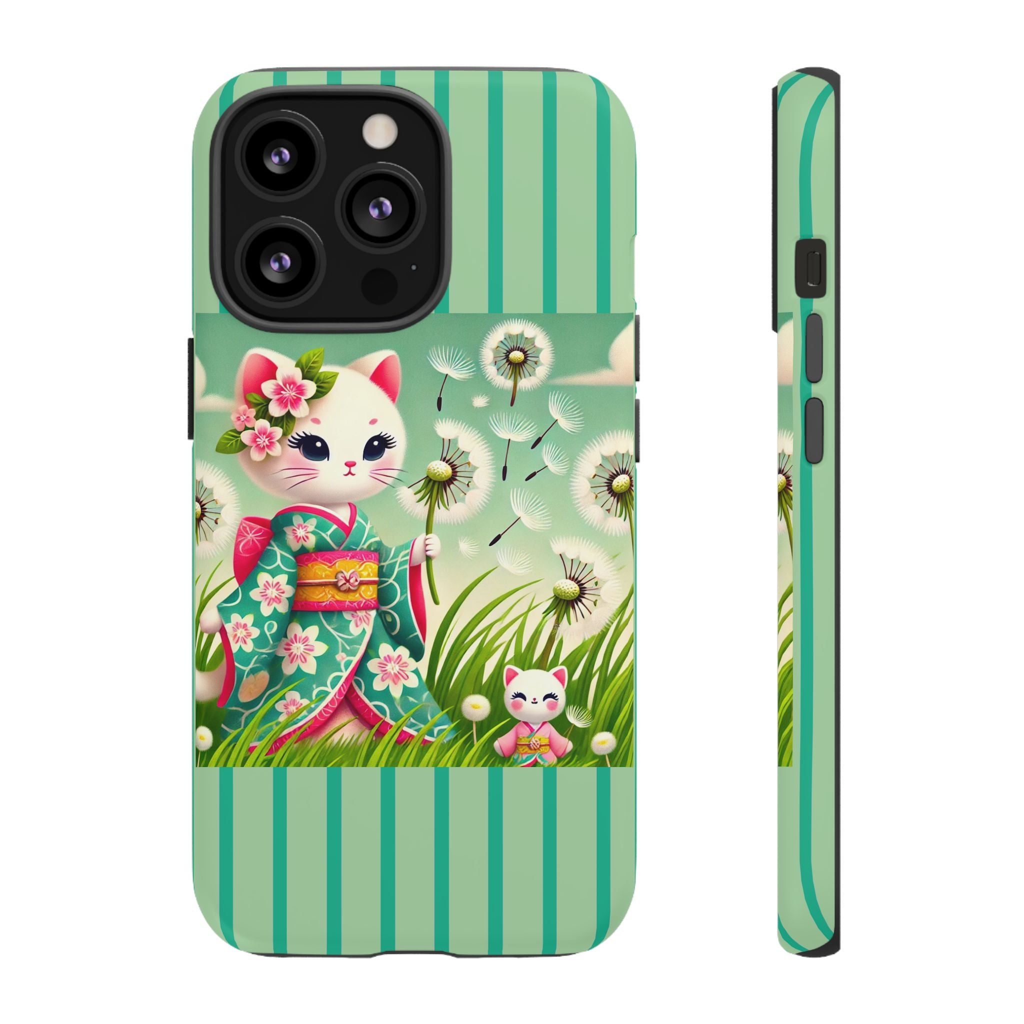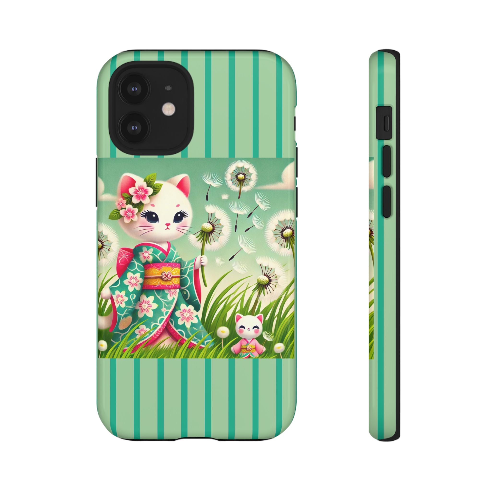 Add a touch of calm charm to your day with our Geisha Kitten and the Dandelion Phone Cases. Designed for iPhone, Samsung Galaxy, and Google Pixel devices, these premium-quality cases combine everyday protection with the gentle beauty of whimsical art. The design features a serene illustration of a geisha kitten and her tiny kitten doll, both dressed in matching kimonos, surrounded by tall swaying grass and drifting dandelion seeds. The soft colors and delicate details create a dreamy, tranquil mood that transforms your phone into a peaceful work of art.