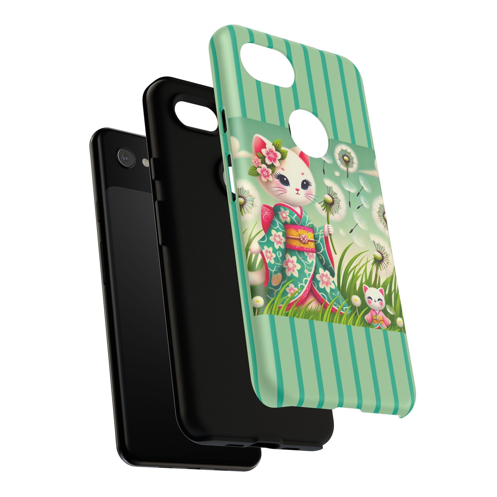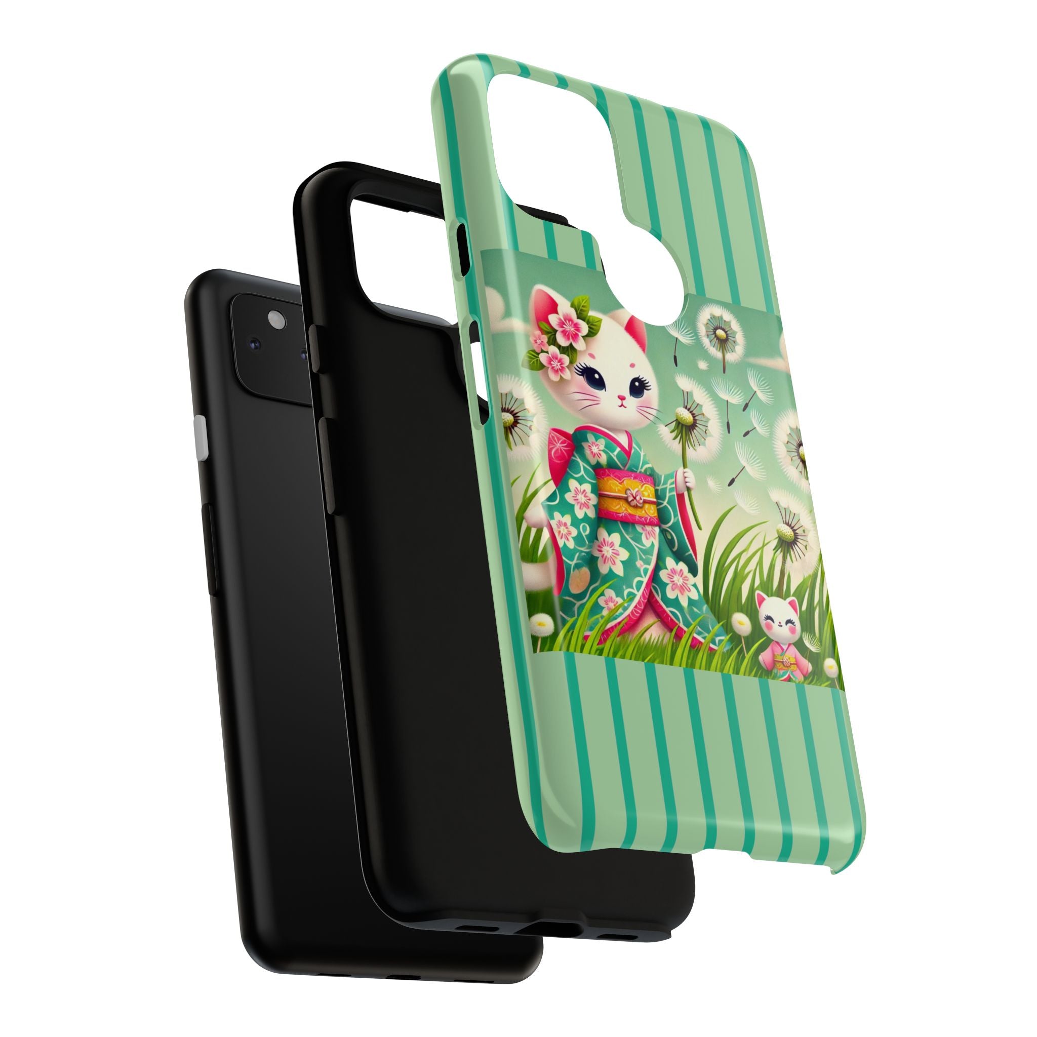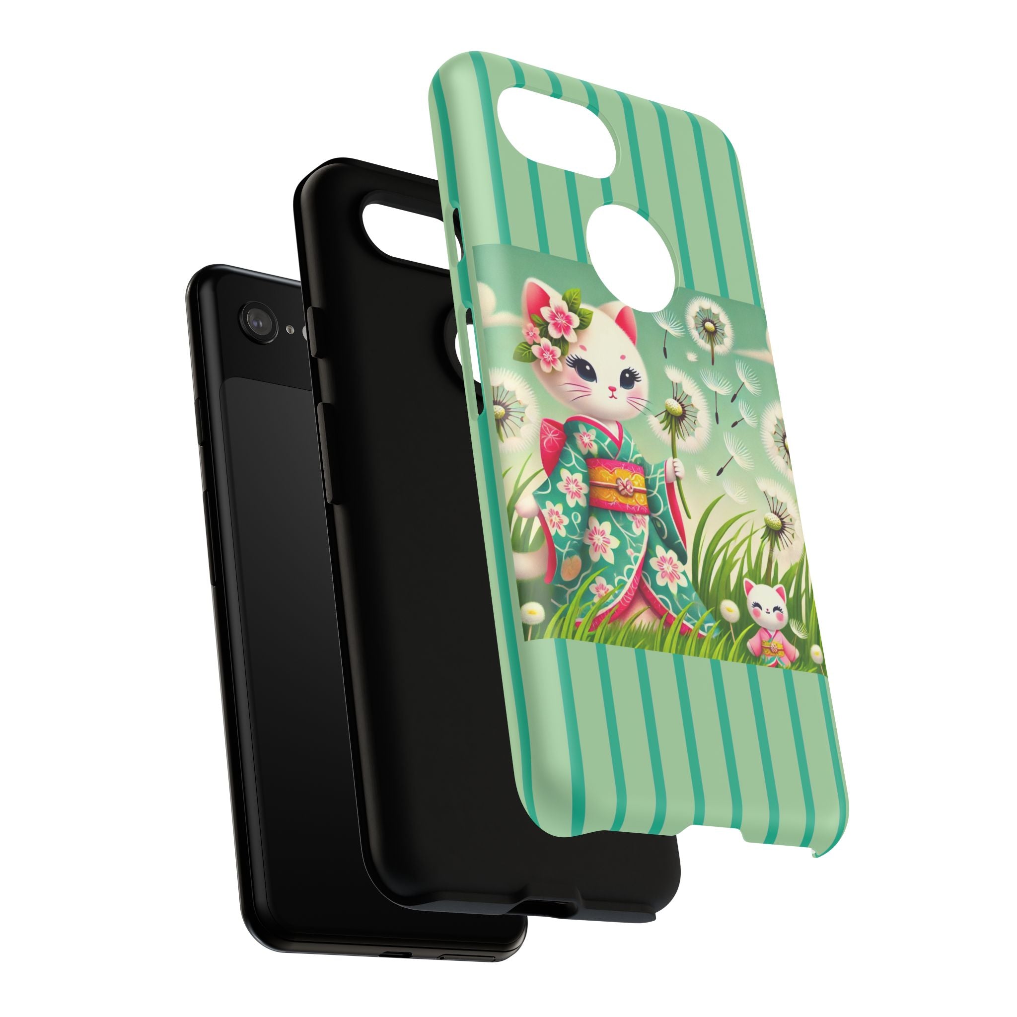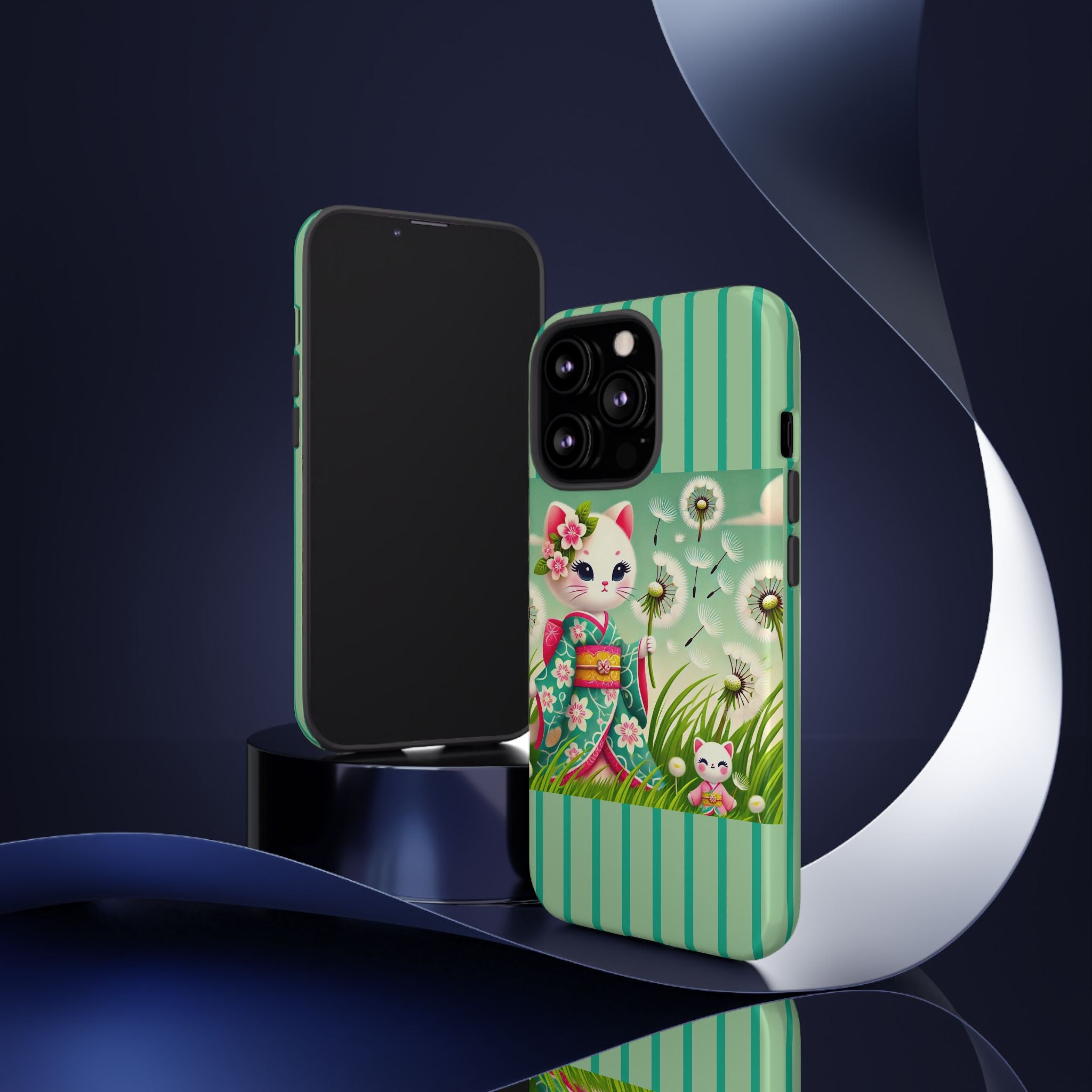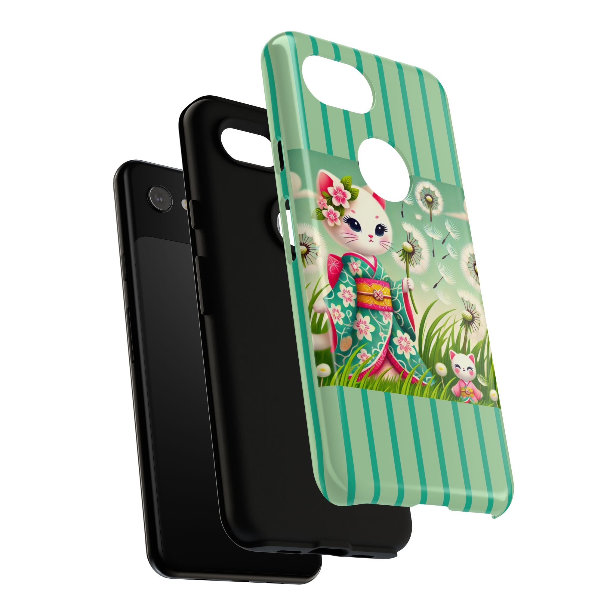 Add a touch of calm charm to your day with our Geisha Kitten and the Dandelion Phone Cases. Designed for iPhone, Samsung Galaxy, and Google Pixel devices, these premium-quality cases combine everyday protection with the gentle beauty of whimsical art. The design features a serene illustration of a geisha kitten and her tiny kitten doll, both dressed in matching kimonos, surrounded by tall swaying grass and drifting dandelion seeds. The soft colors and delicate details create a dreamy, tranquil mood that transforms your phone into a peaceful work of art.