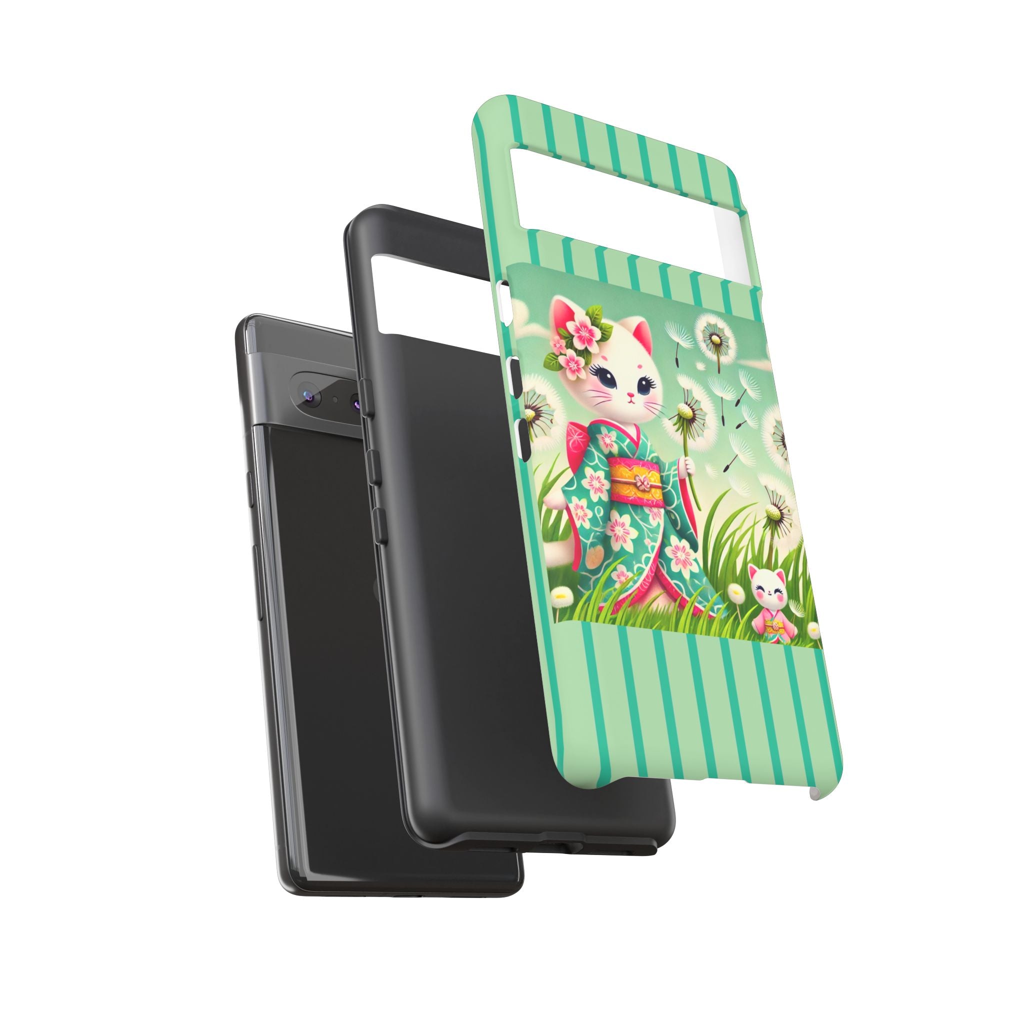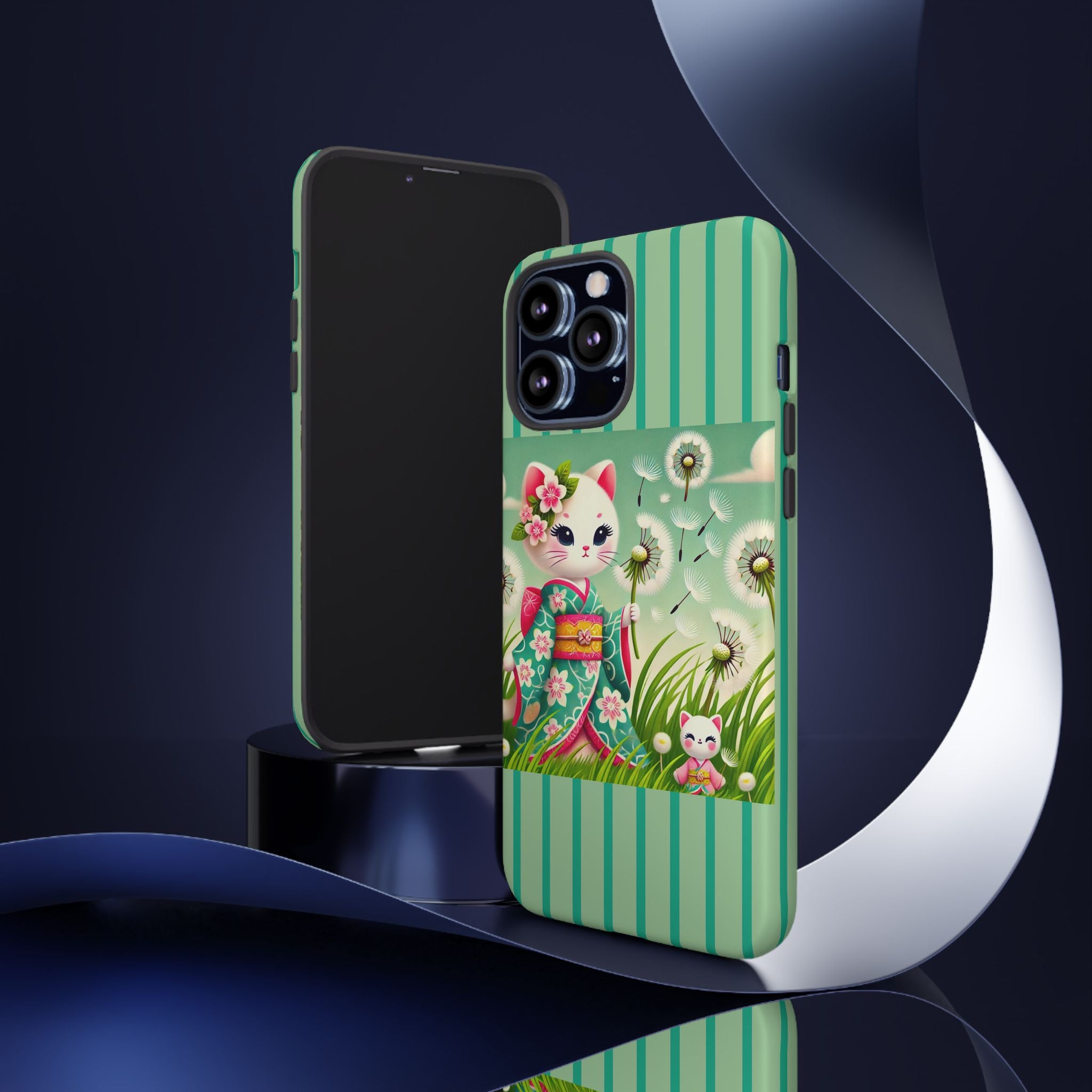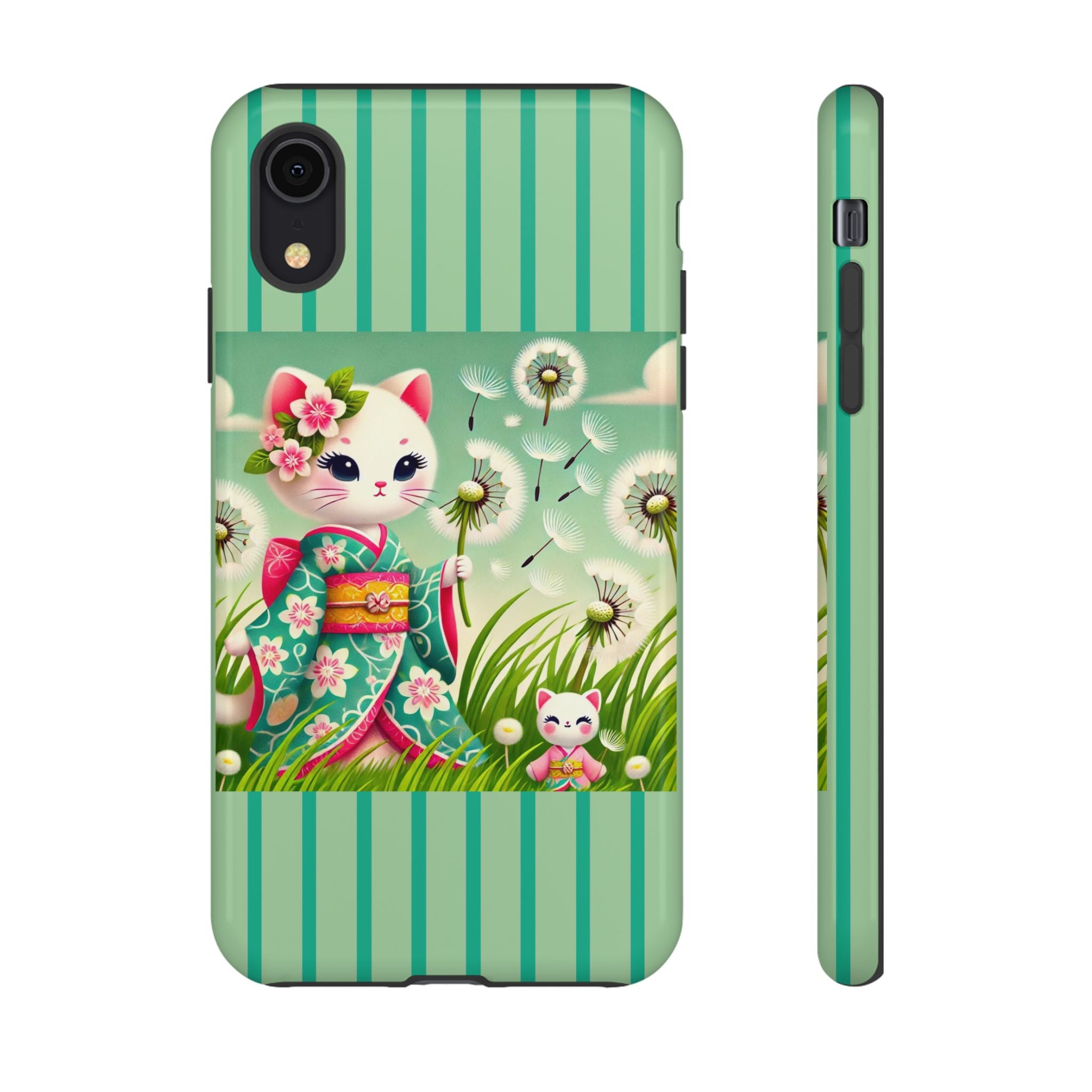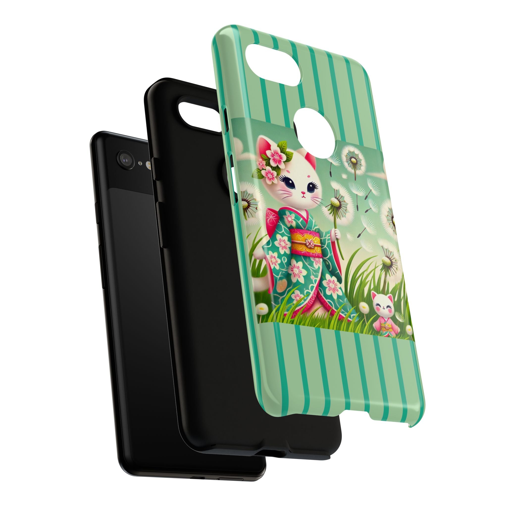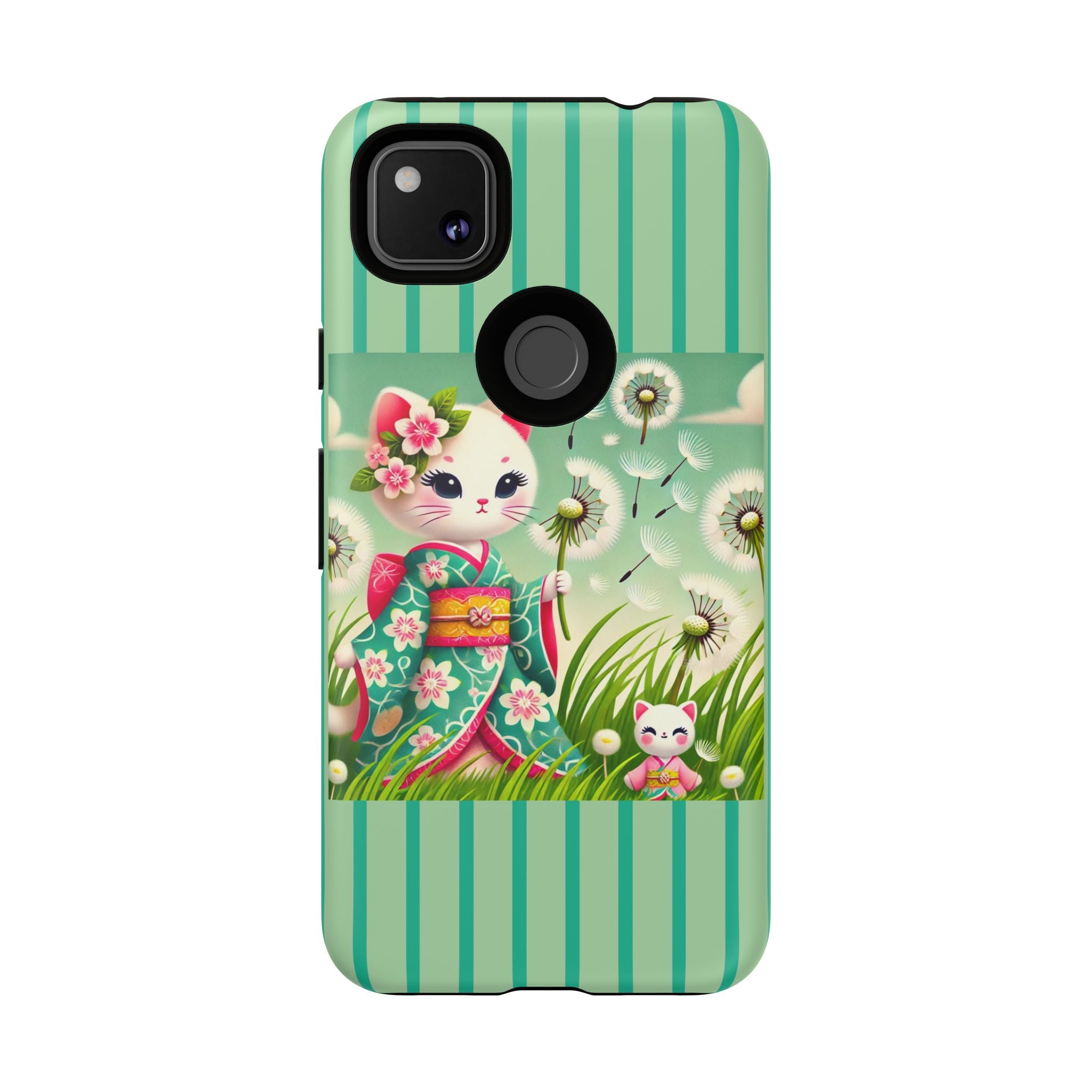 Add a touch of calm charm to your day with our Geisha Kitten and the Dandelion Phone Cases. Designed for iPhone, Samsung Galaxy, and Google Pixel devices, these premium-quality cases combine everyday protection with the gentle beauty of whimsical art. The design features a serene illustration of a geisha kitten and her tiny kitten doll, both dressed in matching kimonos, surrounded by tall swaying grass and drifting dandelion seeds. The soft colors and delicate details create a dreamy, tranquil mood that transforms your phone into a peaceful work of art.