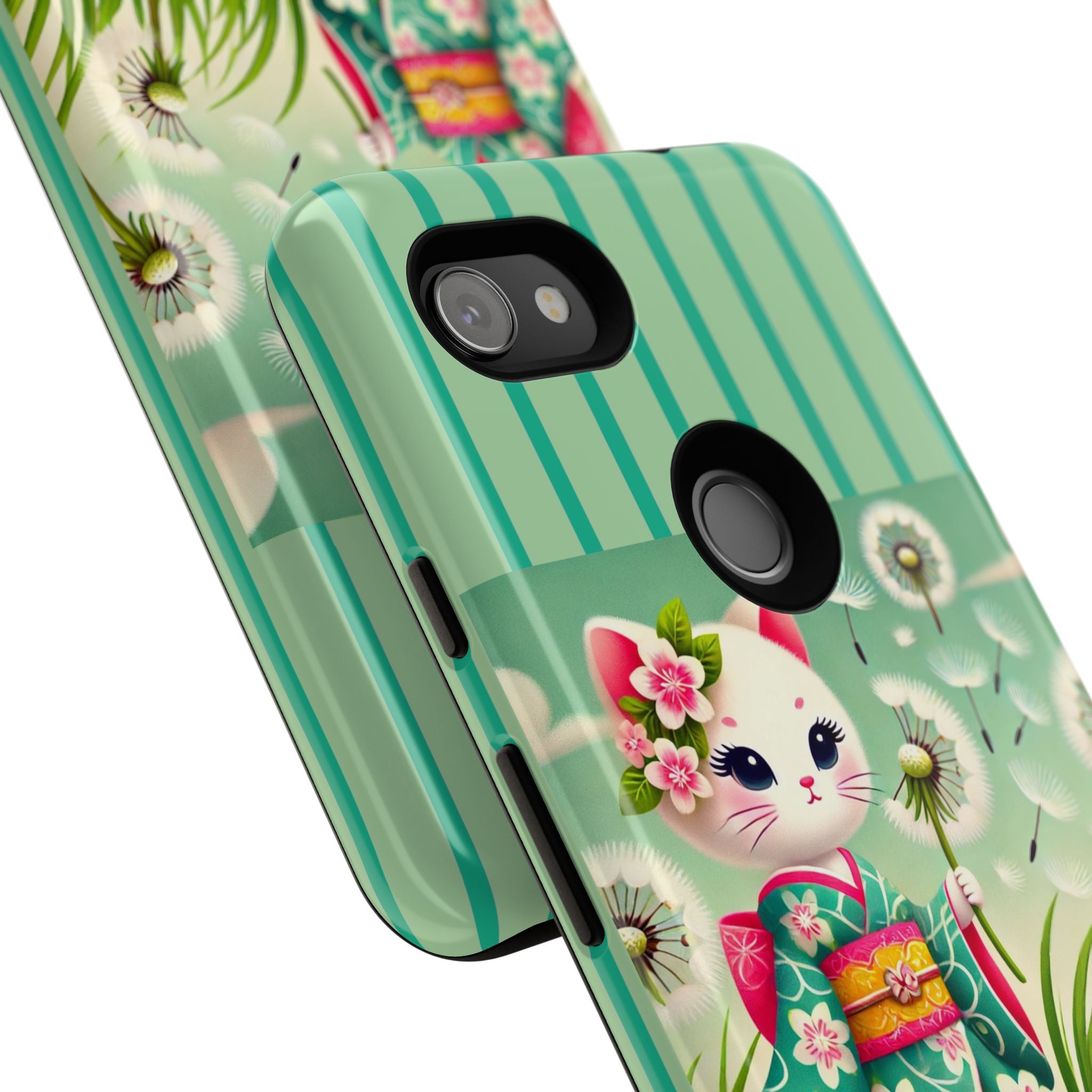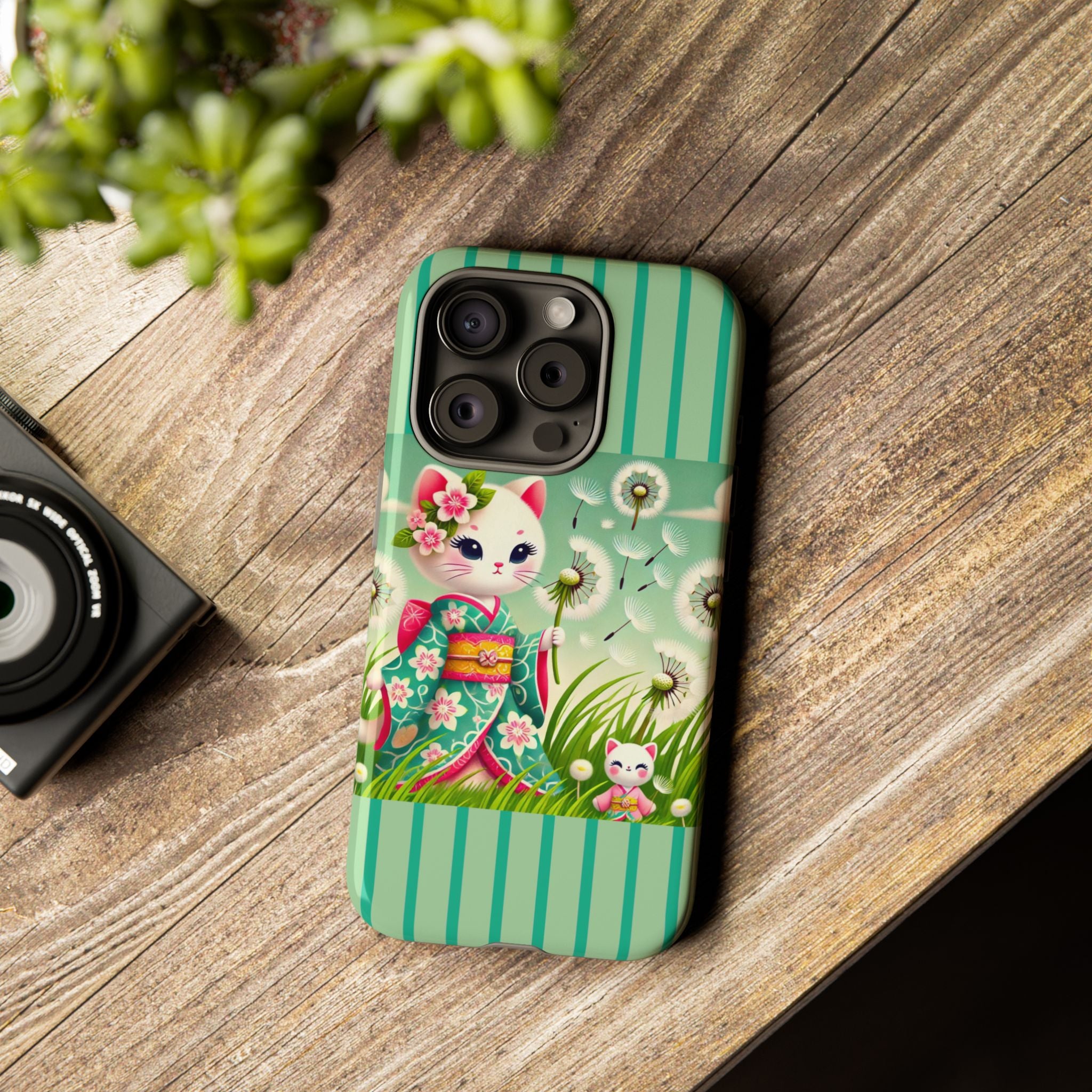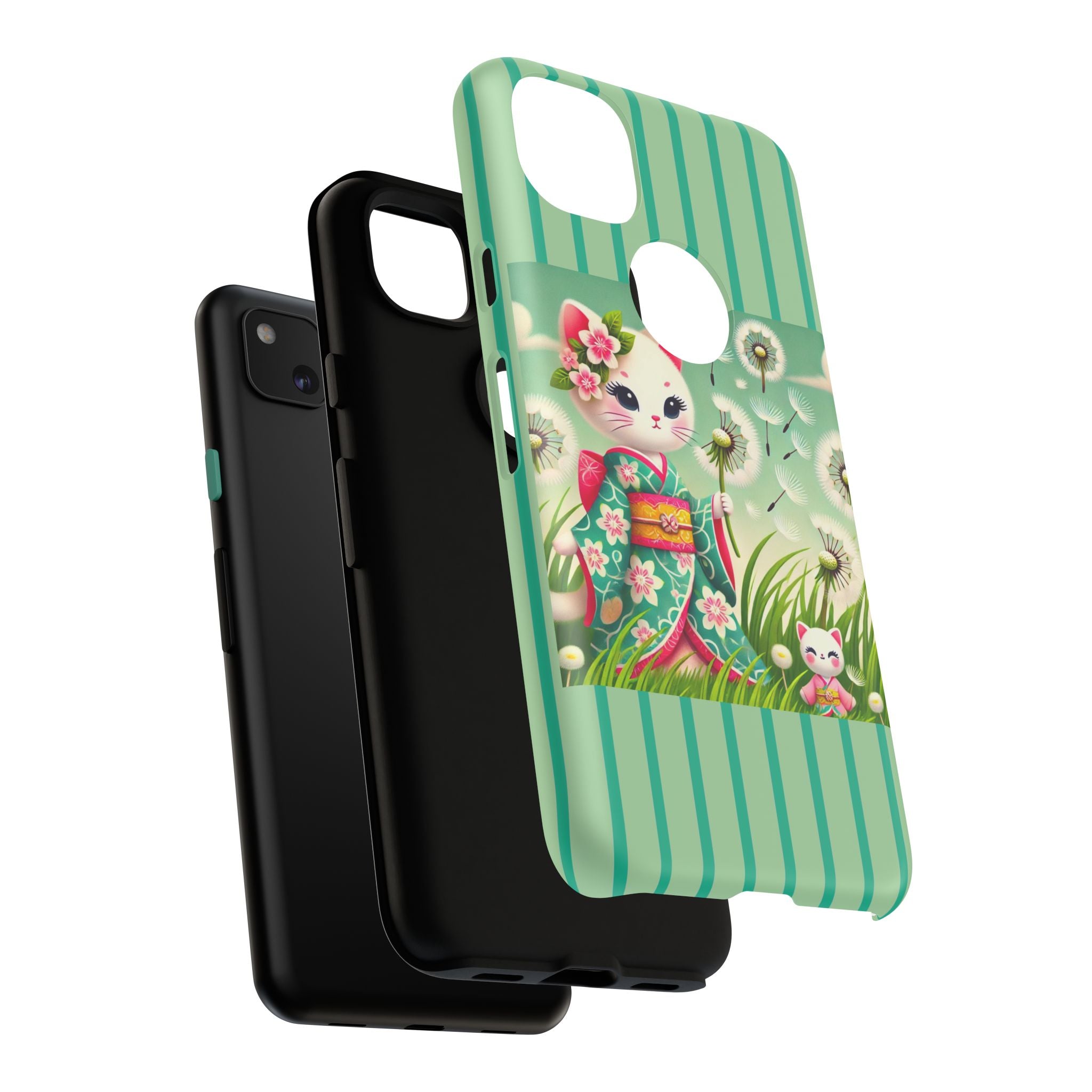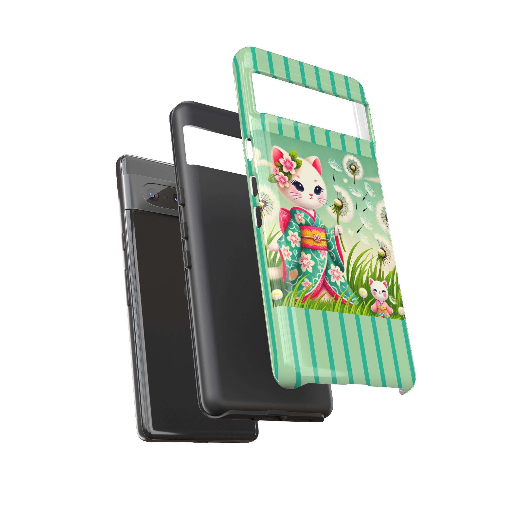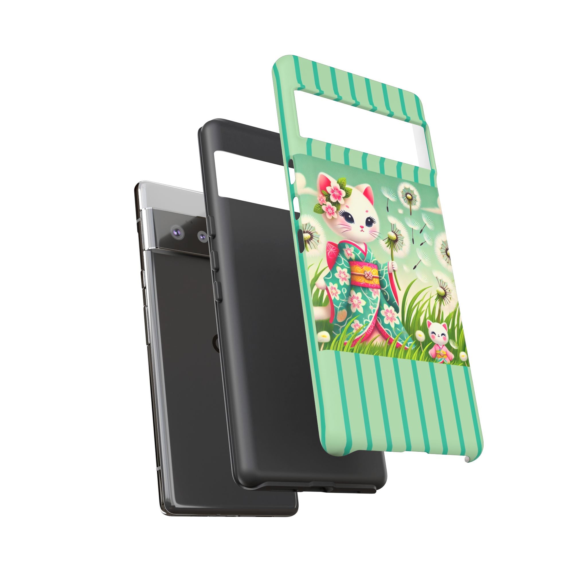 Add a touch of calm charm to your day with our Geisha Kitten and the Dandelion Phone Cases. Designed for iPhone, Samsung Galaxy, and Google Pixel devices, these premium-quality cases combine everyday protection with the gentle beauty of whimsical art. The design features a serene illustration of a geisha kitten and her tiny kitten doll, both dressed in matching kimonos, surrounded by tall swaying grass and drifting dandelion seeds. The soft colors and delicate details create a dreamy, tranquil mood that transforms your phone into a peaceful work of art.