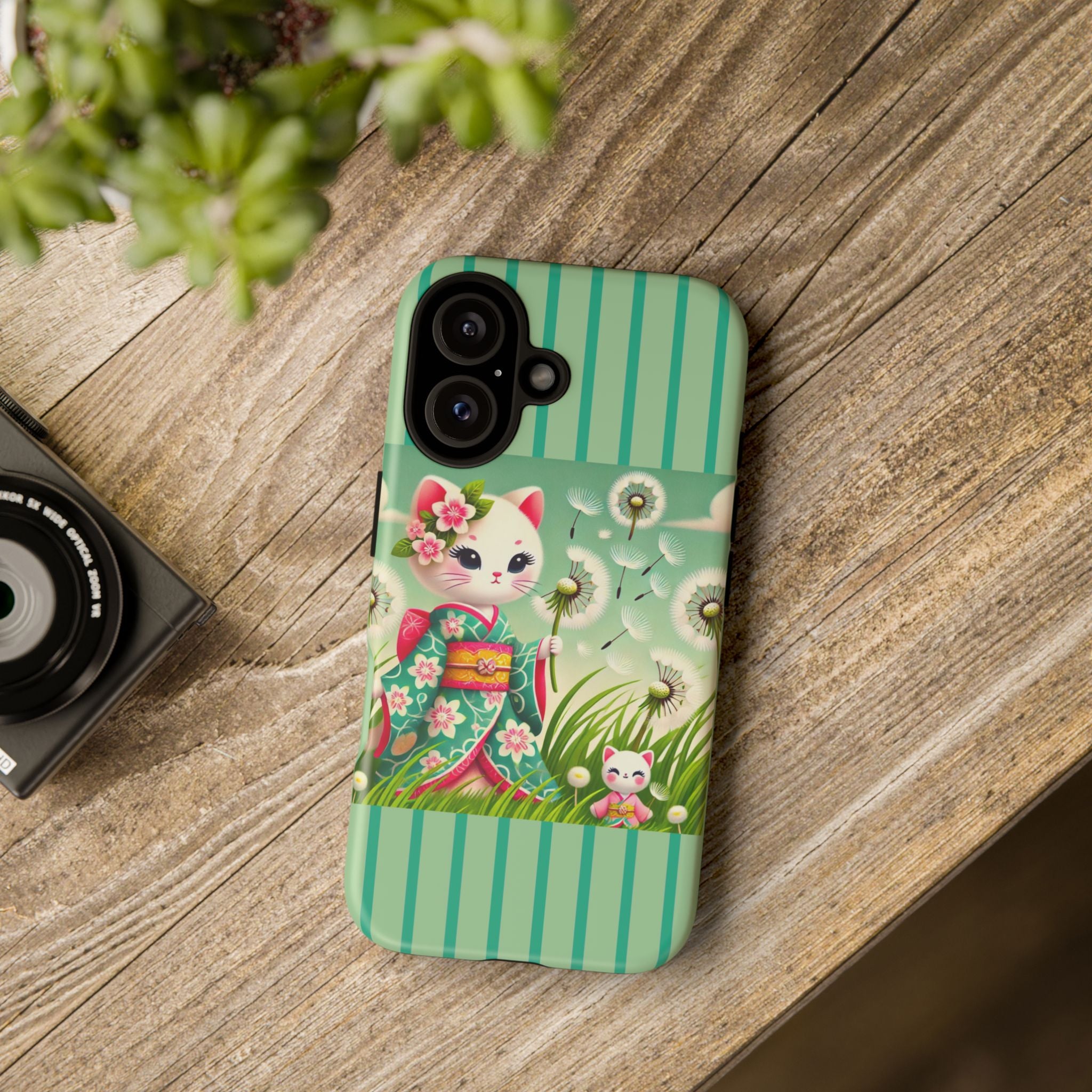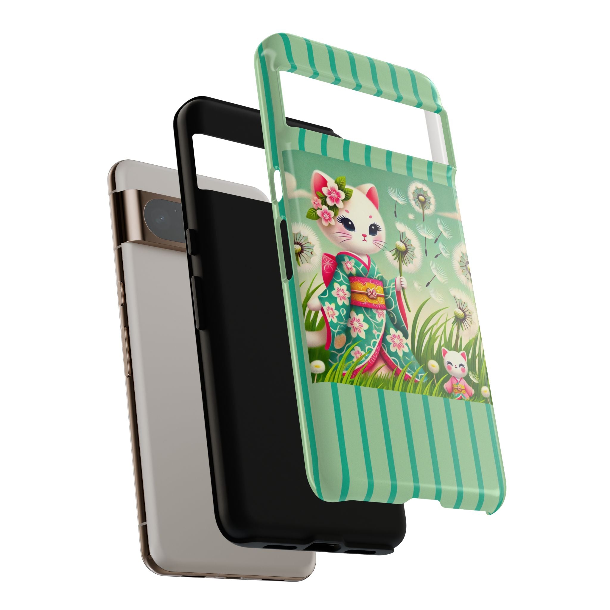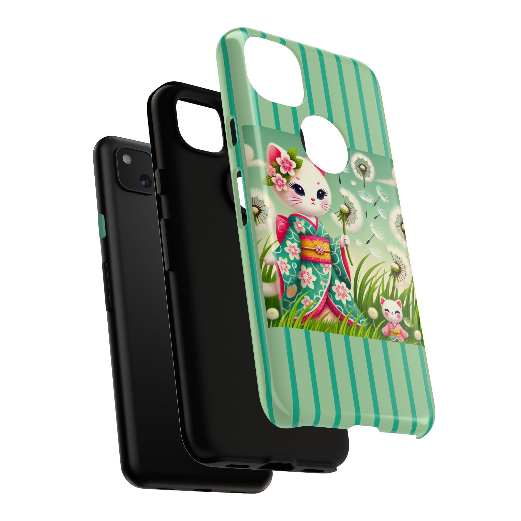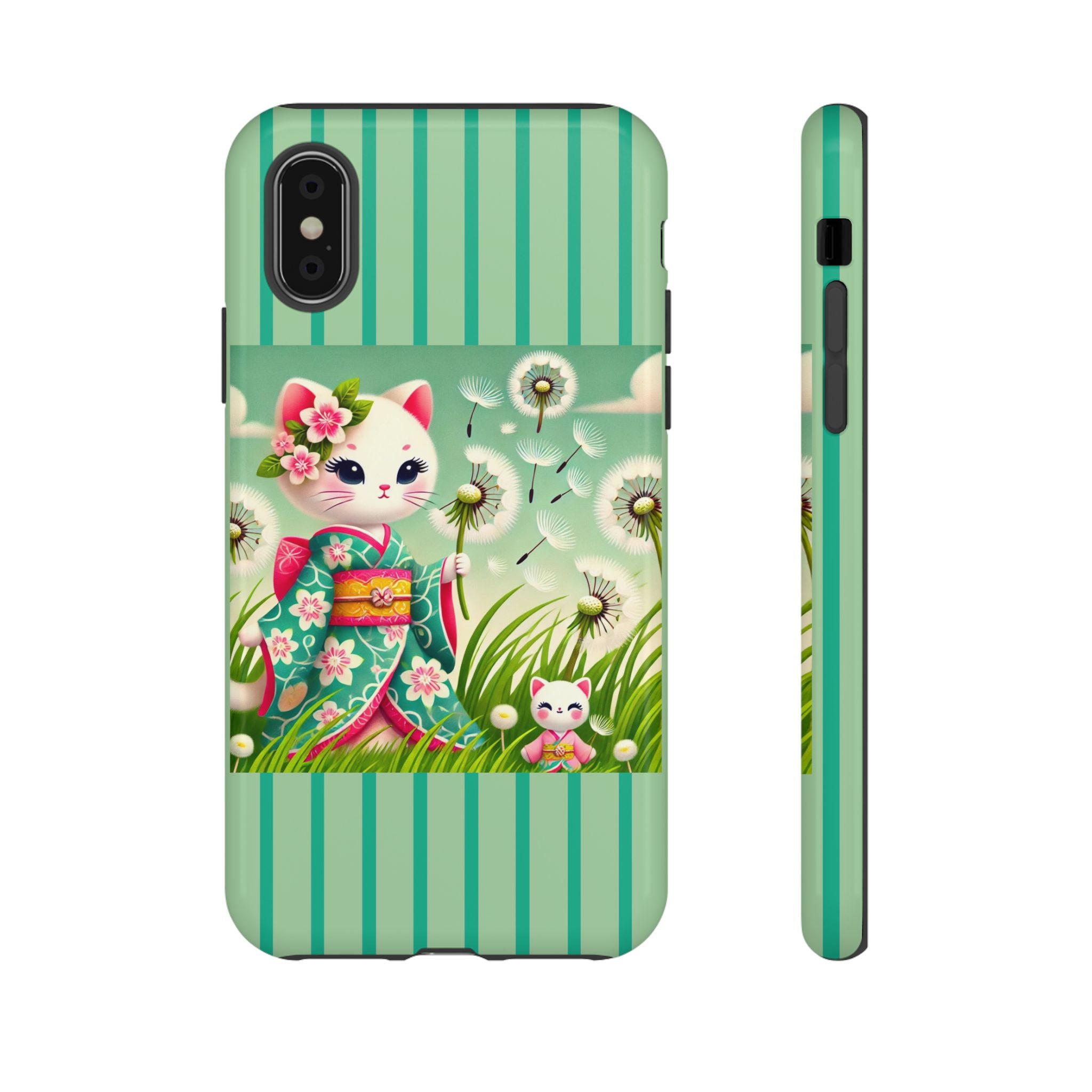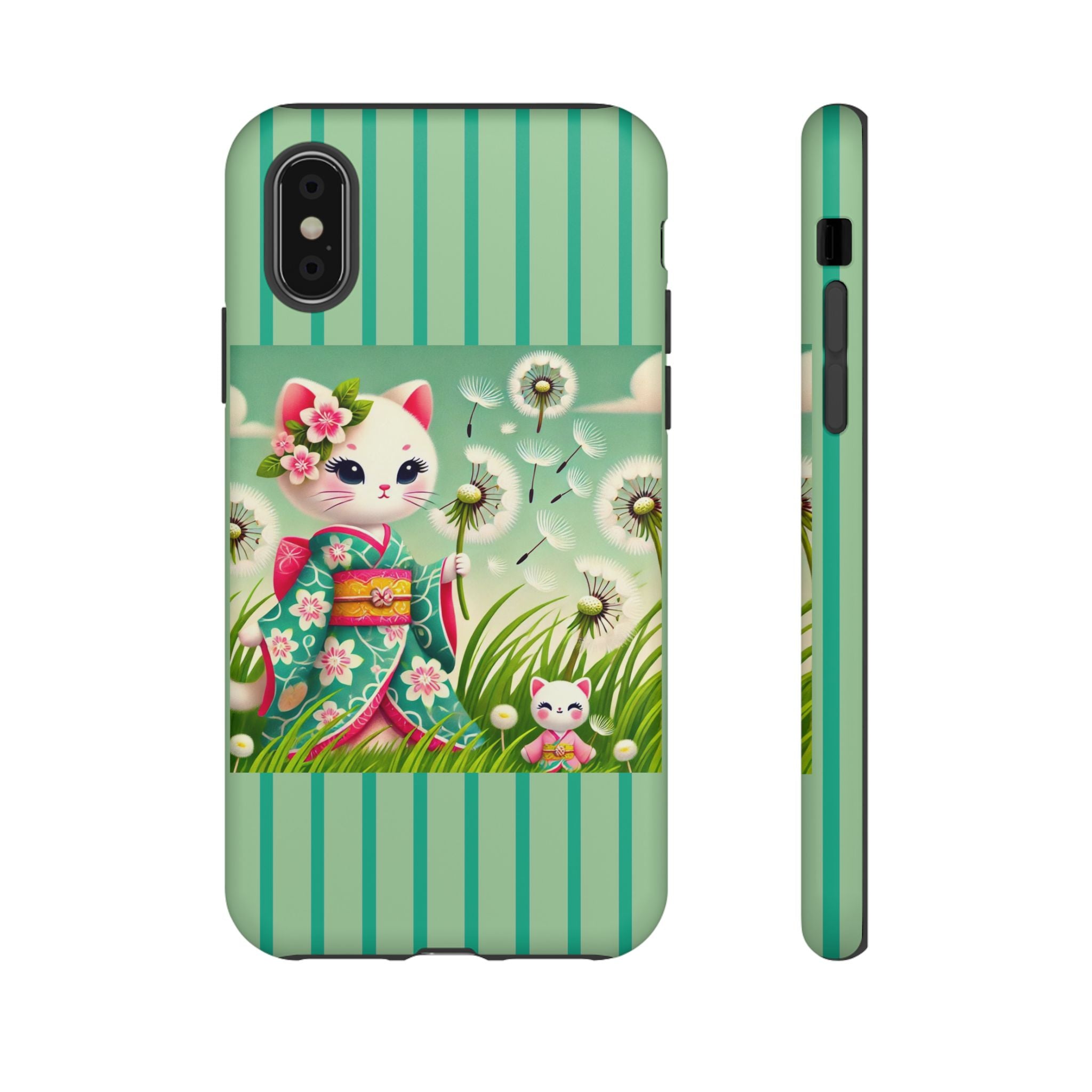 Add a touch of calm charm to your day with our Geisha Kitten and the Dandelion Phone Cases. Designed for iPhone, Samsung Galaxy, and Google Pixel devices, these premium-quality cases combine everyday protection with the gentle beauty of whimsical art. The design features a serene illustration of a geisha kitten and her tiny kitten doll, both dressed in matching kimonos, surrounded by tall swaying grass and drifting dandelion seeds. The soft colors and delicate details create a dreamy, tranquil mood that transforms your phone into a peaceful work of art.