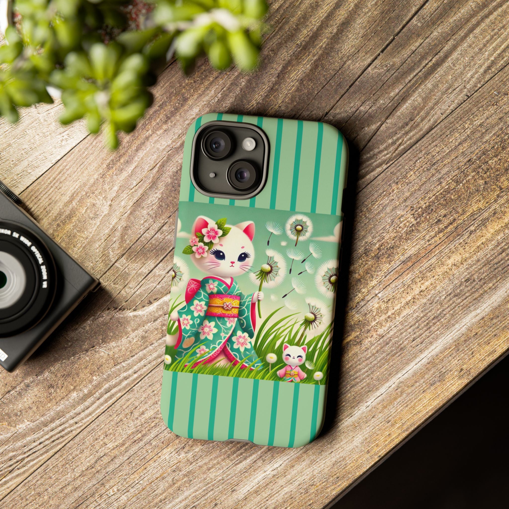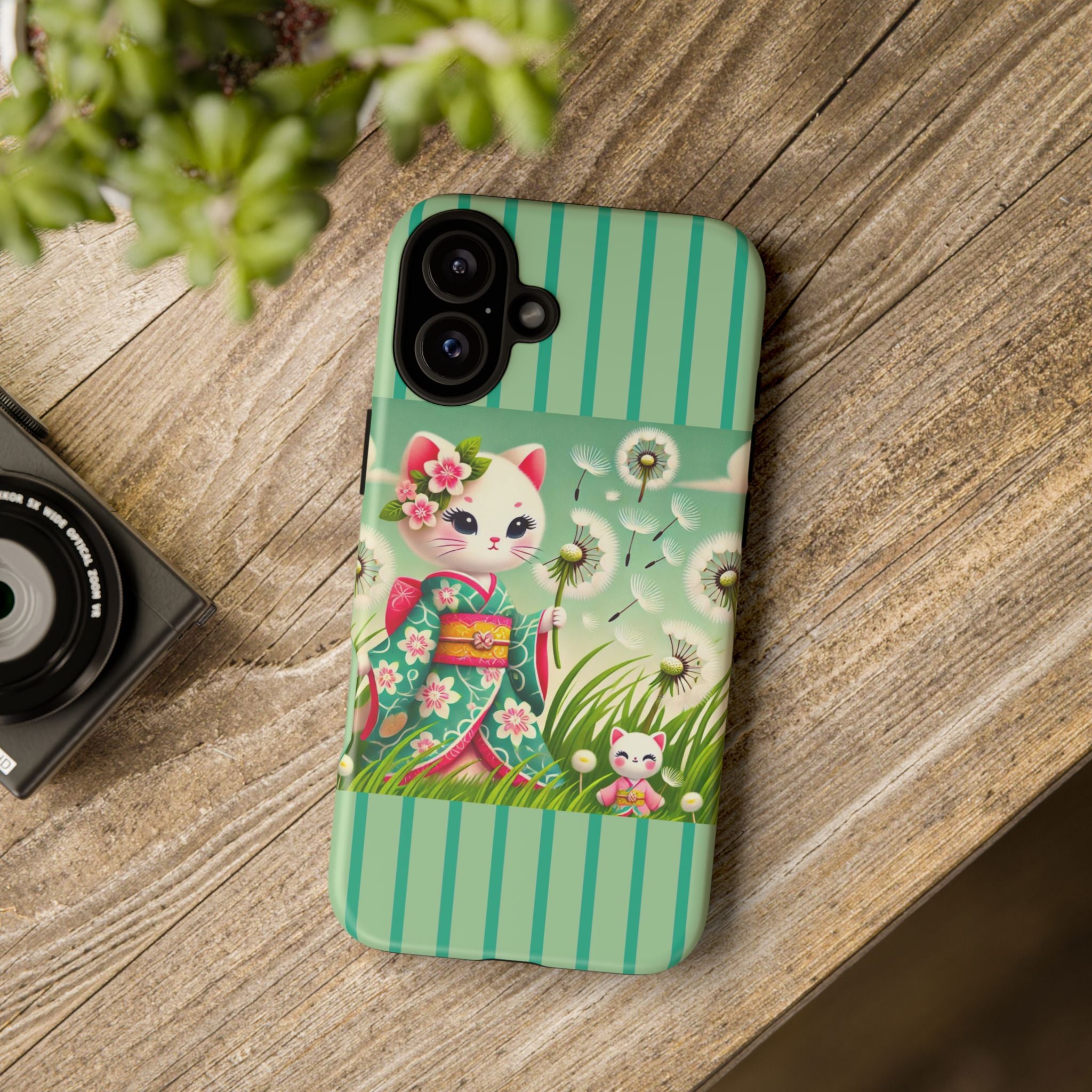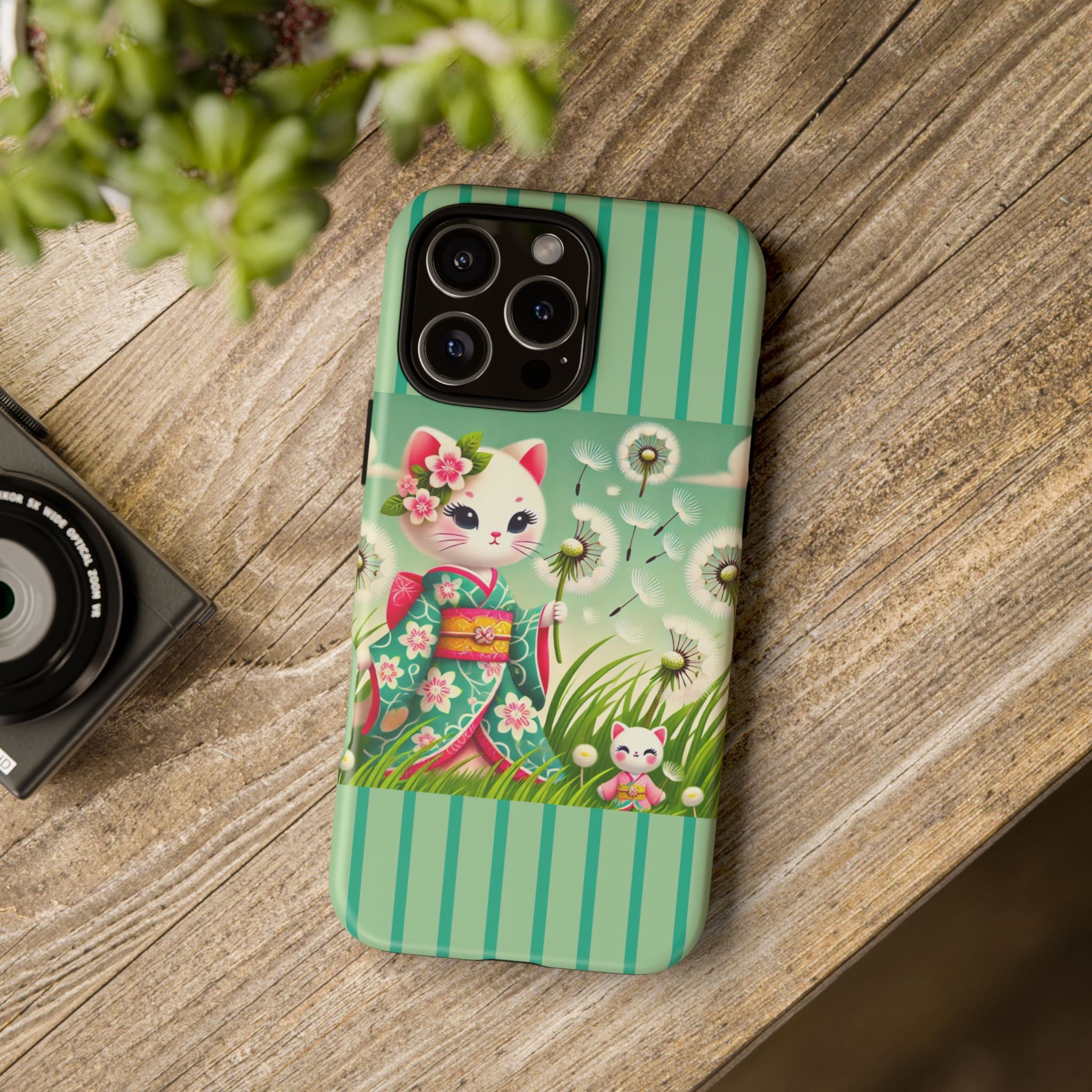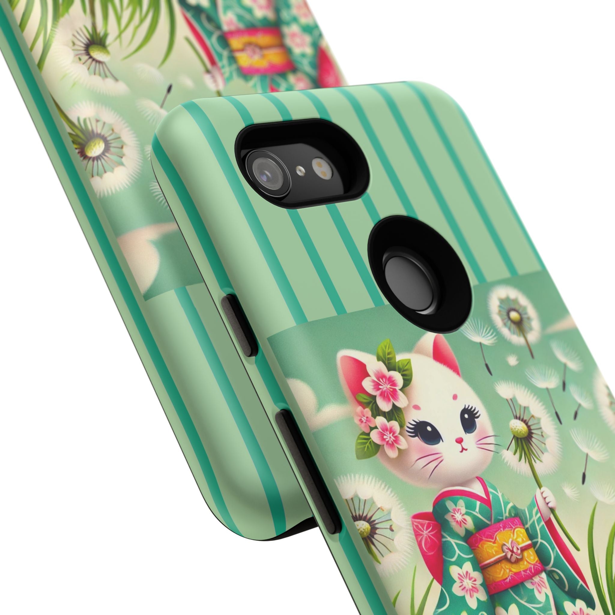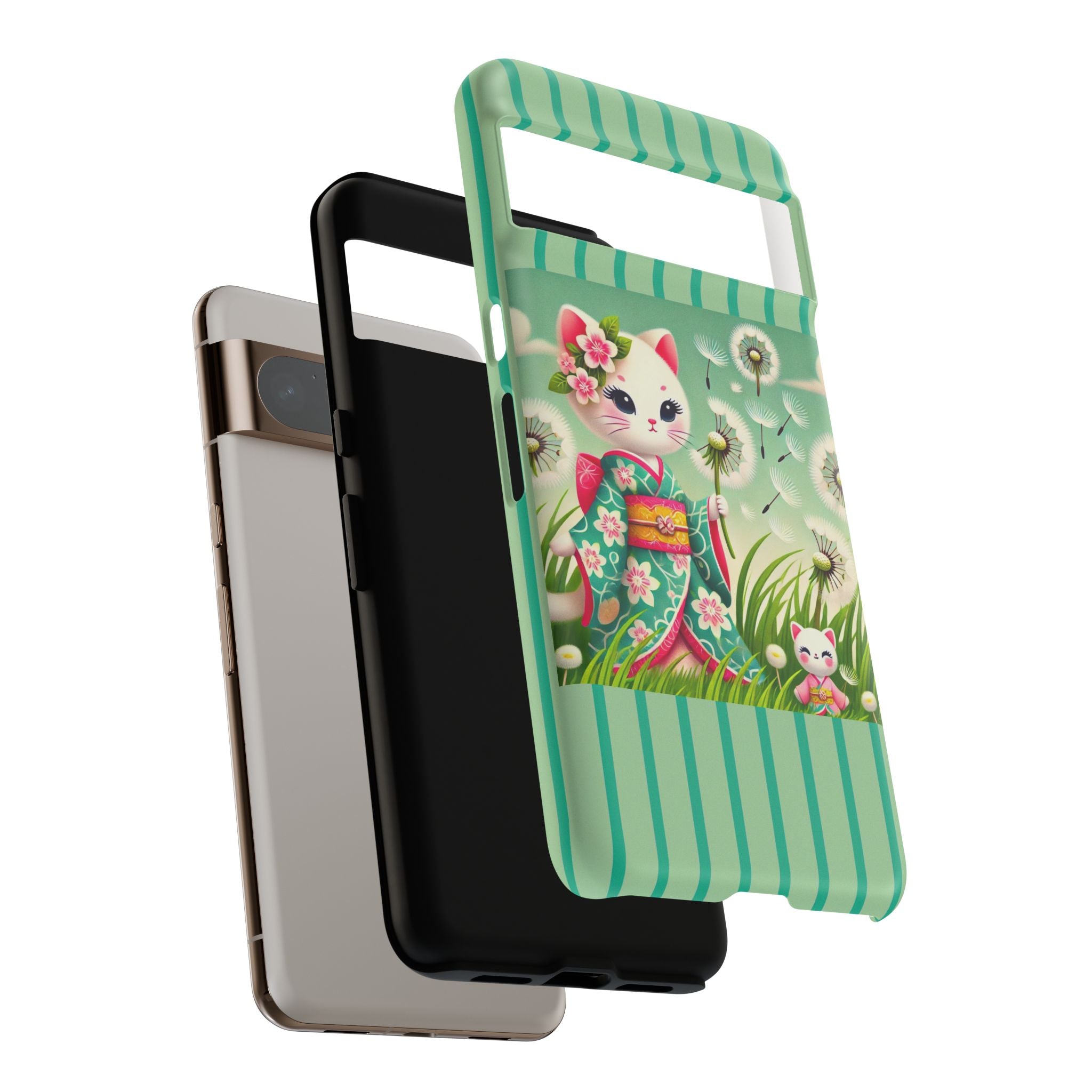 Add a touch of calm charm to your day with our Geisha Kitten and the Dandelion Phone Cases. Designed for iPhone, Samsung Galaxy, and Google Pixel devices, these premium-quality cases combine everyday protection with the gentle beauty of whimsical art. The design features a serene illustration of a geisha kitten and her tiny kitten doll, both dressed in matching kimonos, surrounded by tall swaying grass and drifting dandelion seeds. The soft colors and delicate details create a dreamy, tranquil mood that transforms your phone into a peaceful work of art.
