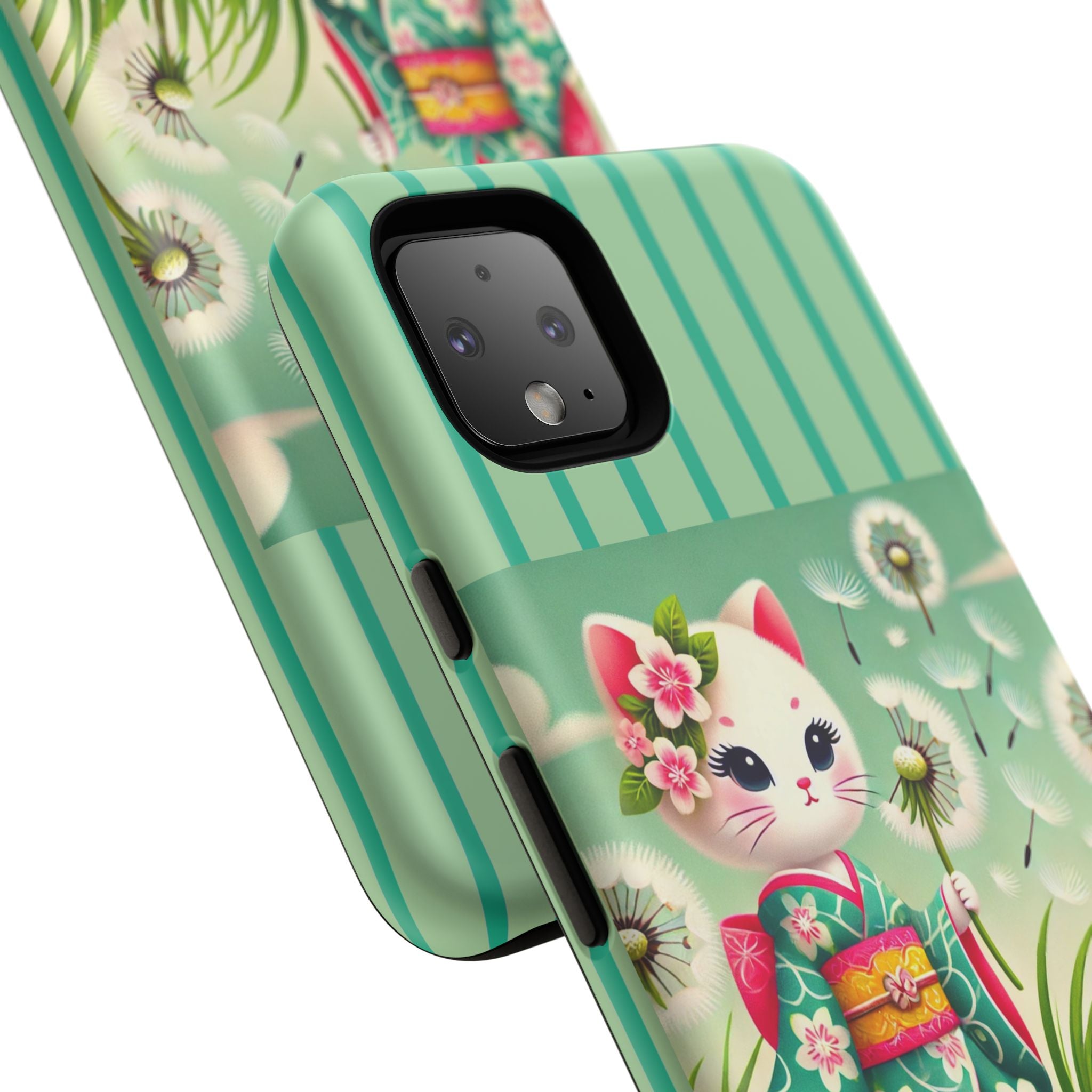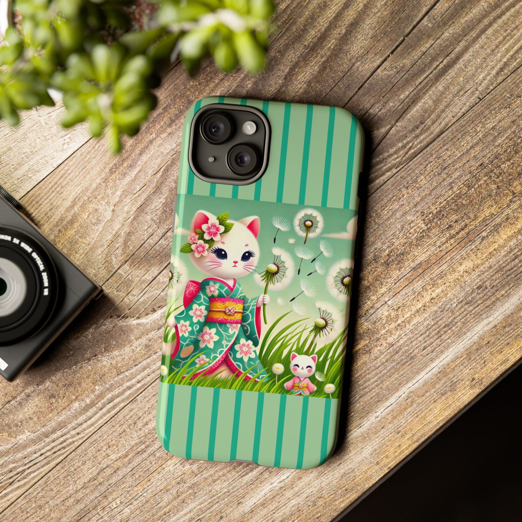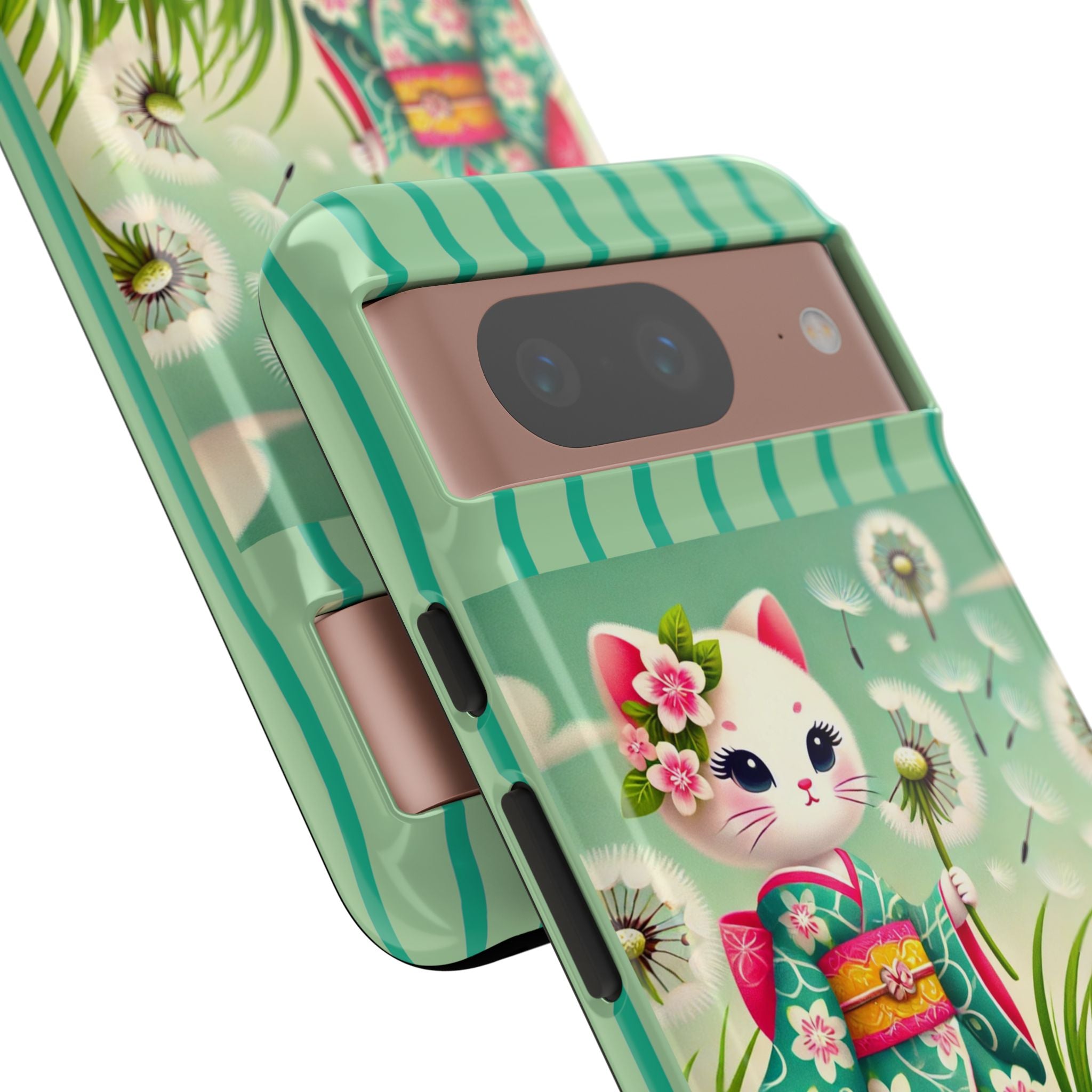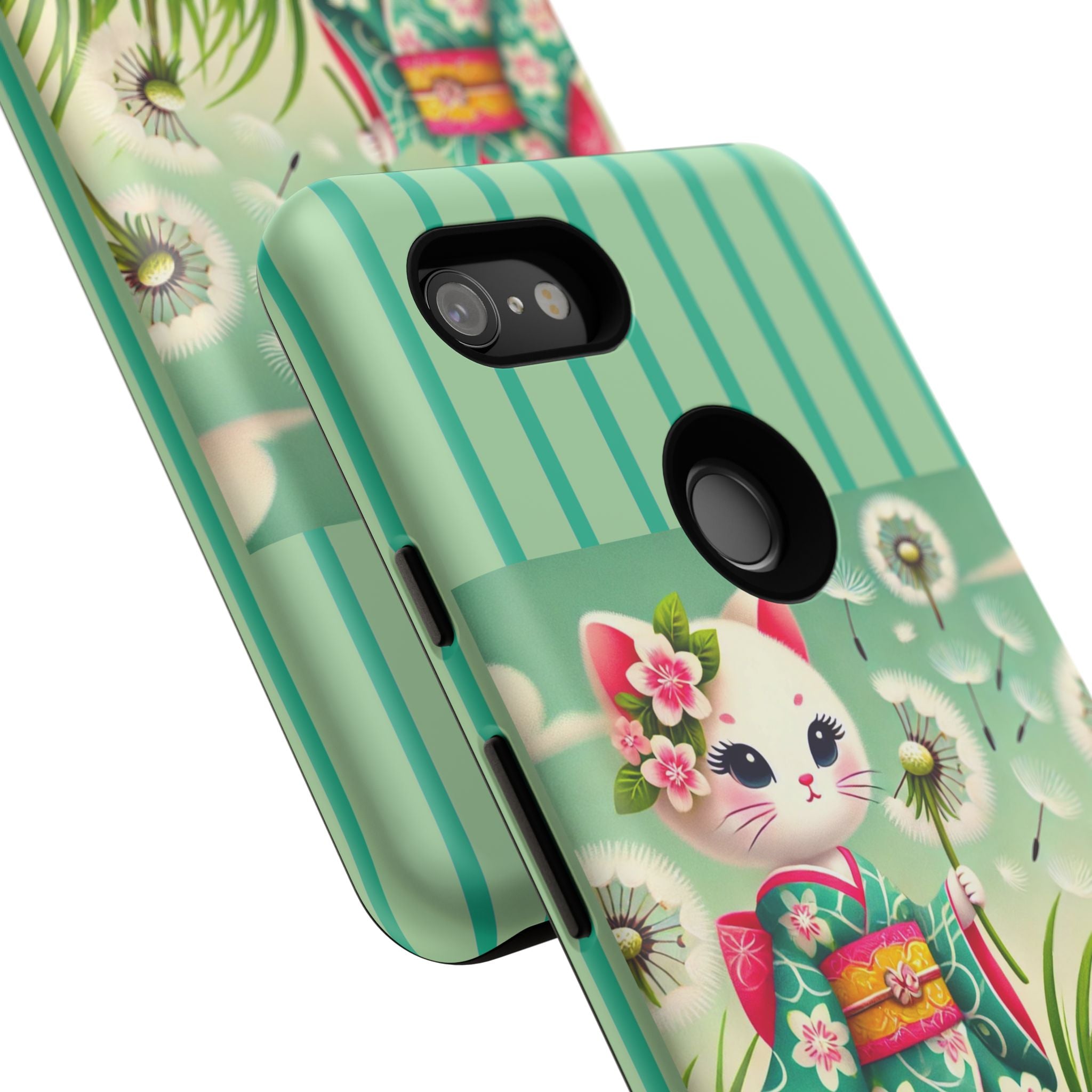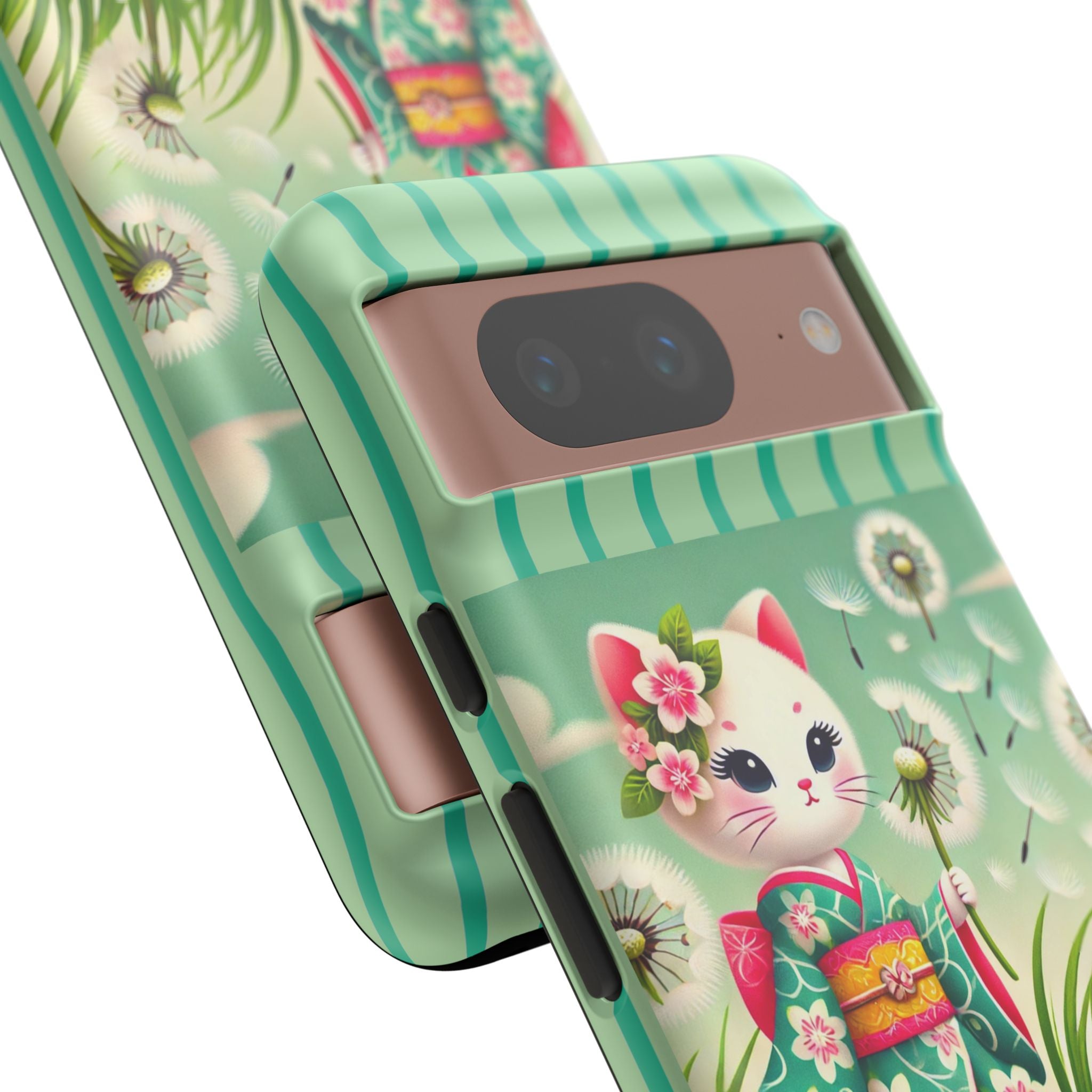 Add a touch of calm charm to your day with our Geisha Kitten and the Dandelion Phone Cases. Designed for iPhone, Samsung Galaxy, and Google Pixel devices, these premium-quality cases combine everyday protection with the gentle beauty of whimsical art. The design features a serene illustration of a geisha kitten and her tiny kitten doll, both dressed in matching kimonos, surrounded by tall swaying grass and drifting dandelion seeds. The soft colors and delicate details create a dreamy, tranquil mood that transforms your phone into a peaceful work of art.