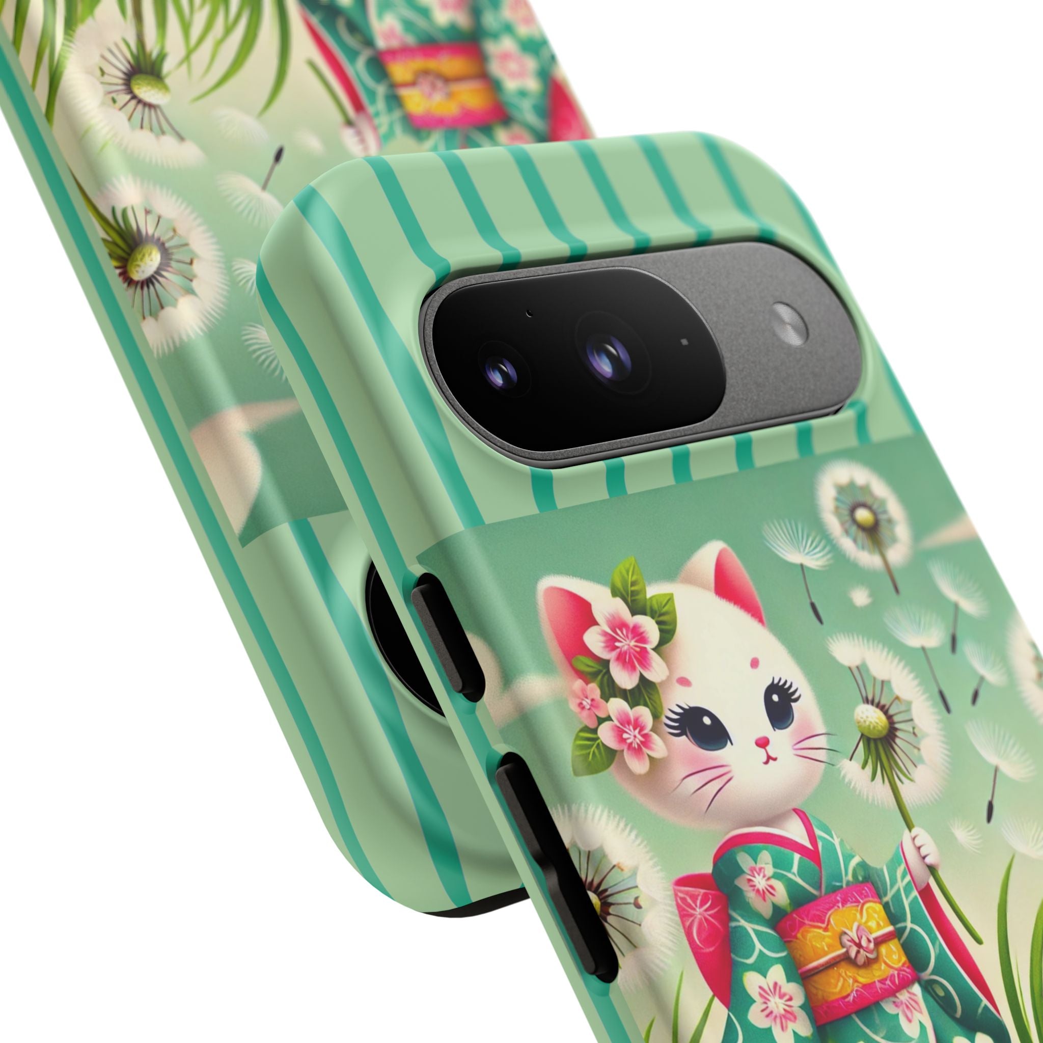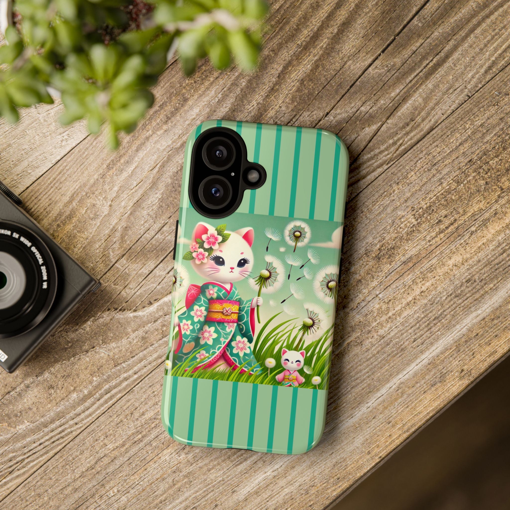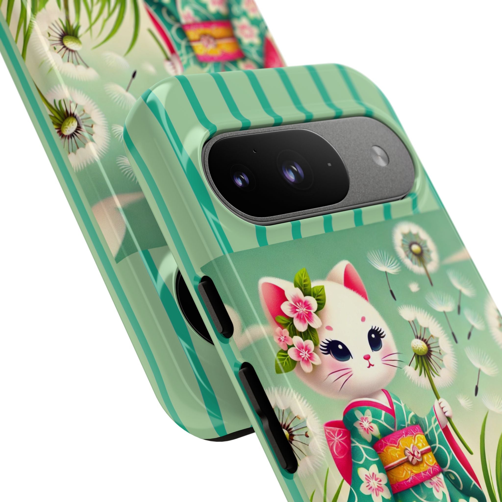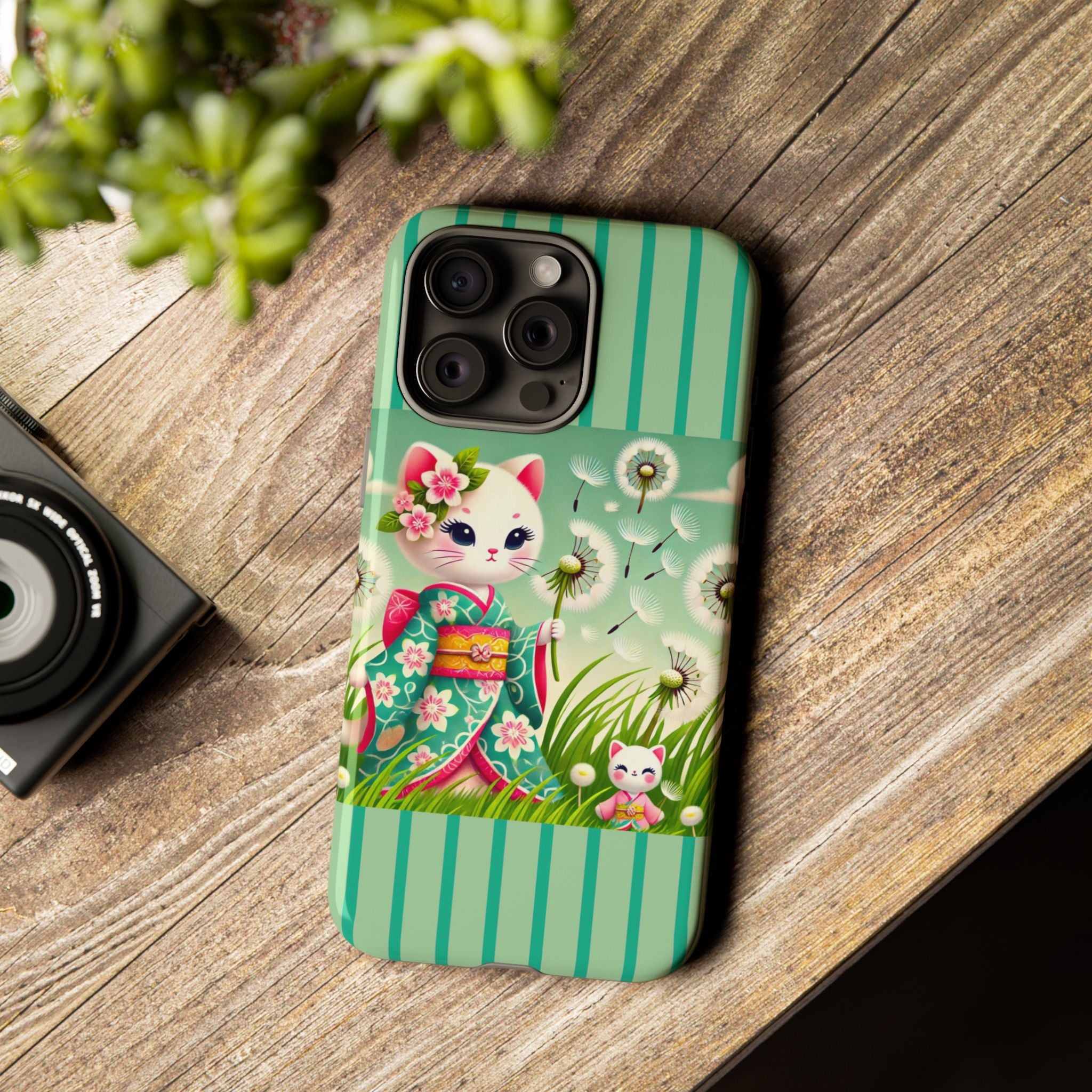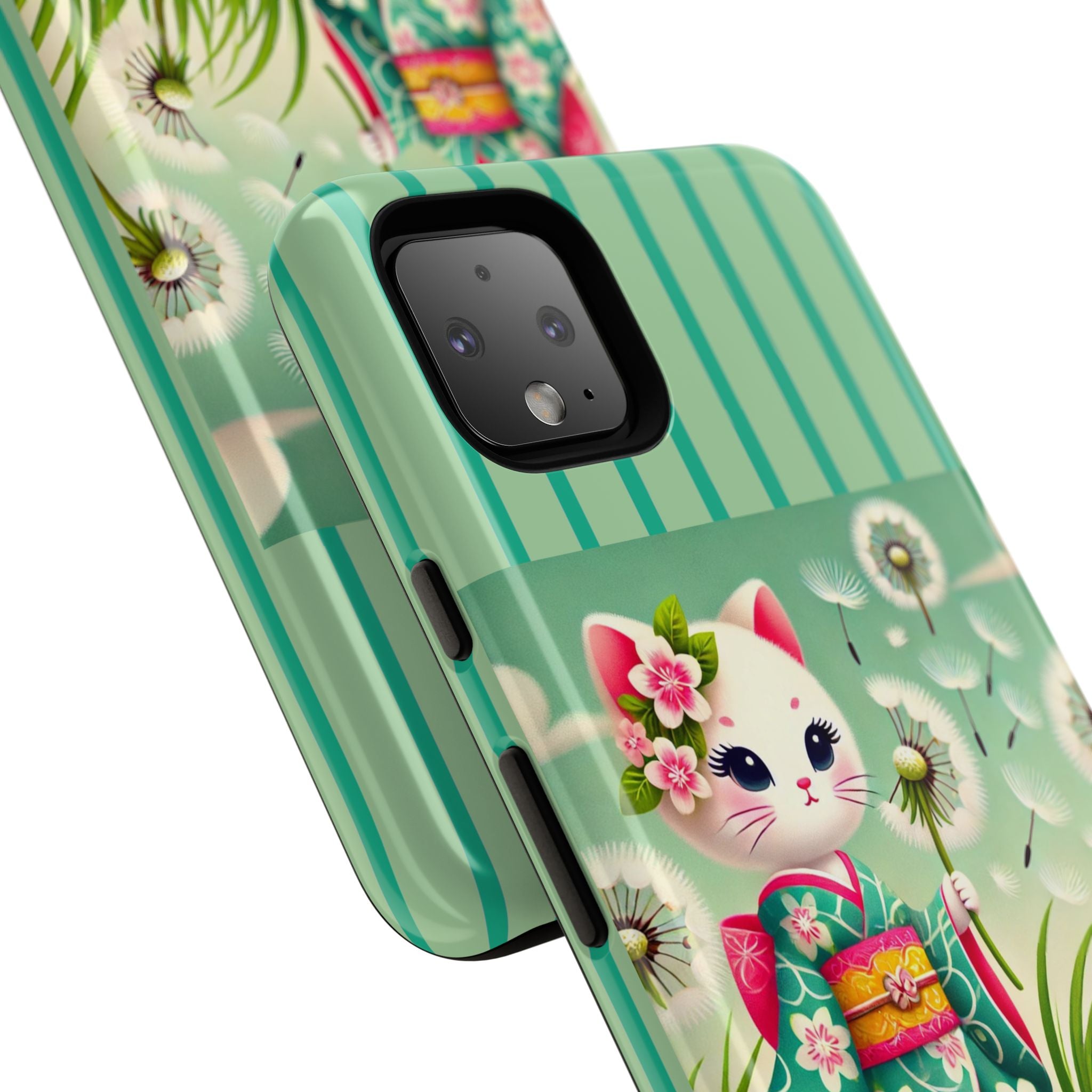 Add a touch of calm charm to your day with our Geisha Kitten and the Dandelion Phone Cases. Designed for iPhone, Samsung Galaxy, and Google Pixel devices, these premium-quality cases combine everyday protection with the gentle beauty of whimsical art. The design features a serene illustration of a geisha kitten and her tiny kitten doll, both dressed in matching kimonos, surrounded by tall swaying grass and drifting dandelion seeds. The soft colors and delicate details create a dreamy, tranquil mood that transforms your phone into a peaceful work of art.