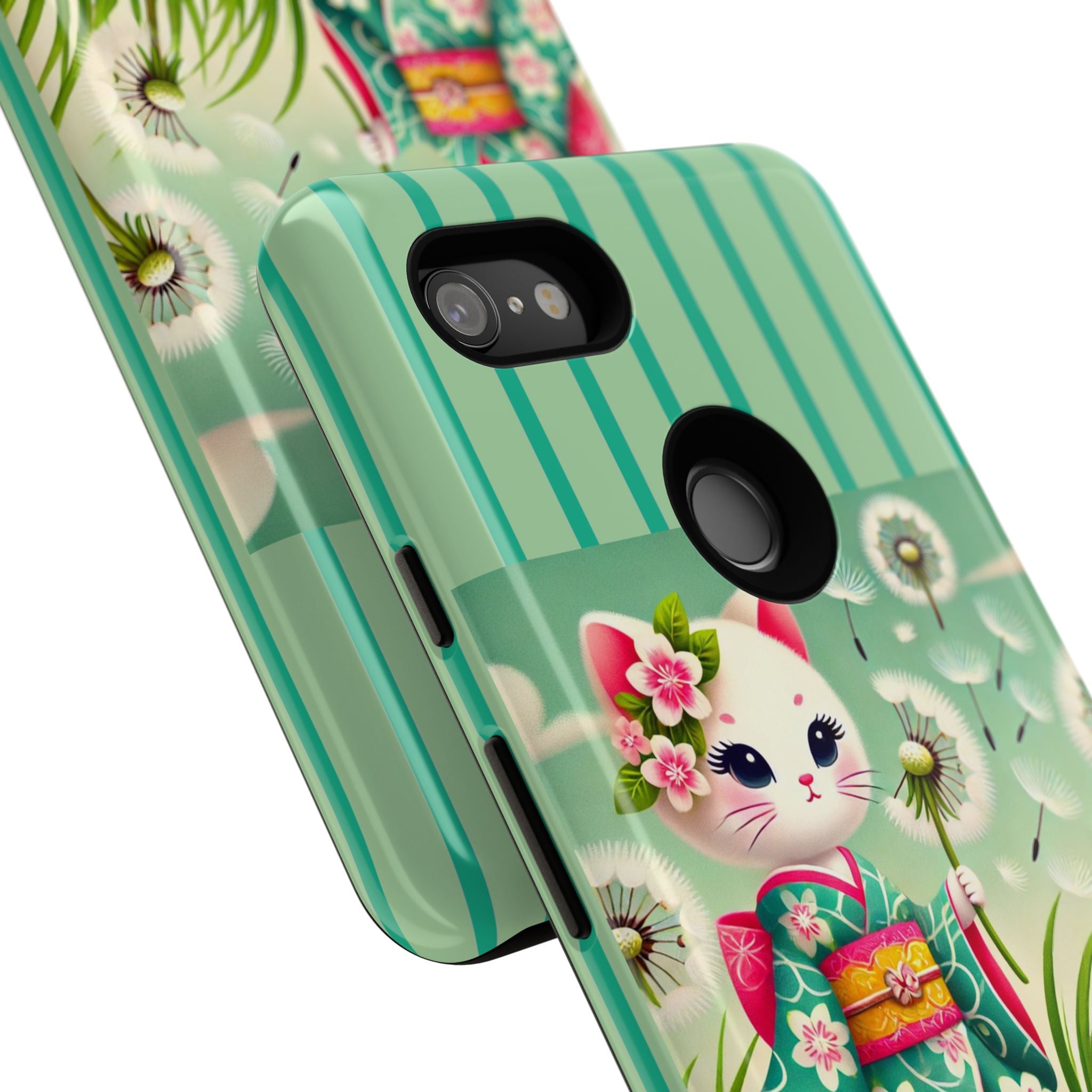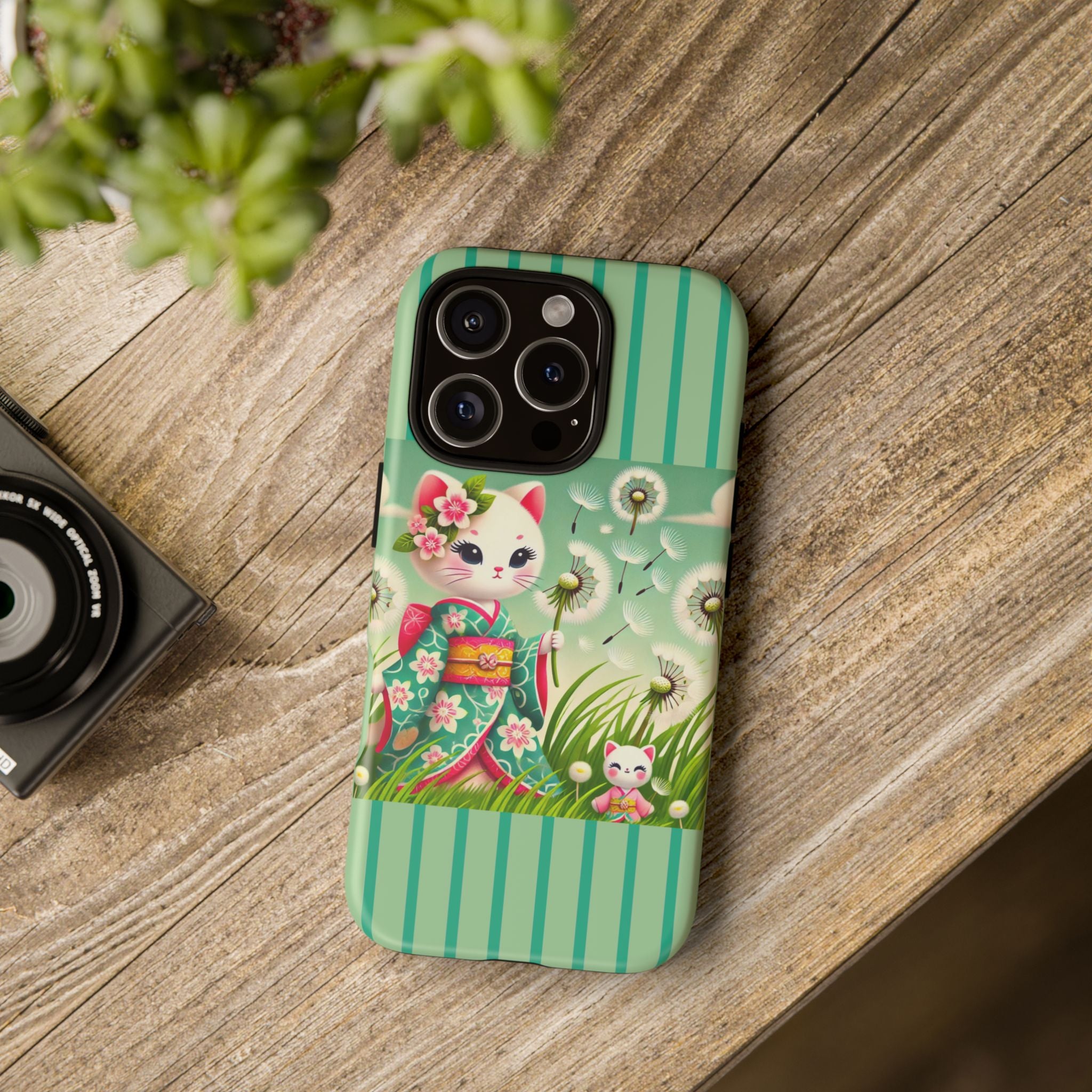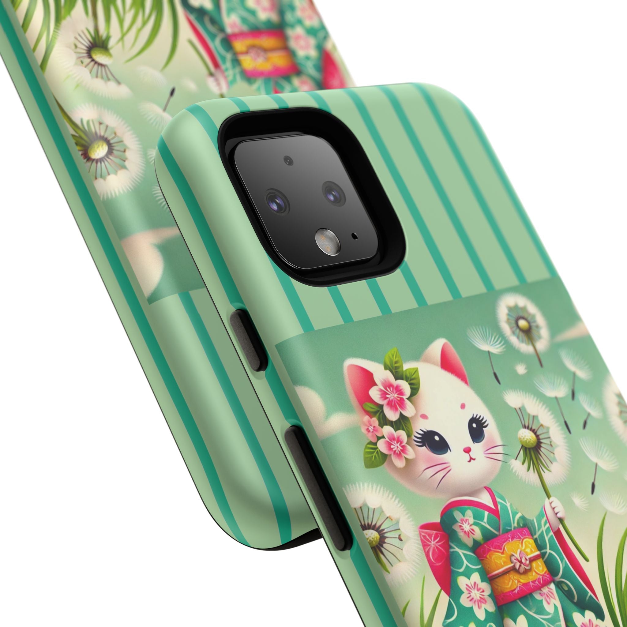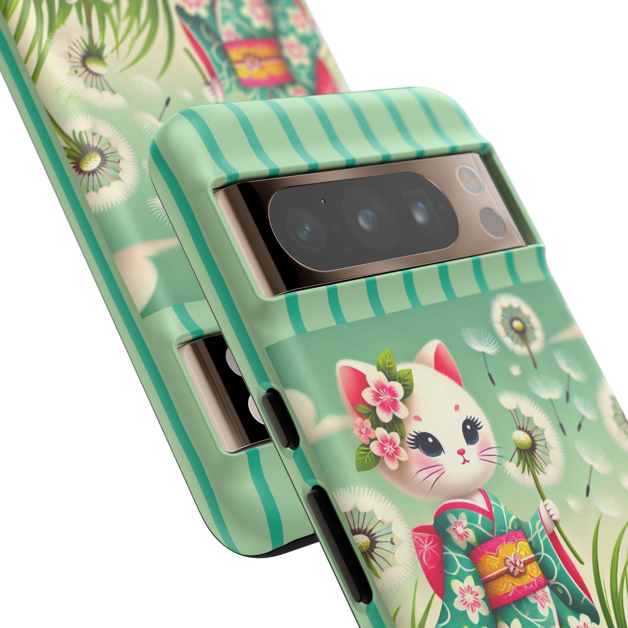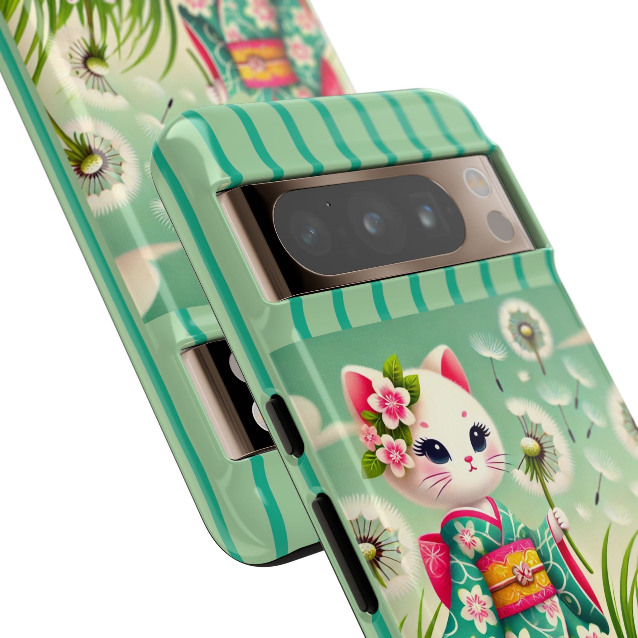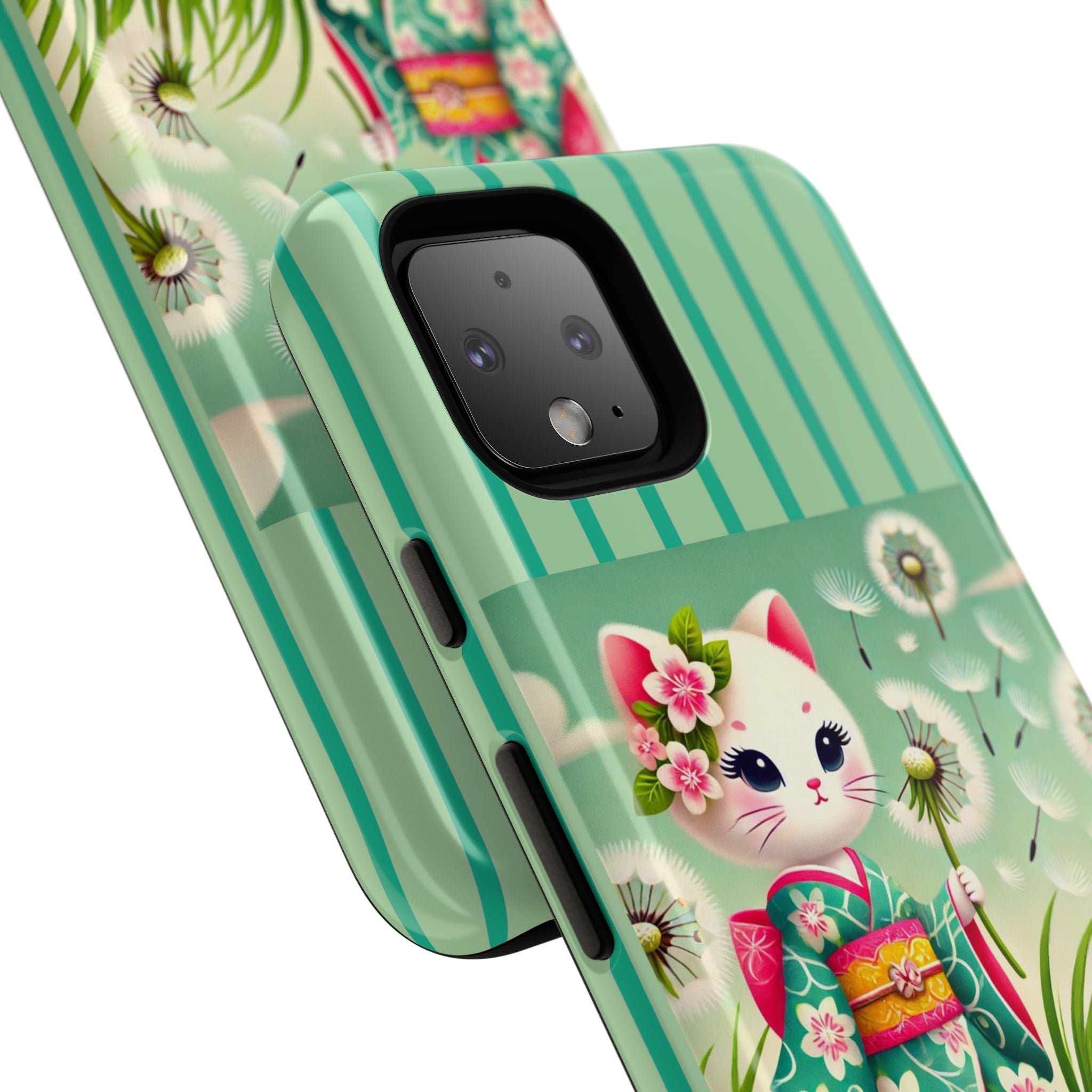 Add a touch of calm charm to your day with our Geisha Kitten and the Dandelion Phone Cases. Designed for iPhone, Samsung Galaxy, and Google Pixel devices, these premium-quality cases combine everyday protection with the gentle beauty of whimsical art. The design features a serene illustration of a geisha kitten and her tiny kitten doll, both dressed in matching kimonos, surrounded by tall swaying grass and drifting dandelion seeds. The soft colors and delicate details create a dreamy, tranquil mood that transforms your phone into a peaceful work of art.
