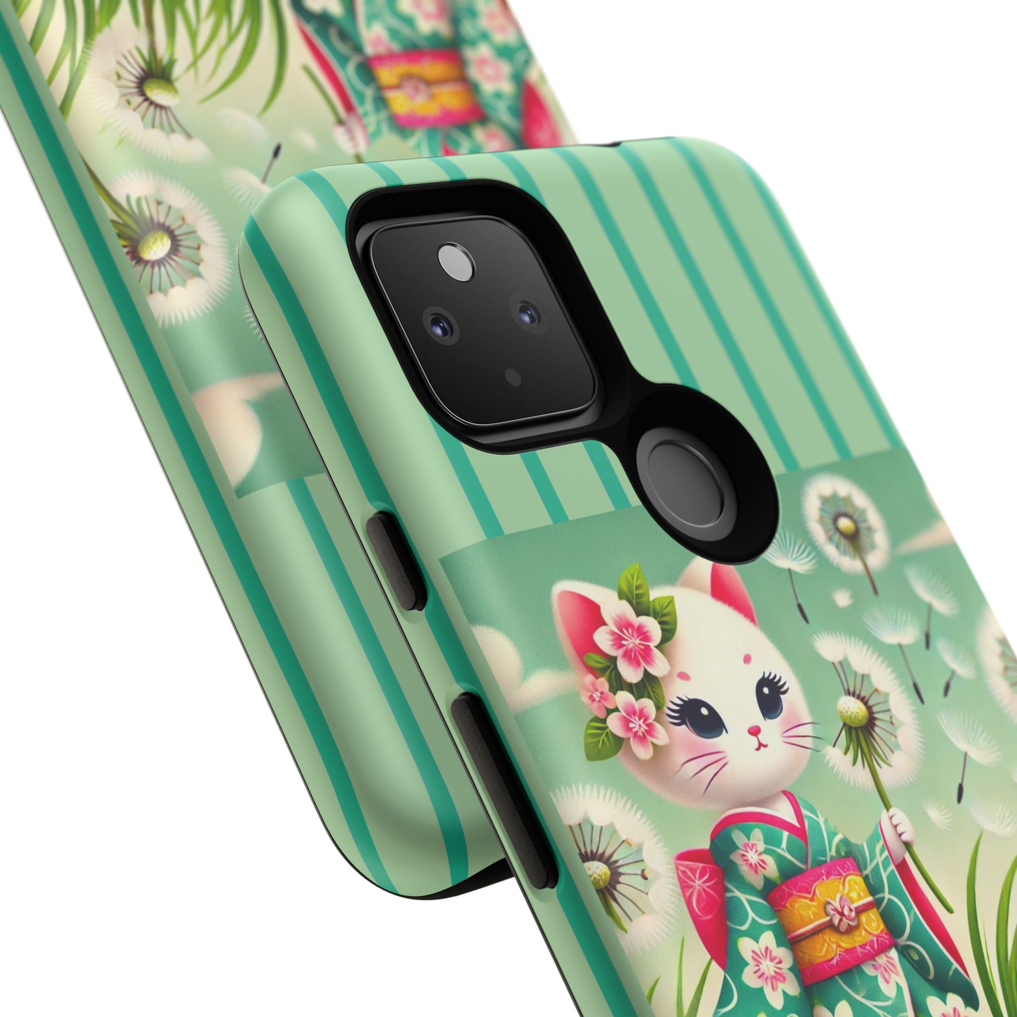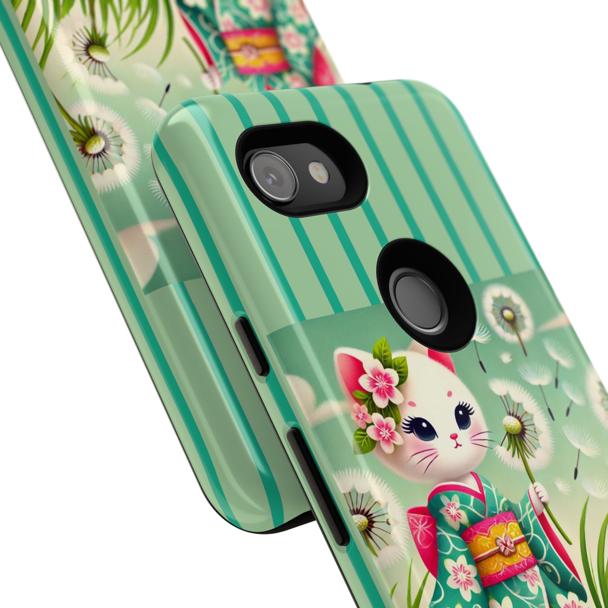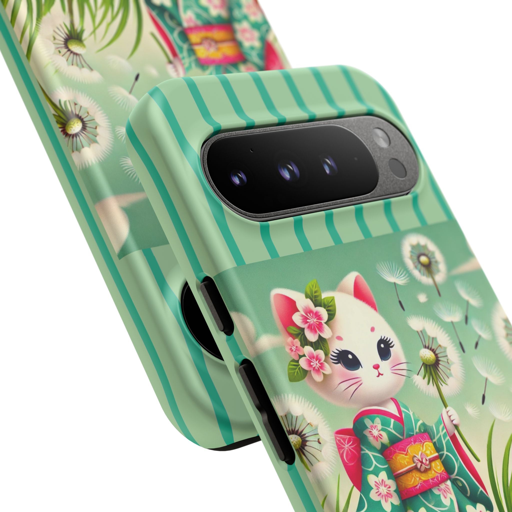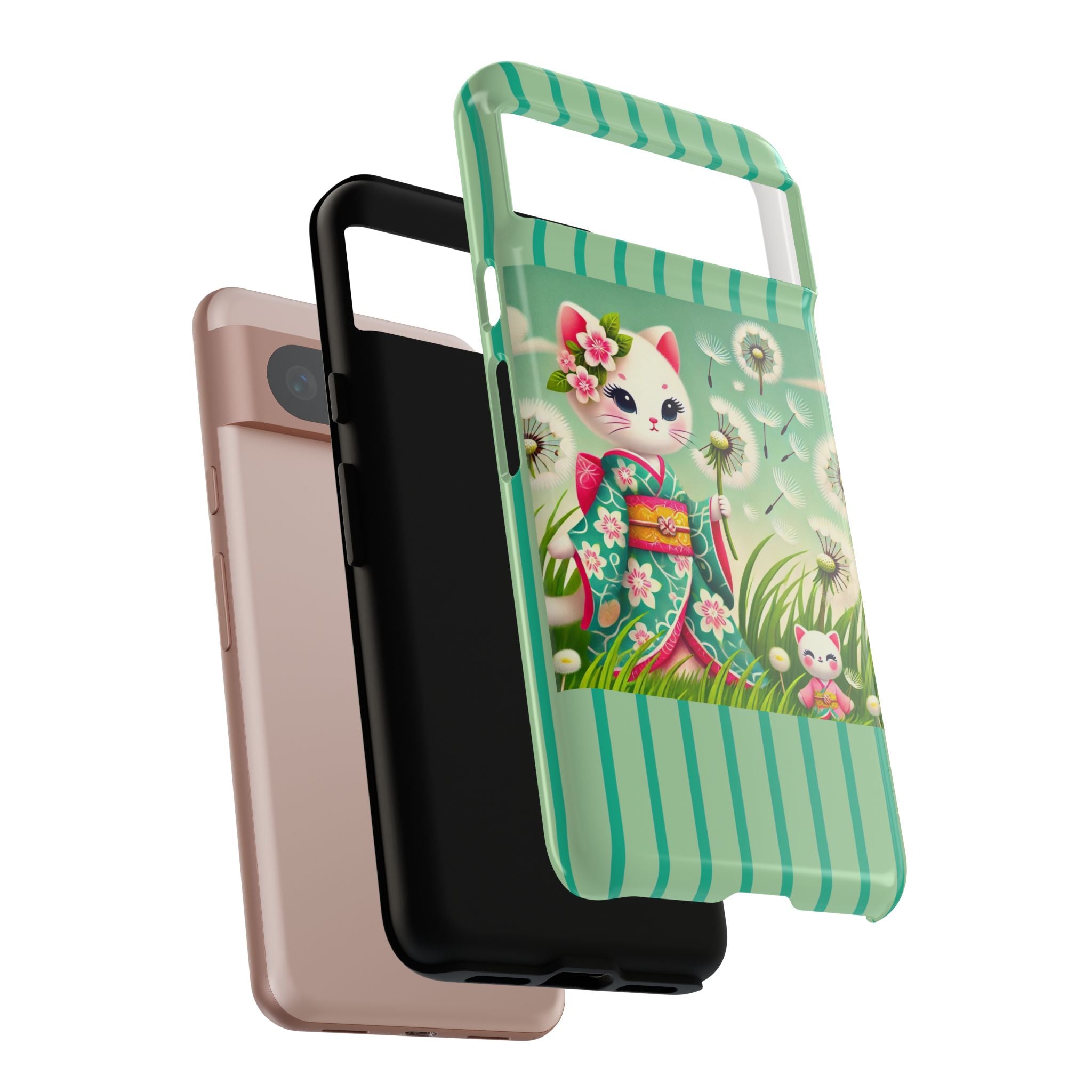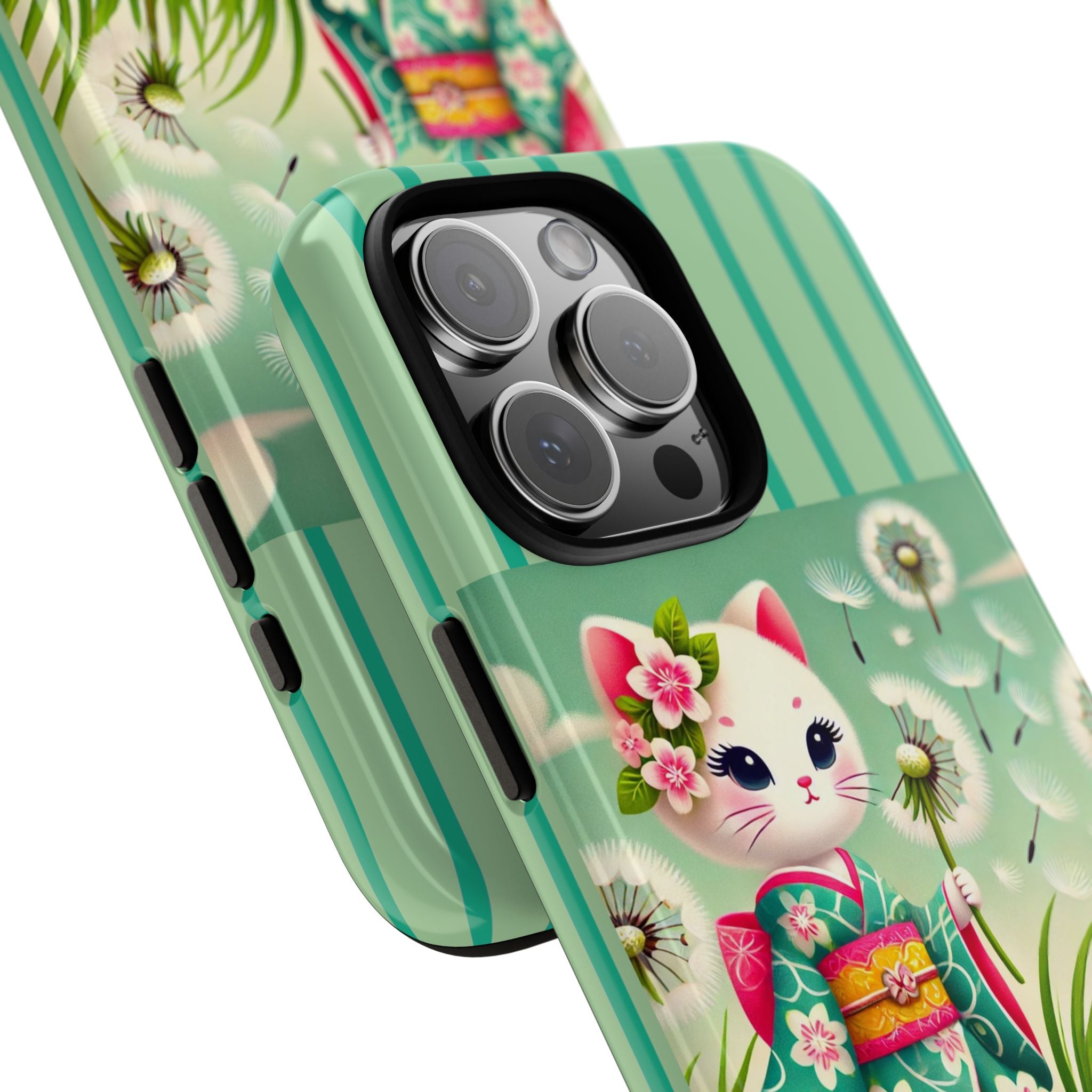 Add a touch of calm charm to your day with our Geisha Kitten and the Dandelion Phone Cases. Designed for iPhone, Samsung Galaxy, and Google Pixel devices, these premium-quality cases combine everyday protection with the gentle beauty of whimsical art. The design features a serene illustration of a geisha kitten and her tiny kitten doll, both dressed in matching kimonos, surrounded by tall swaying grass and drifting dandelion seeds. The soft colors and delicate details create a dreamy, tranquil mood that transforms your phone into a peaceful work of art.