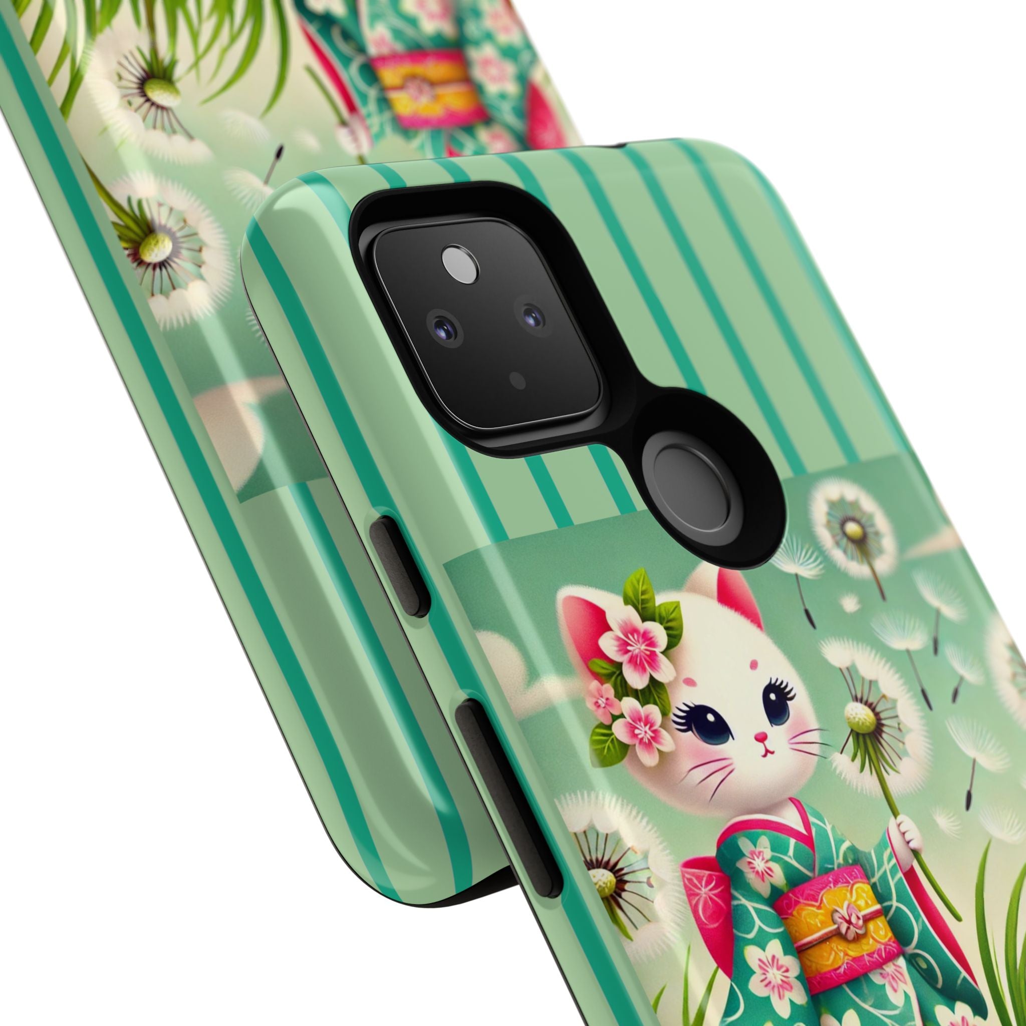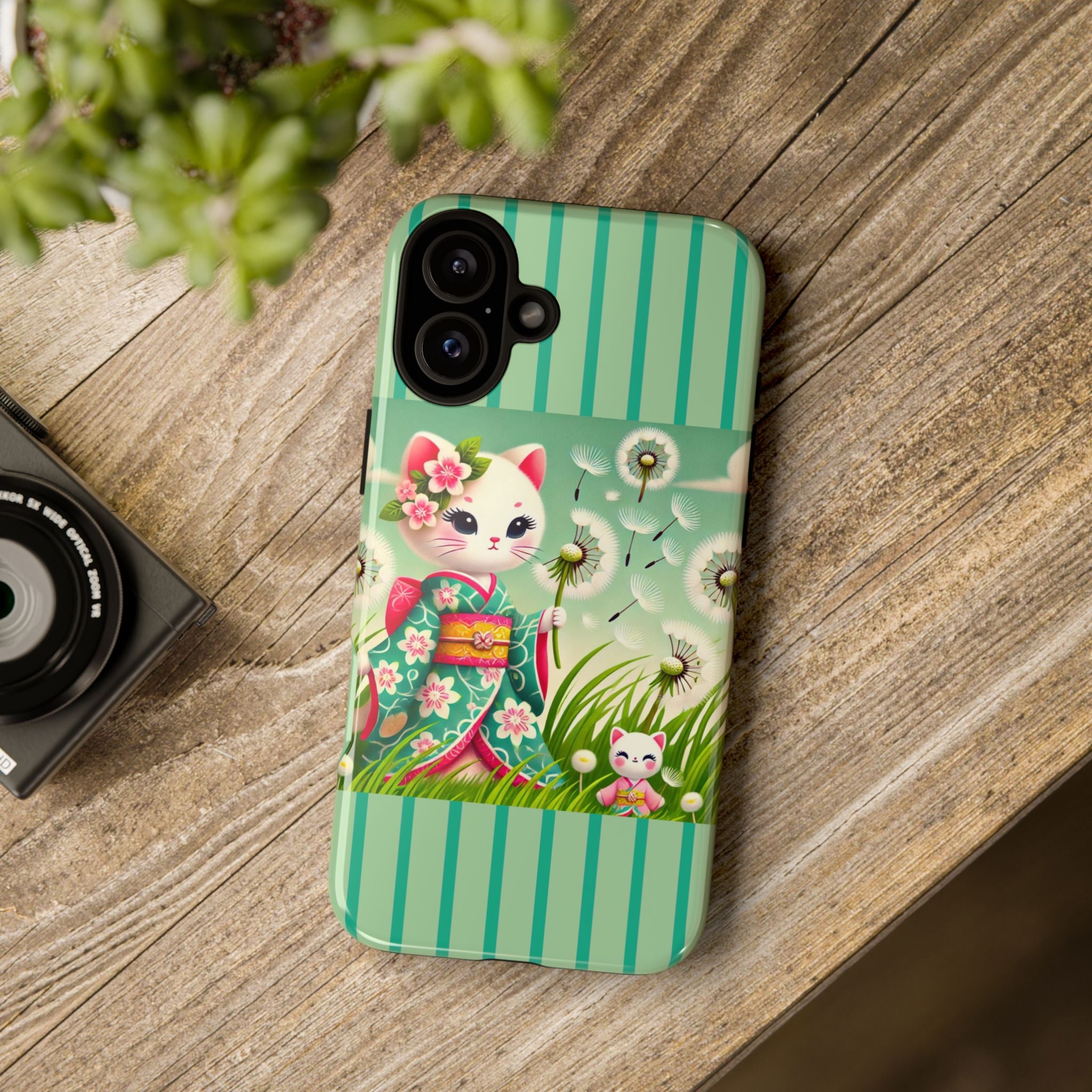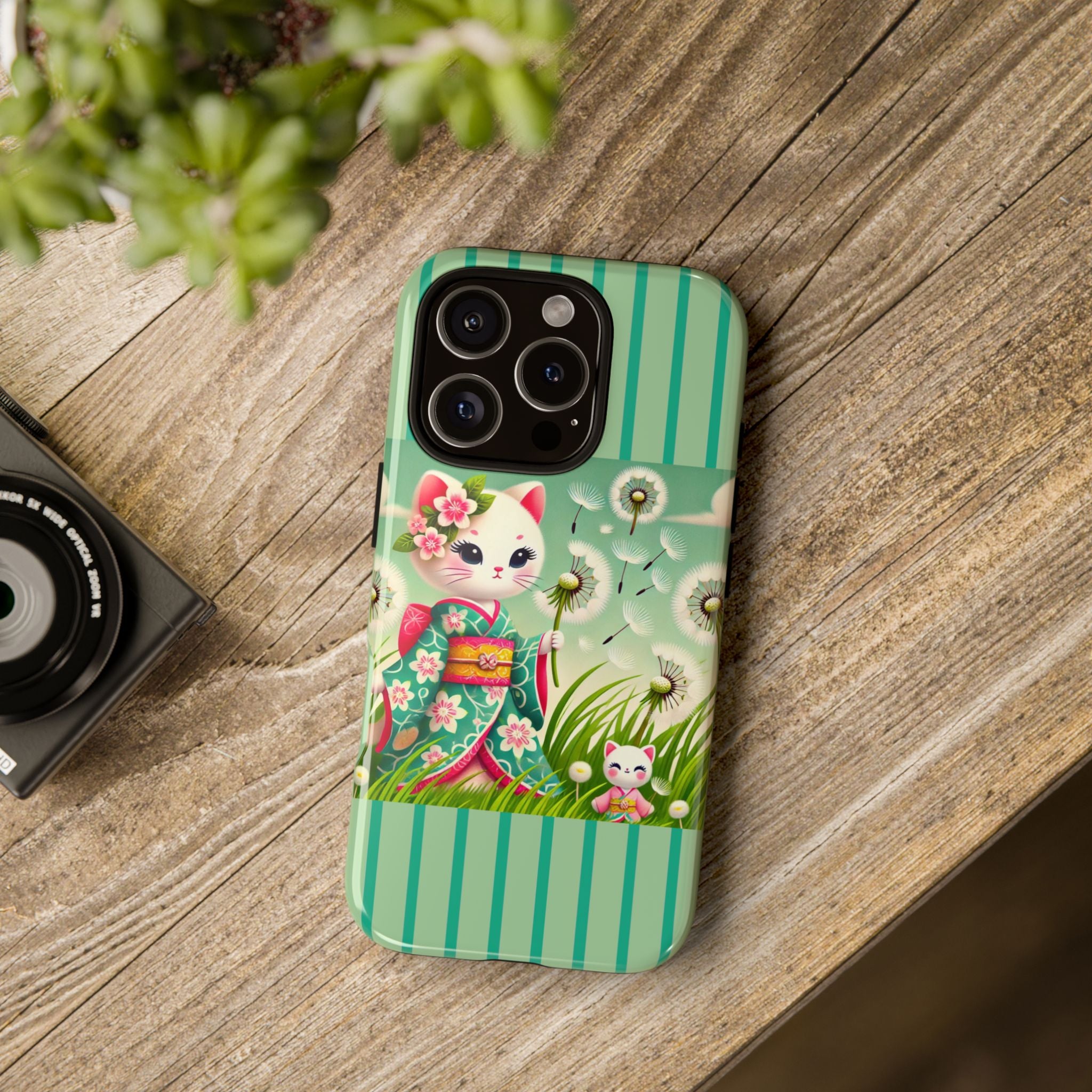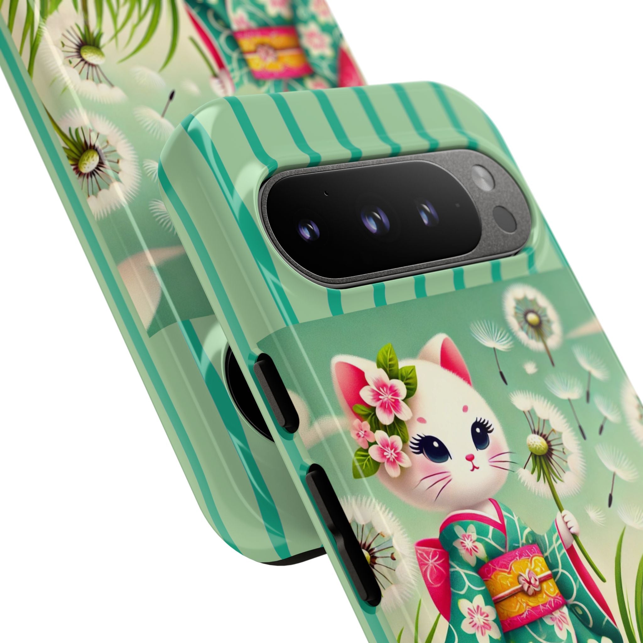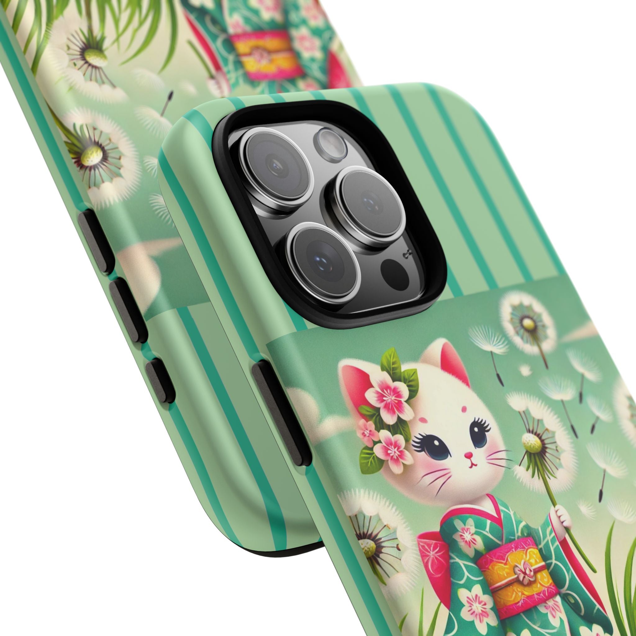 Add a touch of calm charm to your day with our Geisha Kitten and the Dandelion Phone Cases. Designed for iPhone, Samsung Galaxy, and Google Pixel devices, these premium-quality cases combine everyday protection with the gentle beauty of whimsical art. The design features a serene illustration of a geisha kitten and her tiny kitten doll, both dressed in matching kimonos, surrounded by tall swaying grass and drifting dandelion seeds. The soft colors and delicate details create a dreamy, tranquil mood that transforms your phone into a peaceful work of art.