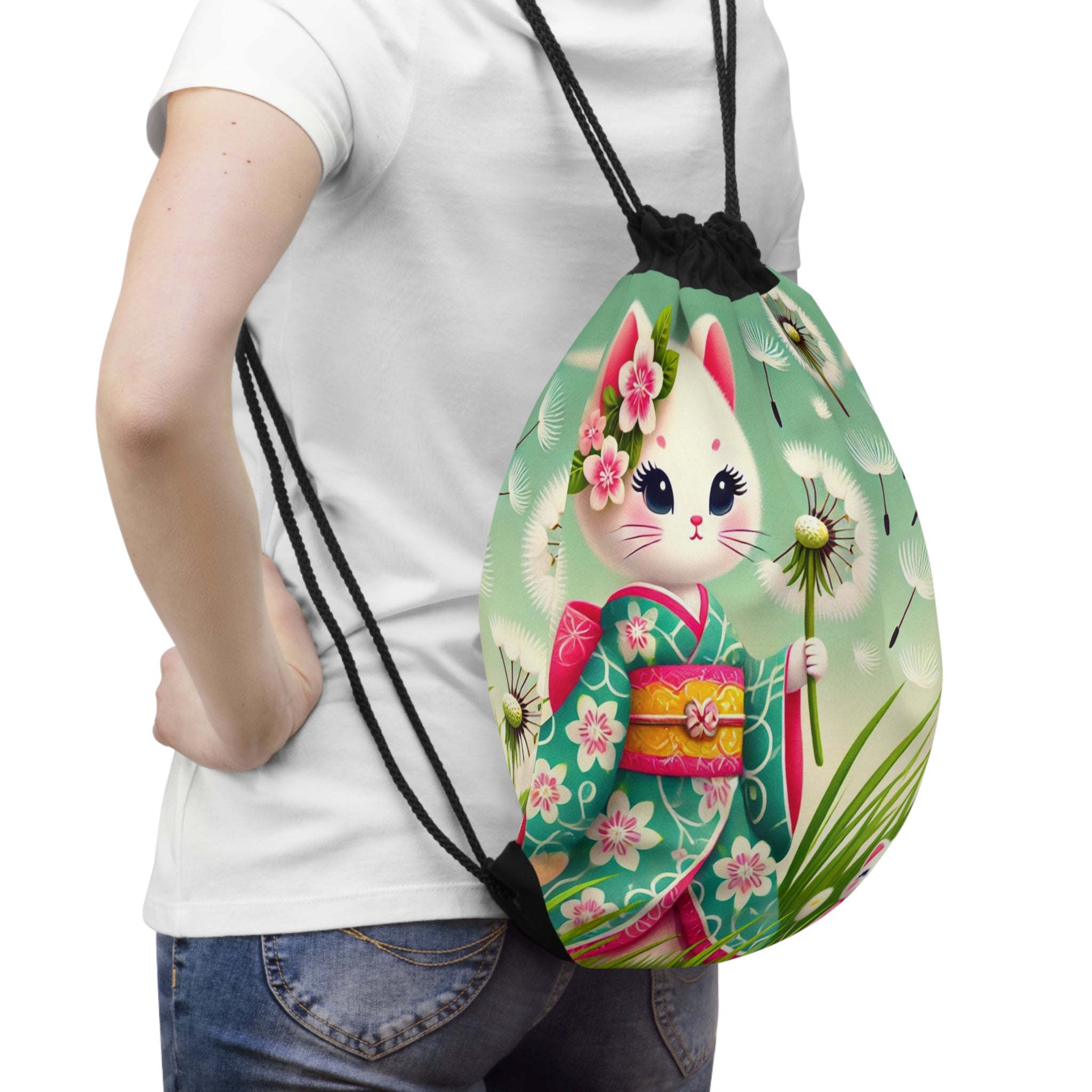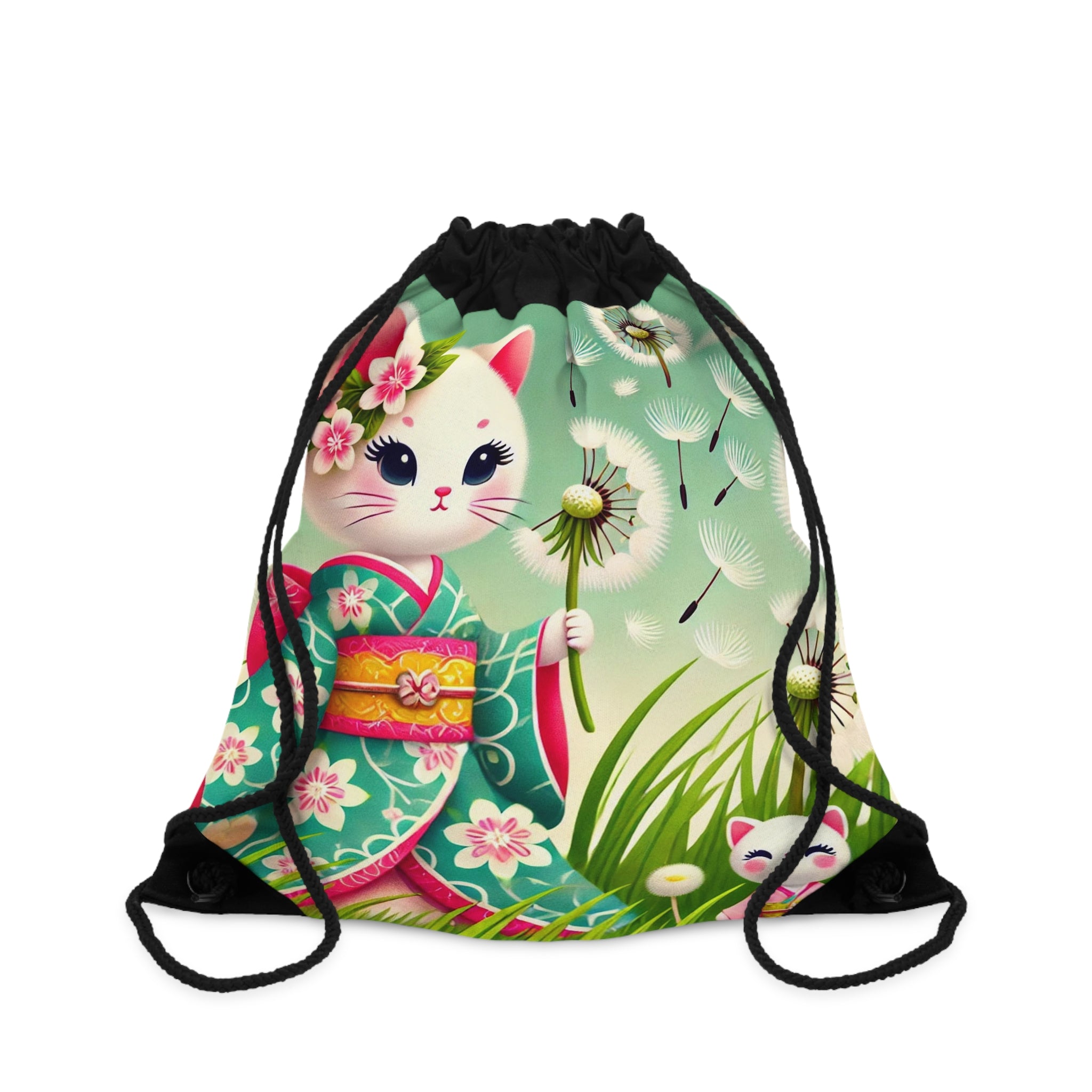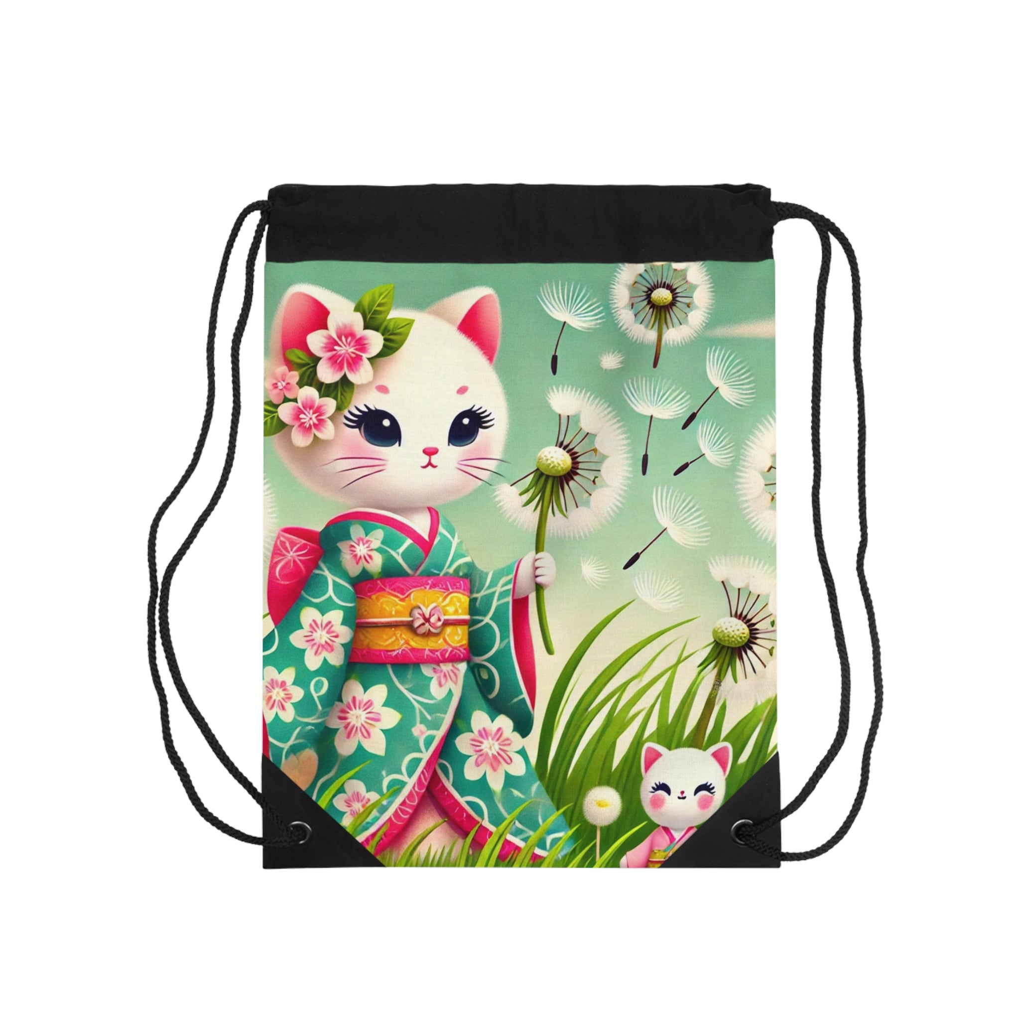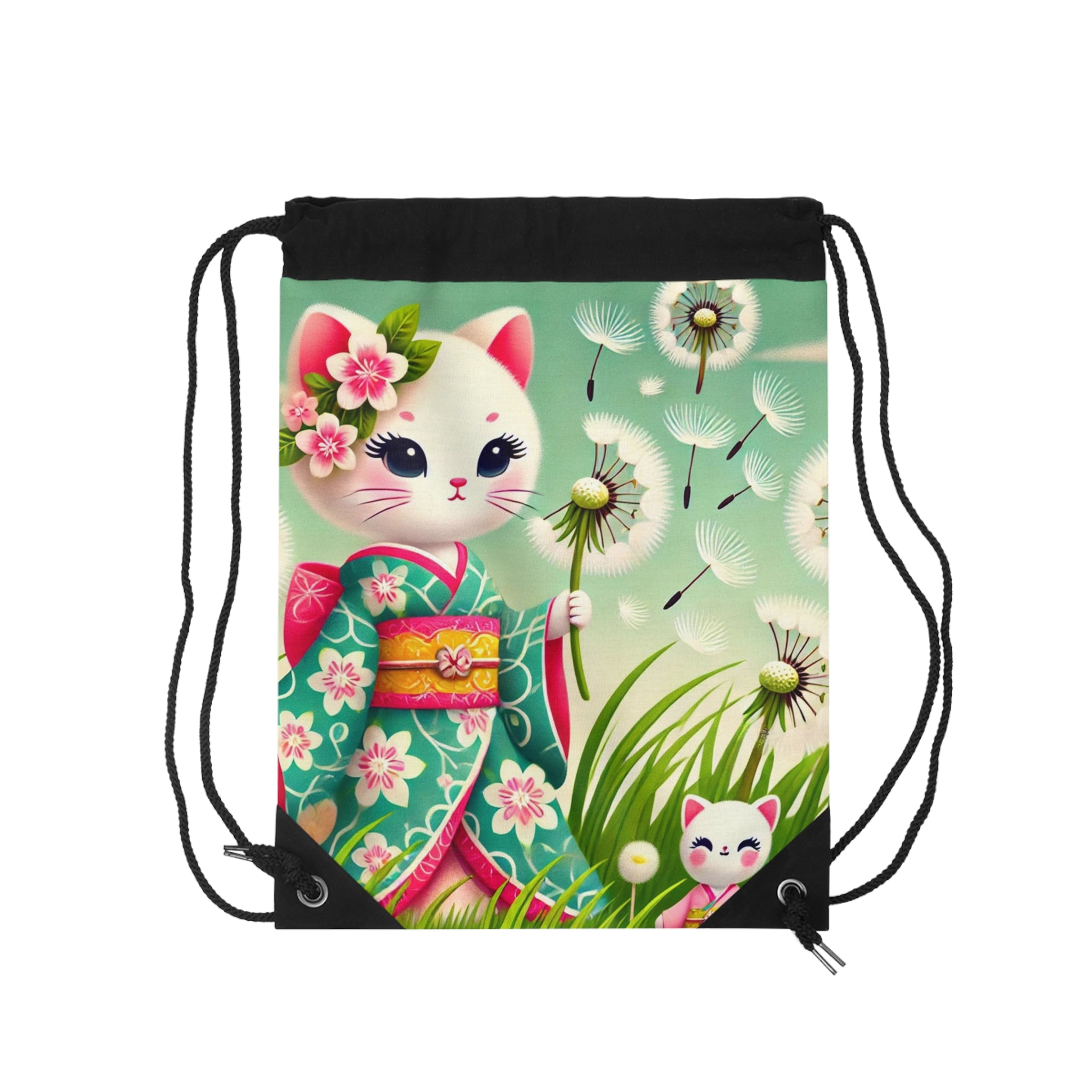 Geisha Kitten and the Dandelion Wish Drawstring Bag captures a moment of serene beauty and imagination in a lightweight, durable design. Perfect for trips to the gym, store, or beach, this versatile drawstring bag combines practicality with artful storytelling. The enchanting design features a graceful geisha kitten dressed in a delicate floral kimono, gently blowing fluffy dandelion seeds into the breeze. Beside her, a small kitten doll in a kimono sits quietly on the ground, adding a touch of tender charm. The scene, framed by tall grass swaying softly in the wind, evokes nostalgia and quiet wonder—transforming a simple accessory into a poetic work of art.