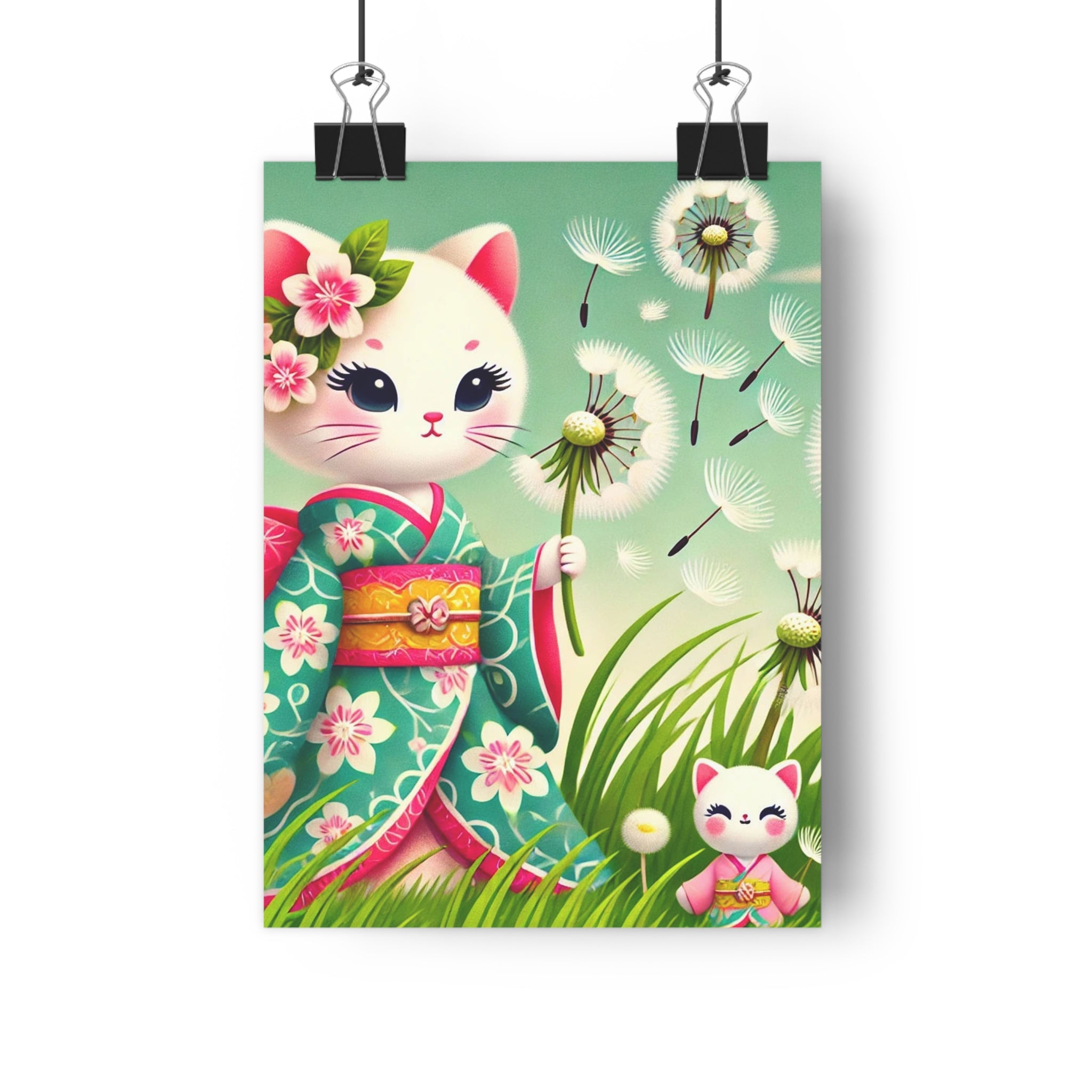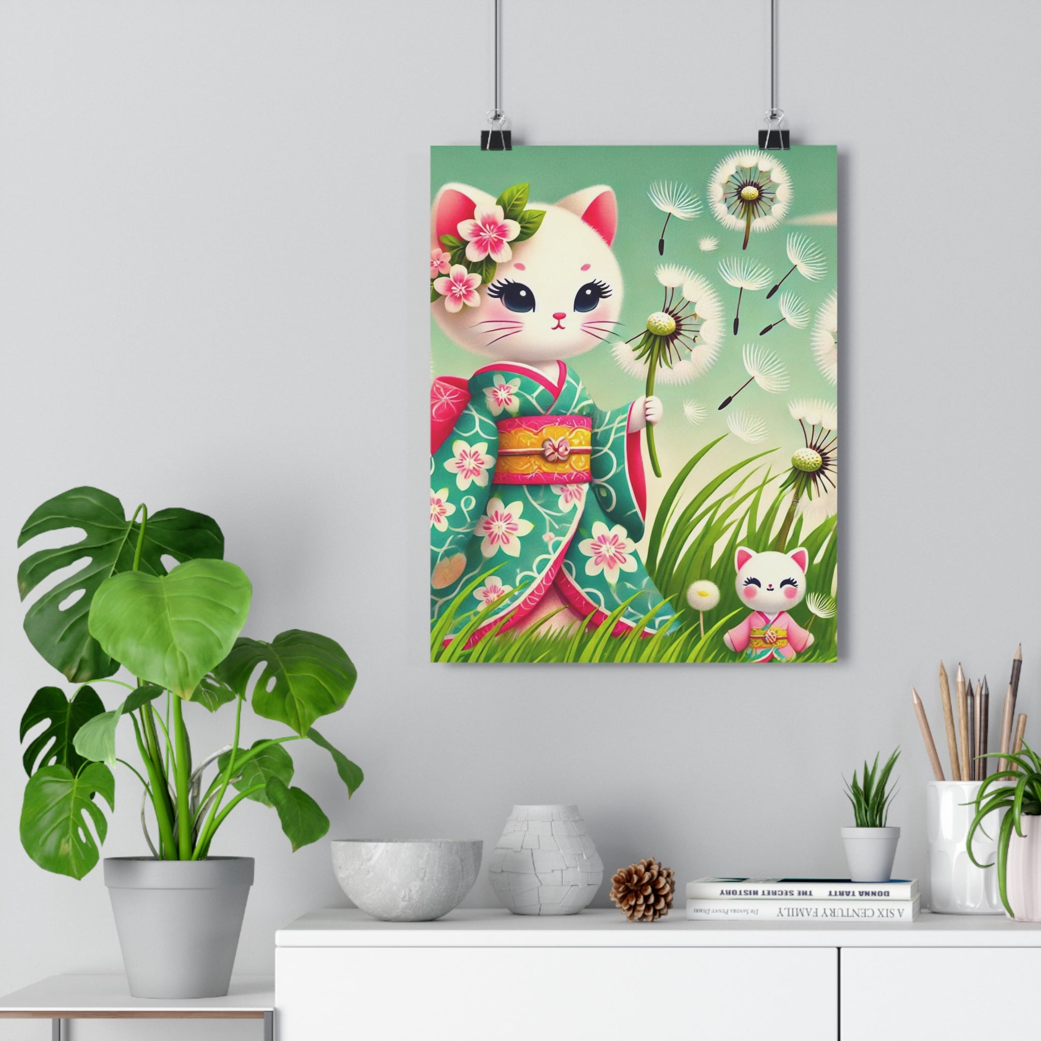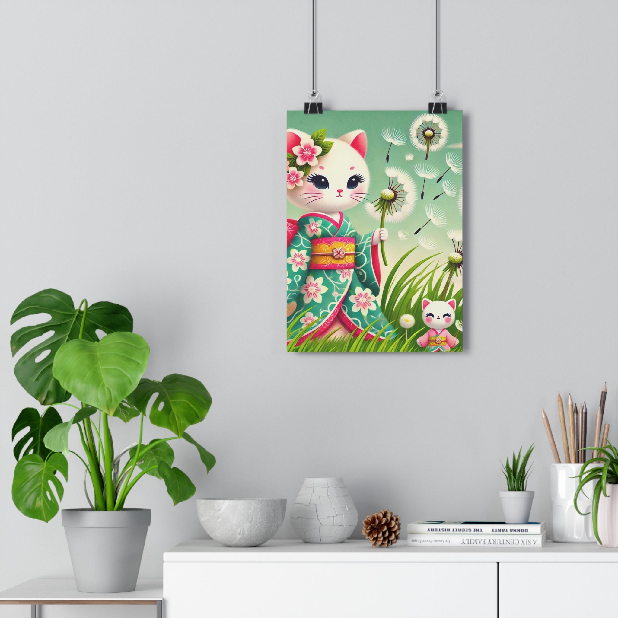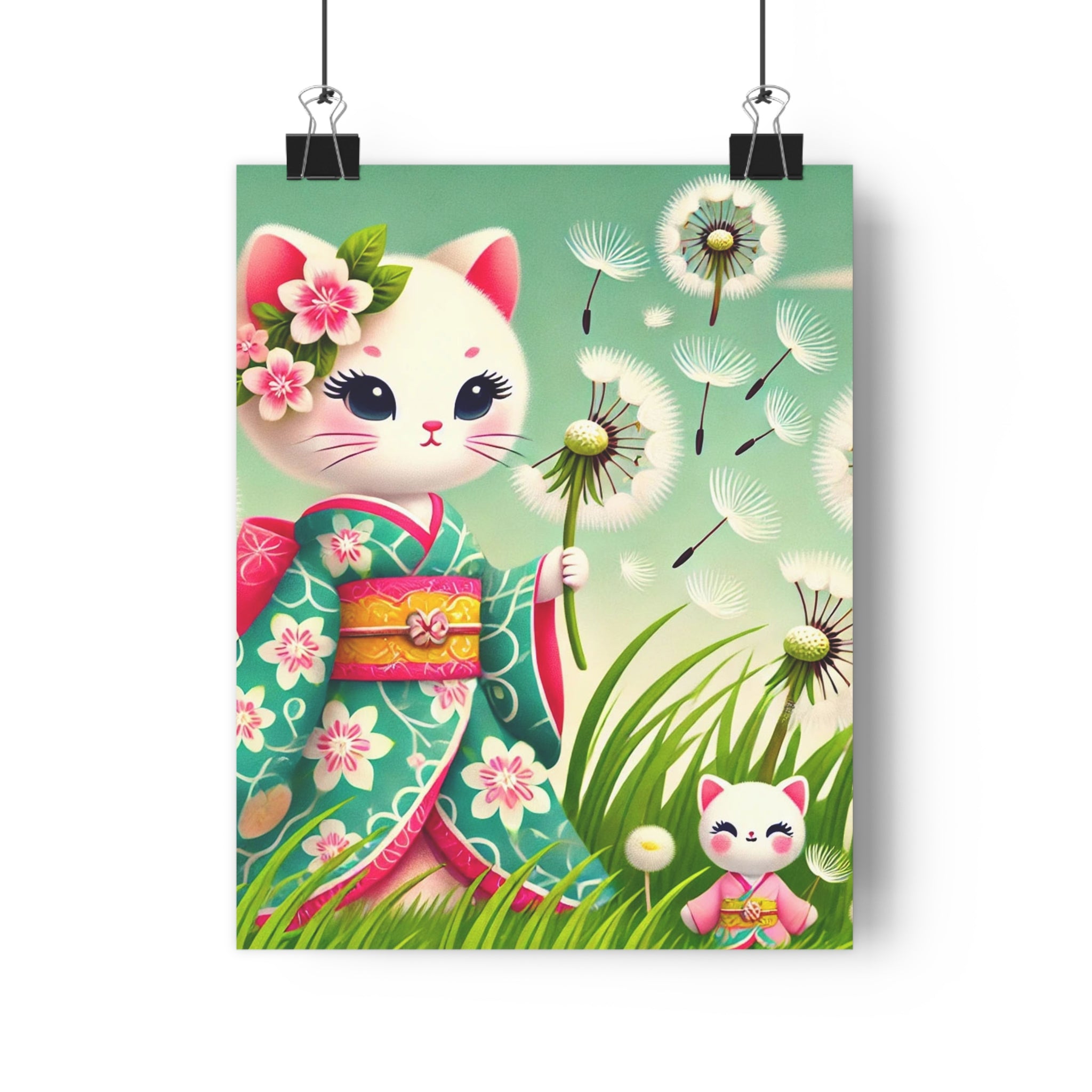 Geisha Kitten and the Dandelion Wish Giclée Art Print brings a touch of innocence, grace, and poetic beauty to your decor. These museum-quality fine art prints are available in two sizes, offering the perfect way to showcase this heartwarming scene. Each premium-quality poster is giclée-printed on thick, archival, acid-free matte paper, ensuring exceptional color richness, texture, and longevity for a timeless finish.