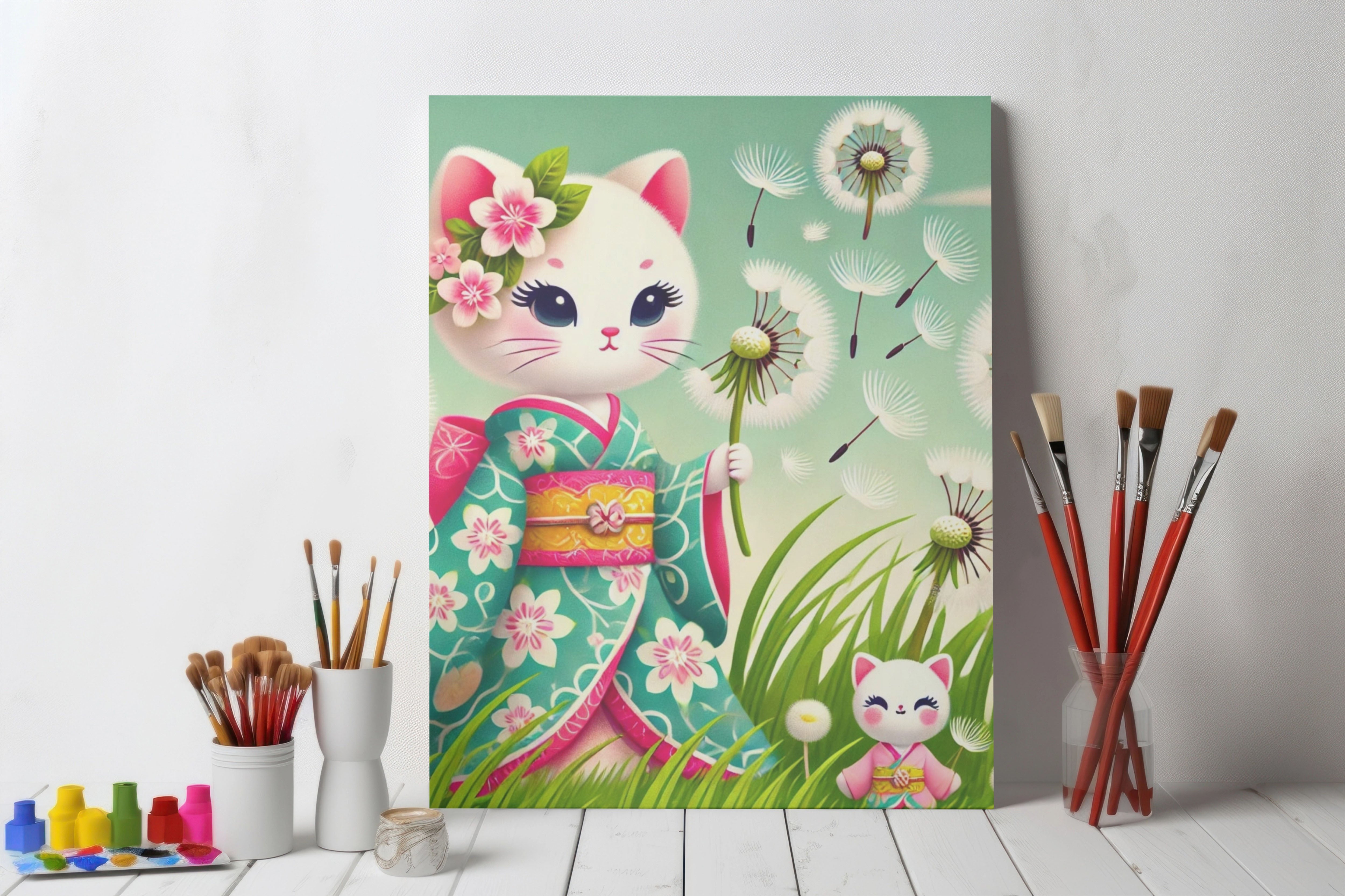 The enchanting artwork, Geisha Kitten and the Dandelion Wish, portrays a graceful geisha kitten dressed in a delicate floral kimono, gently blowing fluffy dandelion seeds into the breeze. At her feet sits a small kitten doll in a matching kimono, adding a tender and nostalgic touch. Surrounded by tall grass swaying softly in the wind, the scene evokes a sense of peaceful wonder and fleeting magic. It’s a beautifully balanced blend of Japanese elegance, whimsy, and childlike dreaminess—perfect for adding warmth and charm to any room.