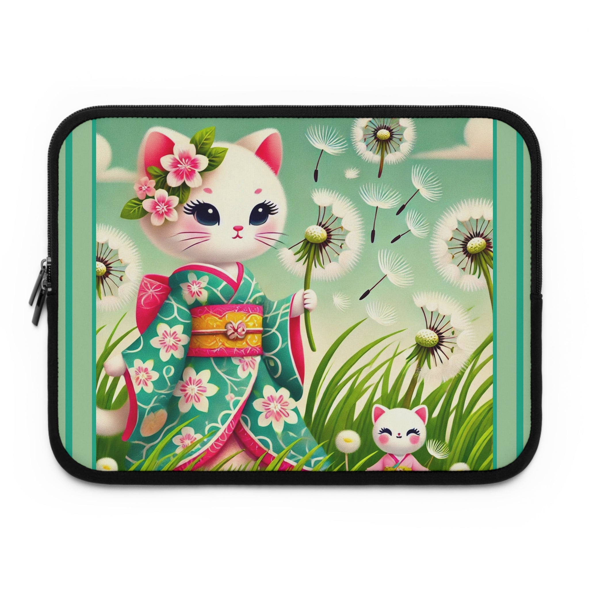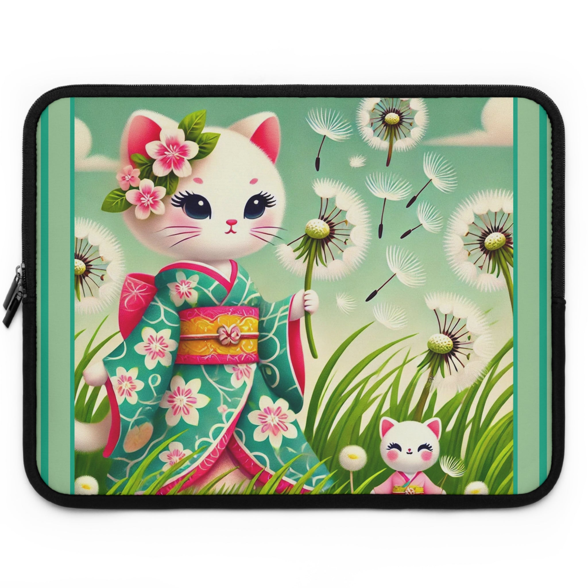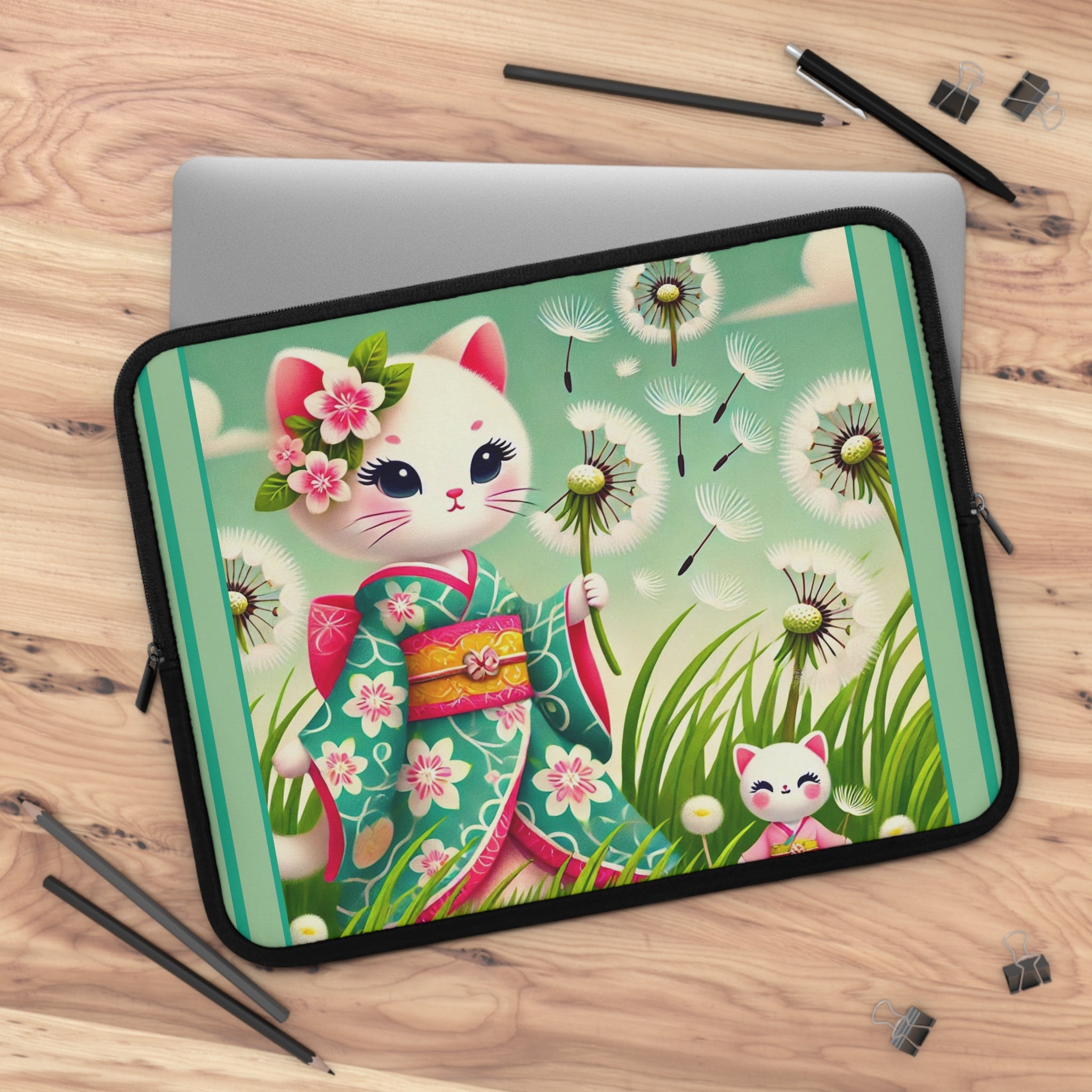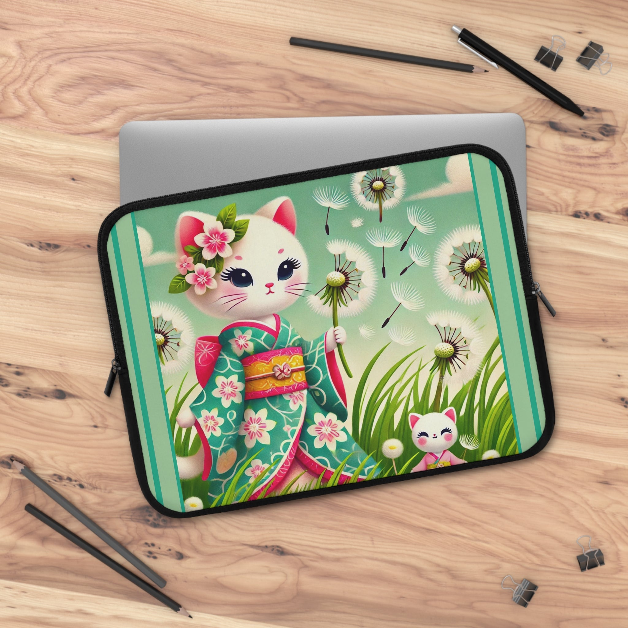 This Laptop Sleeve features a whimsical and serene illustration of a geisha kitten and a kitten doll in matching kimonos, surrounded by swaying tall grass, giving off a dreamy and tranquil vibe. Perfect for cat lovers and those who appreciate Japanese culture, this sleeve is ideal for protecting your laptop in style. Relevant for gifts on birthdays, holidays, and special occasions.