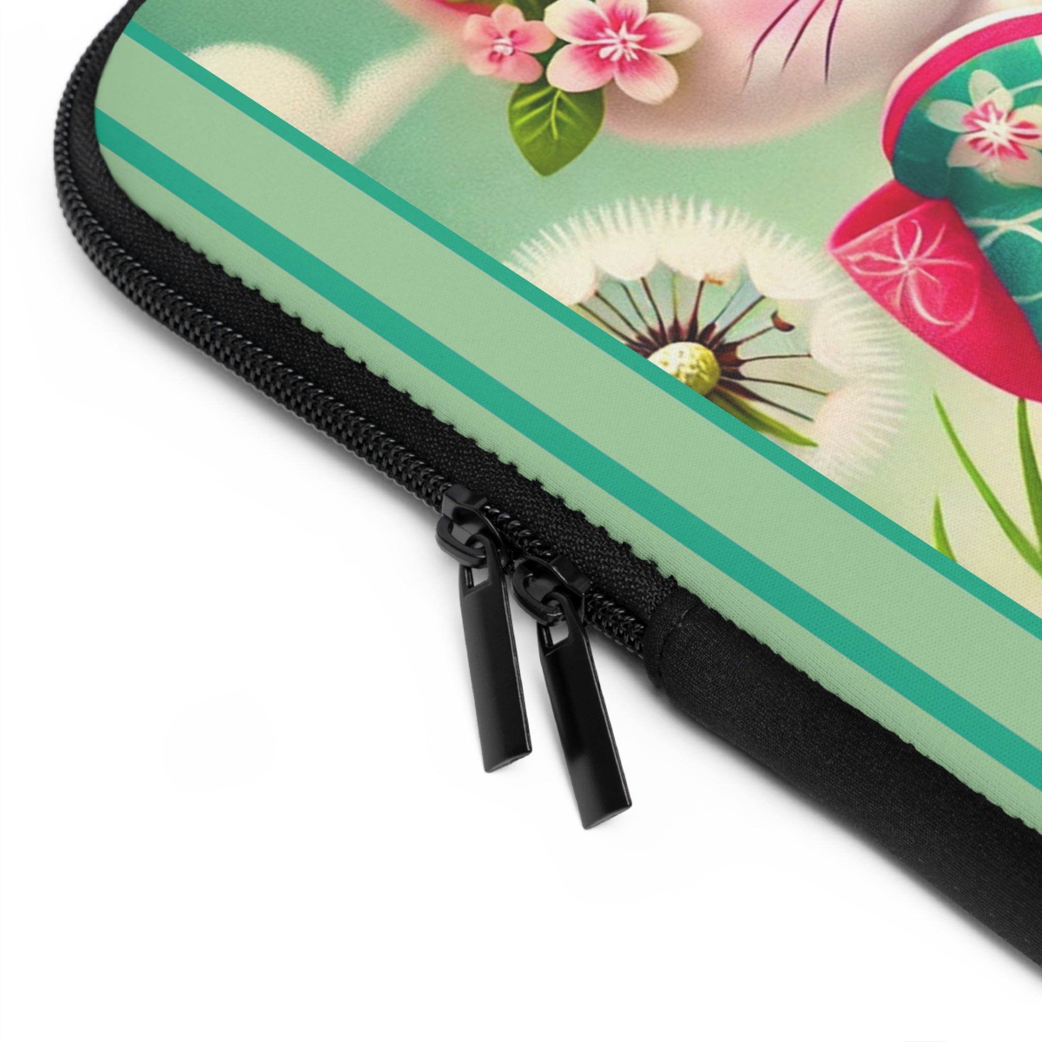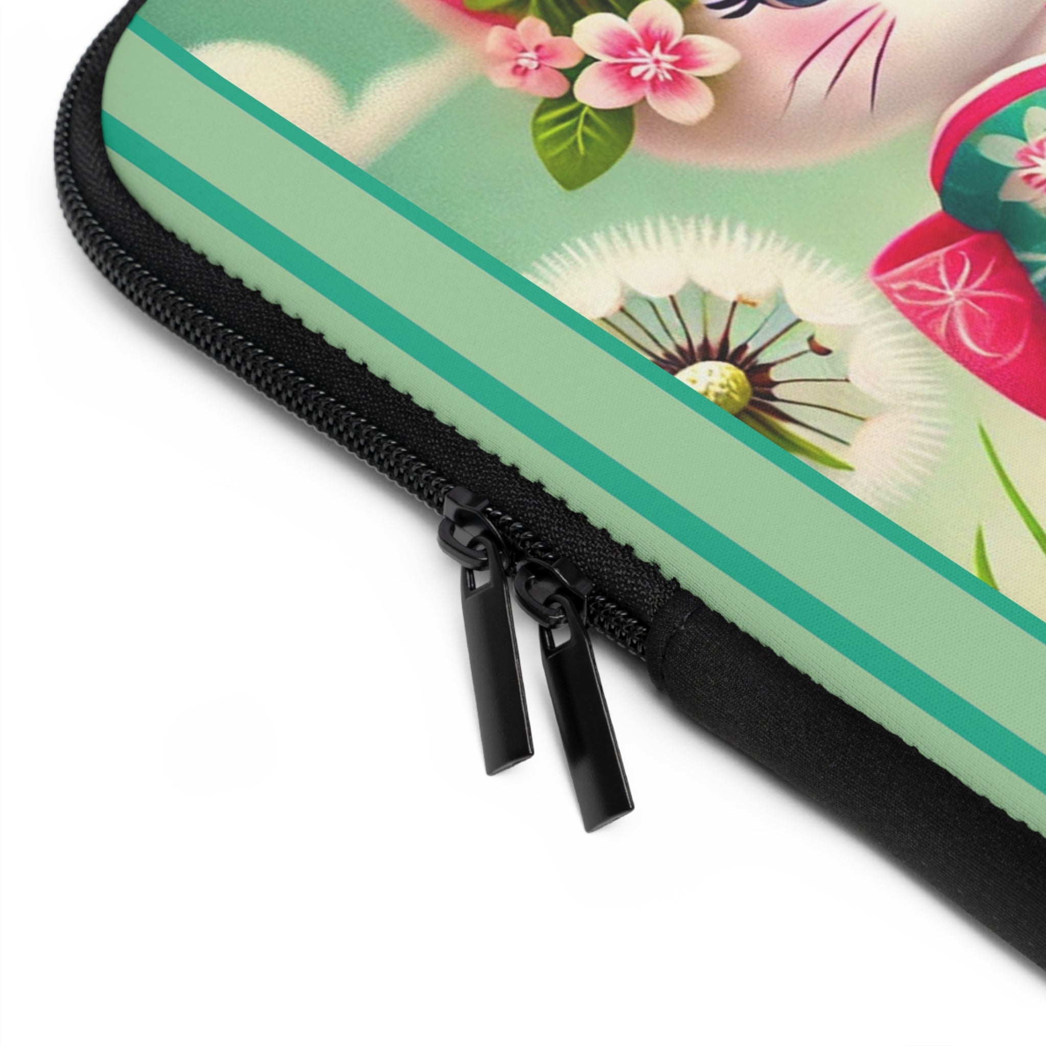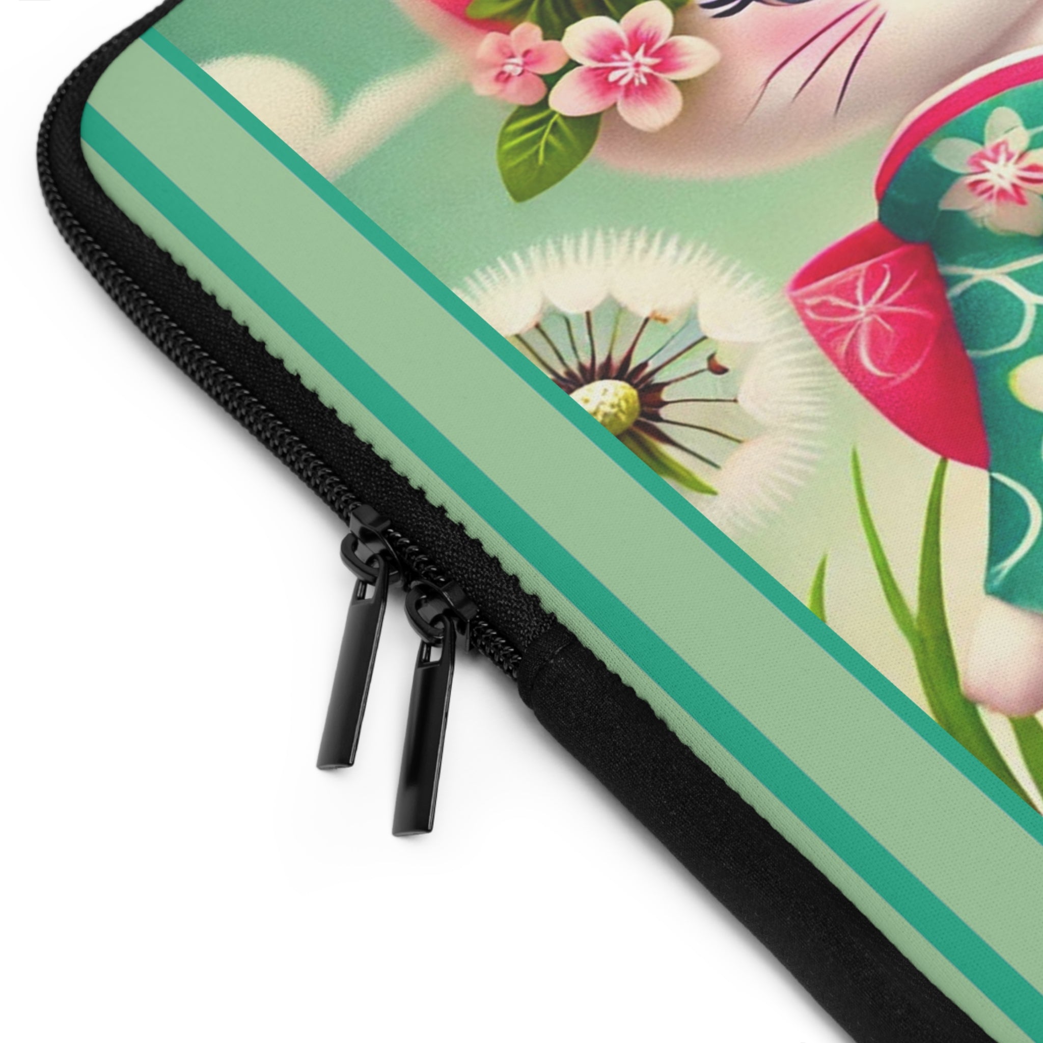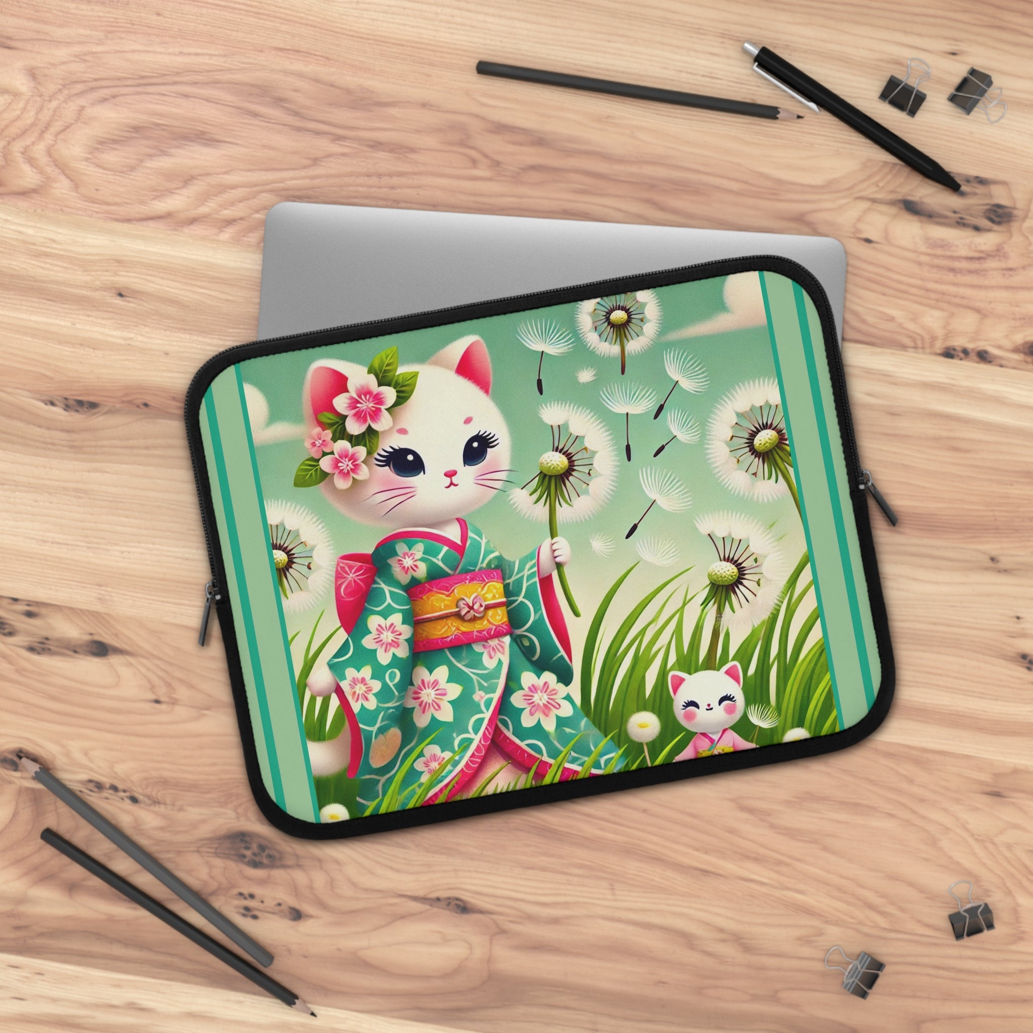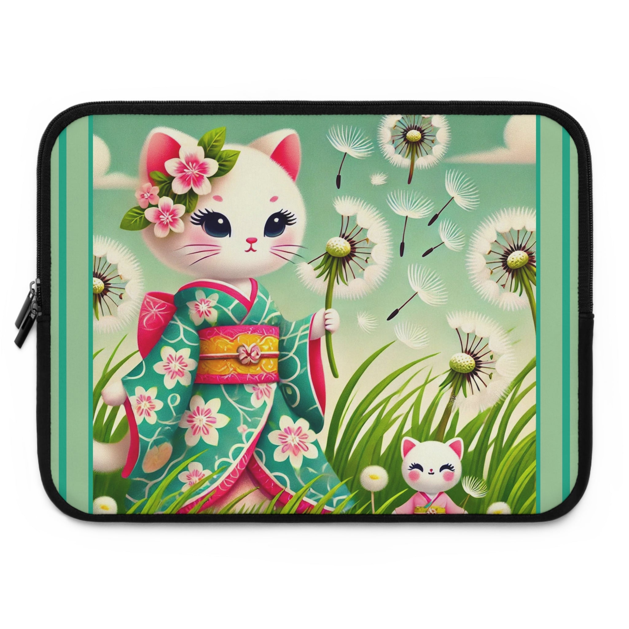 This Laptop Sleeve features a whimsical and serene illustration of a geisha kitten and a kitten doll in matching kimonos, surrounded by swaying tall grass, giving off a dreamy and tranquil vibe. Perfect for cat lovers and those who appreciate Japanese culture, this sleeve is ideal for protecting your laptop in style. Relevant for gifts on birthdays, holidays, and special occasions.