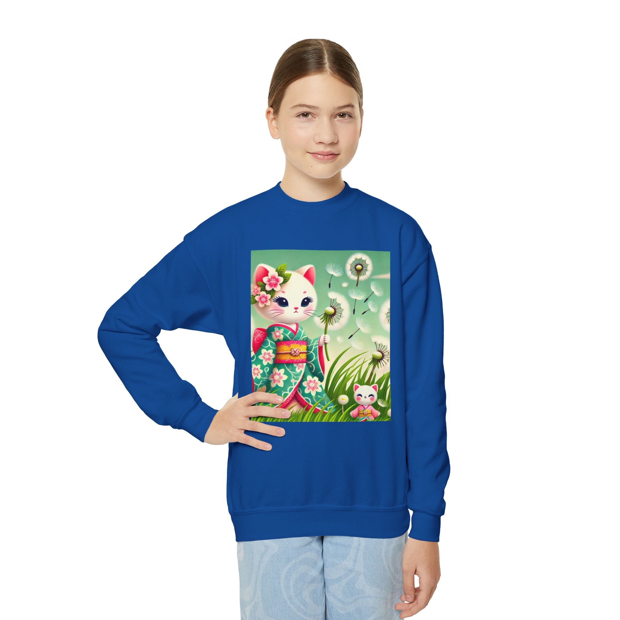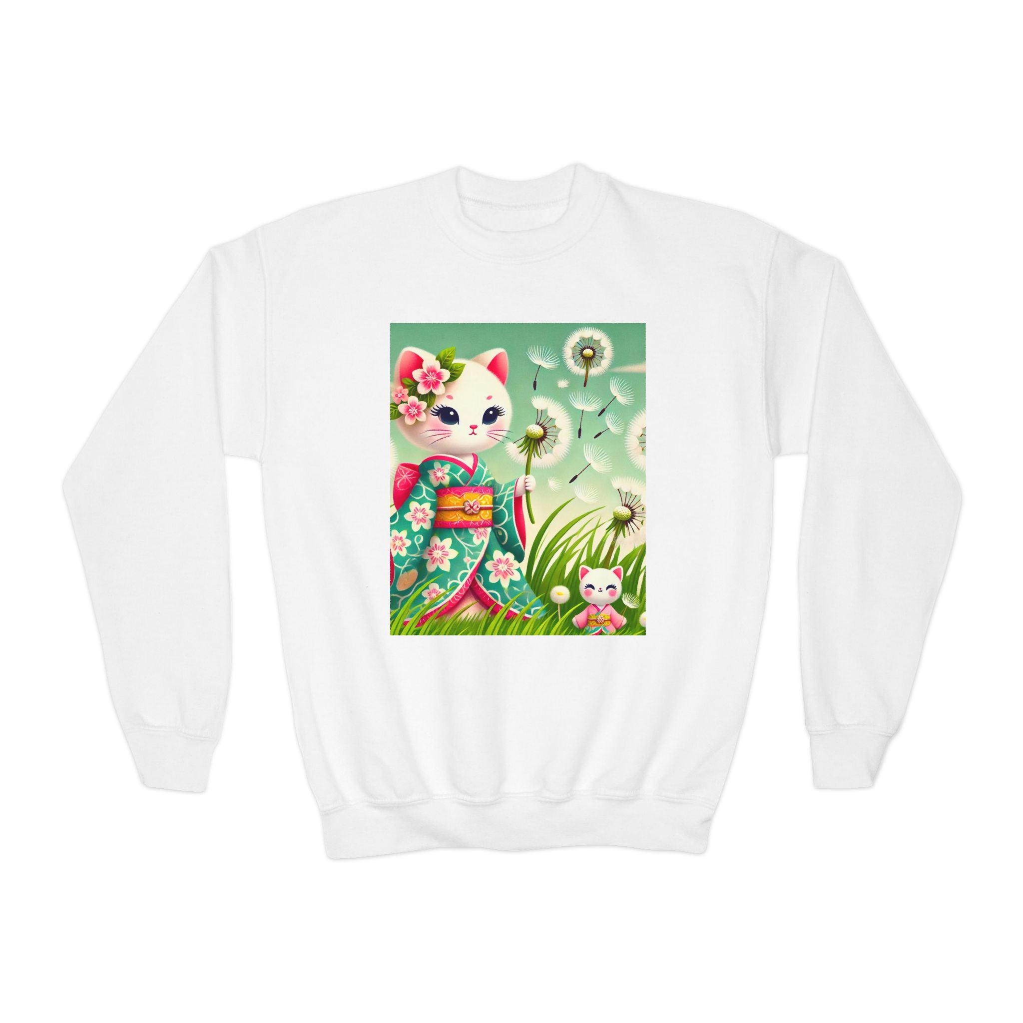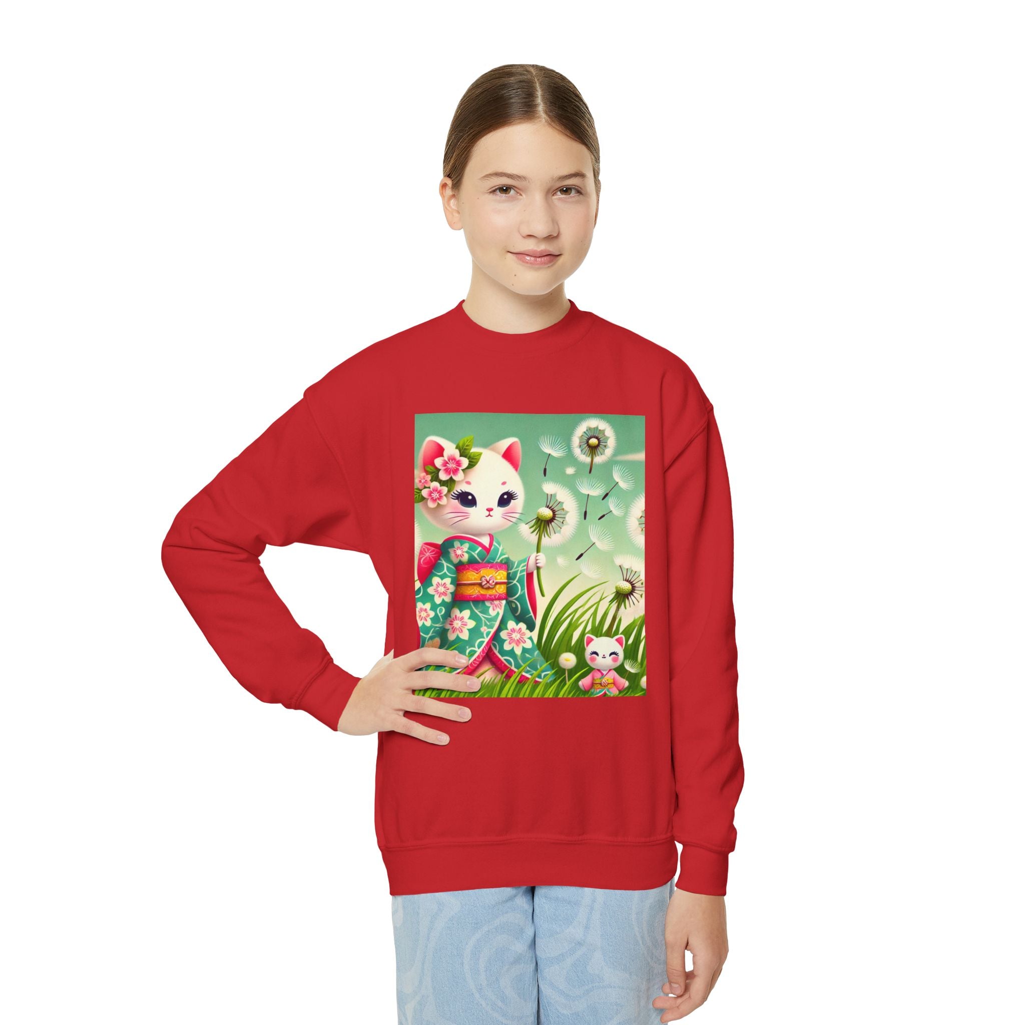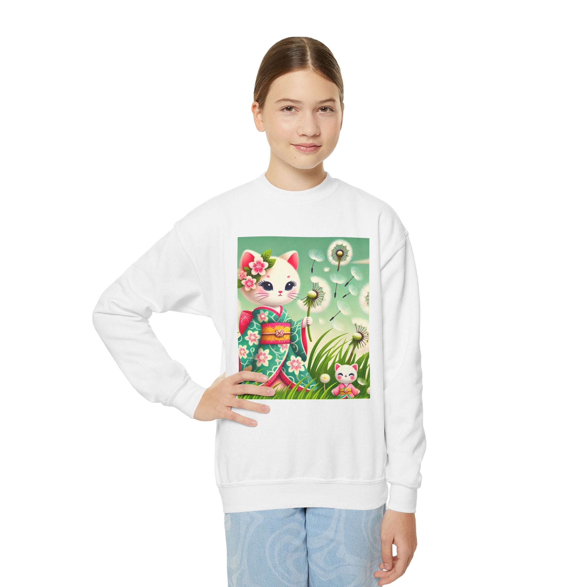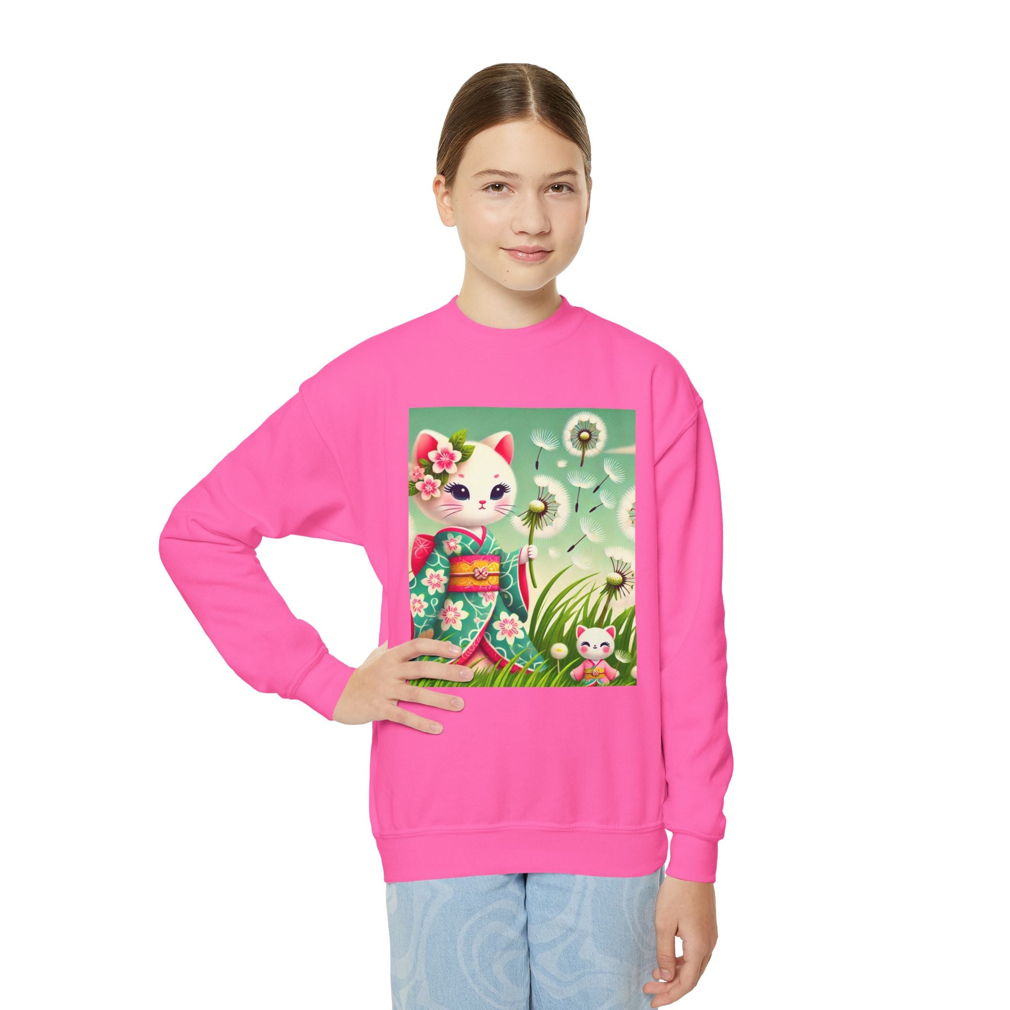Geisha Kitten and the Dandelion Wish Youth Crewneck Sweatshirt combines everyday comfort with enchanting storytelling. Made from a balanced blend of 50% cotton and 50% polyester, this Gildan 18000B sweatshirt offers warmth, softness, and lasting quality—perfect for school, play, or cozy afternoons. Its medium-heavy fabric provides a premium, snug feel, while the loose fit ensures comfort and freedom of movement. Please note: due to the fabric properties, the White color variant may appear slightly off-white.