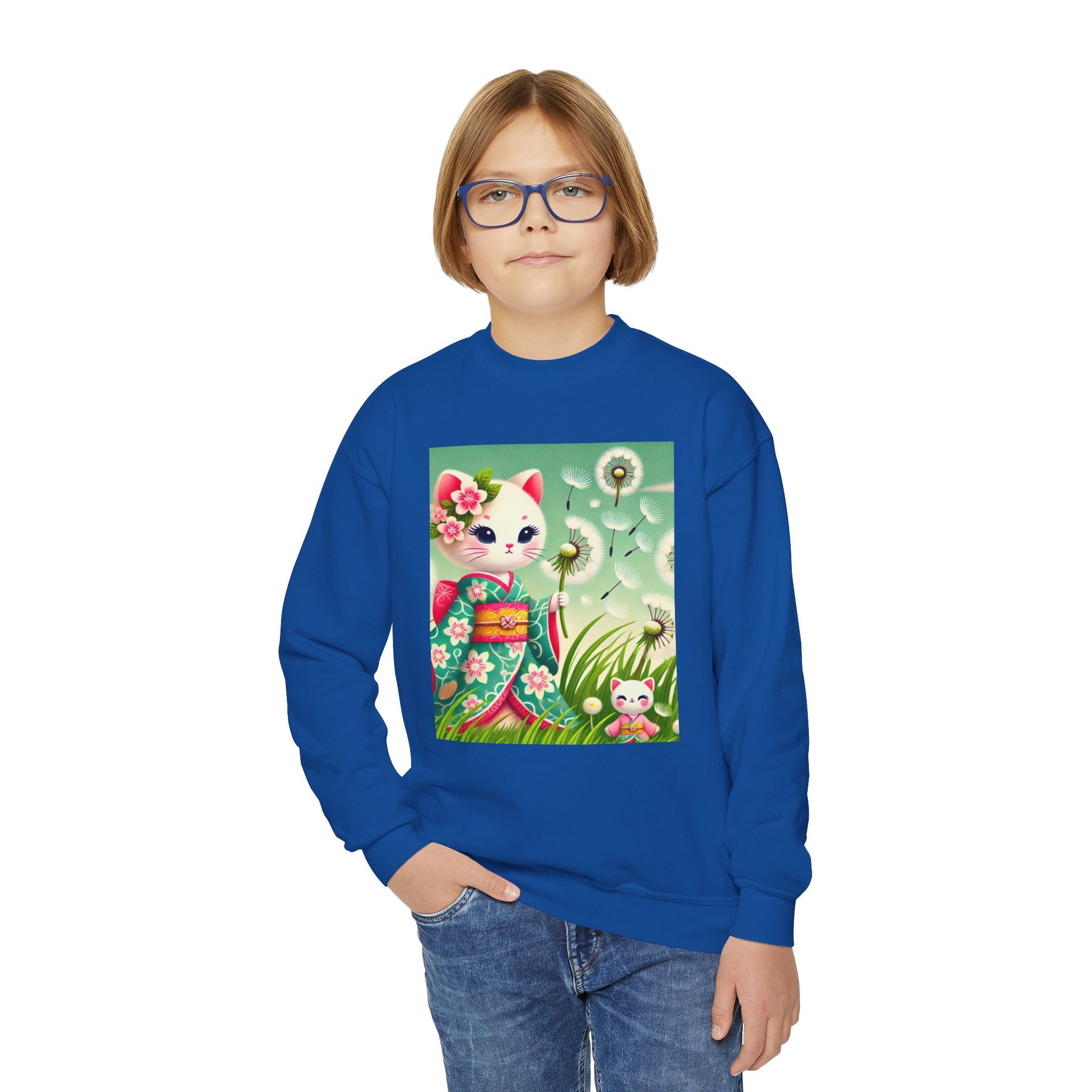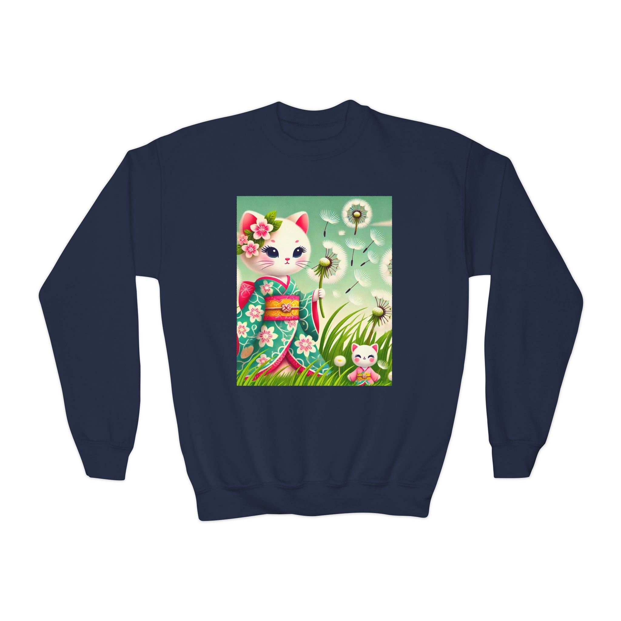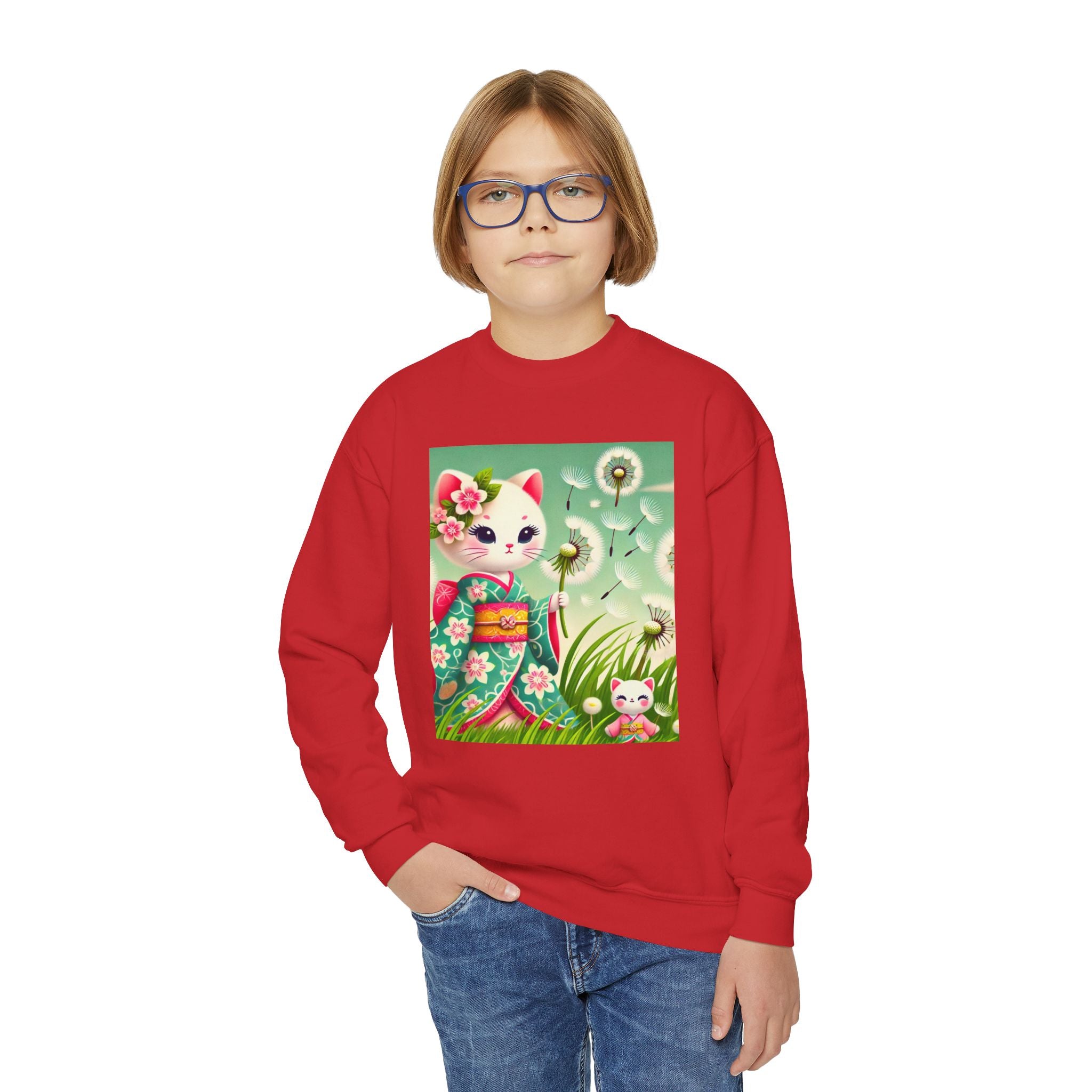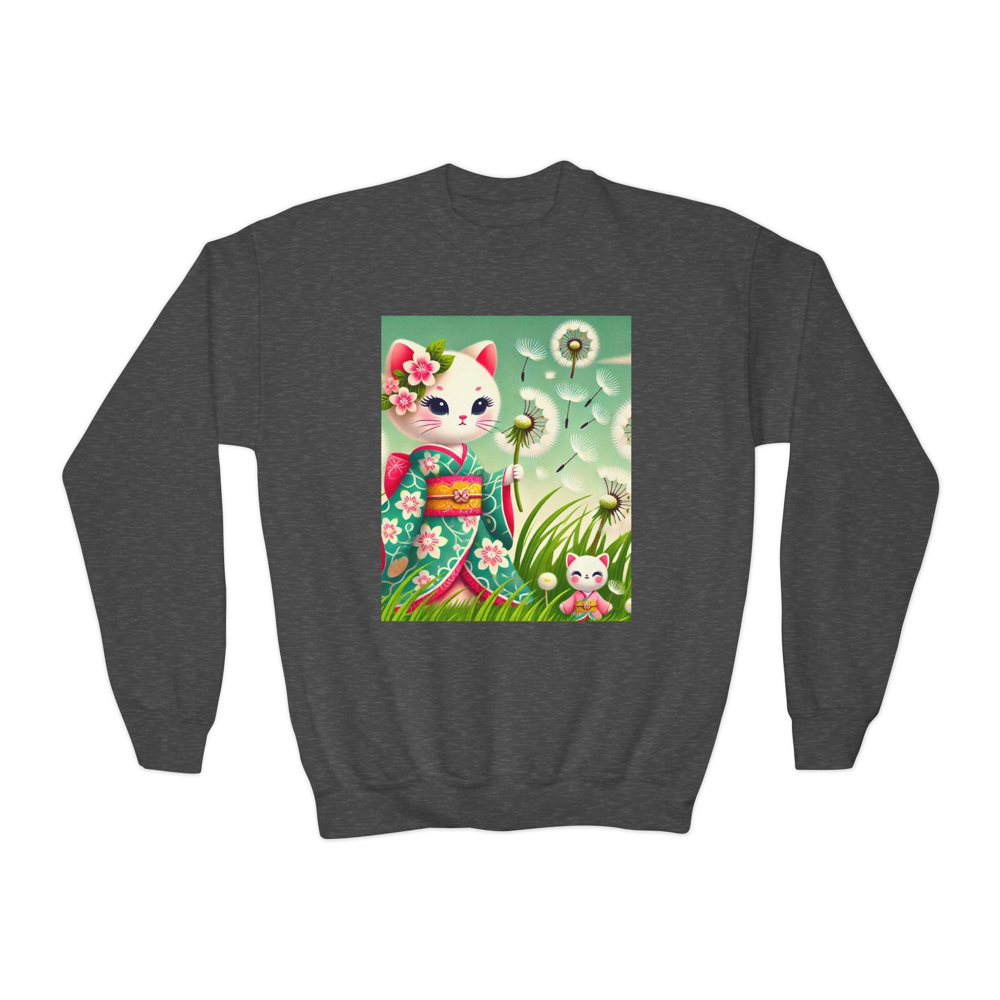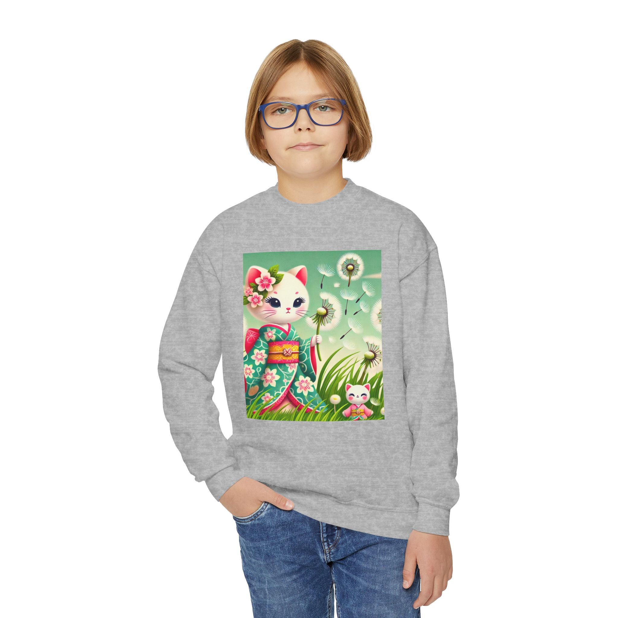 Geisha Kitten and the Dandelion Wish Youth Crewneck Sweatshirt combines everyday comfort with enchanting storytelling. Made from a balanced blend of 50% cotton and 50% polyester, this Gildan 18000B sweatshirt offers warmth, softness, and lasting quality—perfect for school, play, or cozy afternoons. Its medium-heavy fabric provides a premium, snug feel, while the loose fit ensures comfort and freedom of movement. Please note: due to the fabric properties, the White color variant may appear slightly off-white.