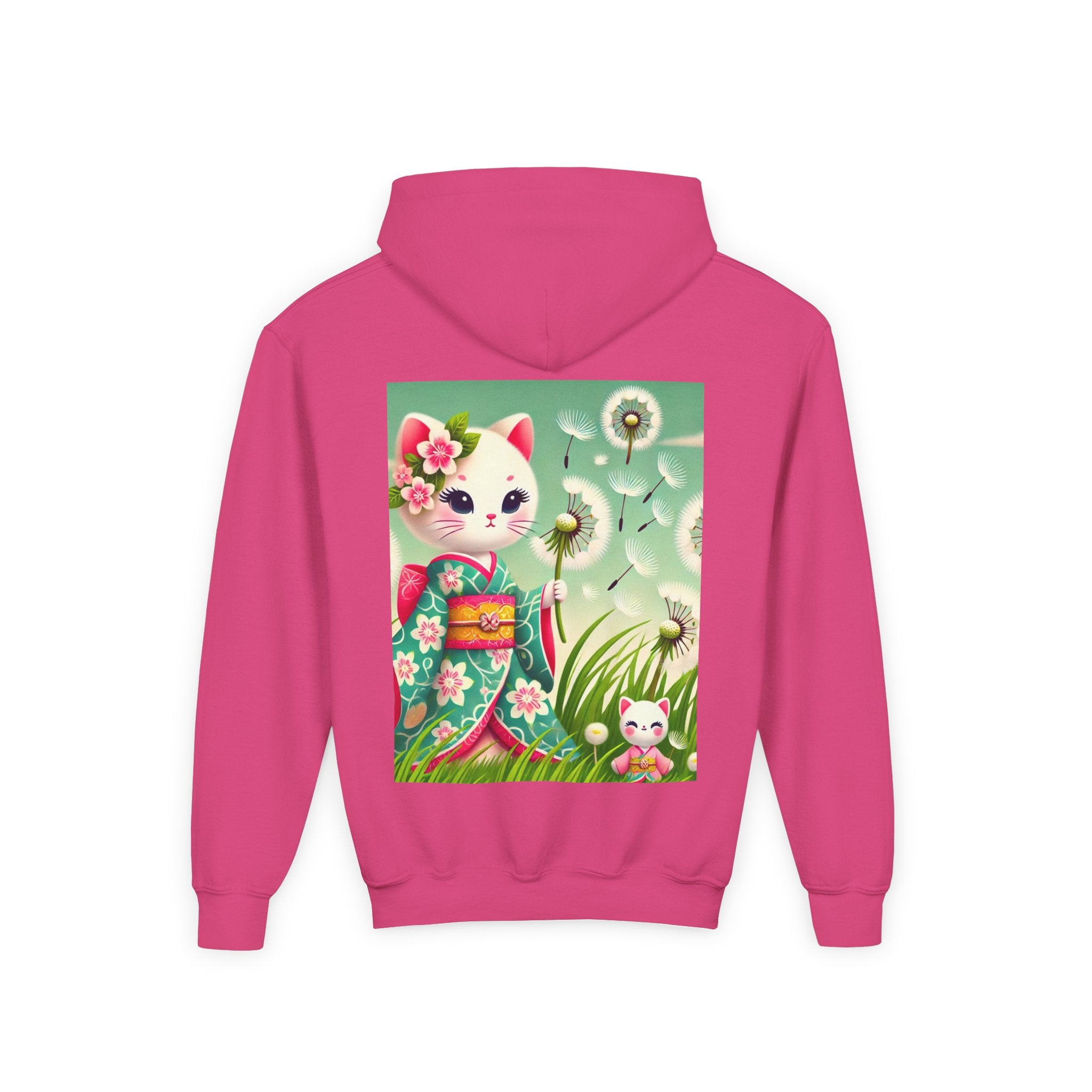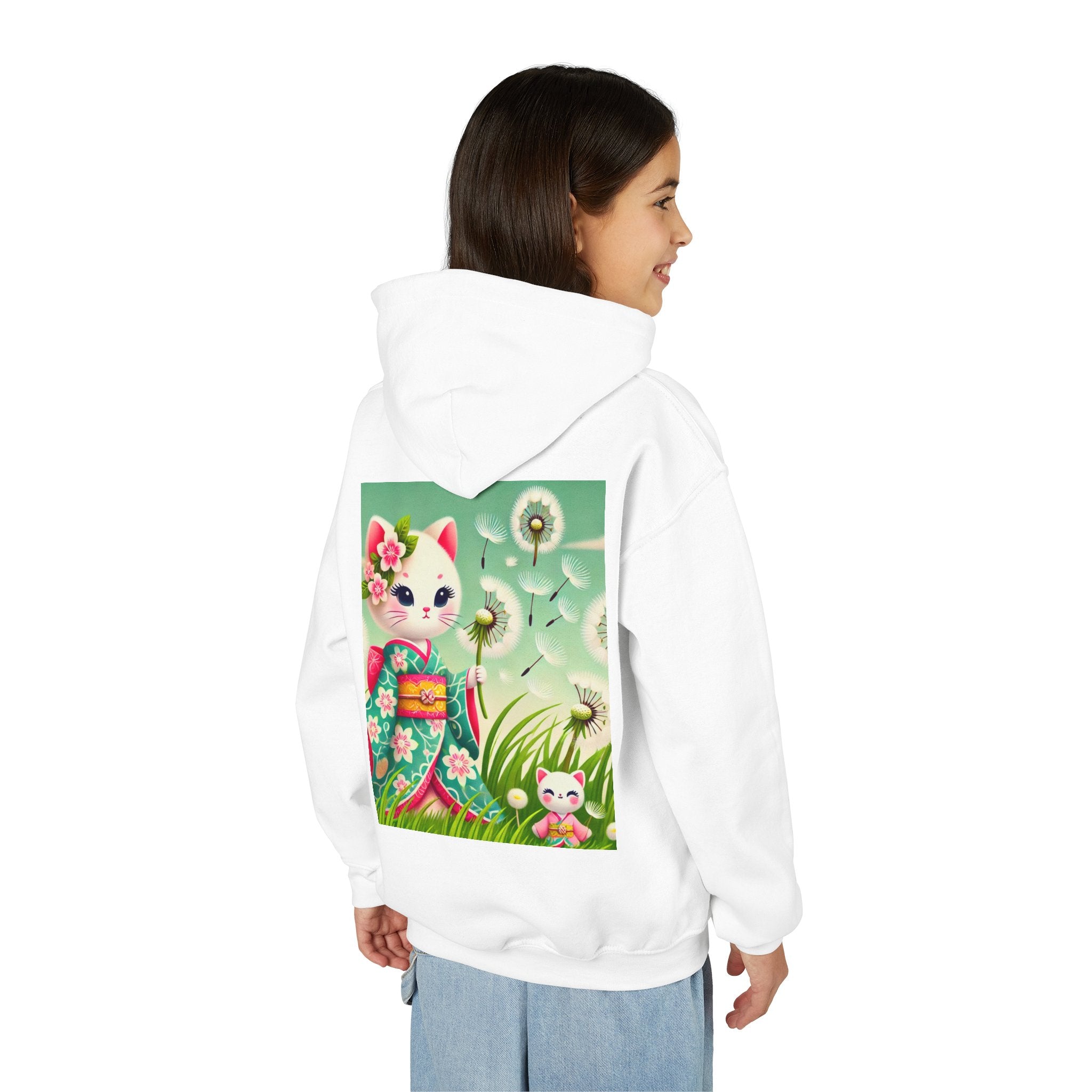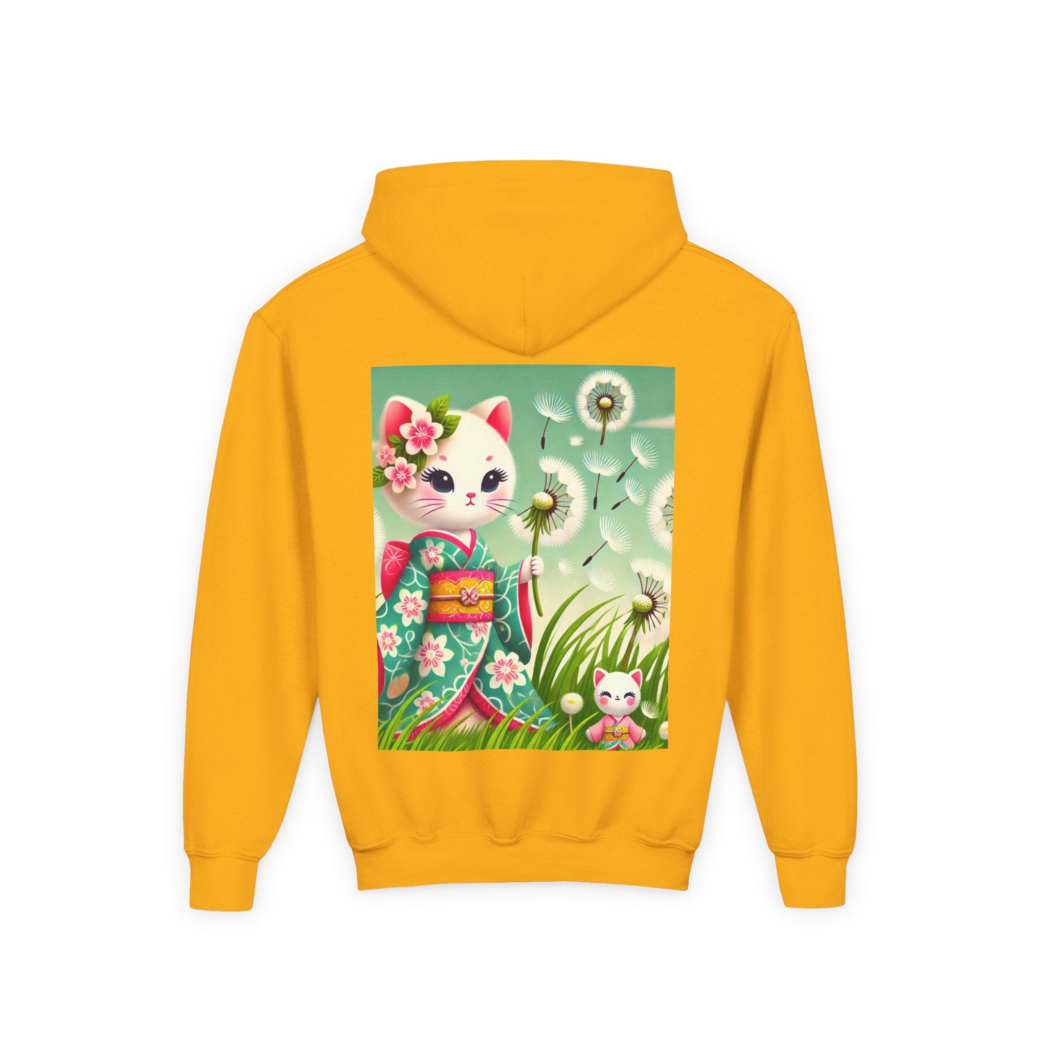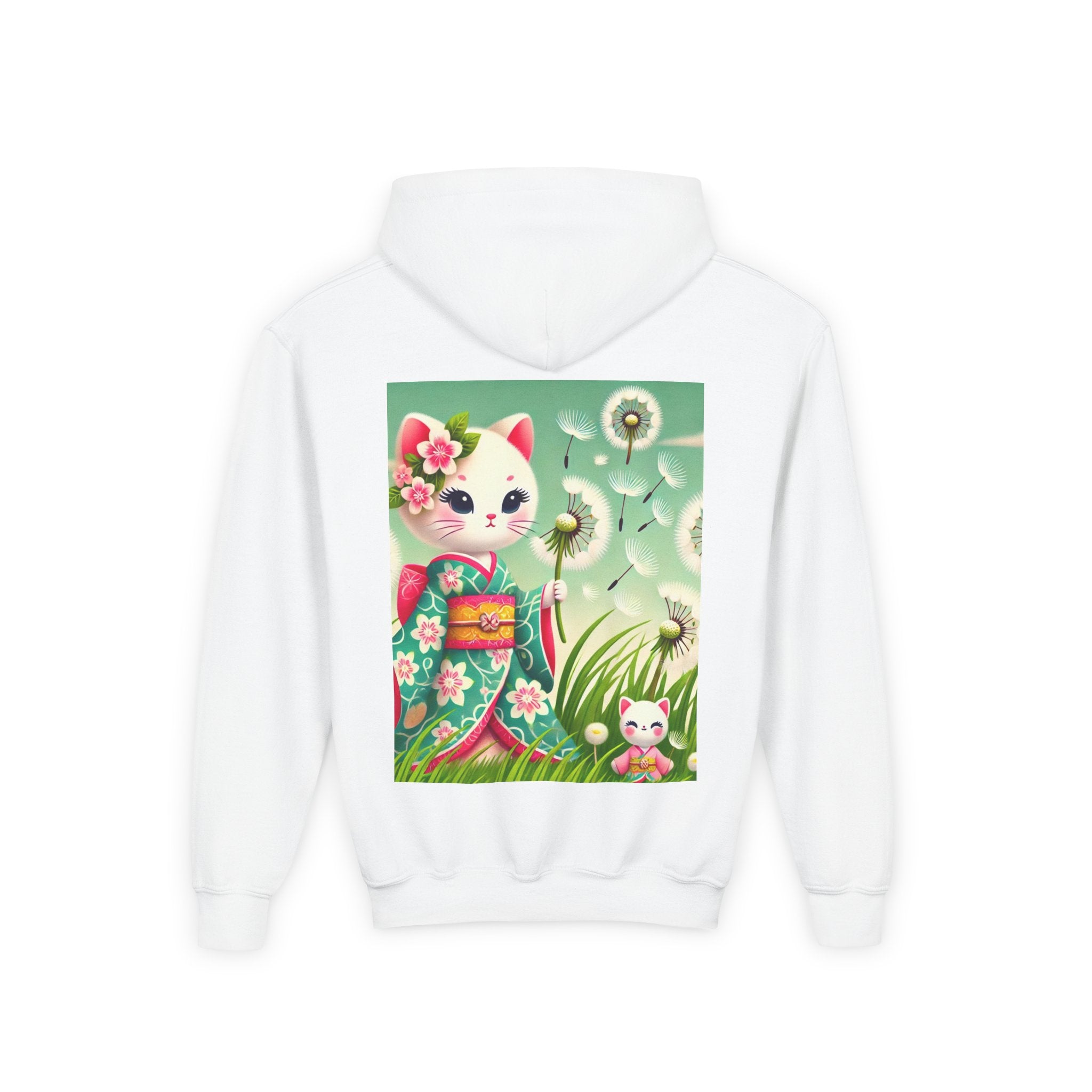 Geisha Kitten and the Dandelion Wish Youth Heavy Blend Hooded Sweatshirt combines softness, comfort, and enchanting design in one delightful piece. Made from ultra-soft, preshrunk fleece, this hoodie offers cozy warmth with minimal lint buildup. Its 50/50 cotton-polyester blend ensures durability and easy care, while the kangaroo pocket and twill-reinforced neck provide practical comfort. Please note: due to fabric properties, the White color variant may appear slightly off-white.