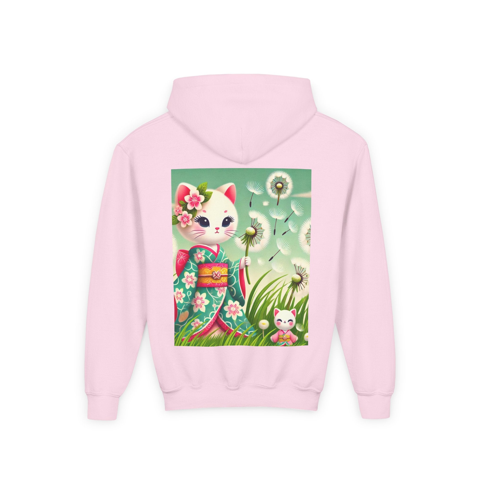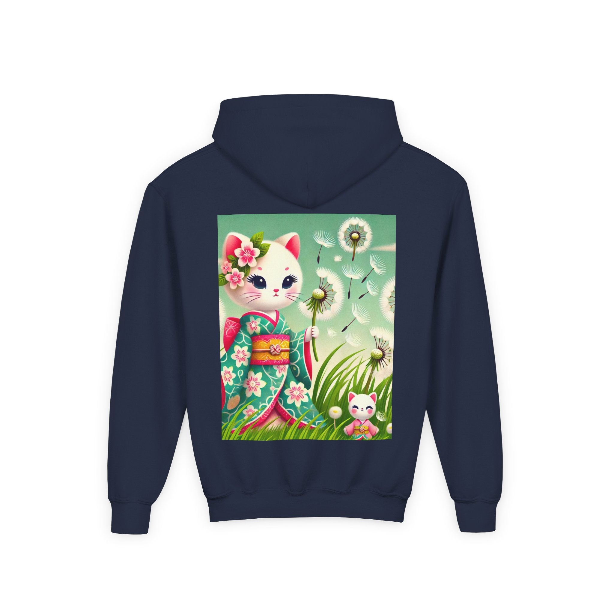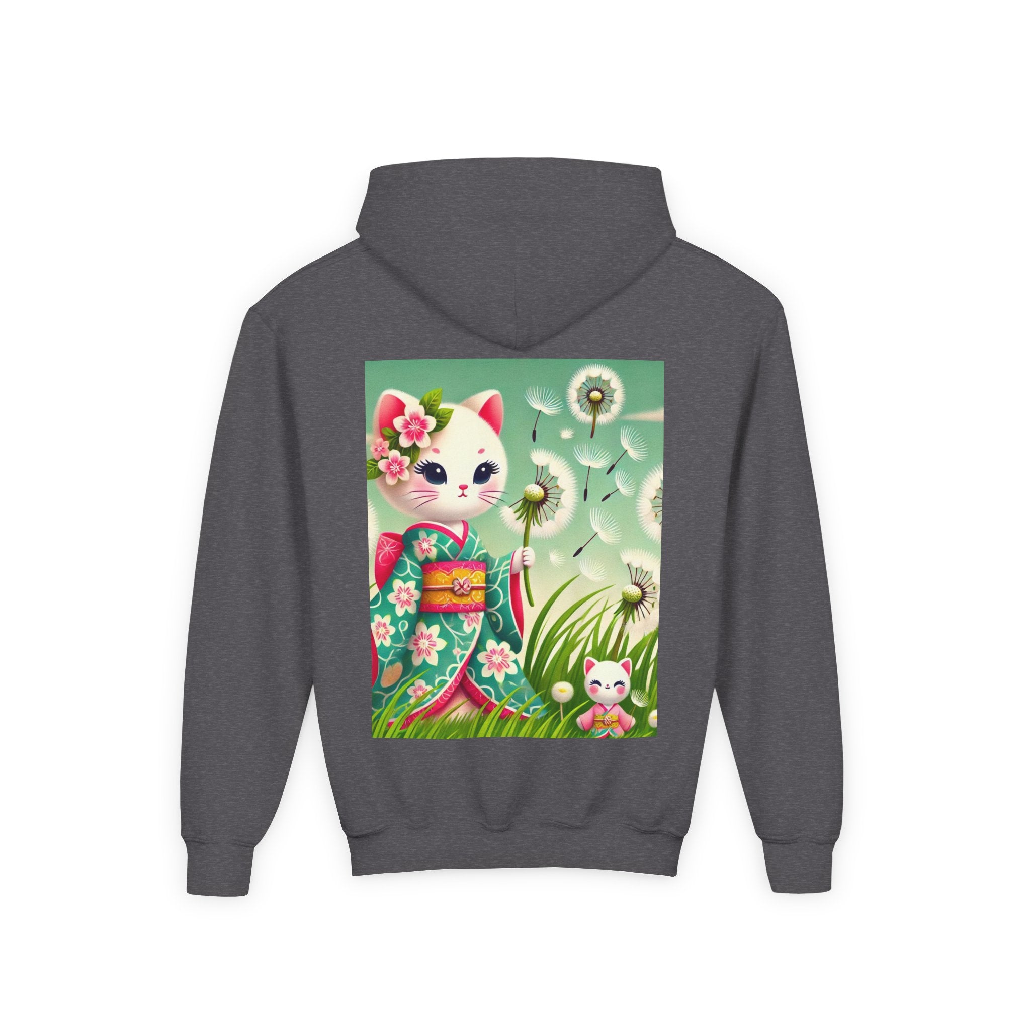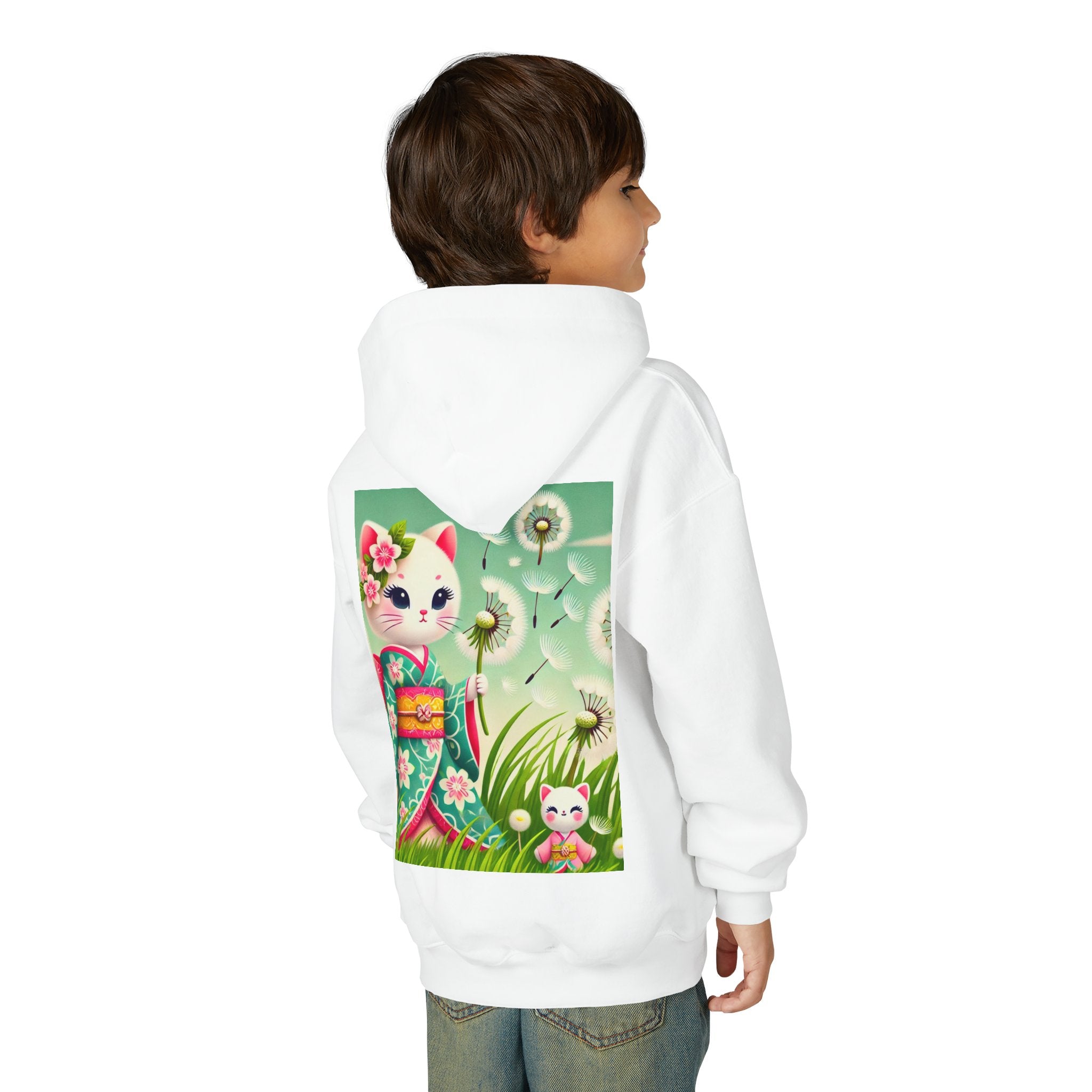 Geisha Kitten and the Dandelion Wish Youth Heavy Blend Hooded Sweatshirt combines softness, comfort, and enchanting design in one delightful piece. Made from ultra-soft, preshrunk fleece, this hoodie offers cozy warmth with minimal lint buildup. Its 50/50 cotton-polyester blend ensures durability and easy care, while the kangaroo pocket and twill-reinforced neck provide practical comfort. Please note: due to fabric properties, the White color variant may appear slightly off-white.
