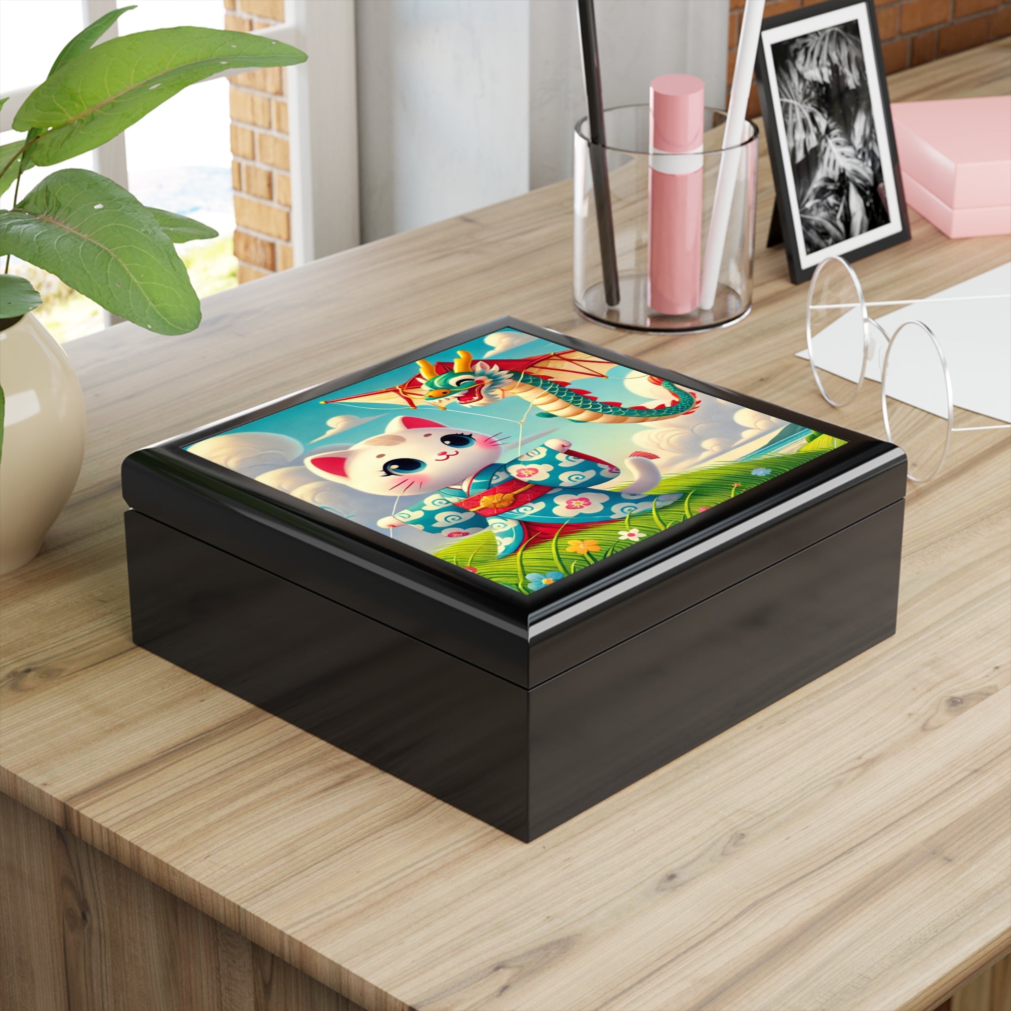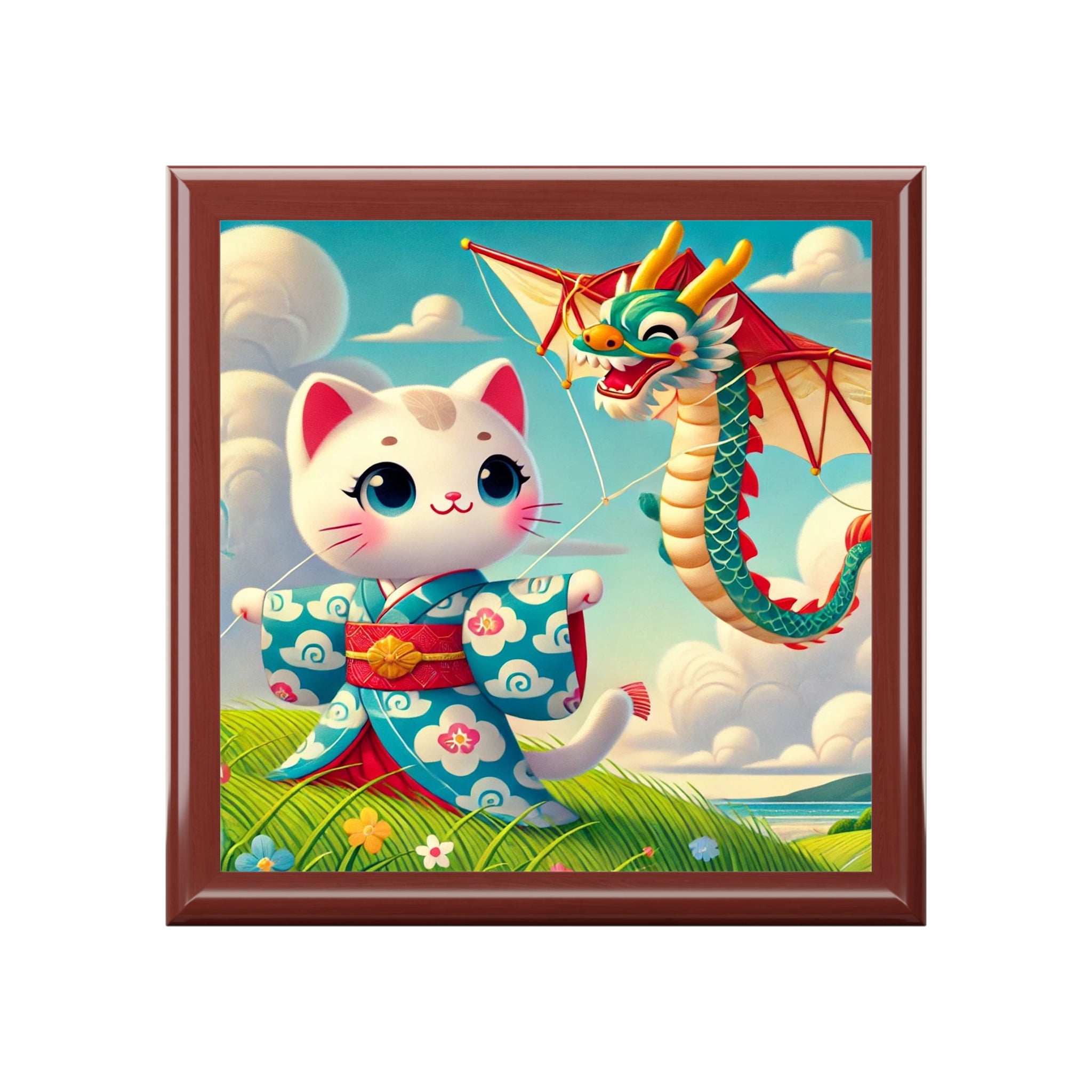 Geisha Kitten and the Dragon Jewelry Box captures a playful moment where tradition takes flight. On the glossy ceramic tile lid, a bold geisha kitten in a striking kimono joyfully flies a magnificent dragon-shaped kite. The wind lifts the flowing fabric of her attire along with the dragon kite’s curling tail, creating a mesmerizing dance of color, movement, and imagination that feels straight out of a modern folktale.
