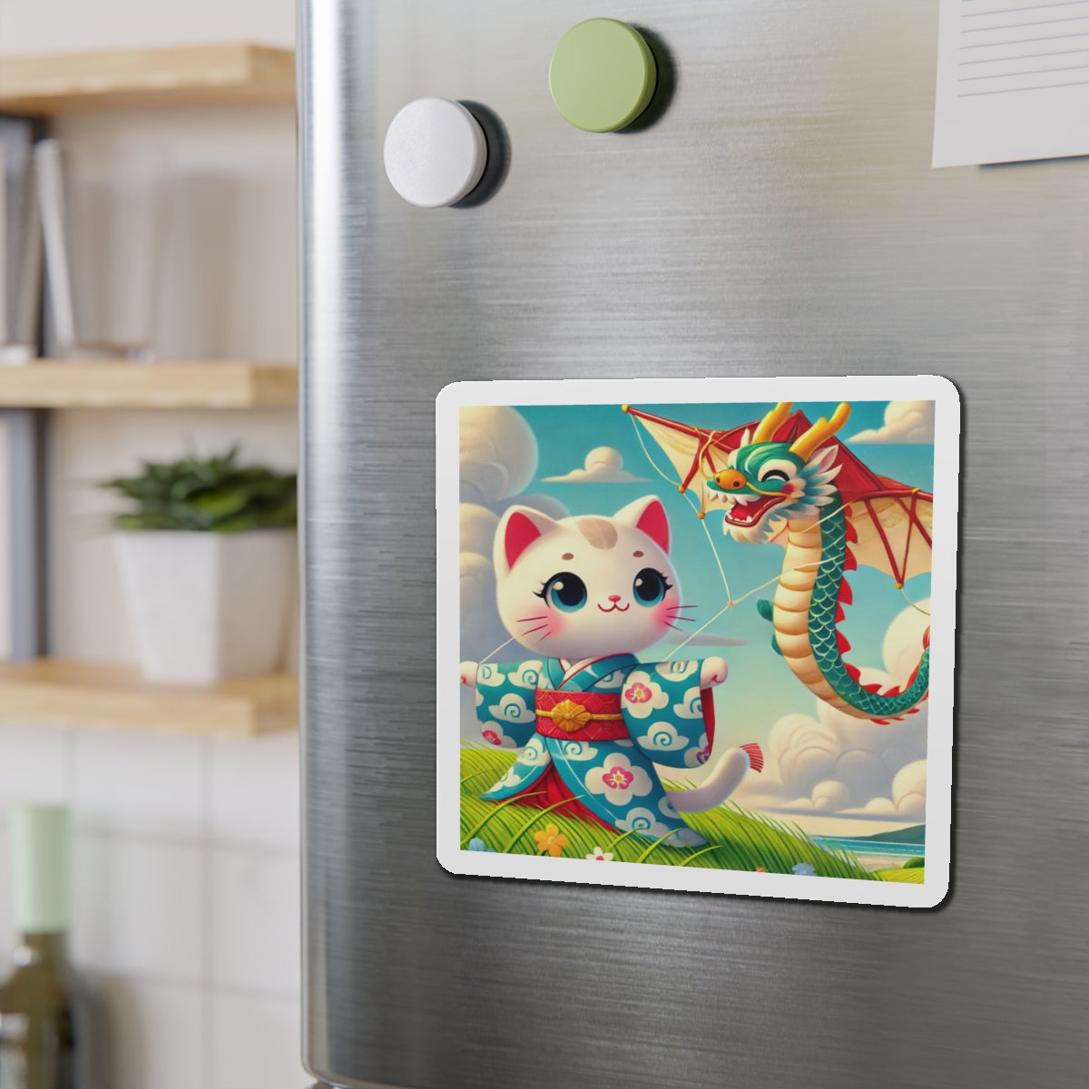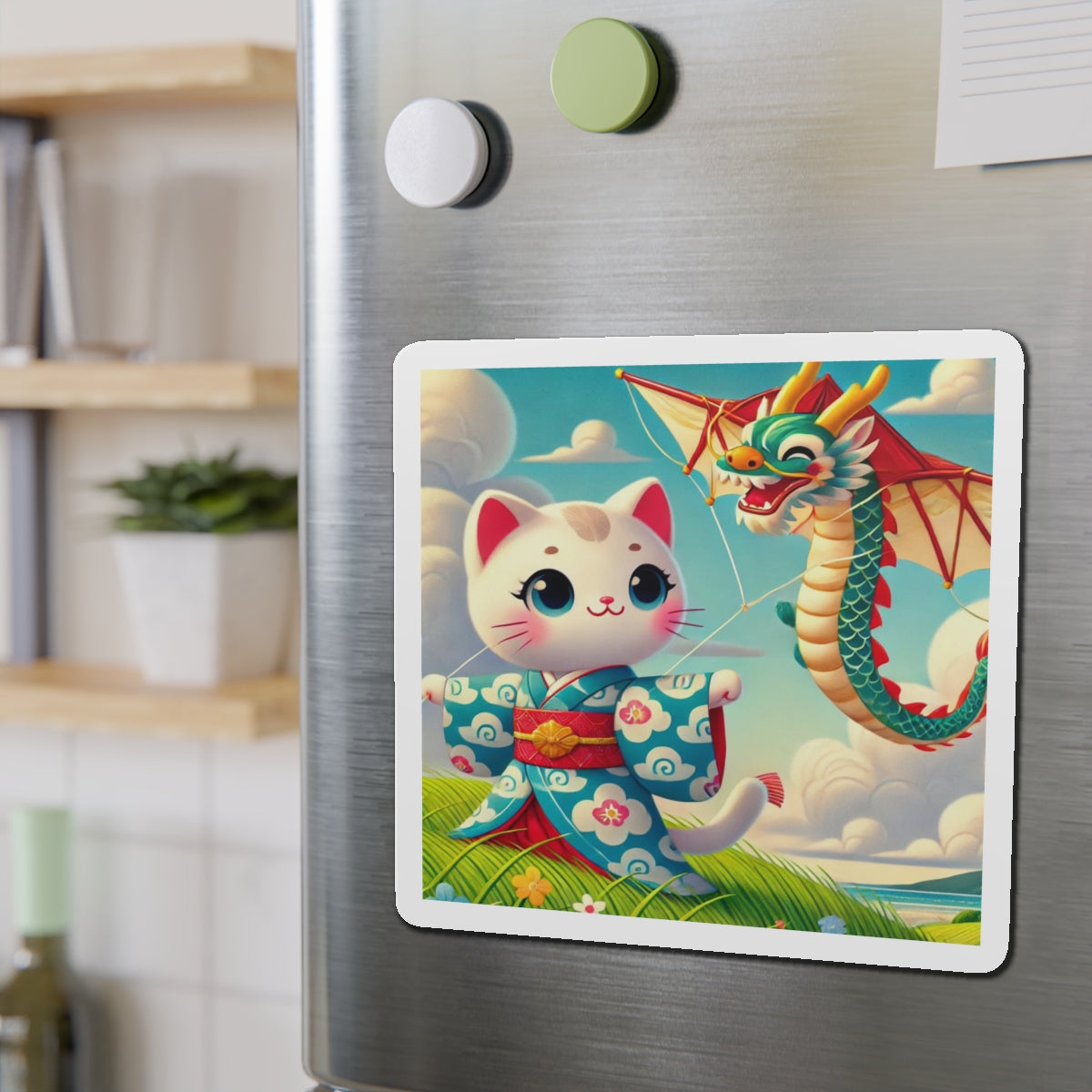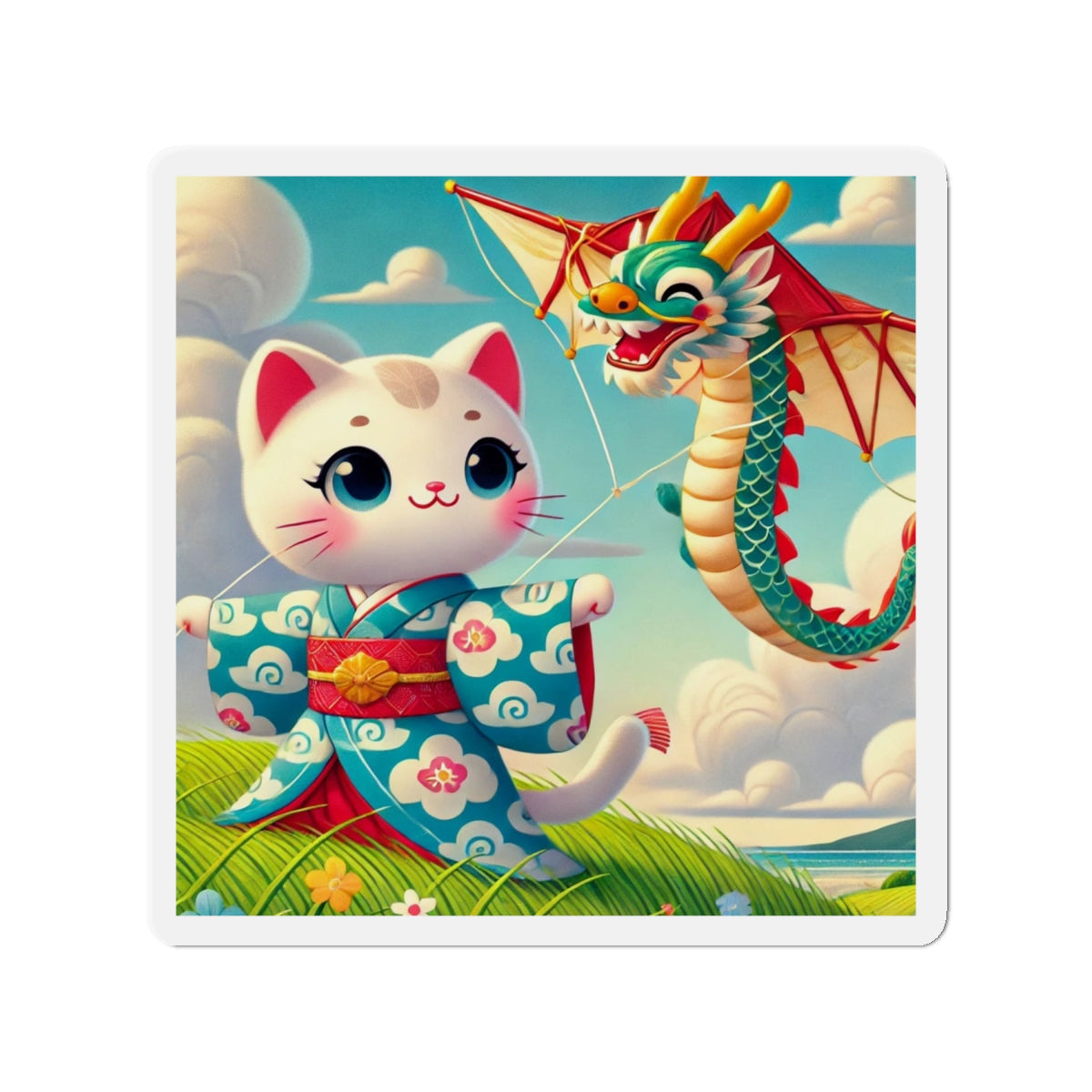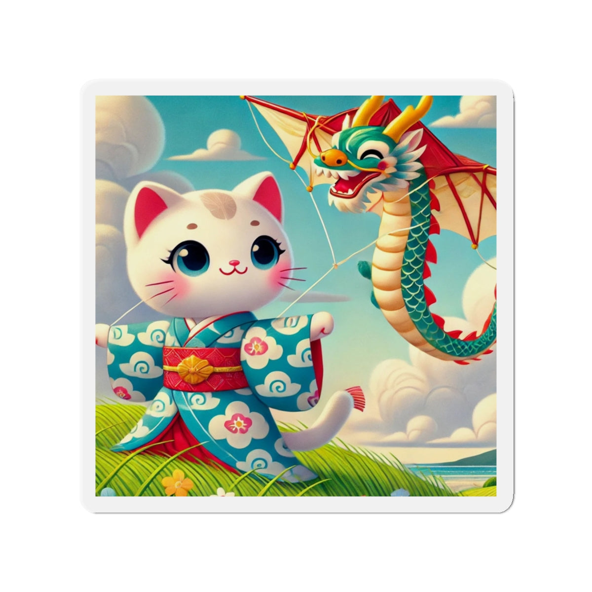 The Geisha Kitten and the Dragon Kite artwork captures a playful yet elegant moment, featuring a bold geisha kitten adorned in a striking kimono with intricate dragon designs. As the wind carries her magnificent dragon-shaped kite, the flowing fabric of her attire dances in harmony, creating a captivating display of movement, tradition, and adventure. This fusion of cultural artistry and lighthearted energy makes these magnets a delightful addition to any collection.