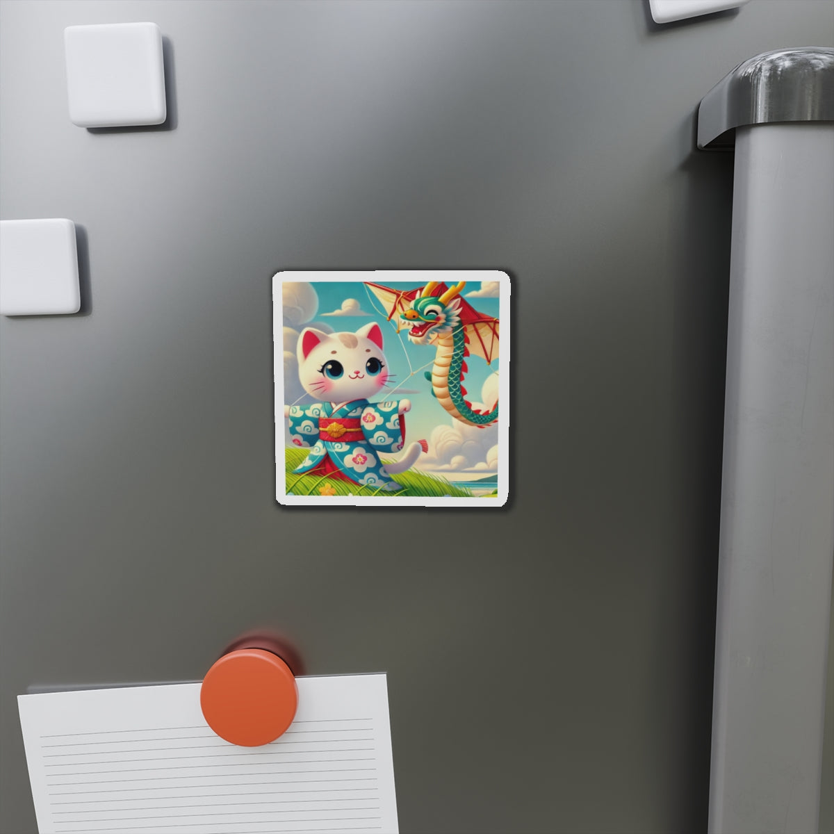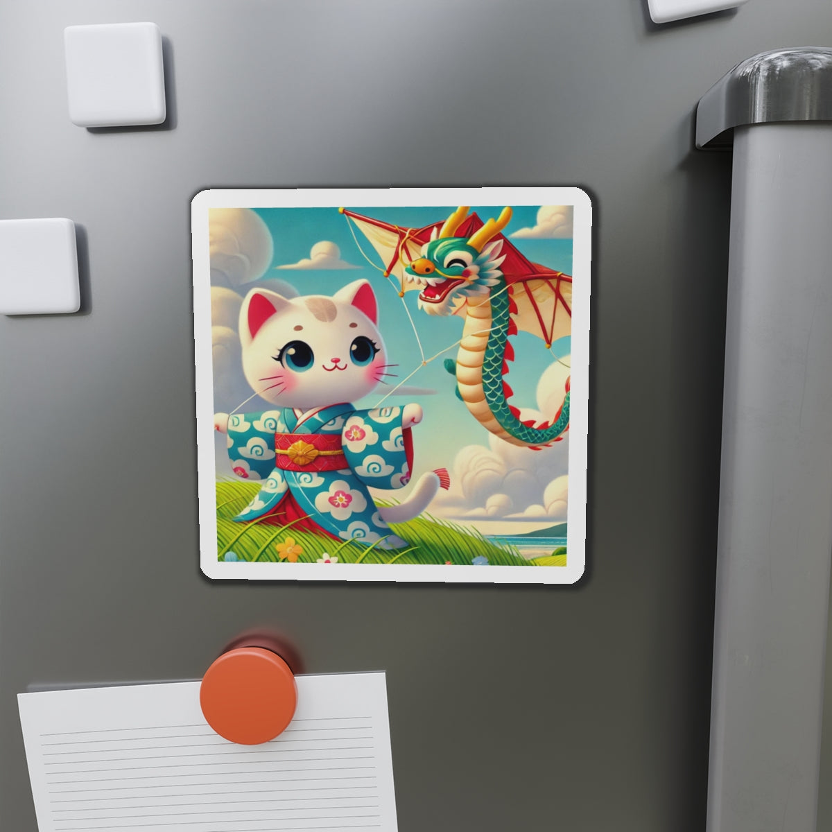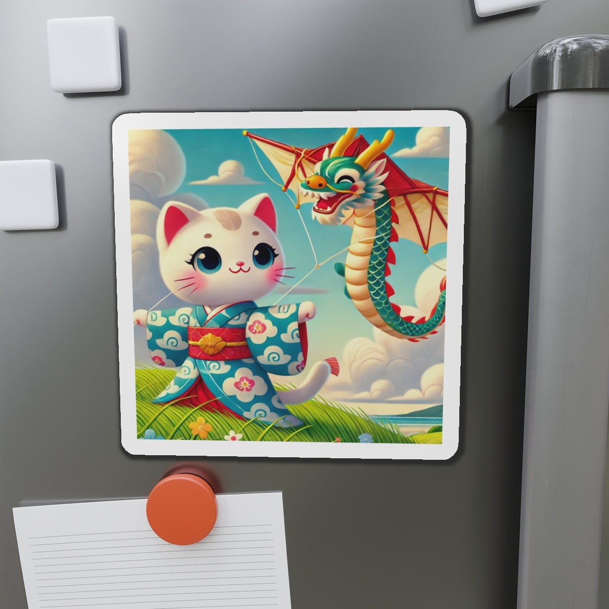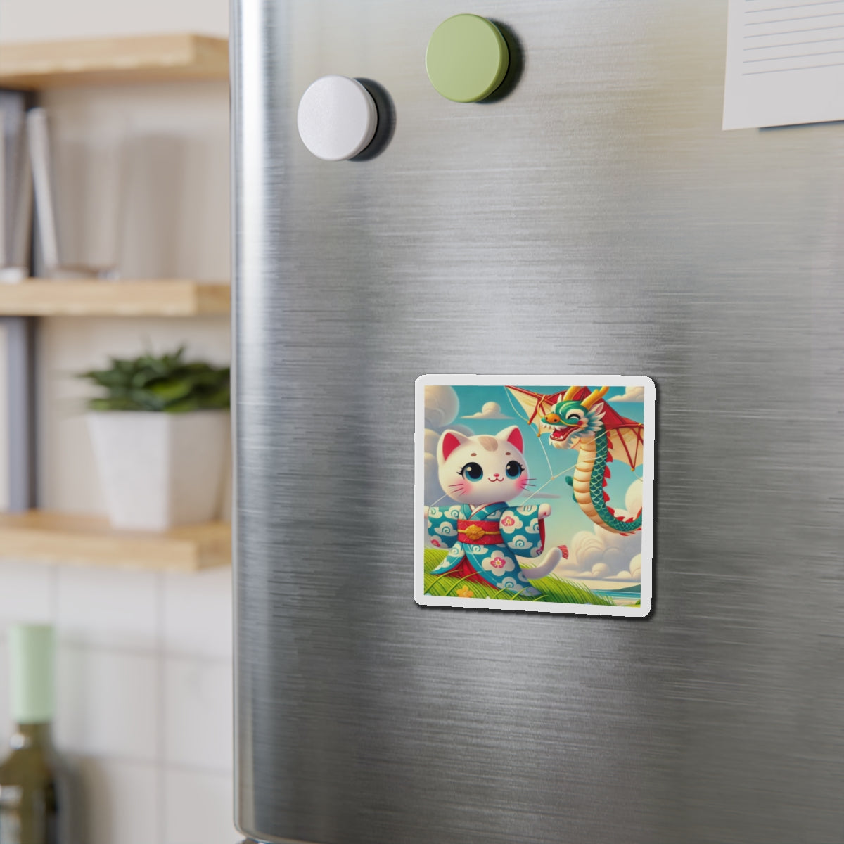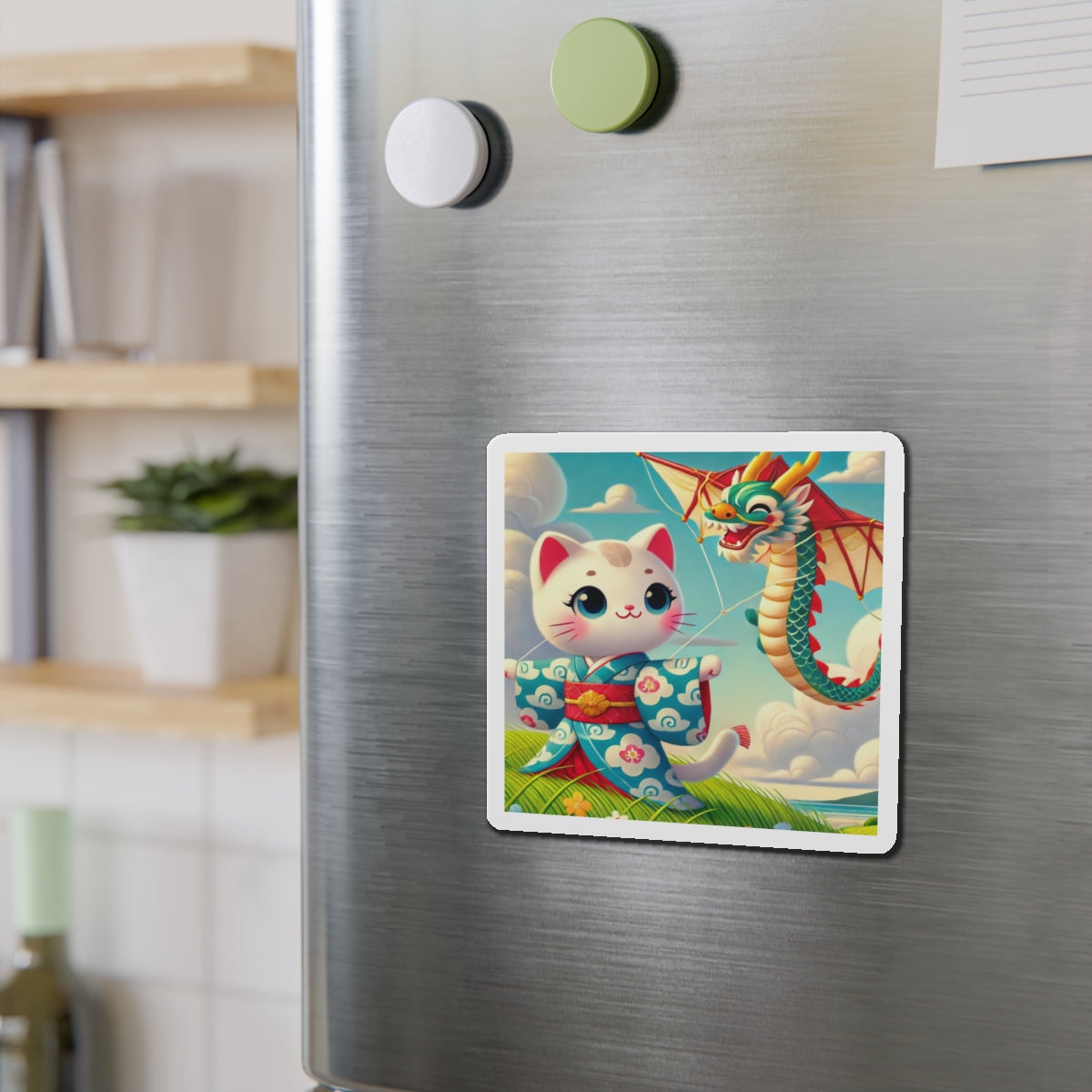 The Geisha Kitten and the Dragon Kite artwork captures a playful yet elegant moment, featuring a bold geisha kitten adorned in a striking kimono with intricate dragon designs. As the wind carries her magnificent dragon-shaped kite, the flowing fabric of her attire dances in harmony, creating a captivating display of movement, tradition, and adventure. This fusion of cultural artistry and lighthearted energy makes these magnets a delightful addition to any collection.