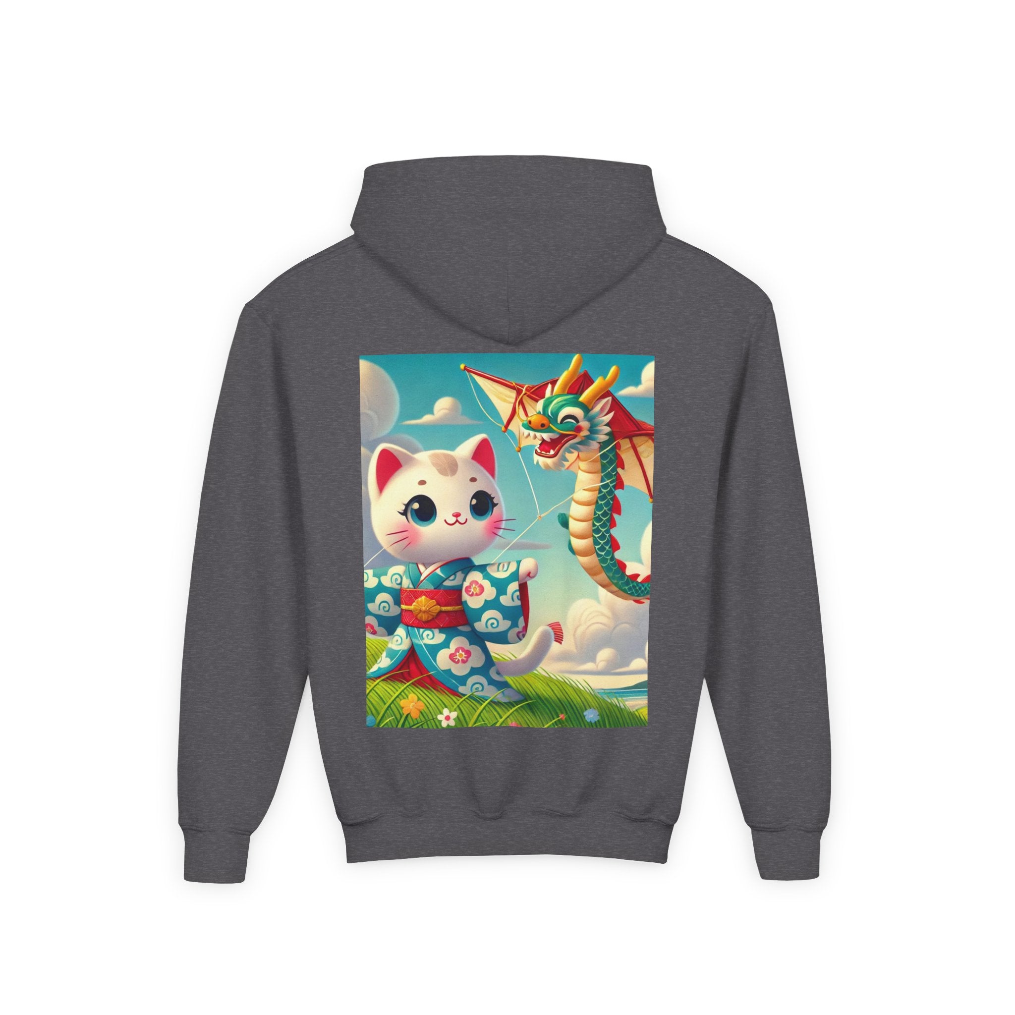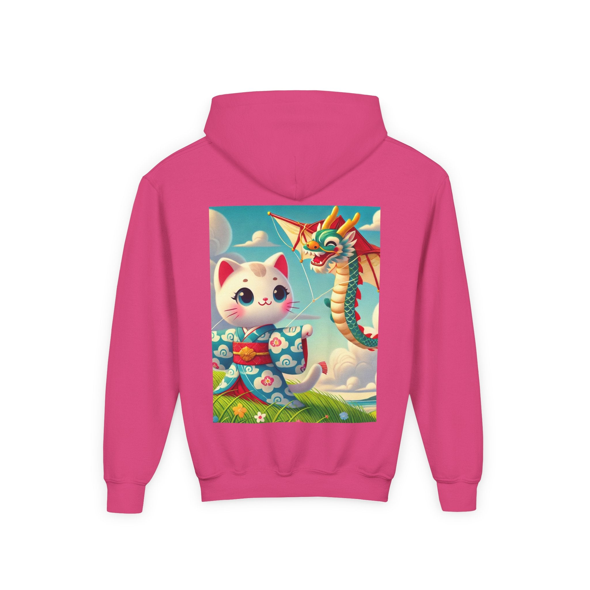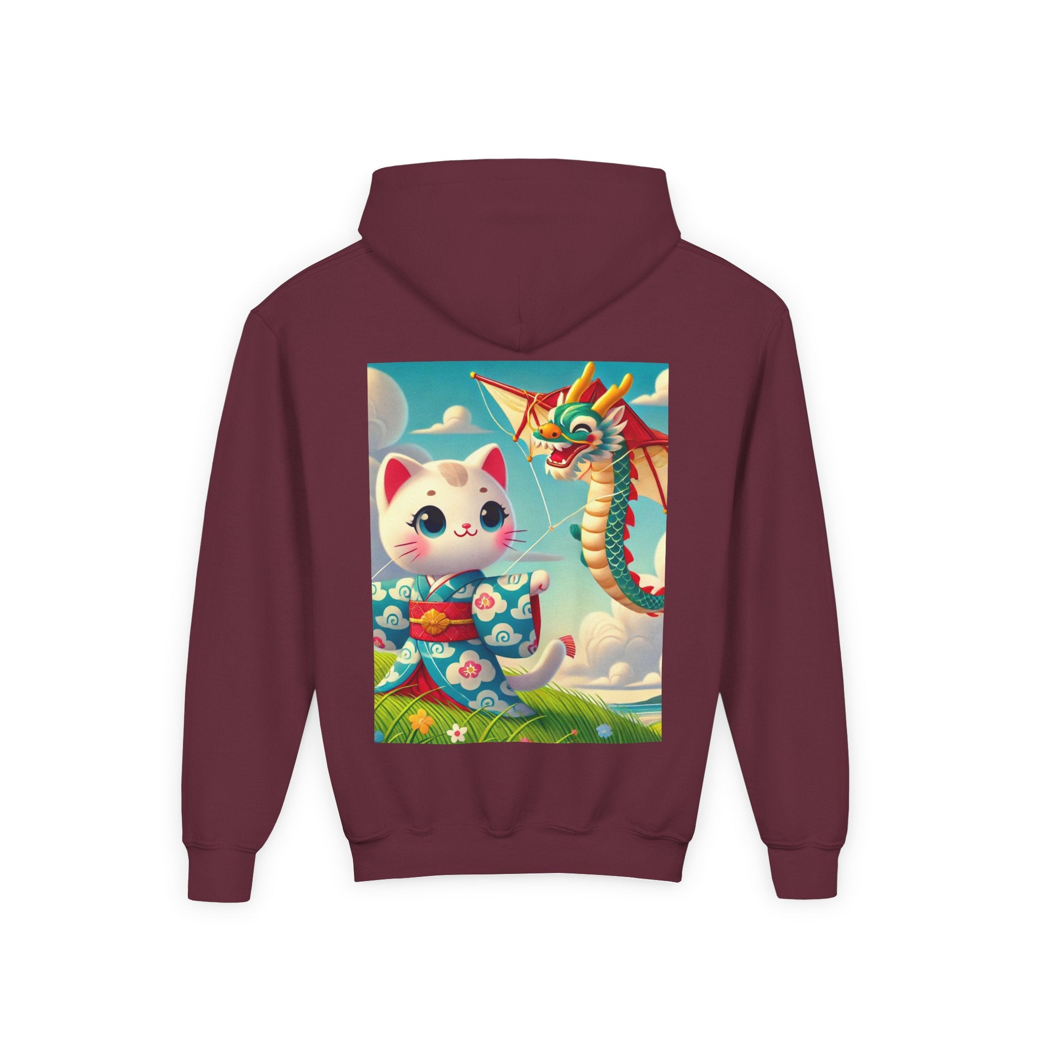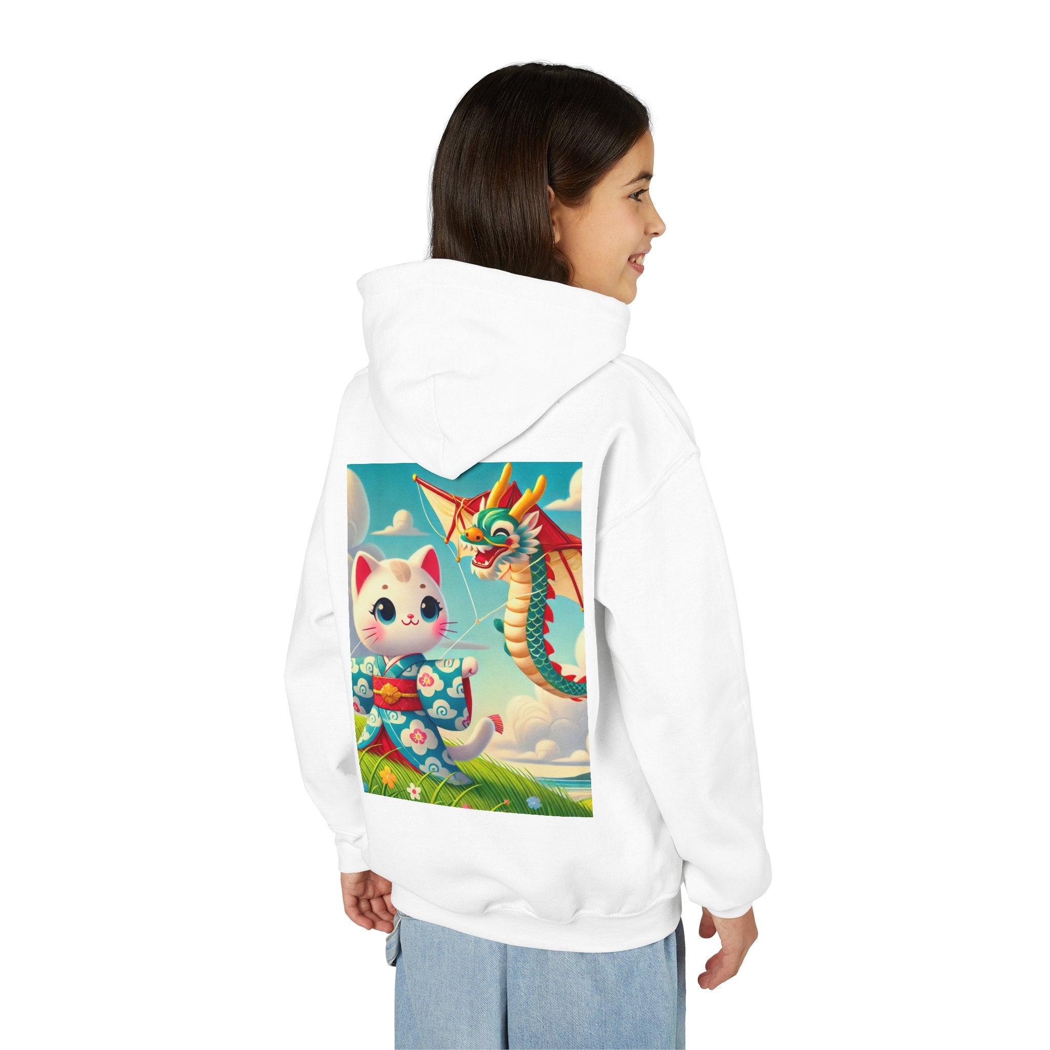 Geisha Kitten and the Dragon Kite Youth Heavy Blend Hooded Sweatshirt blends cozy comfort with whimsical artistry, perfect for kids who love bold, imaginative designs. Crafted from ultra-soft, preshrunk fleece, this hoodie offers warmth, durability, and reduced lint buildup. The balanced 50/50 cotton-polyester fabric ensures easy care, while the roomy kangaroo pocket and twill-reinforced neck add practical everyday comfort. Please note: due to fabric properties, the White color variant may appear slightly off-white.