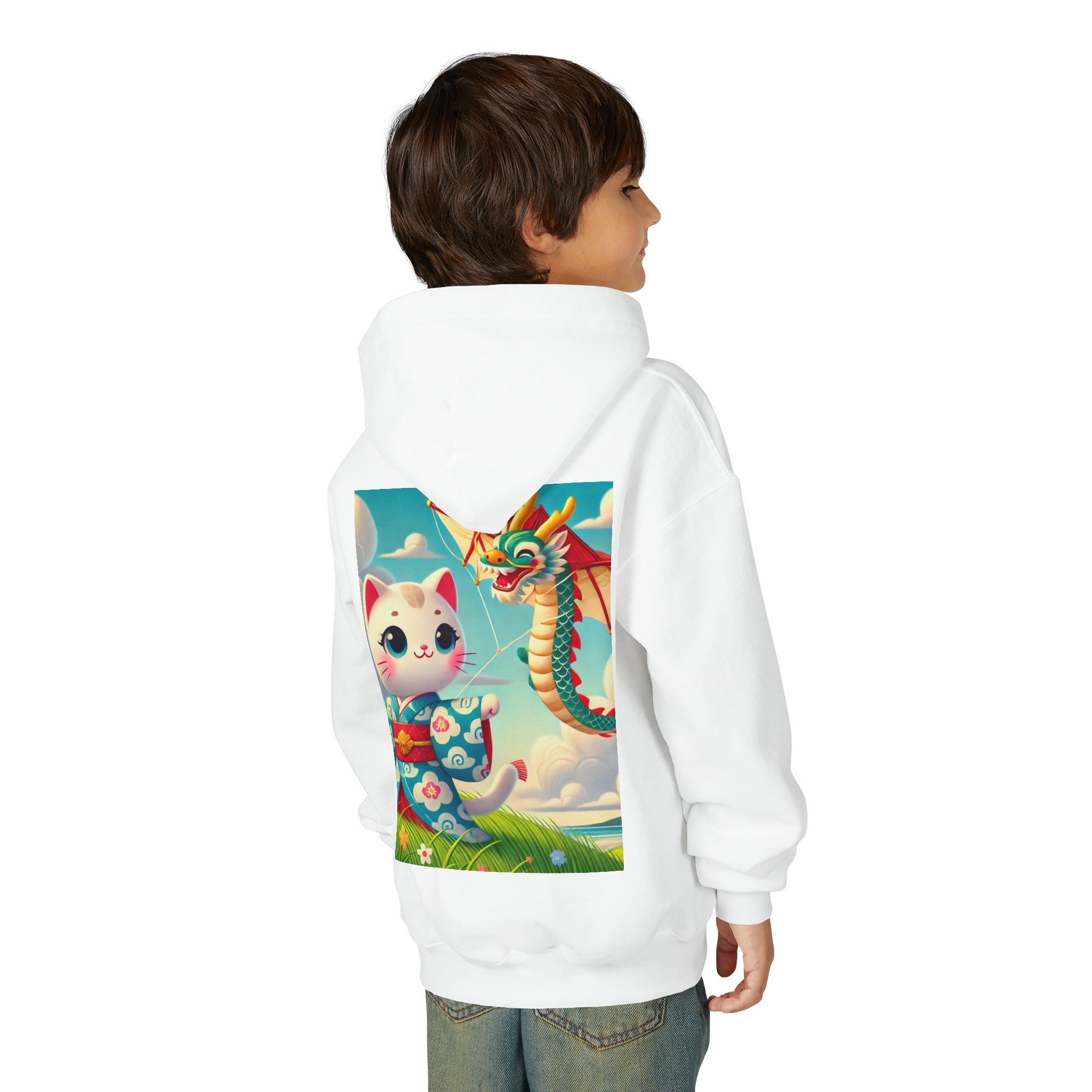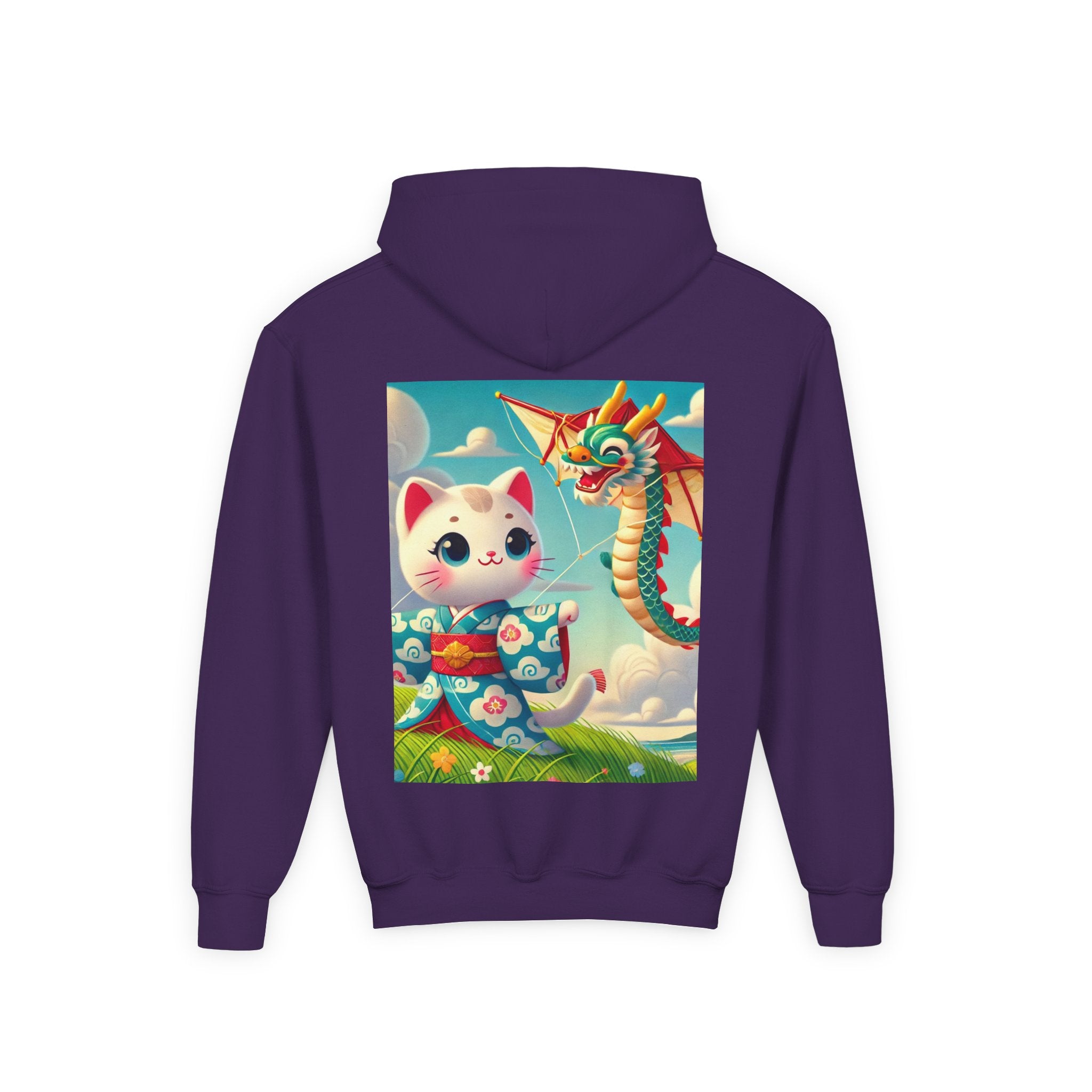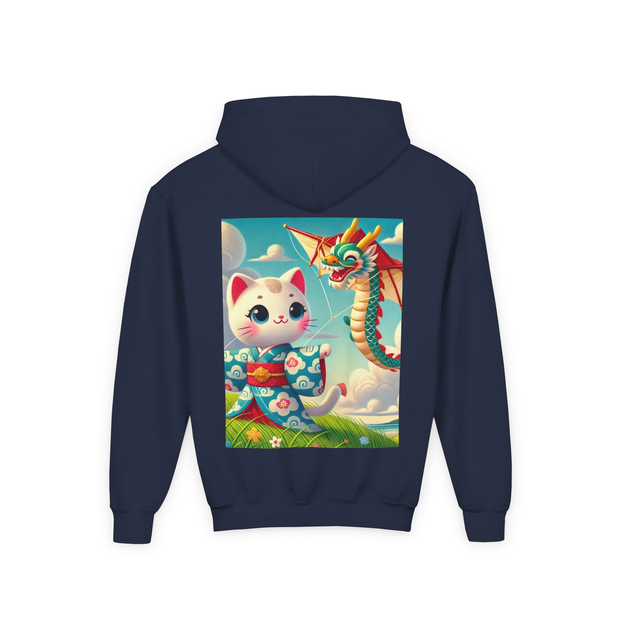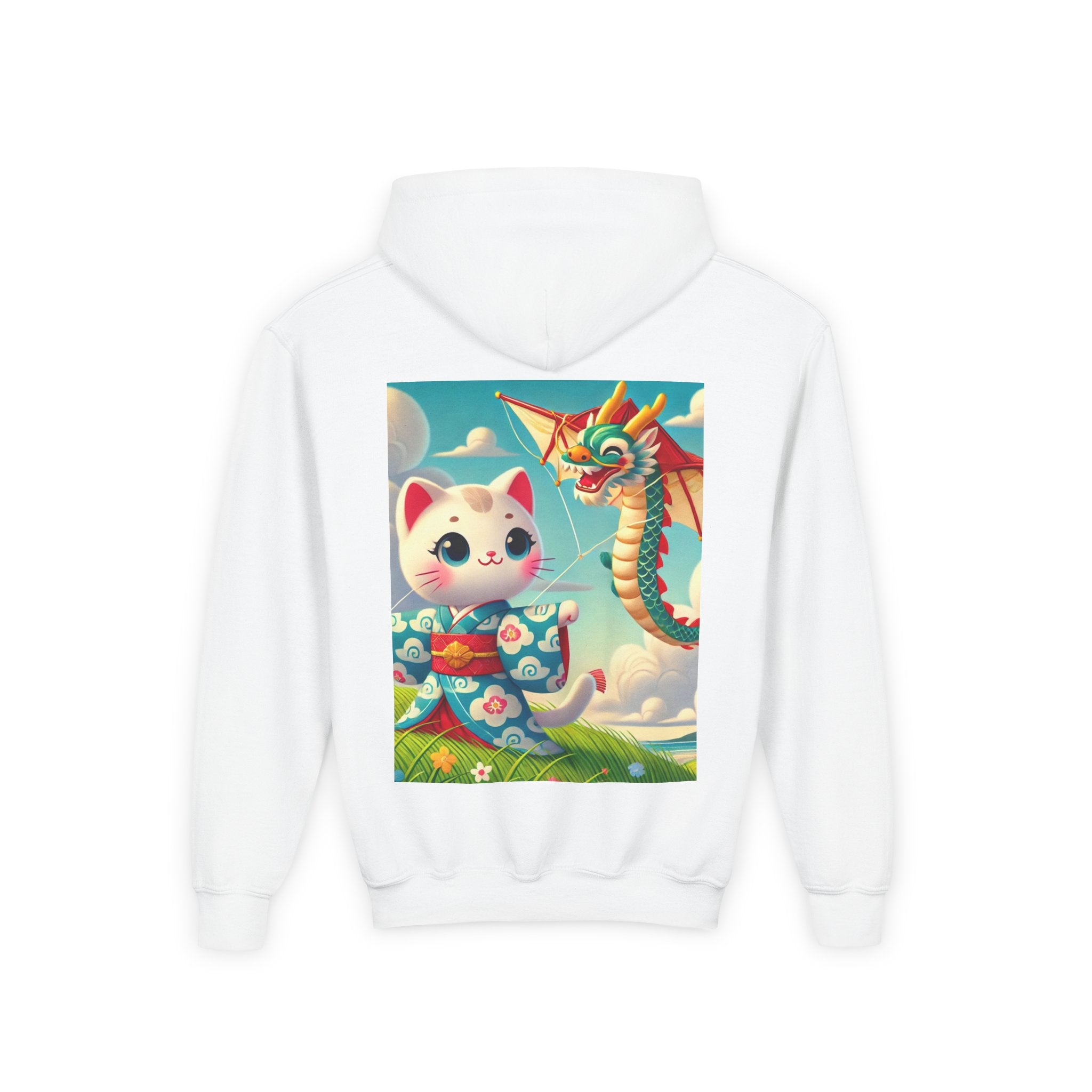 Geisha Kitten and the Dragon Kite Youth Heavy Blend Hooded Sweatshirt blends cozy comfort with whimsical artistry, perfect for kids who love bold, imaginative designs. Crafted from ultra-soft, preshrunk fleece, this hoodie offers warmth, durability, and reduced lint buildup. The balanced 50/50 cotton-polyester fabric ensures easy care, while the roomy kangaroo pocket and twill-reinforced neck add practical everyday comfort. Please note: due to fabric properties, the White color variant may appear slightly off-white.