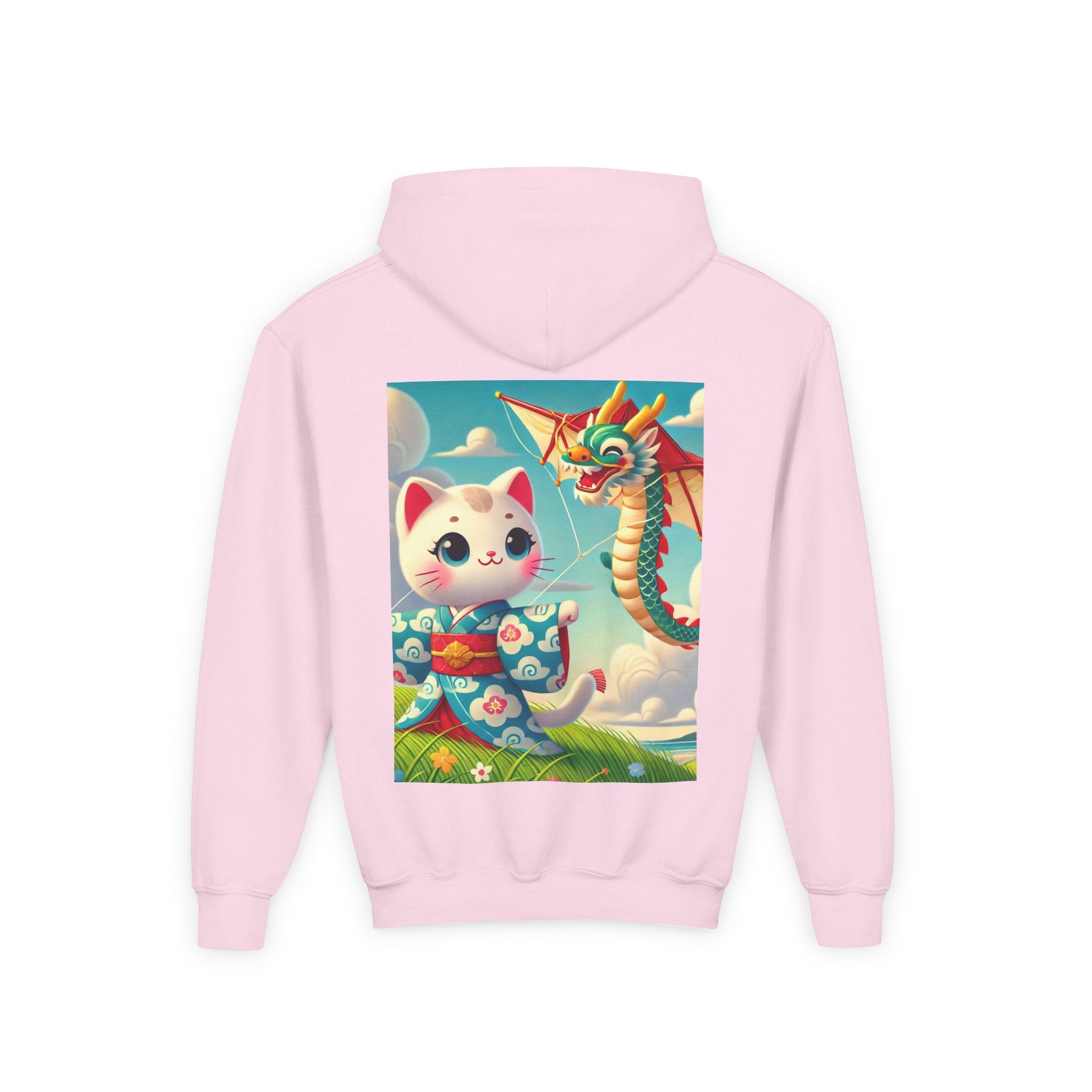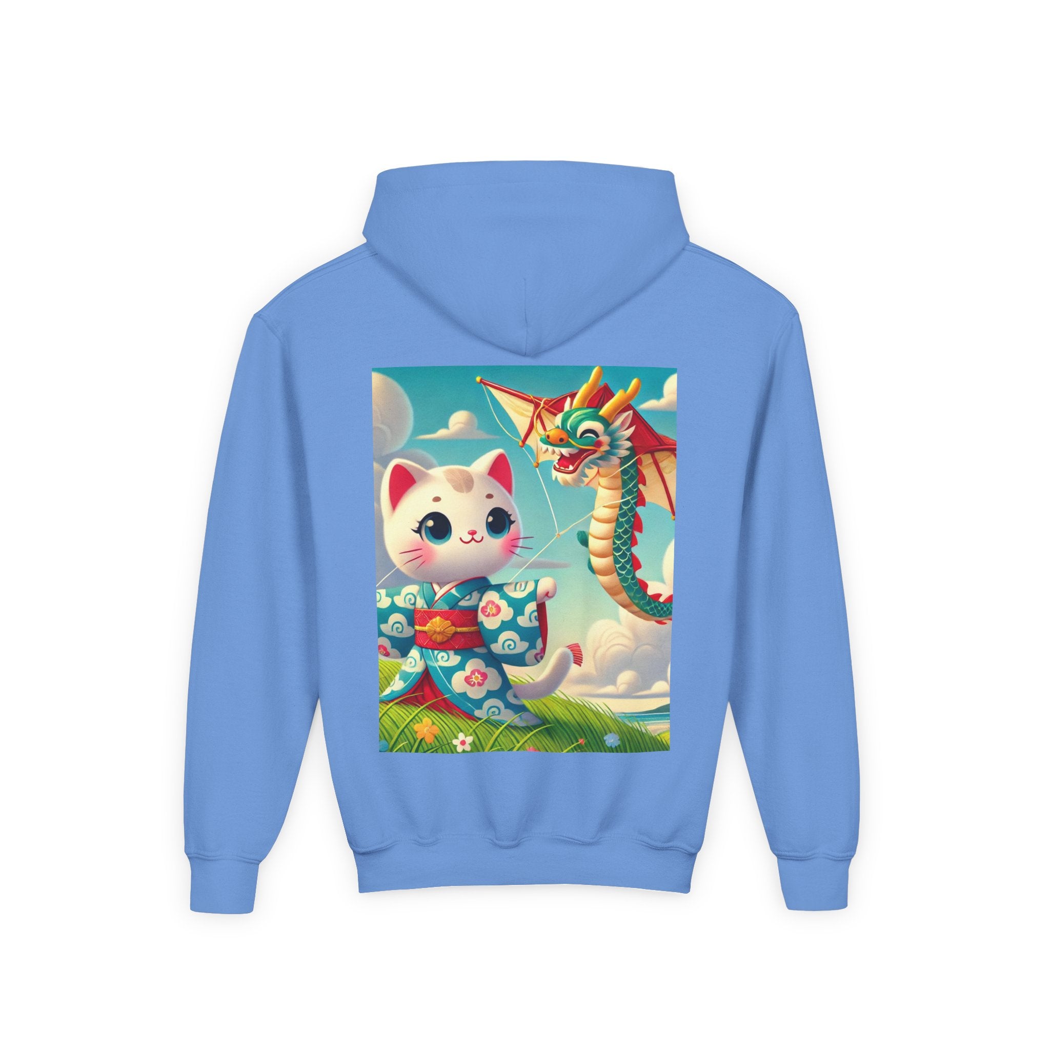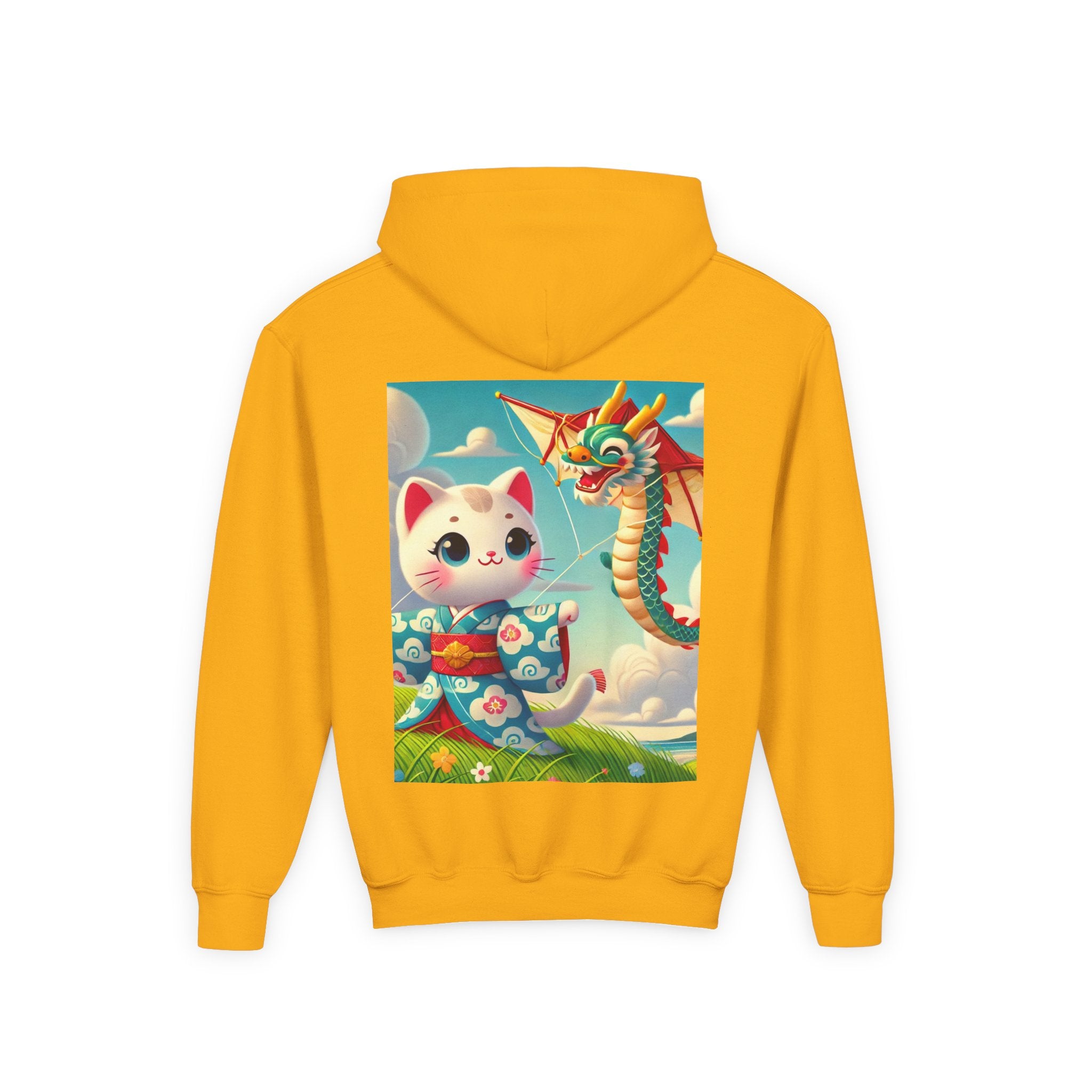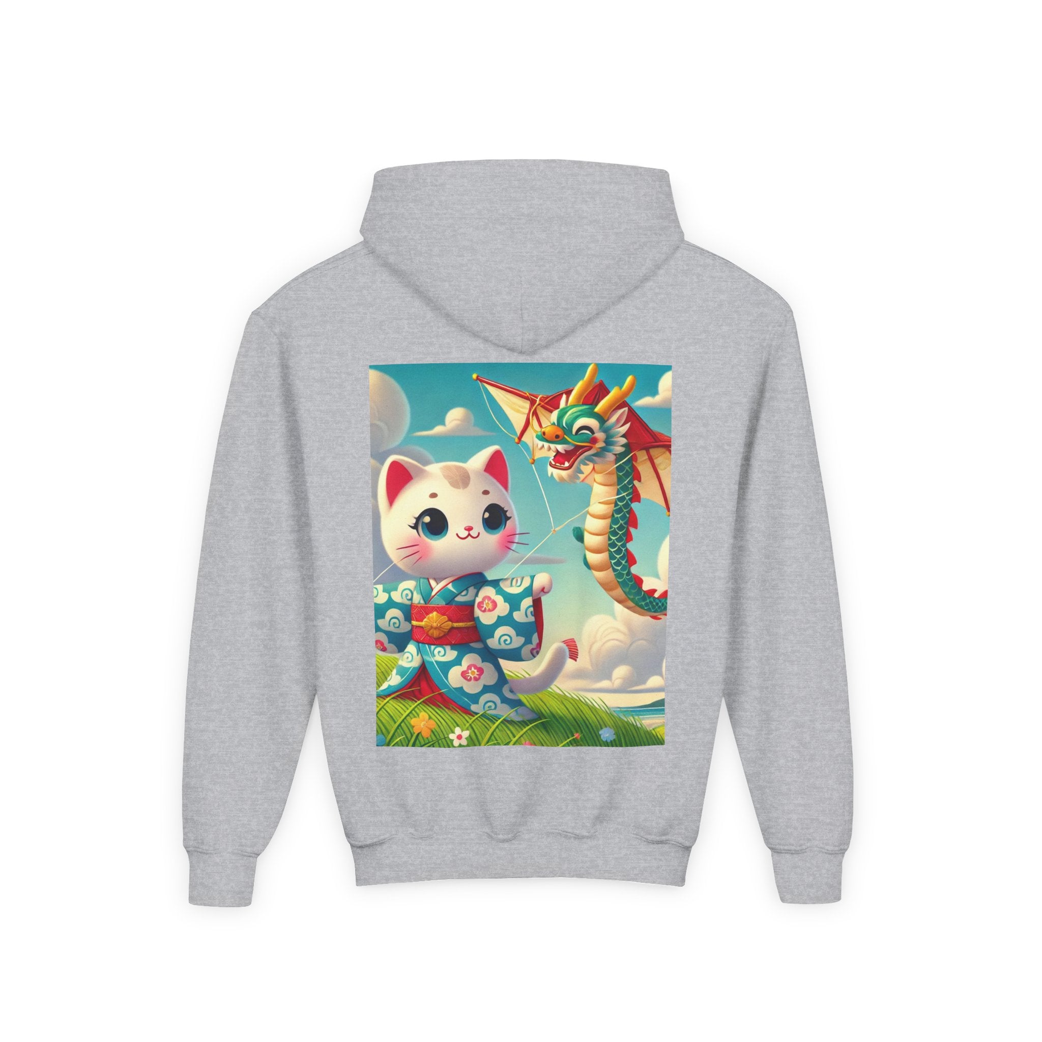 Geisha Kitten and the Dragon Kite Youth Heavy Blend Hooded Sweatshirt blends cozy comfort with whimsical artistry, perfect for kids who love bold, imaginative designs. Crafted from ultra-soft, preshrunk fleece, this hoodie offers warmth, durability, and reduced lint buildup. The balanced 50/50 cotton-polyester fabric ensures easy care, while the roomy kangaroo pocket and twill-reinforced neck add practical everyday comfort. Please note: due to fabric properties, the White color variant may appear slightly off-white.