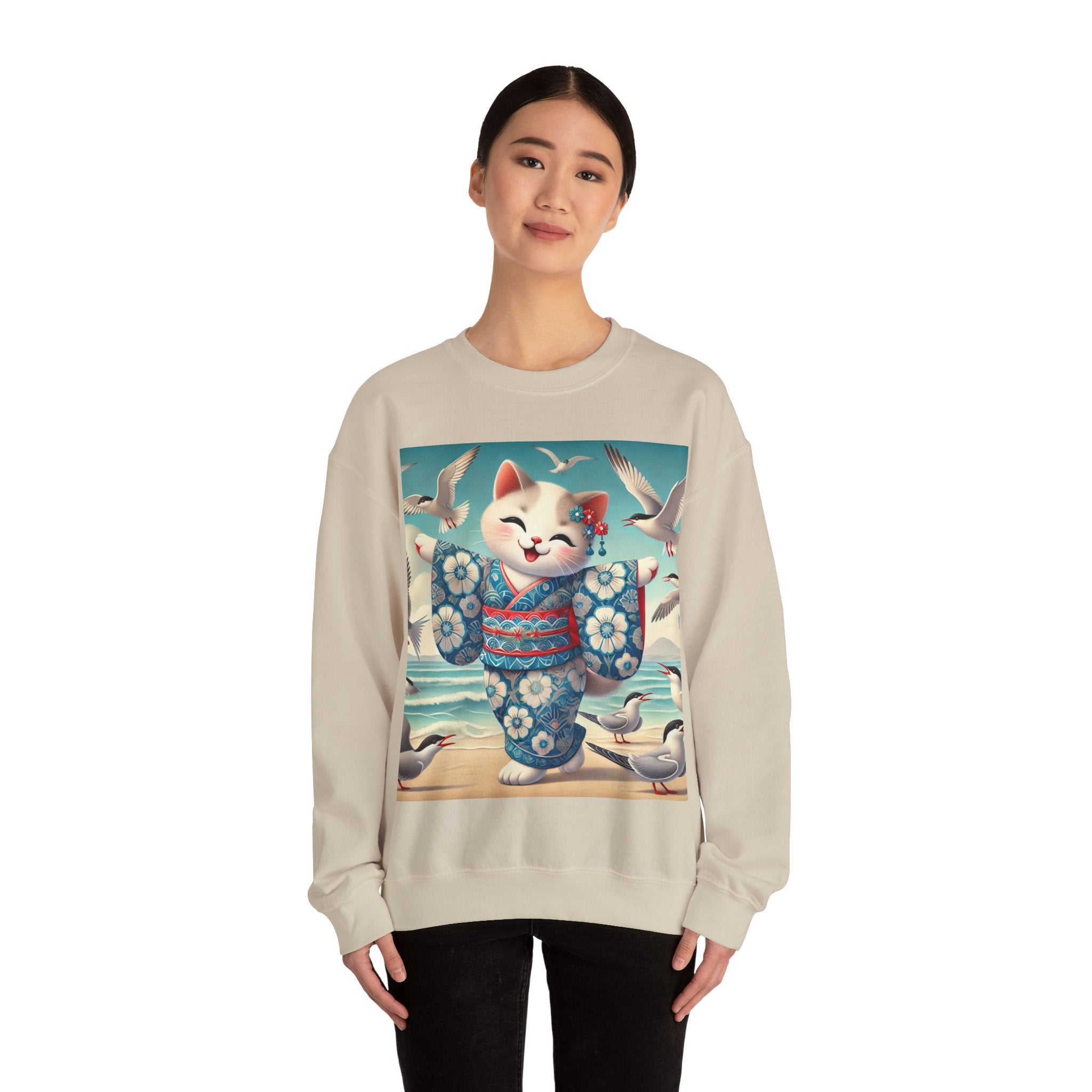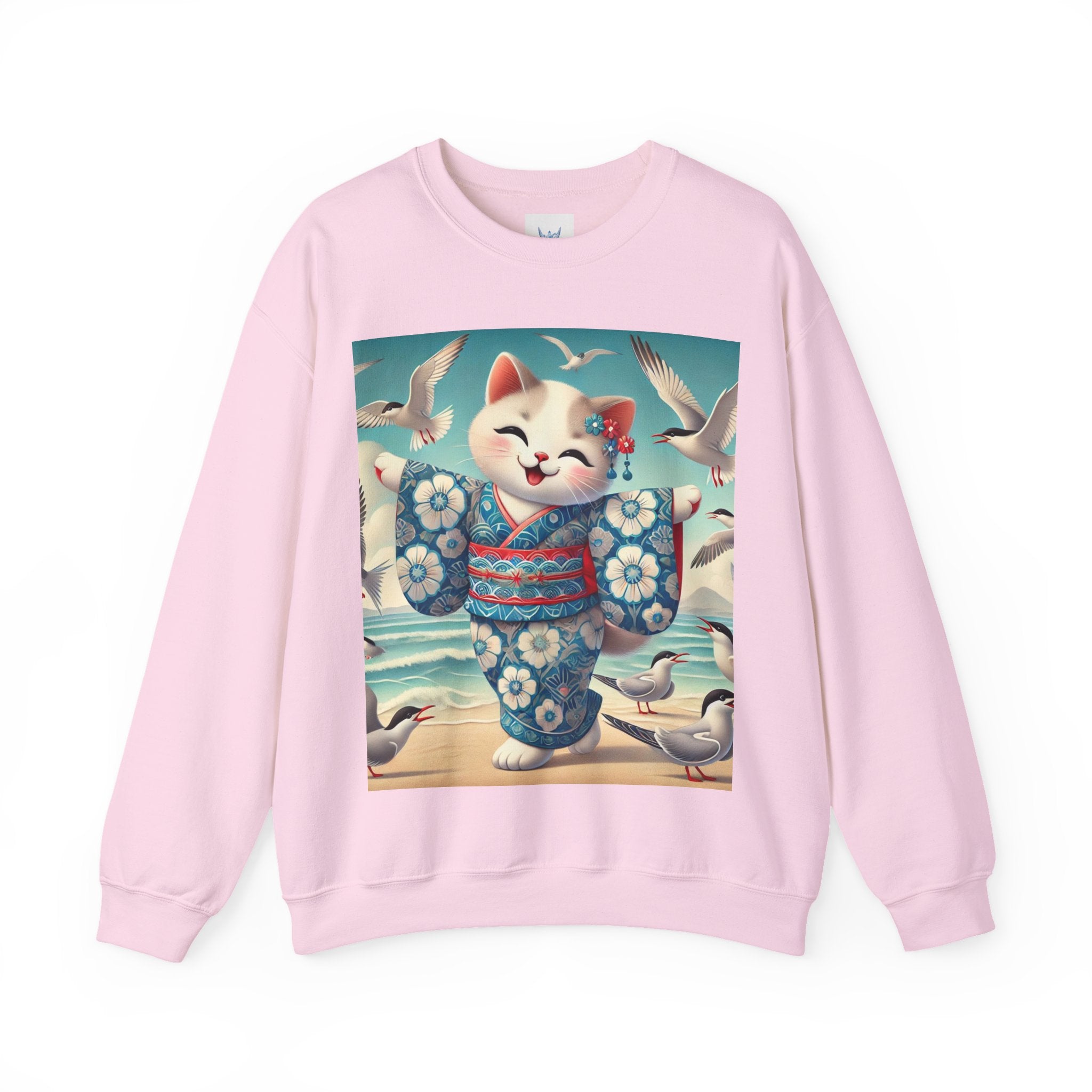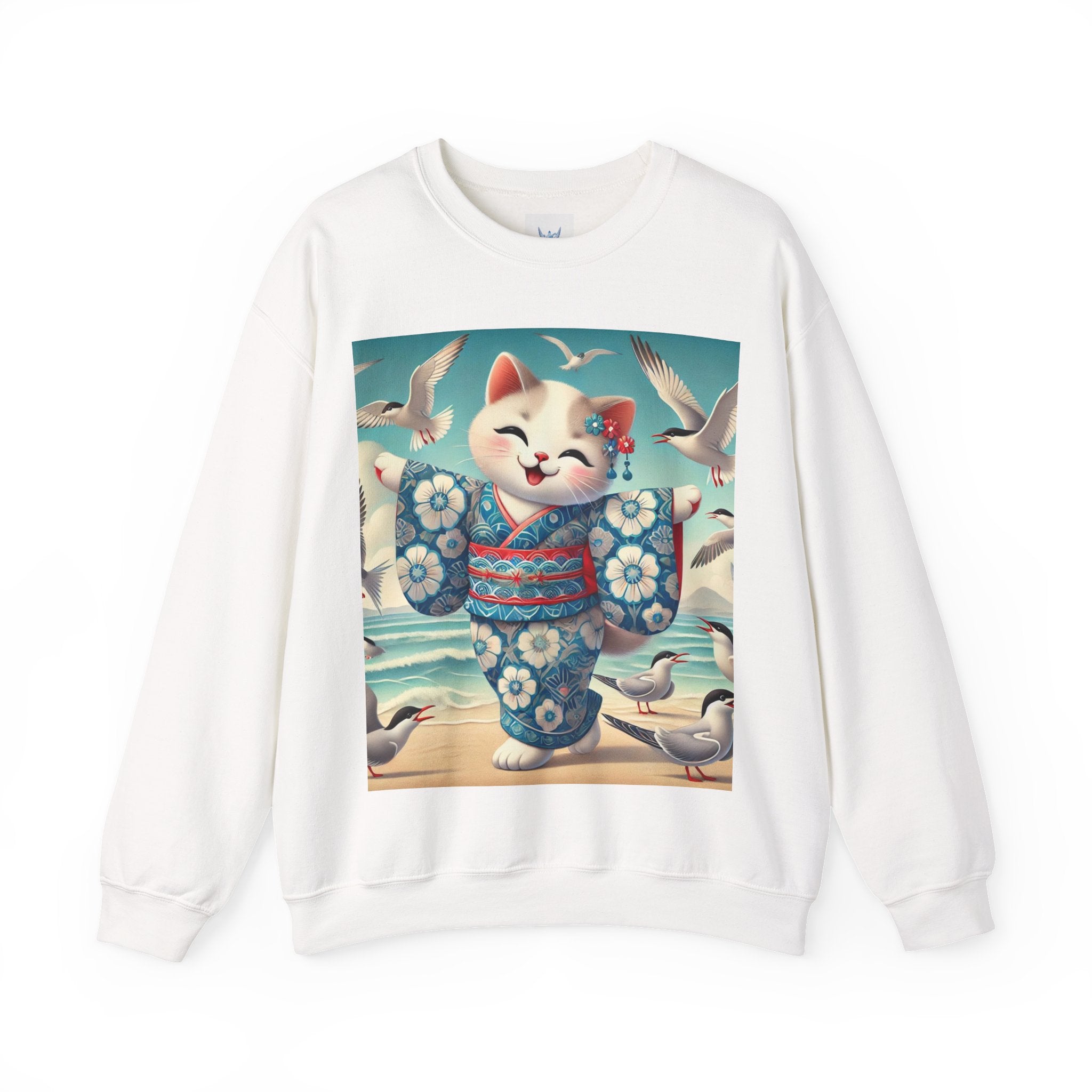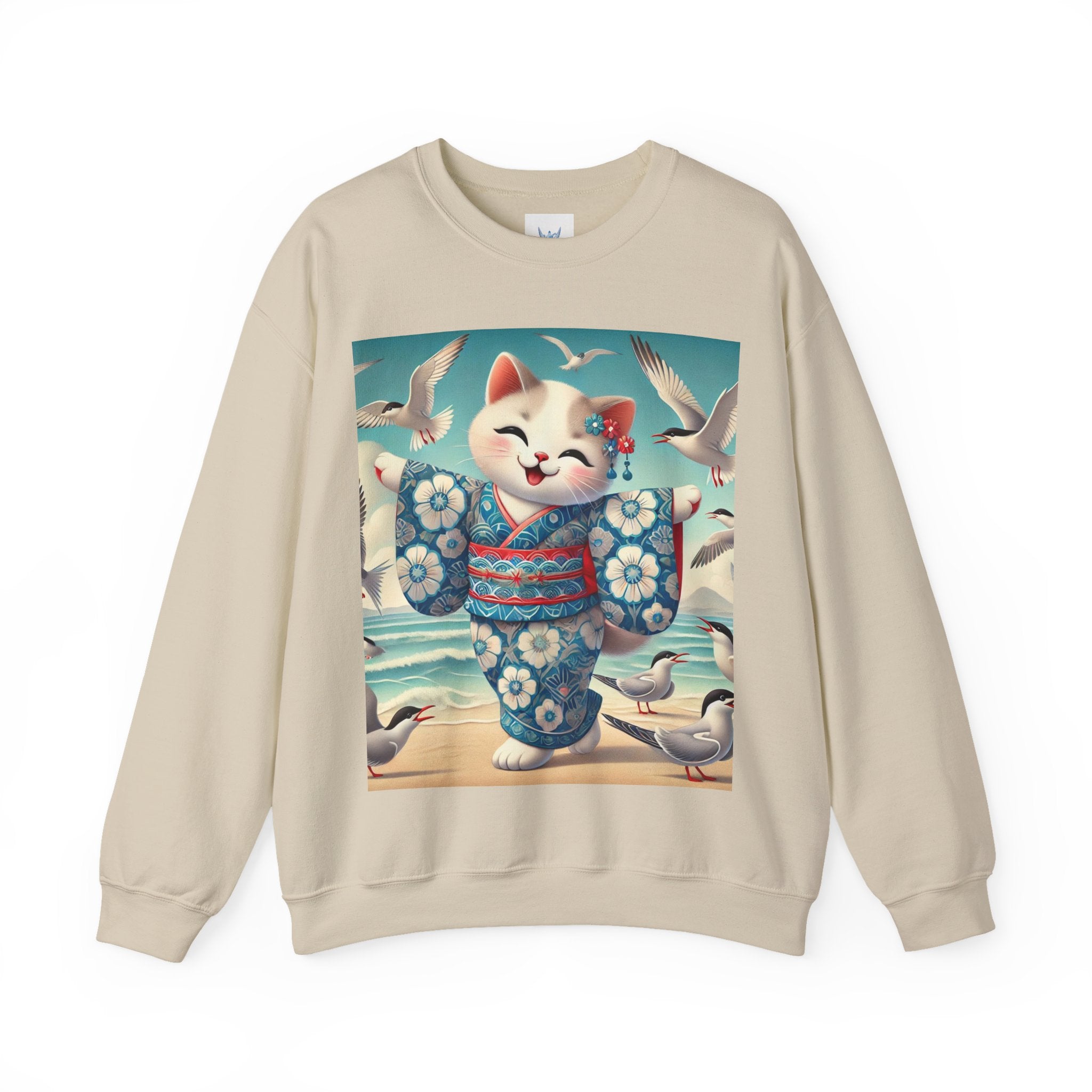 The sweatshirt features whimsical artwork of a lighthearted geisha kitten standing joyfully on a serene beach. Her beautifully patterned kimono flows with the ocean breeze as lively seagulls swoop and glide around her, the shoreline stretching into a soft horizon. The scene blends Japanese-inspired elegance with playful seaside charm, inviting a sense of wonder and gentle adventure.
