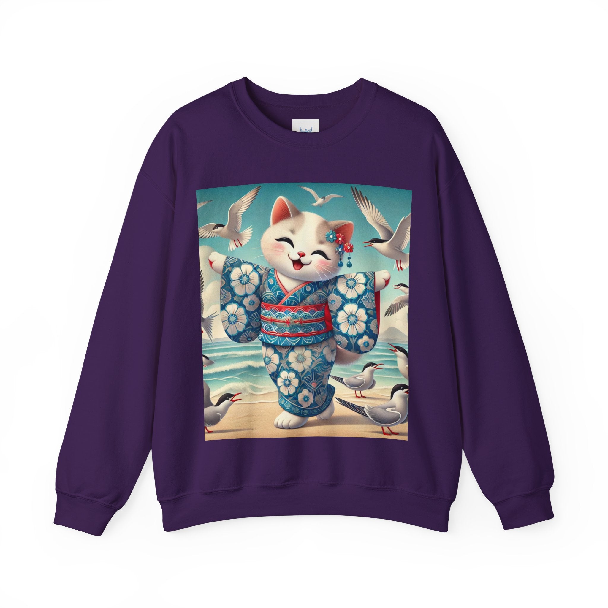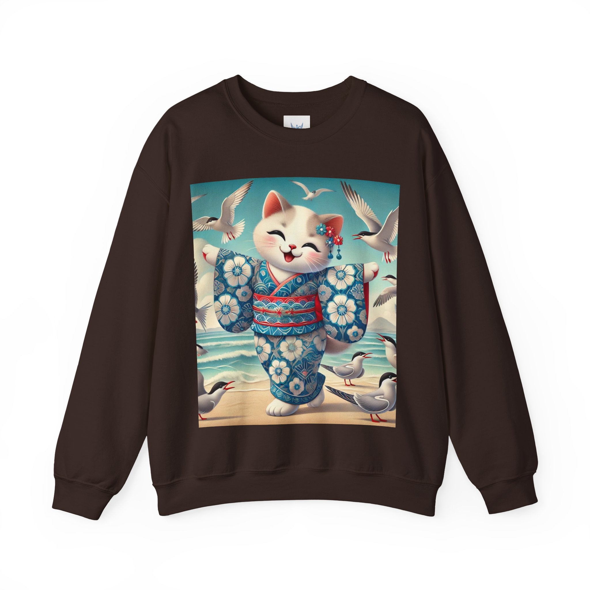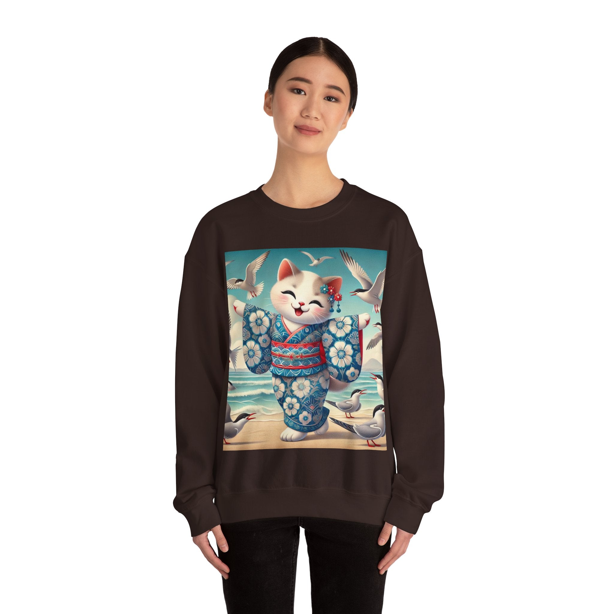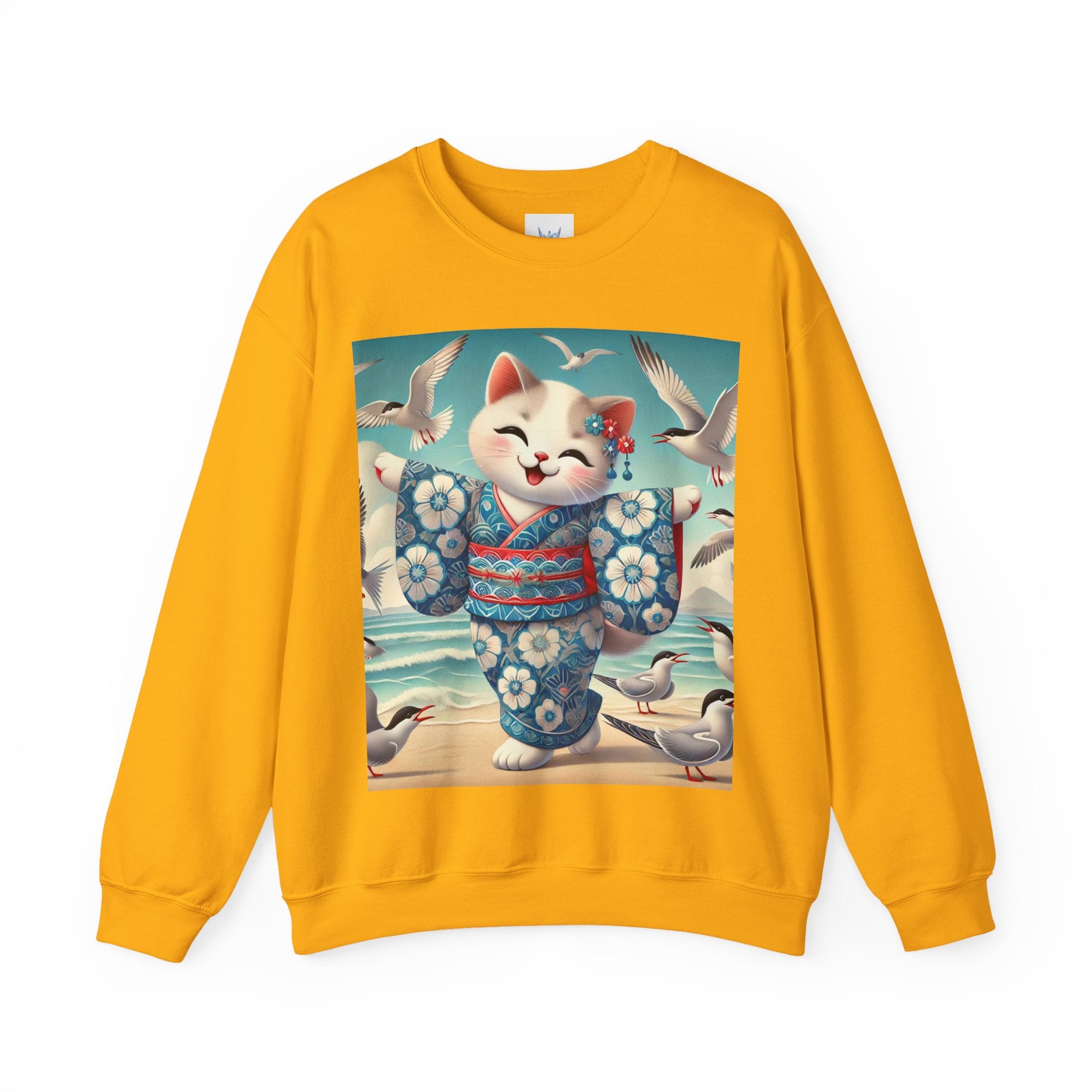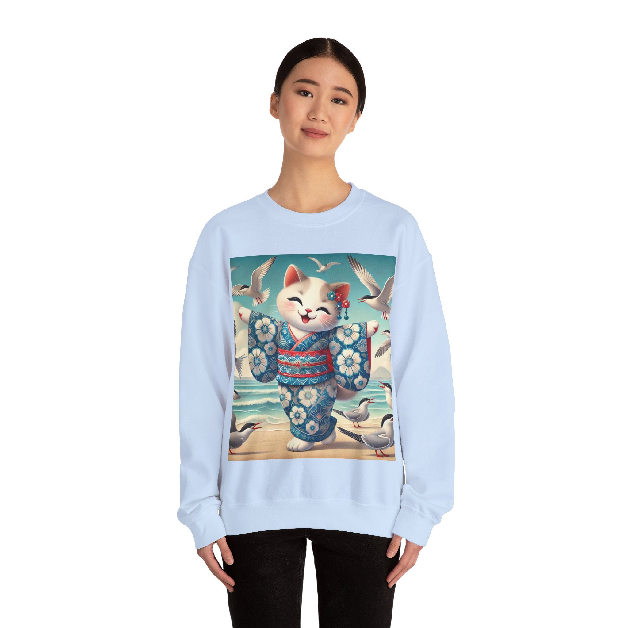 The sweatshirt features whimsical artwork of a lighthearted geisha kitten standing joyfully on a serene beach. Her beautifully patterned kimono flows with the ocean breeze as lively seagulls swoop and glide around her, the shoreline stretching into a soft horizon. The scene blends Japanese-inspired elegance with playful seaside charm, inviting a sense of wonder and gentle adventure.