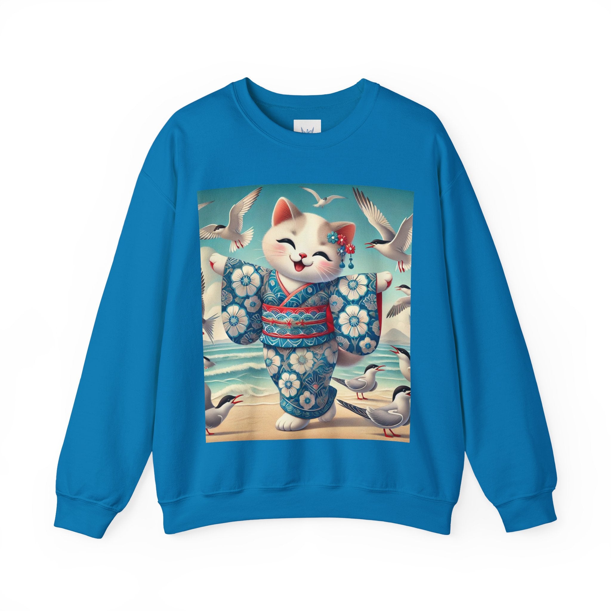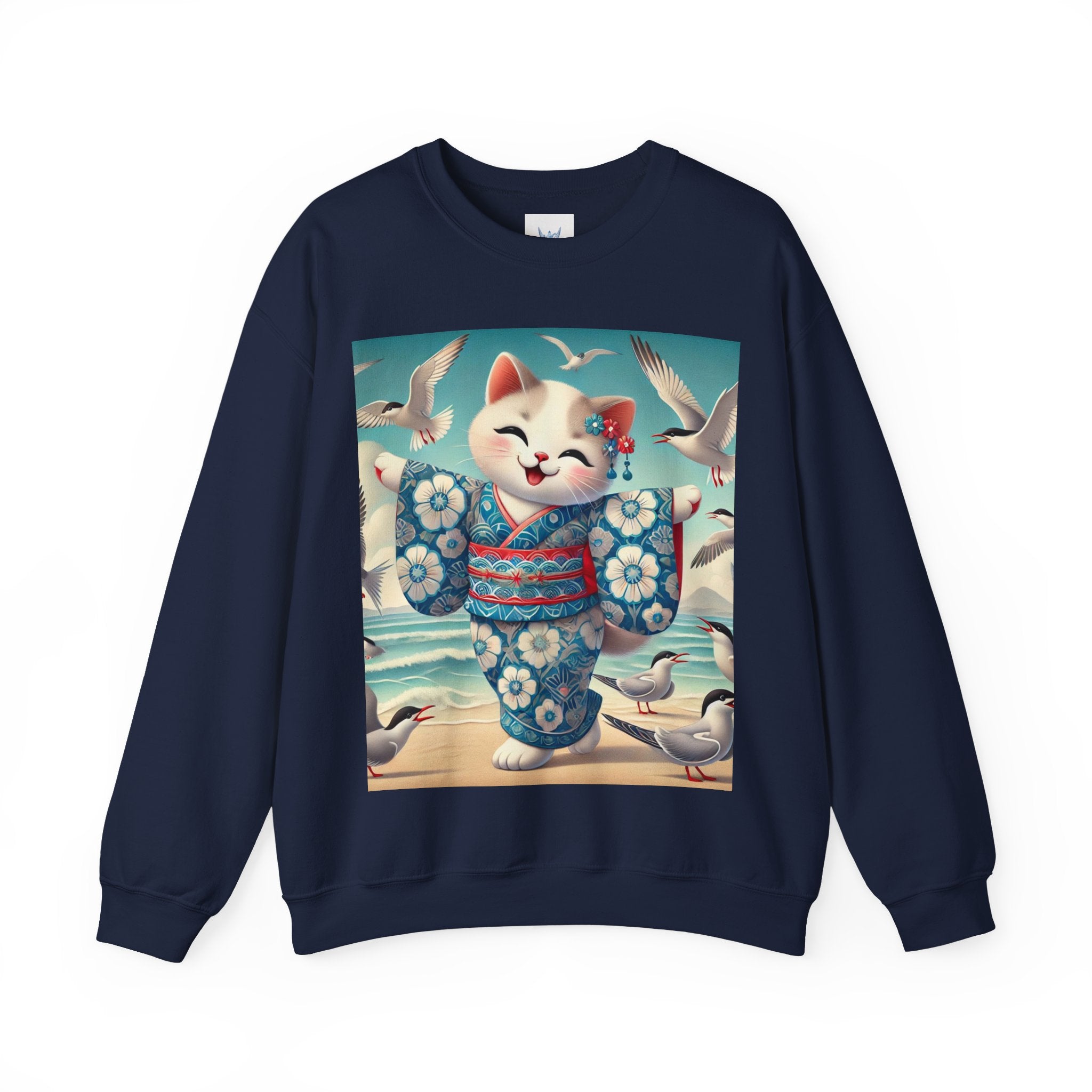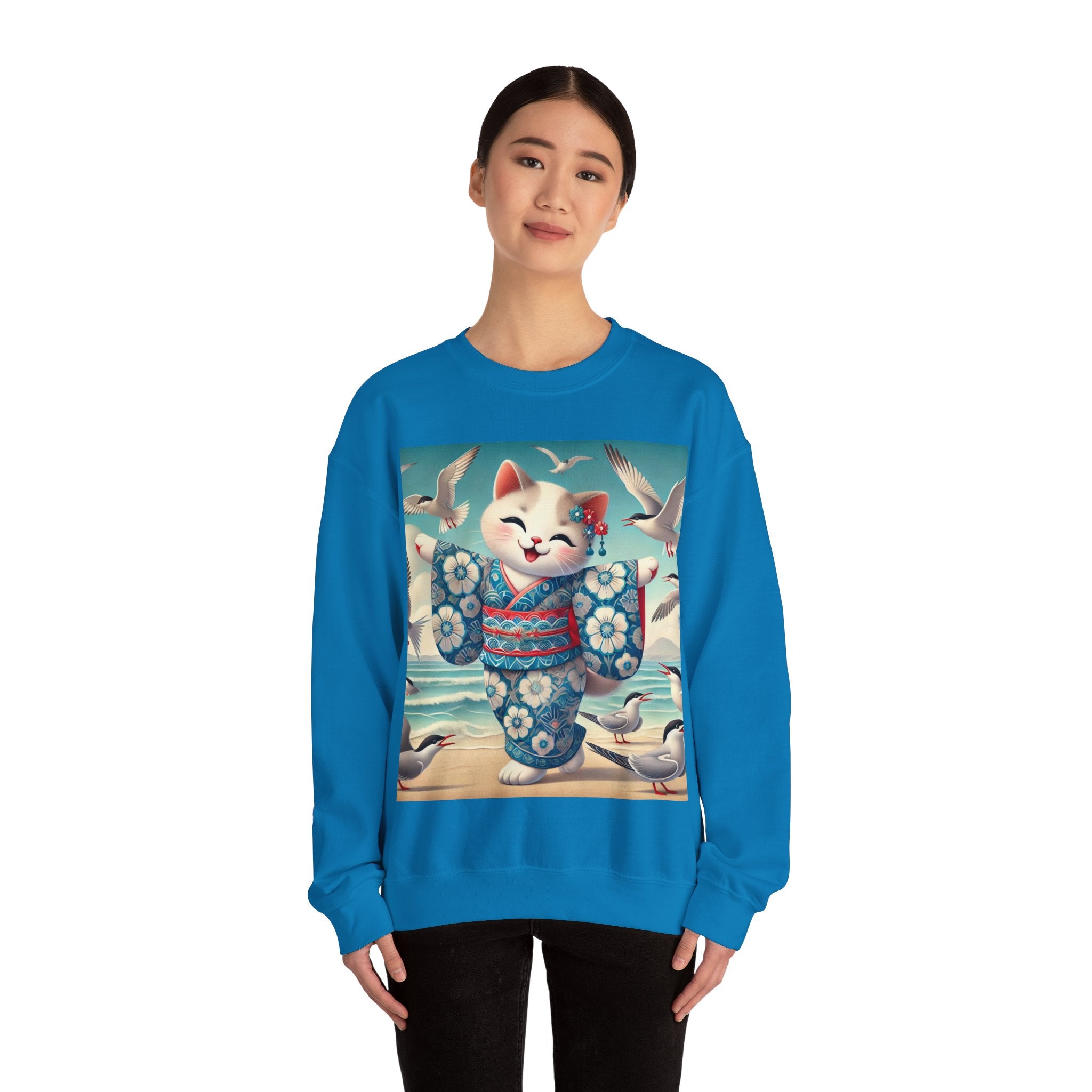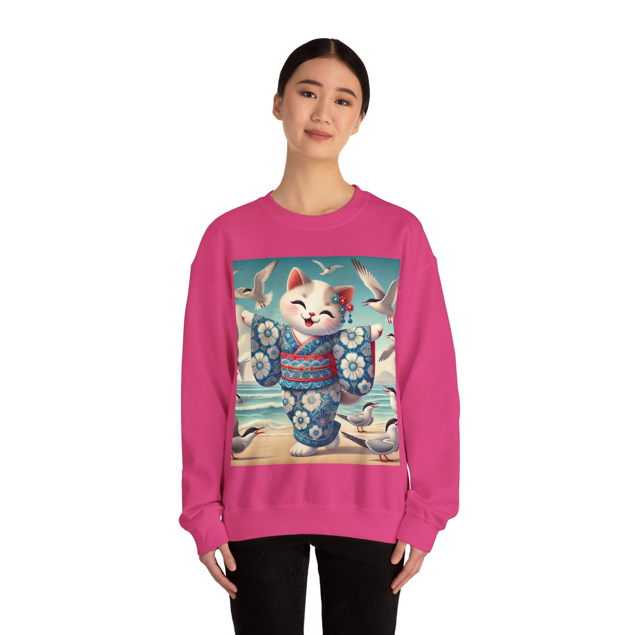 The sweatshirt features whimsical artwork of a lighthearted geisha kitten standing joyfully on a serene beach. Her beautifully patterned kimono flows with the ocean breeze as lively seagulls swoop and glide around her, the shoreline stretching into a soft horizon. The scene blends Japanese-inspired elegance with playful seaside charm, inviting a sense of wonder and gentle adventure.