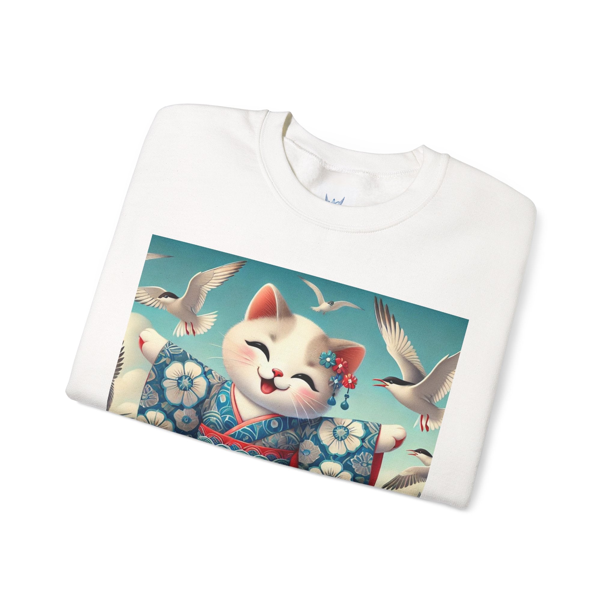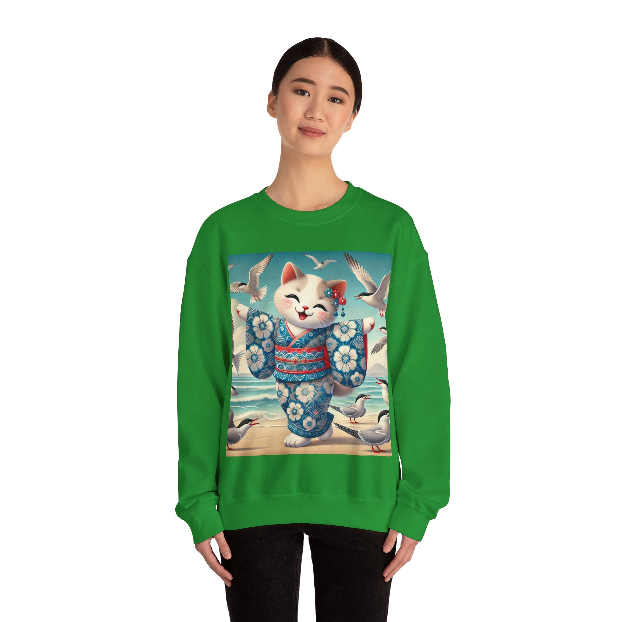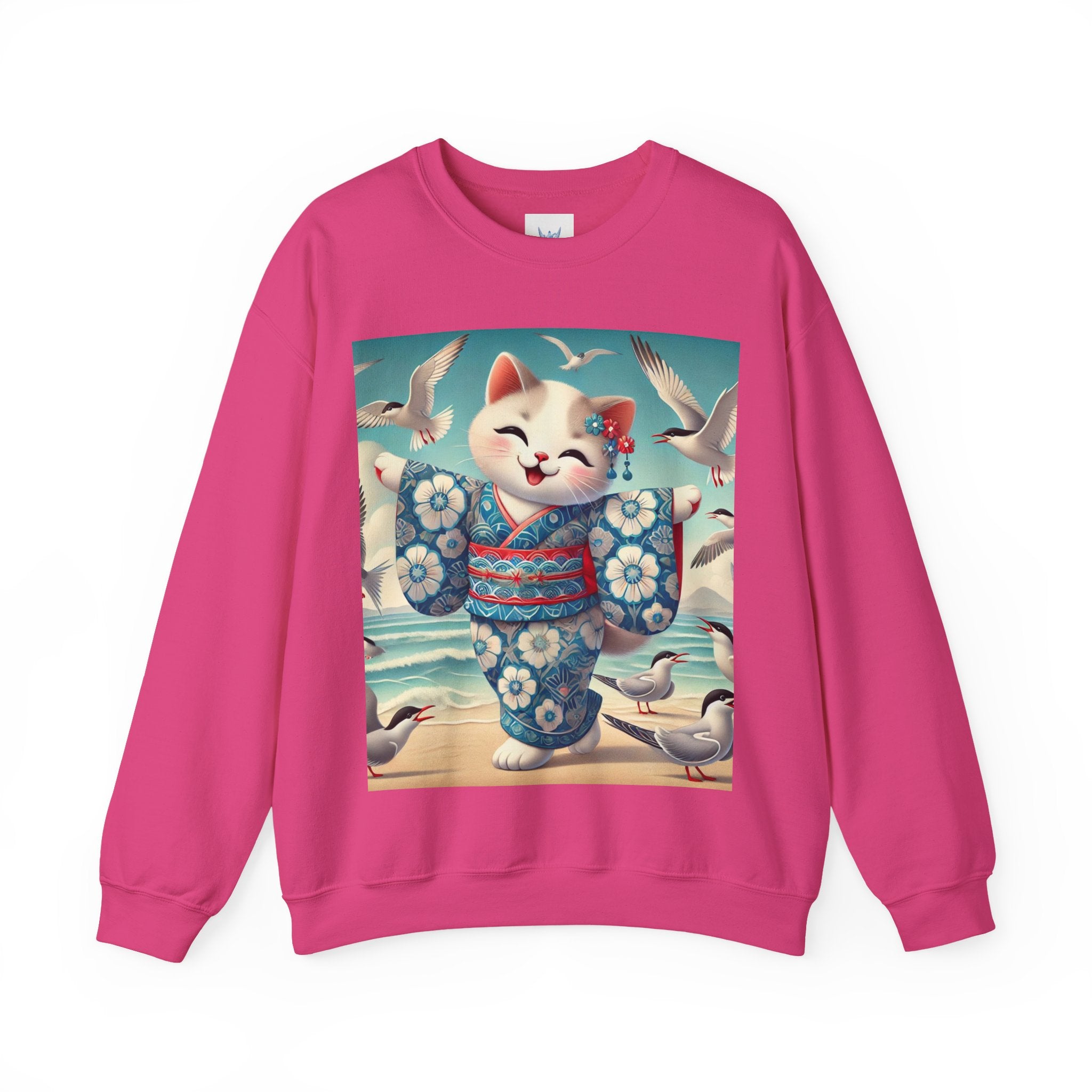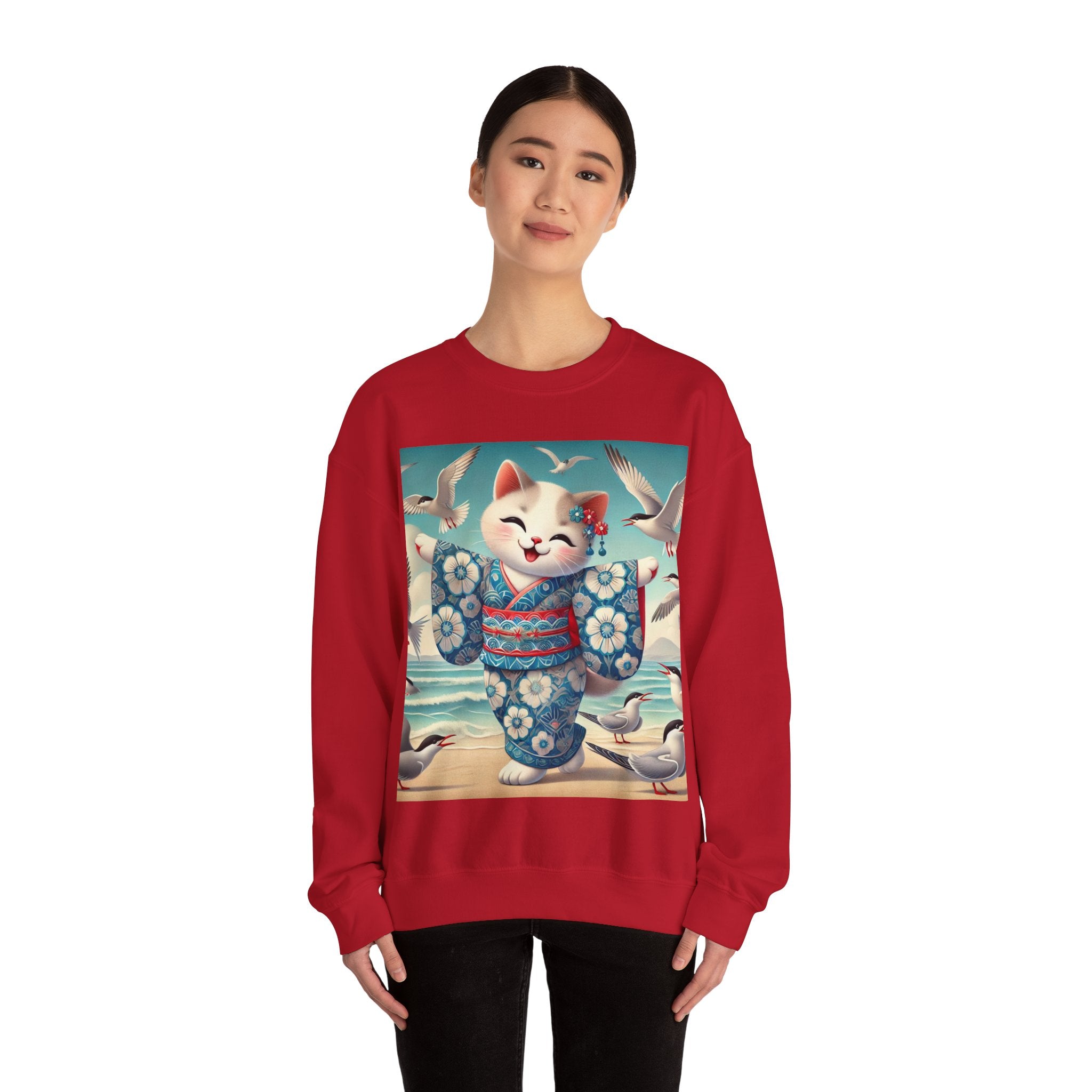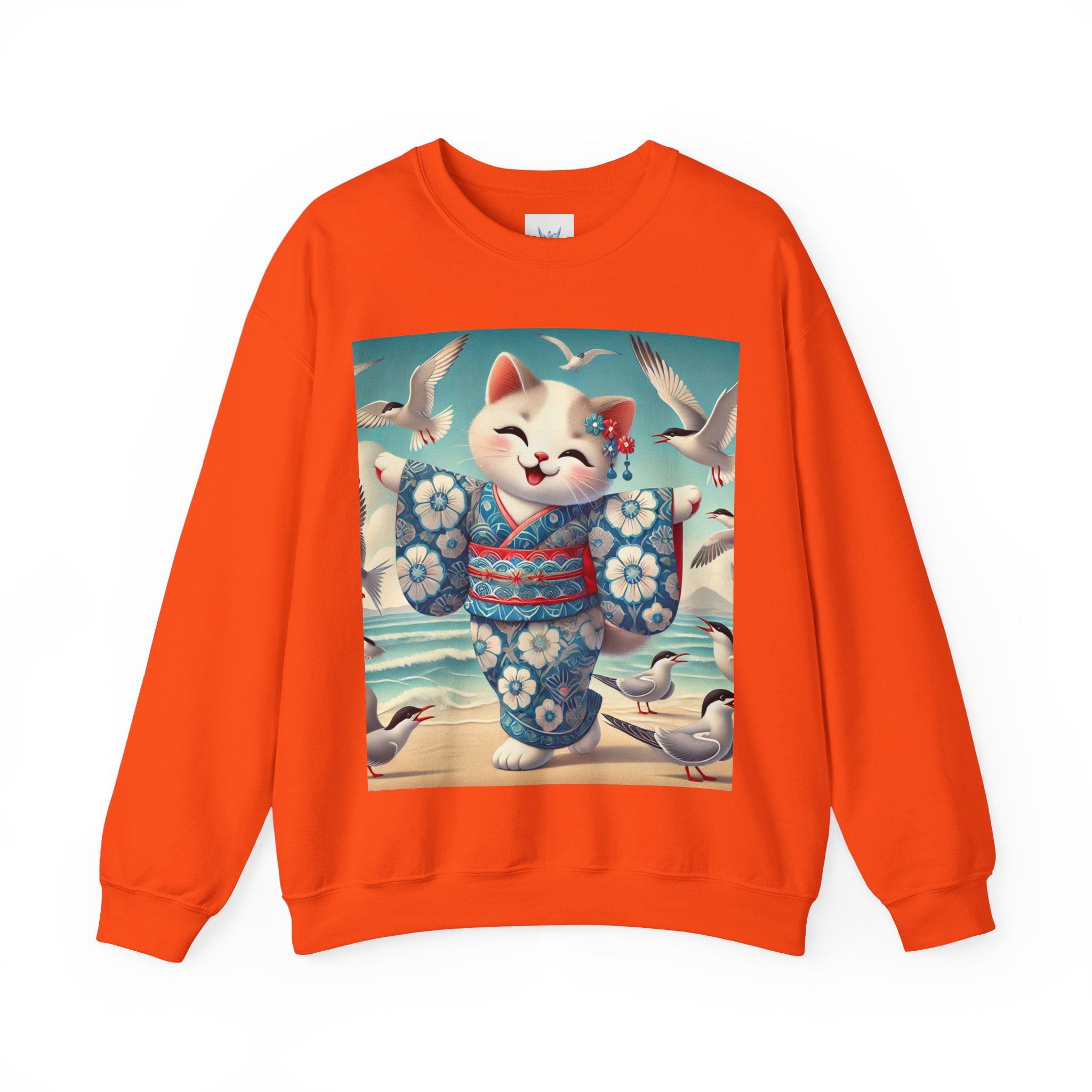 The sweatshirt features whimsical artwork of a lighthearted geisha kitten standing joyfully on a serene beach. Her beautifully patterned kimono flows with the ocean breeze as lively seagulls swoop and glide around her, the shoreline stretching into a soft horizon. The scene blends Japanese-inspired elegance with playful seaside charm, inviting a sense of wonder and gentle adventure.