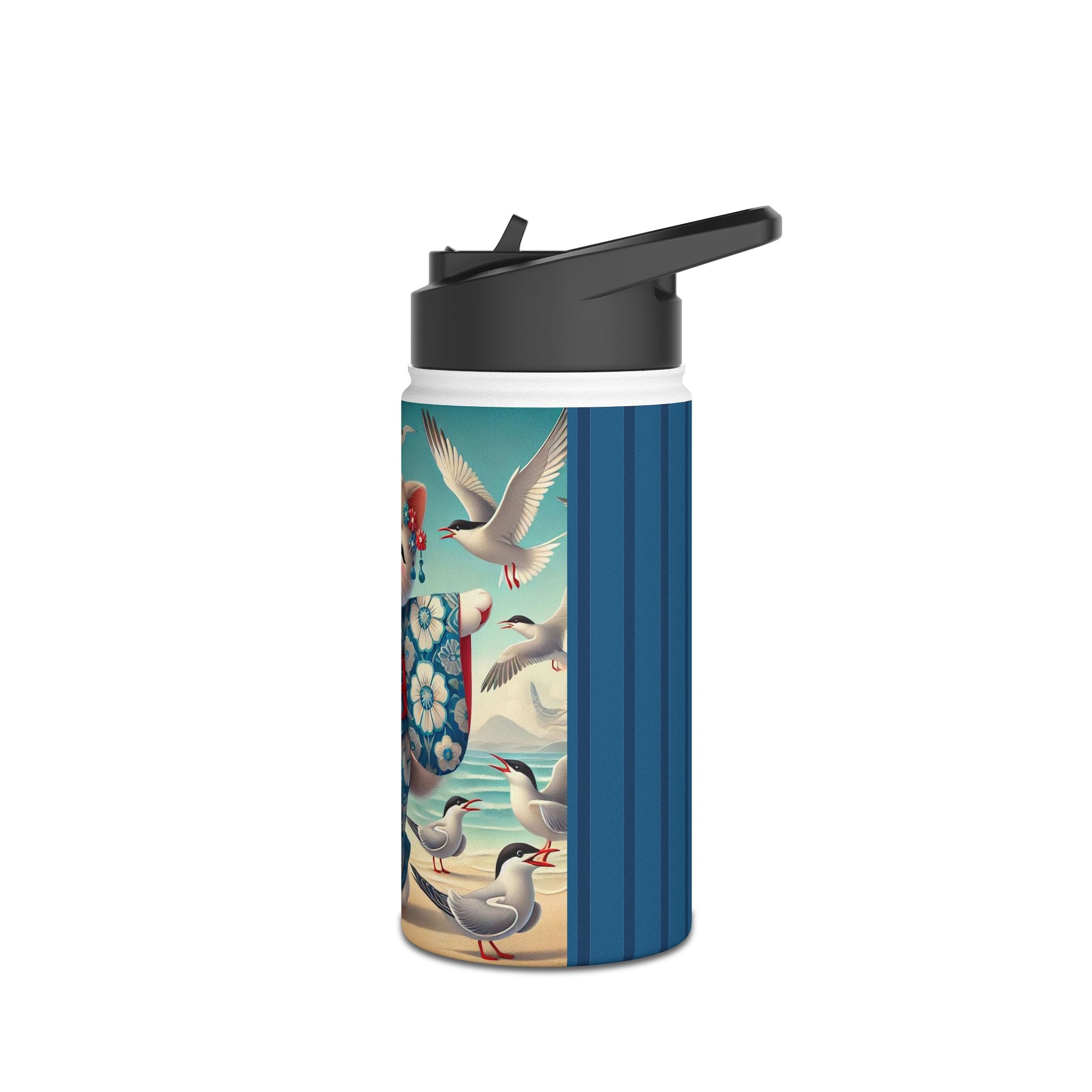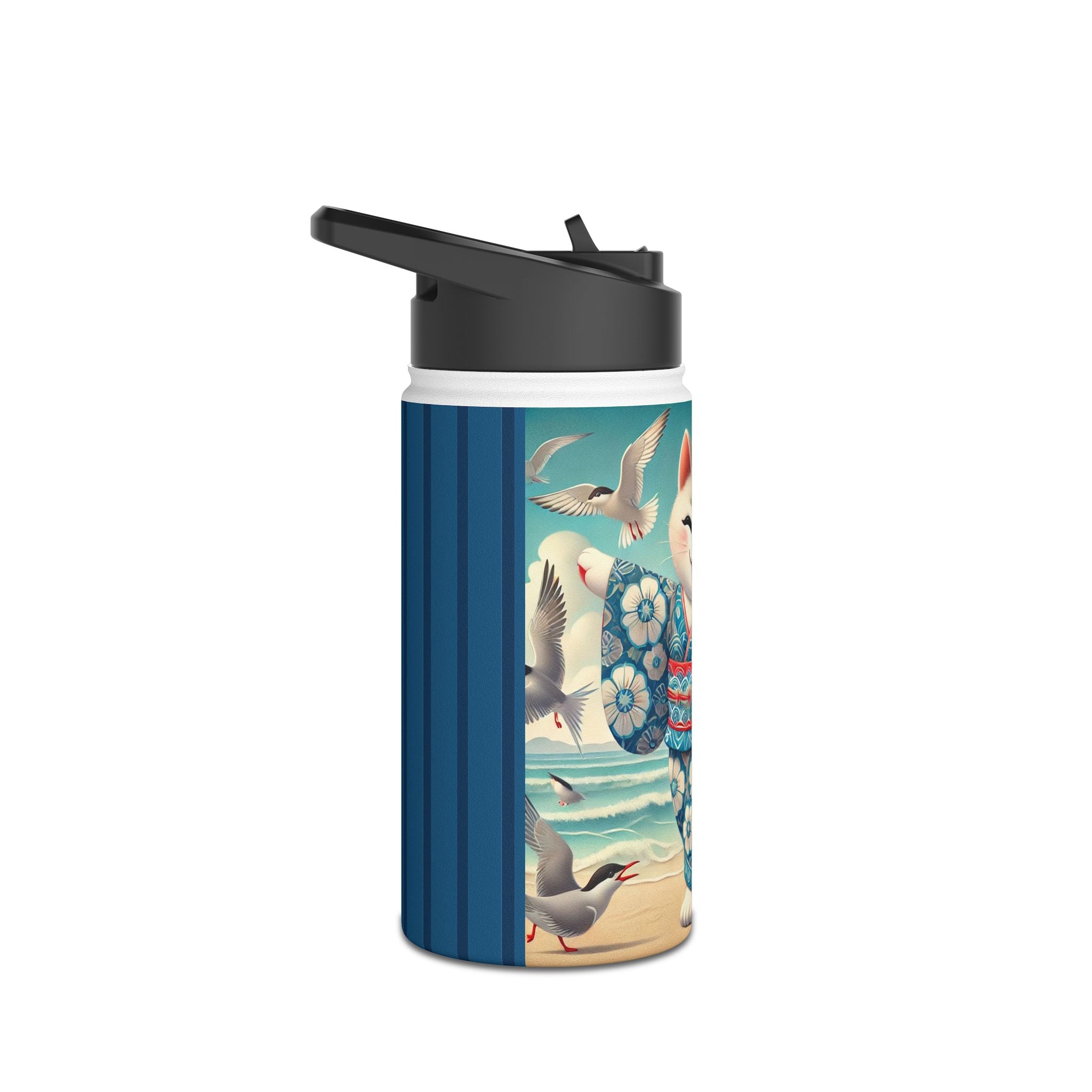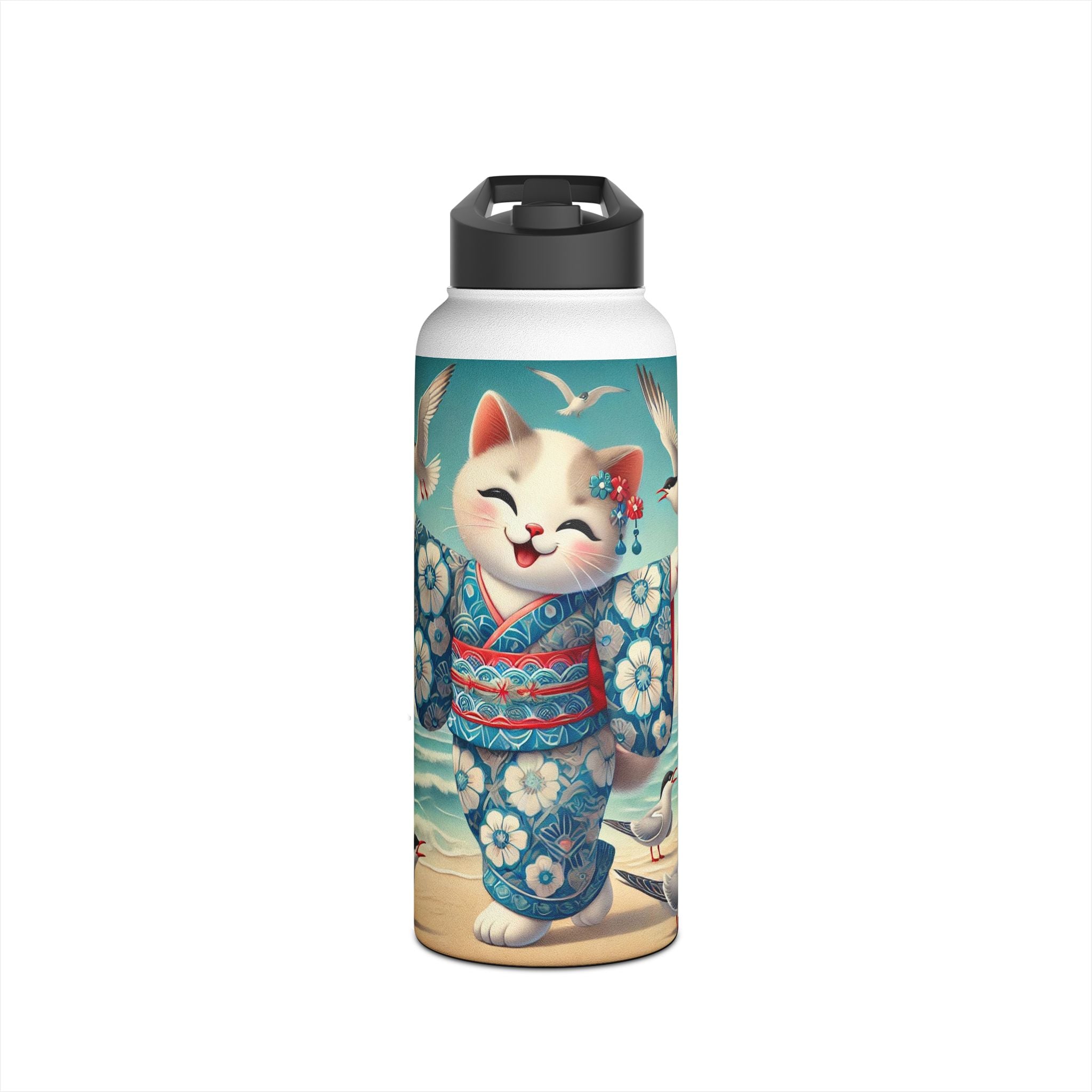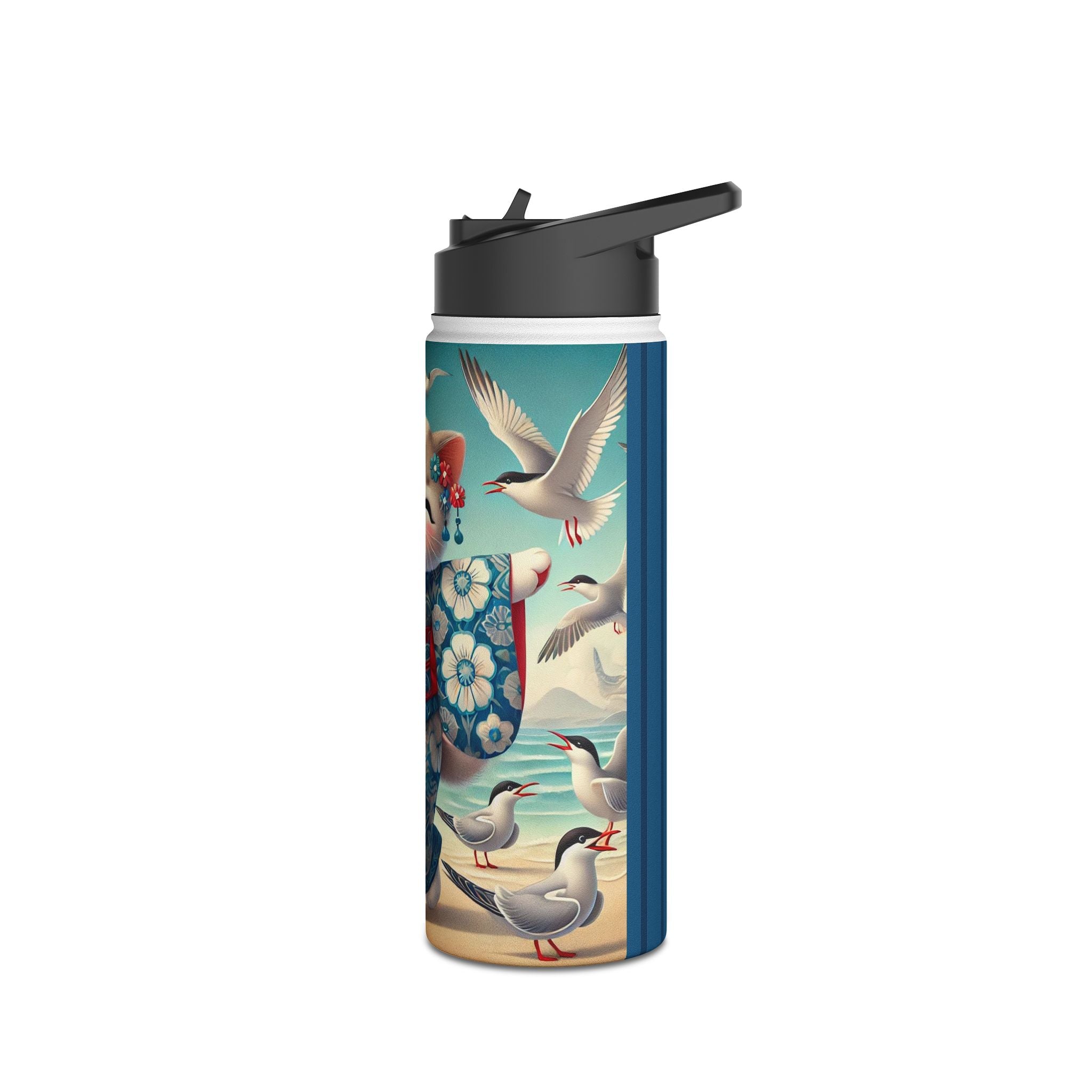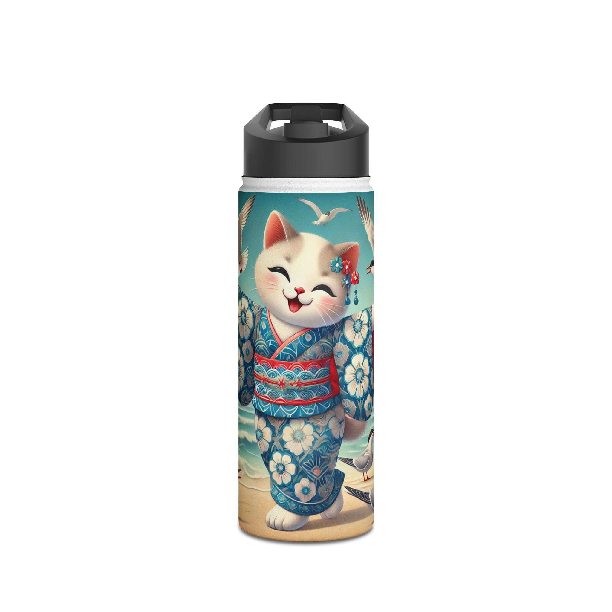 Geisha Kitten by the Seaside Stainless Steel Water Bottle, Standard Lid brings a touch of whimsy and calm to your daily adventures. Crafted from durable double-wall stainless steel, this BPA-free bottle keeps your drinks frosty for 24 hours and soothingly hot for 12. Available in three convenient sizes (12oz, 18oz, 32oz) with a secure twist-on lid, it’s the perfect blend of functionality and artistic charm—ideal for work, travel, or leisure.
