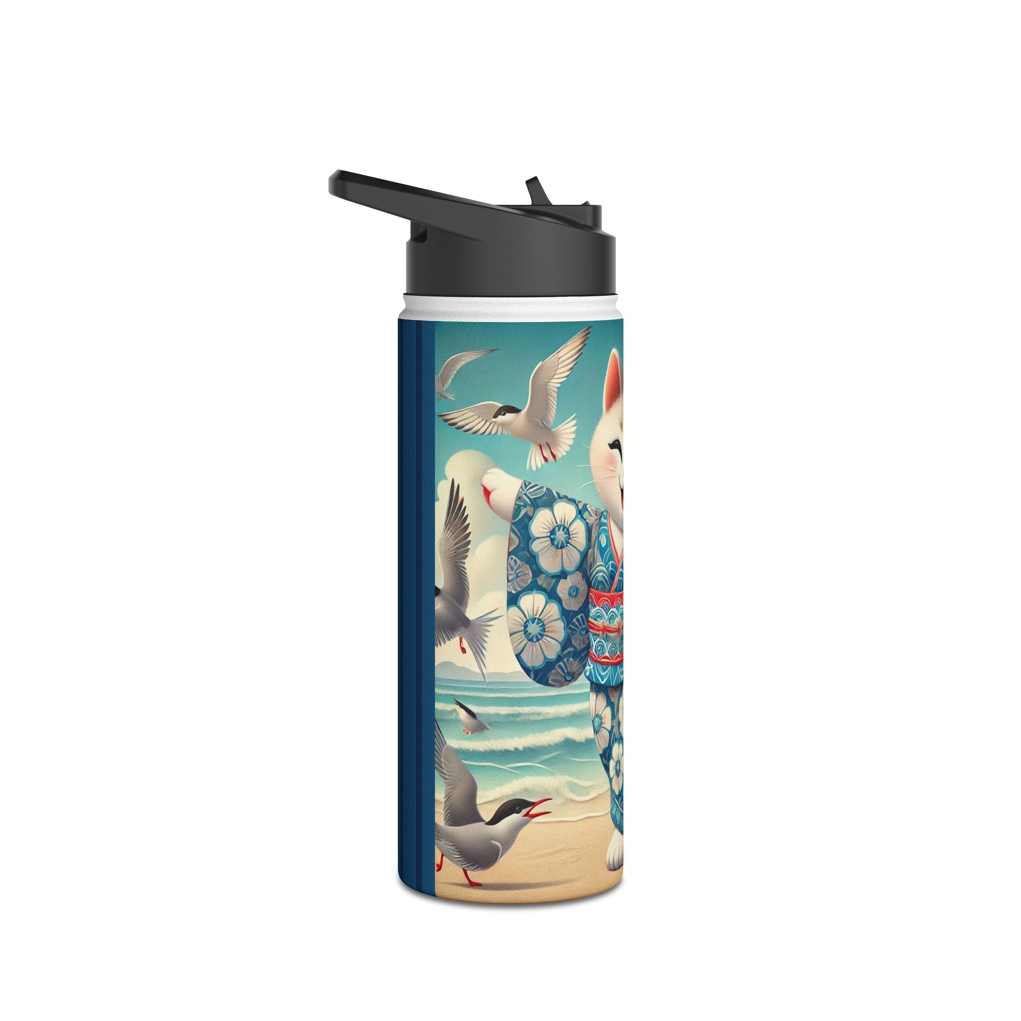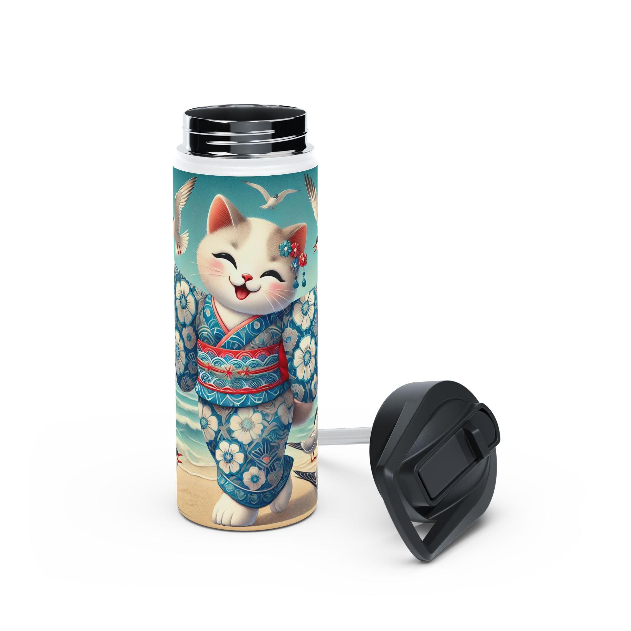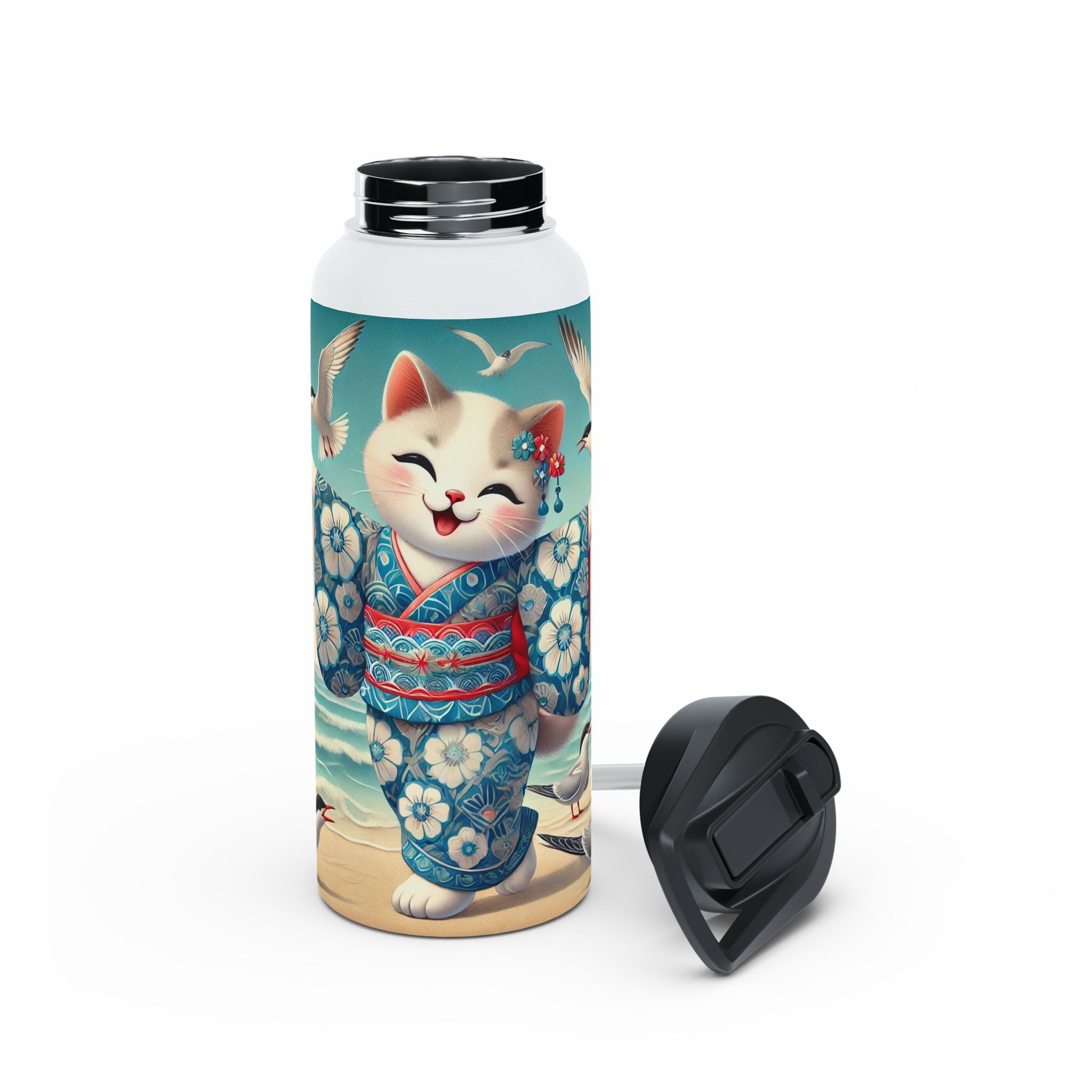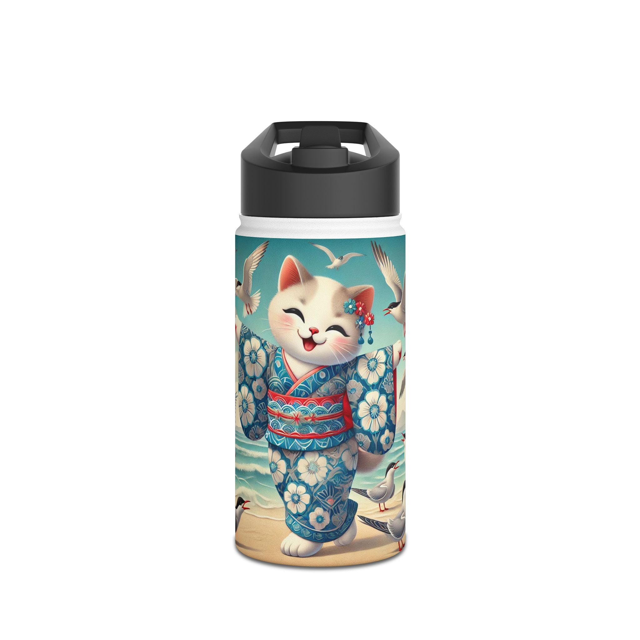 Geisha Kitten by the Seaside Stainless Steel Water Bottle, Standard Lid brings a touch of whimsy and calm to your daily adventures. Crafted from durable double-wall stainless steel, this BPA-free bottle keeps your drinks frosty for 24 hours and soothingly hot for 12. Available in three convenient sizes (12oz, 18oz, 32oz) with a secure twist-on lid, it’s the perfect blend of functionality and artistic charm—ideal for work, travel, or leisure.