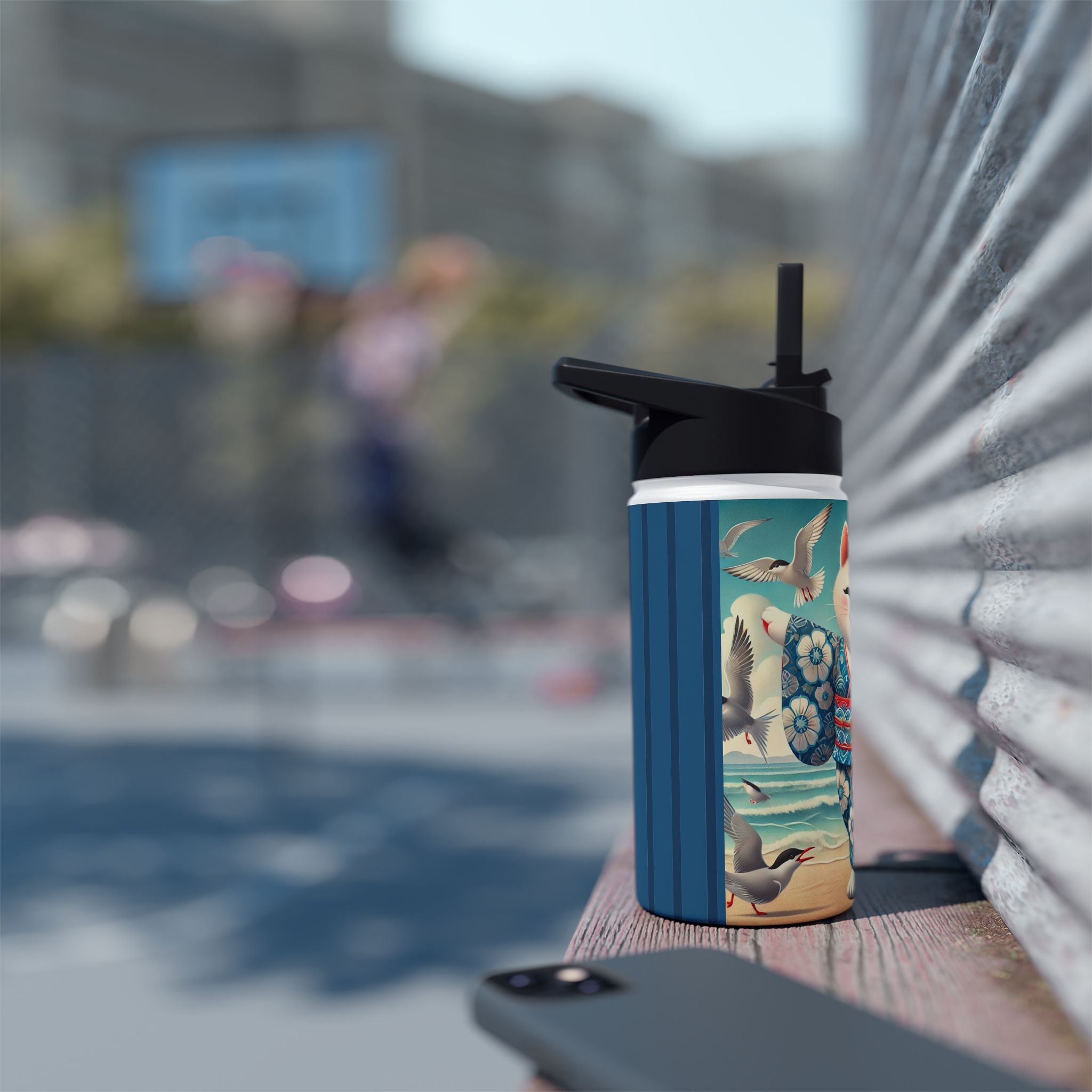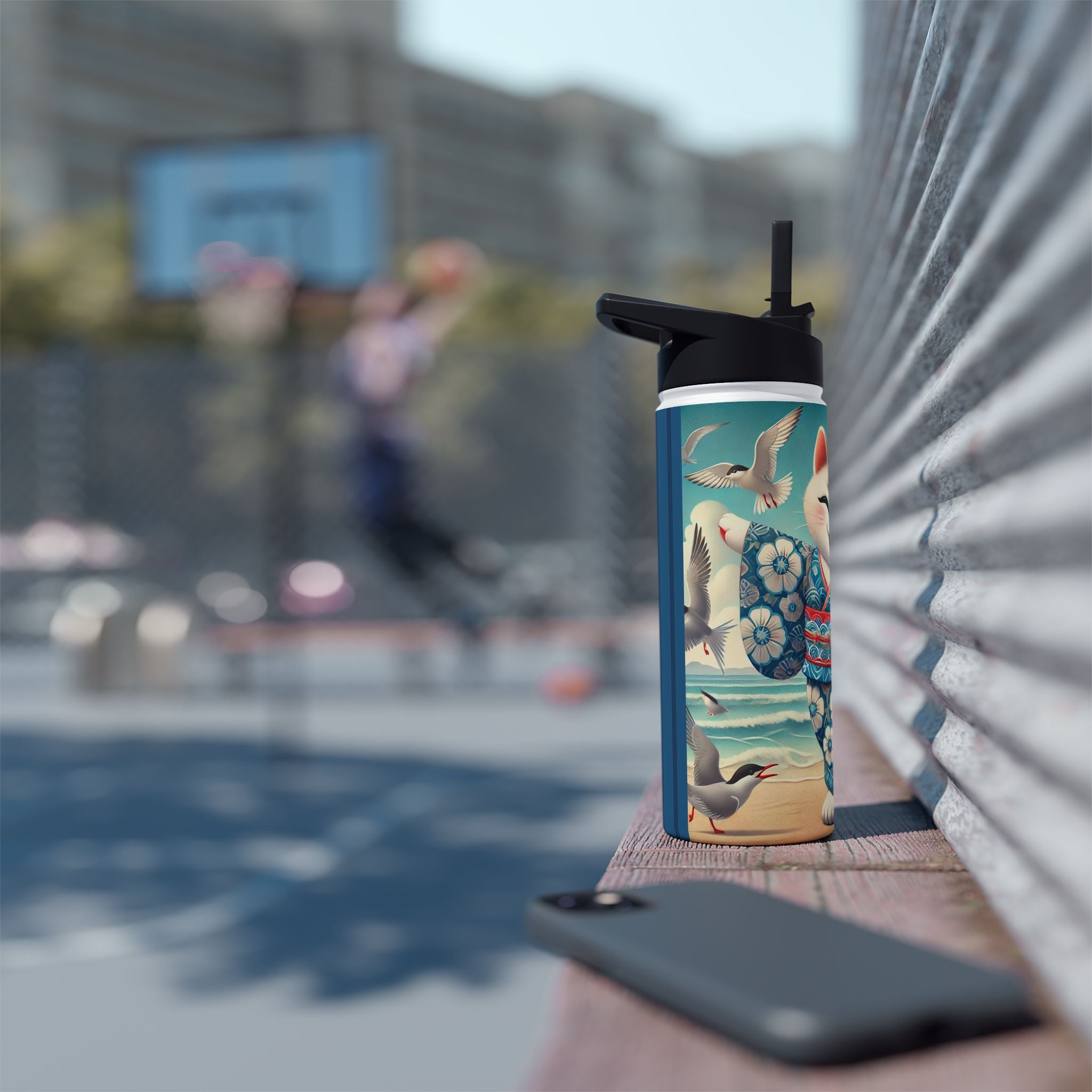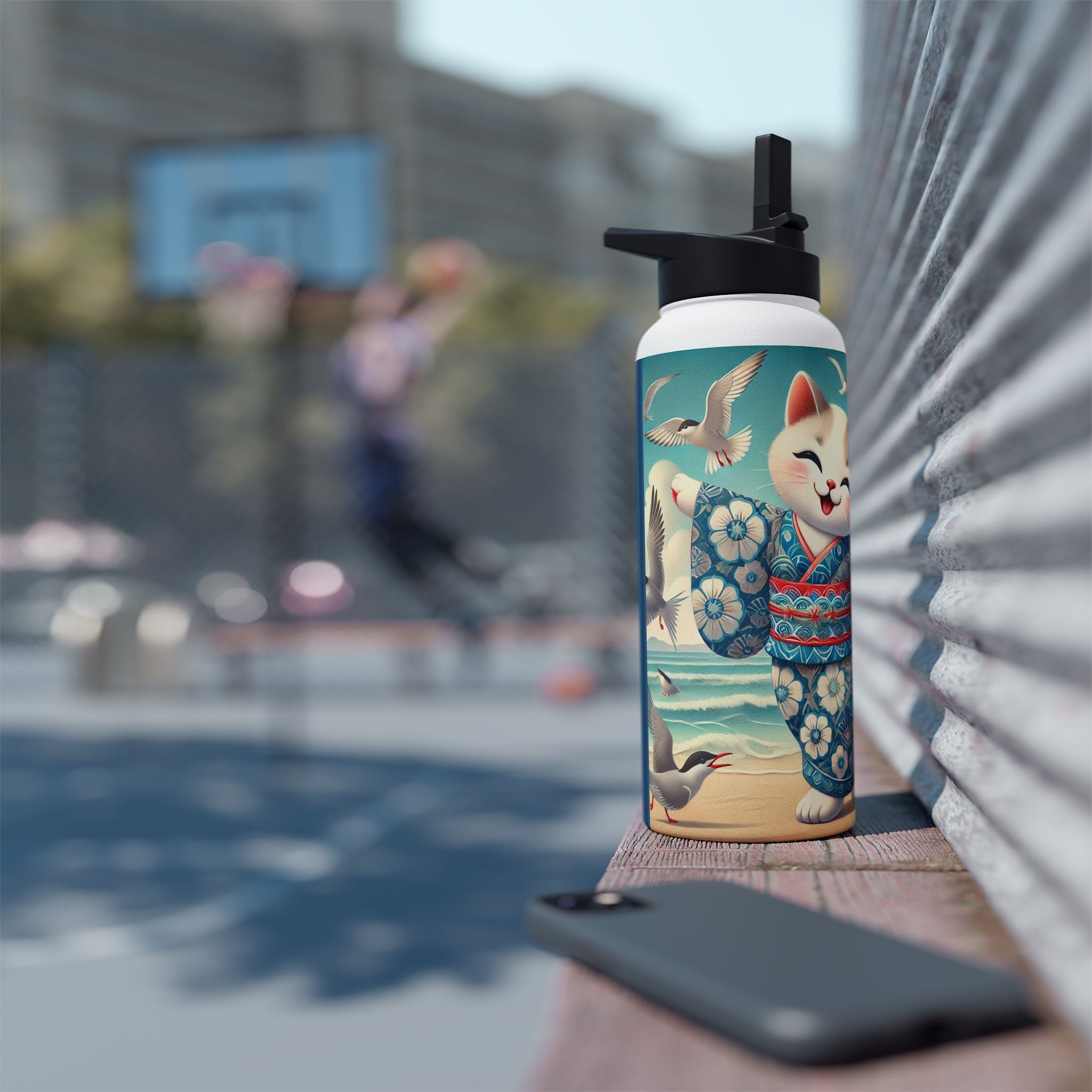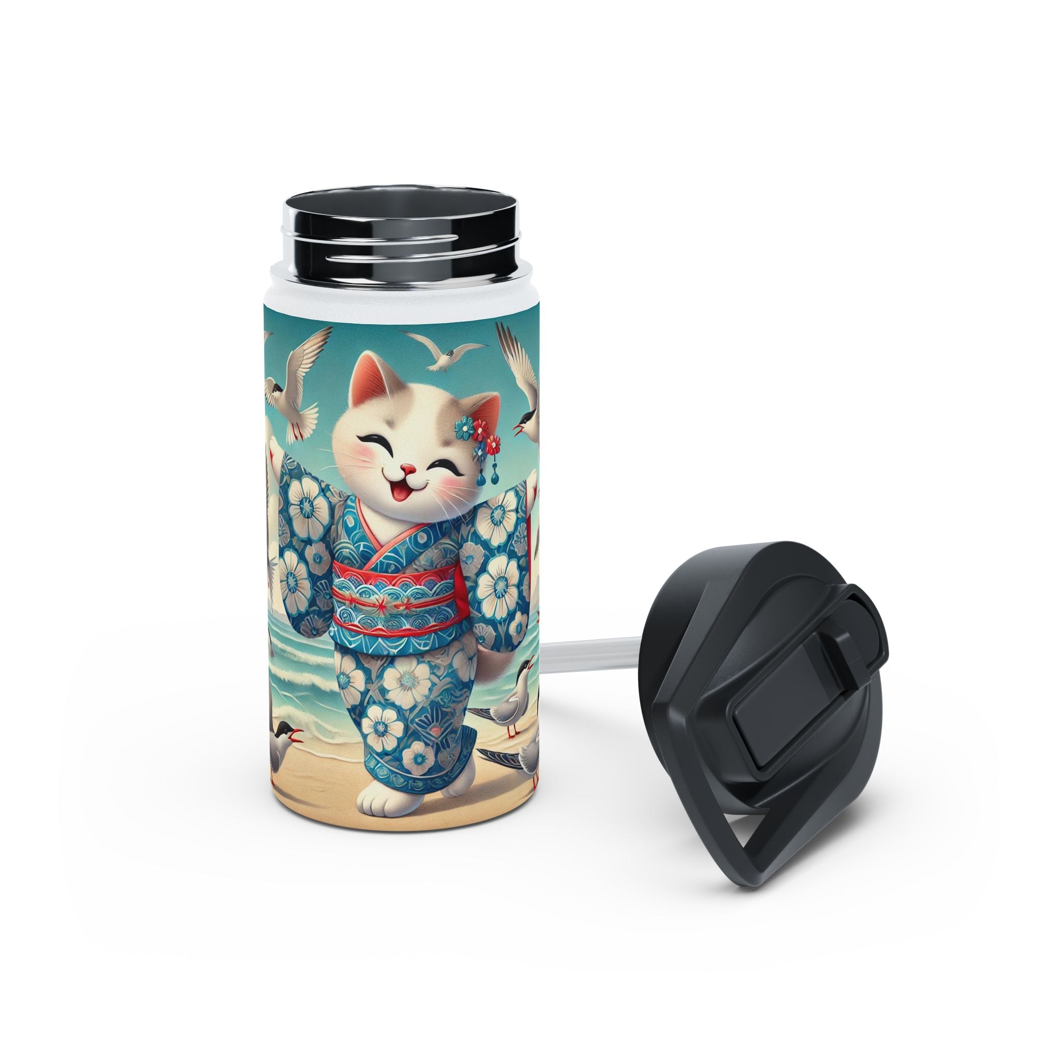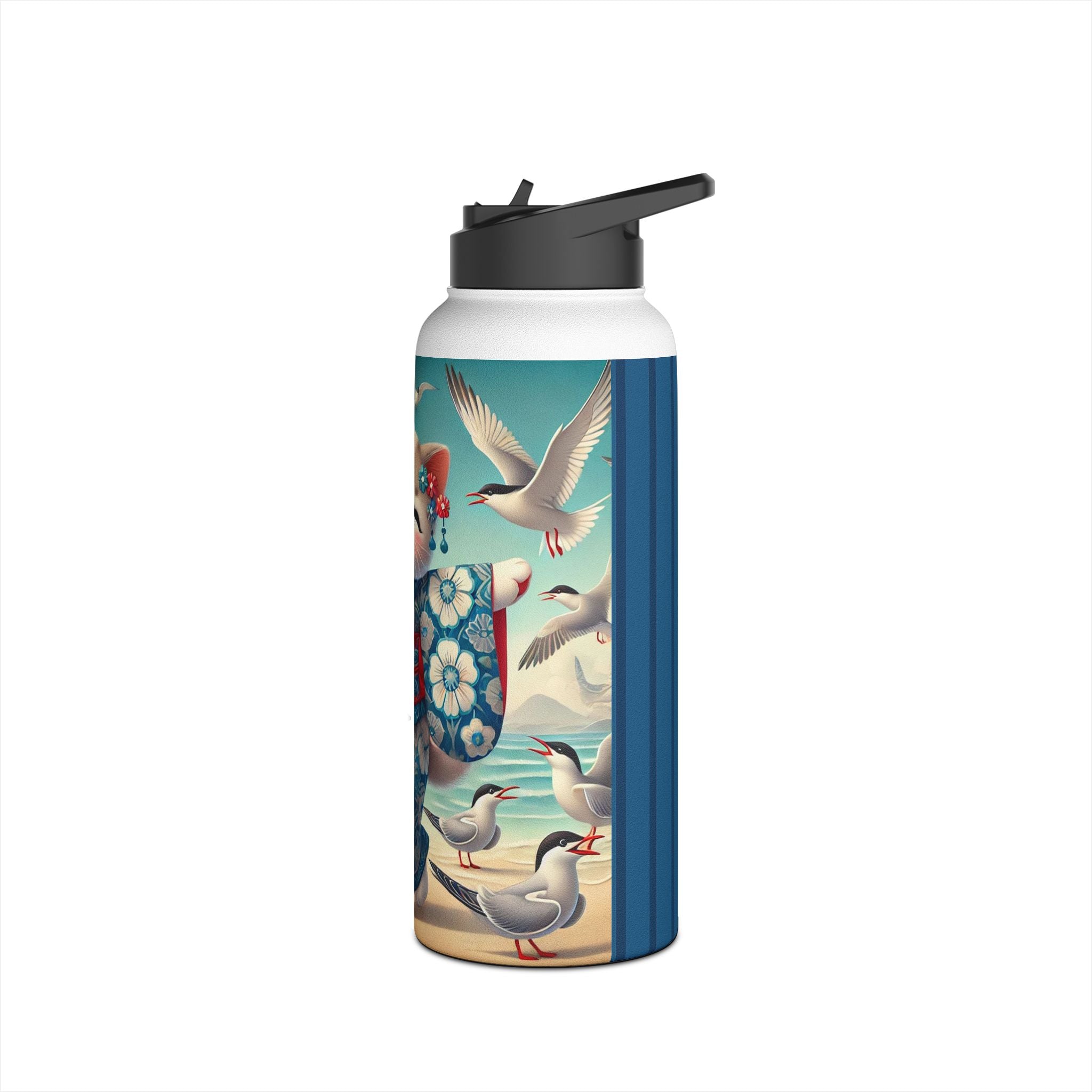 Geisha Kitten by the Seaside Stainless Steel Water Bottle, Standard Lid brings a touch of whimsy and calm to your daily adventures. Crafted from durable double-wall stainless steel, this BPA-free bottle keeps your drinks frosty for 24 hours and soothingly hot for 12. Available in three convenient sizes (12oz, 18oz, 32oz) with a secure twist-on lid, it’s the perfect blend of functionality and artistic charm—ideal for work, travel, or leisure.