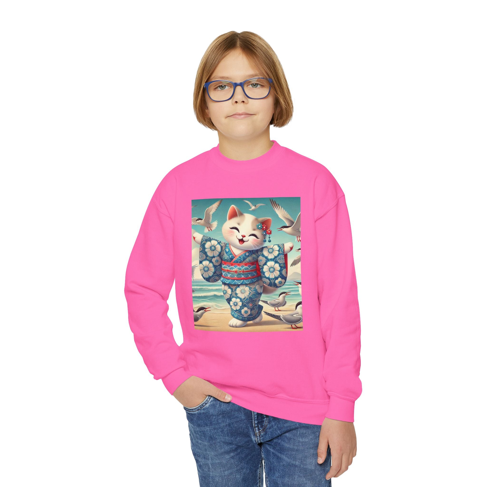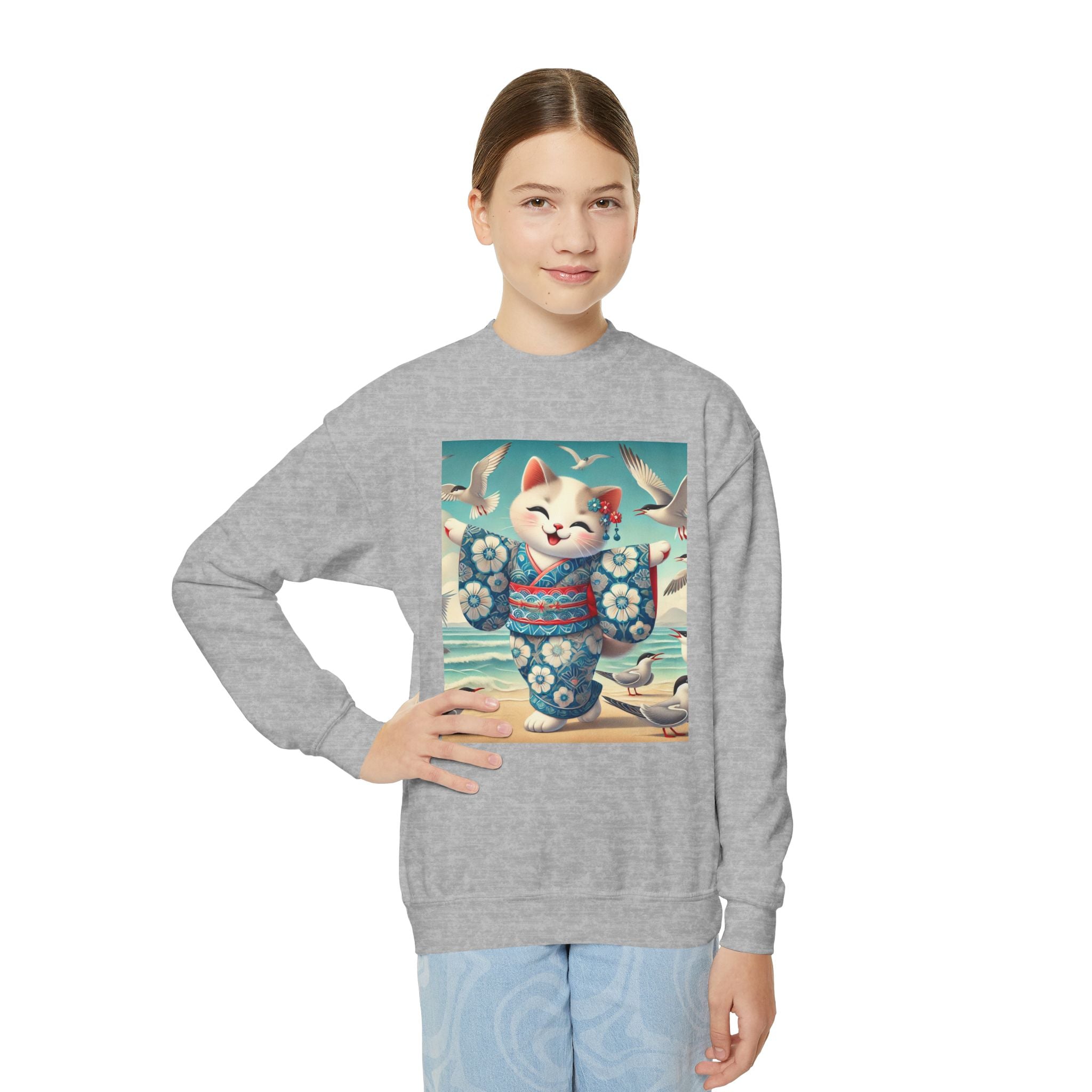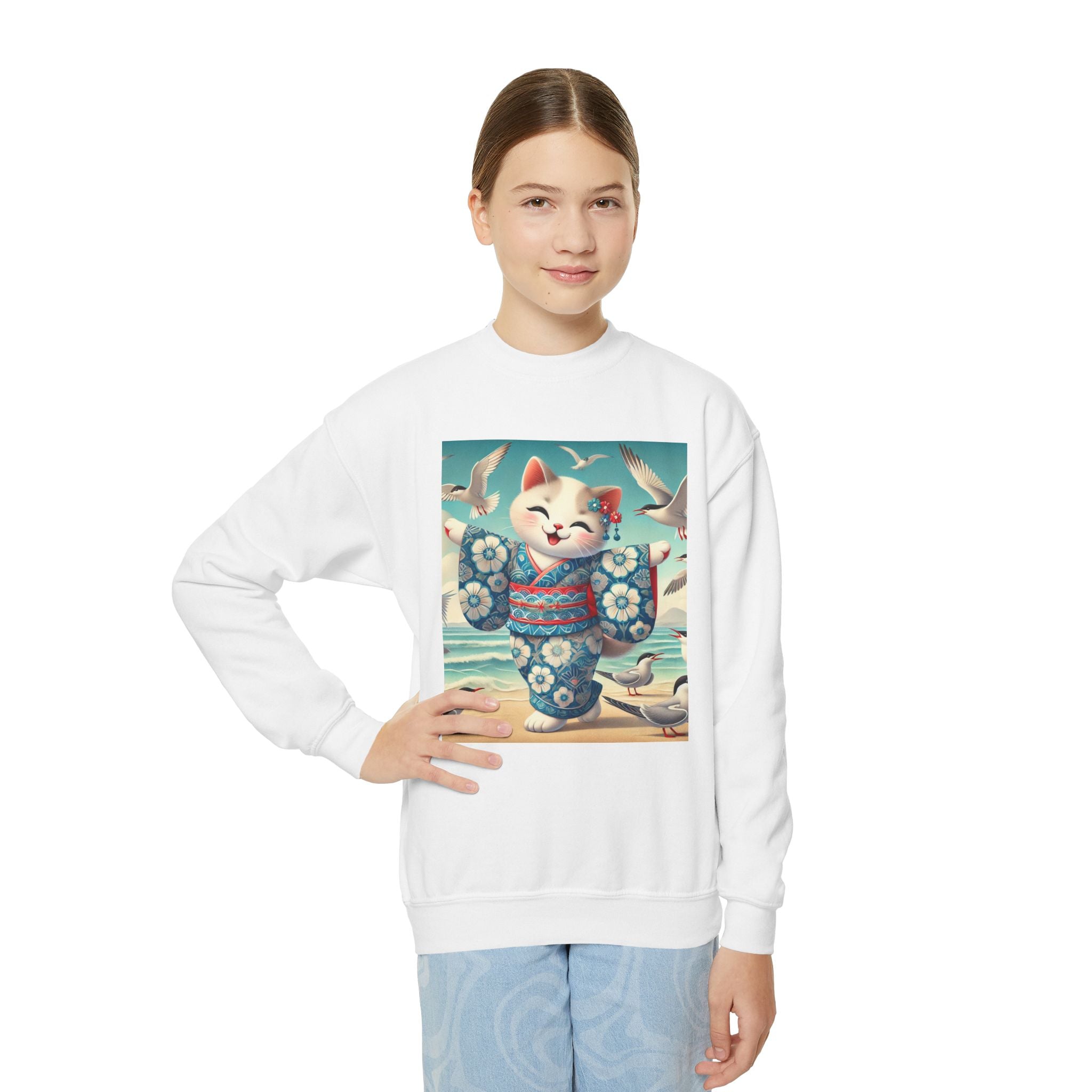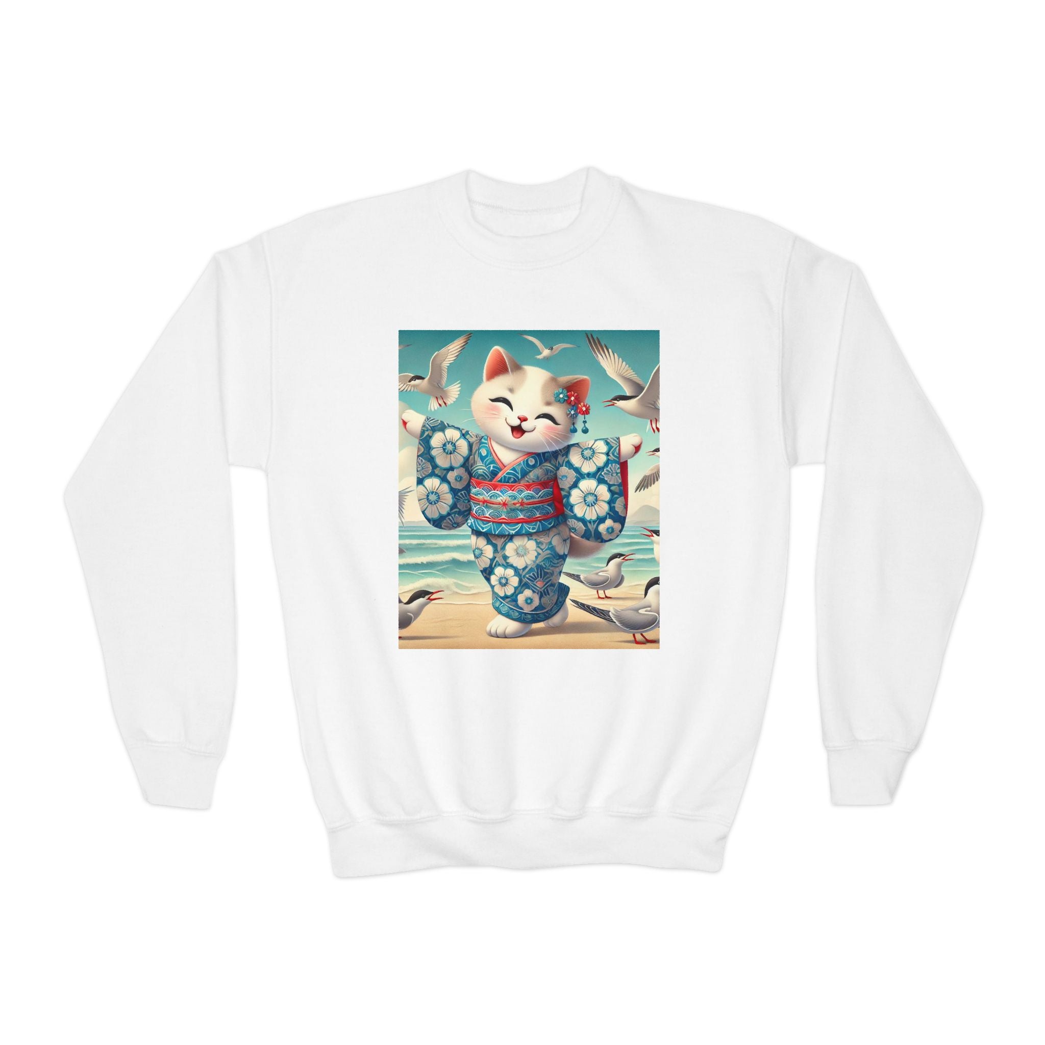 Geisha Kitten by the Seaside Youth Crewneck Sweatshirt brings together cozy comfort, joyful artistry, and coastal charm. Made from a soft and balanced blend of 50% cotton and 50% polyester, this Gildan 18000B sweatshirt offers warmth, durability, and a relaxed fit perfect for school, play, or casual outings. The medium-heavy fabric ensures a cozy feel, while the tear-away label adds extra comfort. Please note: due to the fabric properties, the White color variant may appear slightly off-white.