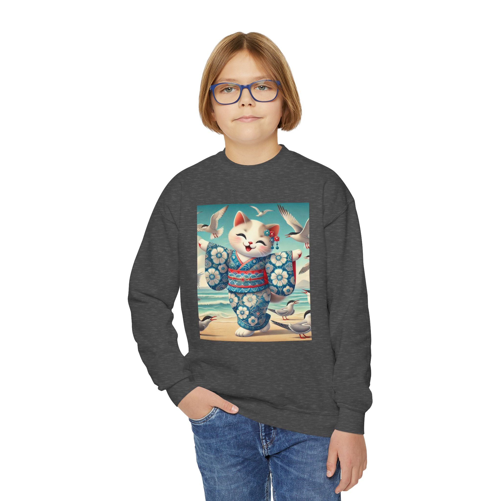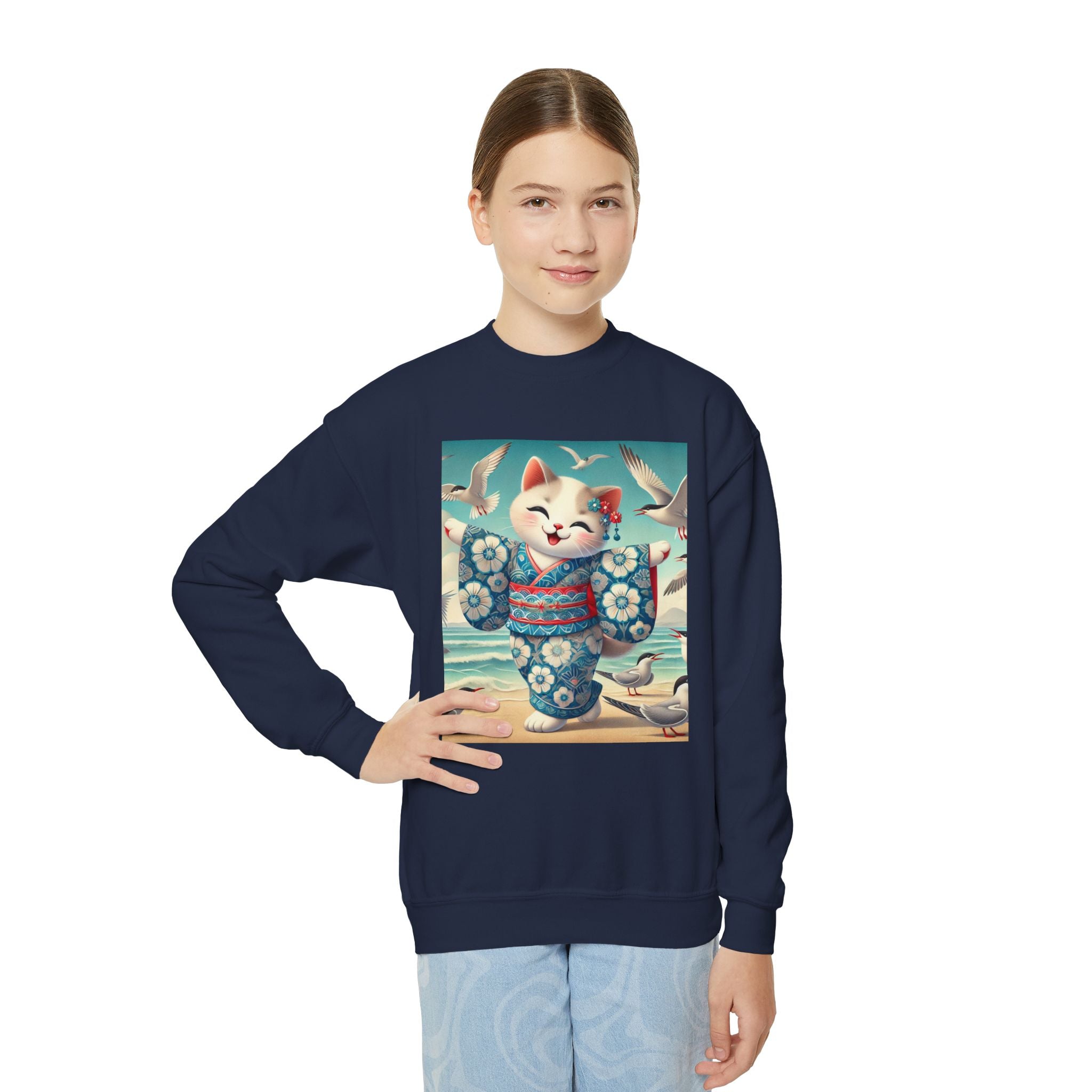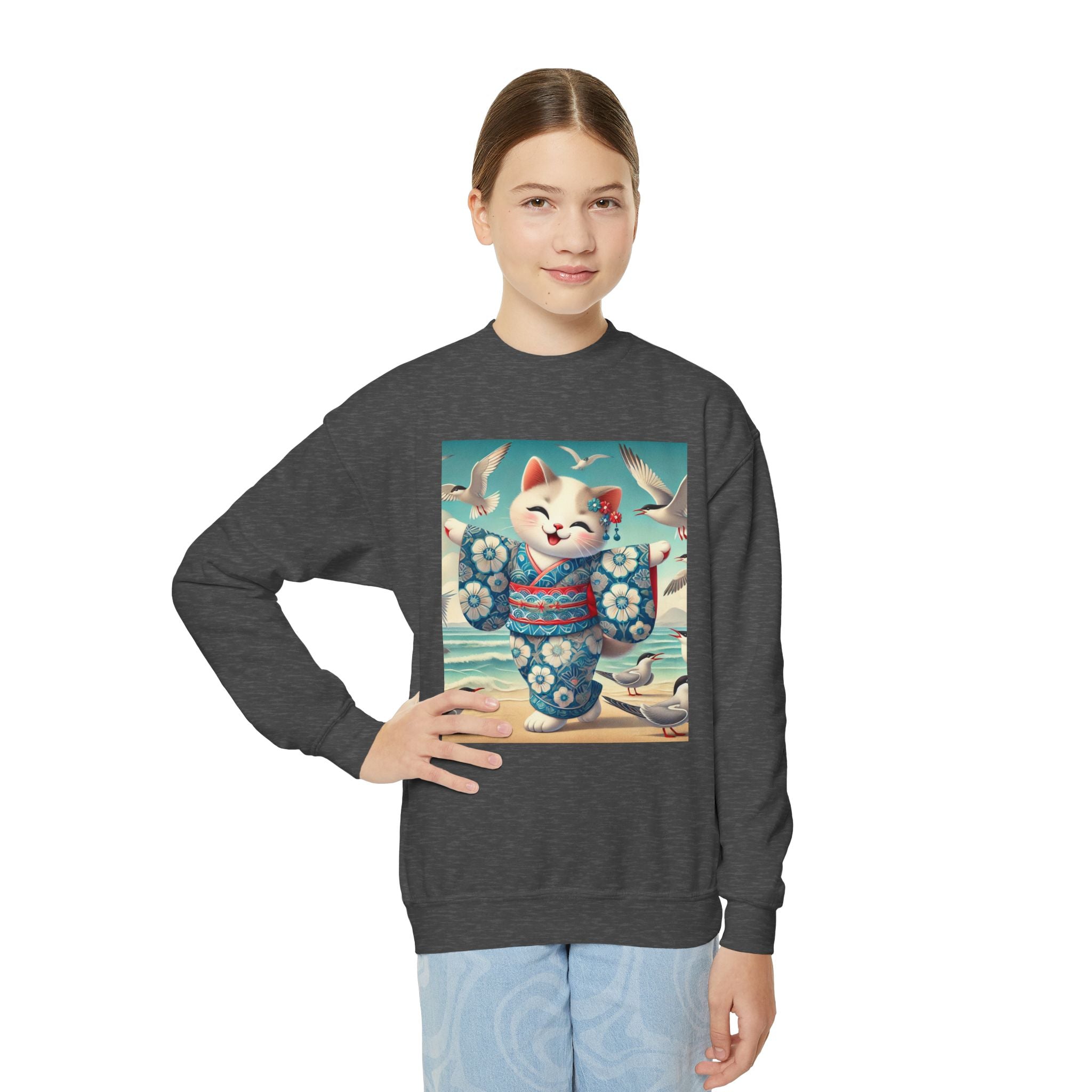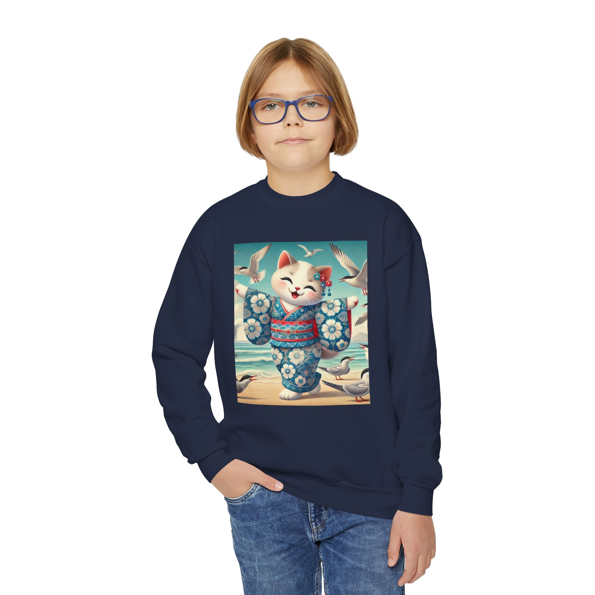 Geisha Kitten by the Seaside Youth Crewneck Sweatshirt brings together cozy comfort, joyful artistry, and coastal charm. Made from a soft and balanced blend of 50% cotton and 50% polyester, this Gildan 18000B sweatshirt offers warmth, durability, and a relaxed fit perfect for school, play, or casual outings. The medium-heavy fabric ensures a cozy feel, while the tear-away label adds extra comfort. Please note: due to the fabric properties, the White color variant may appear slightly off-white.