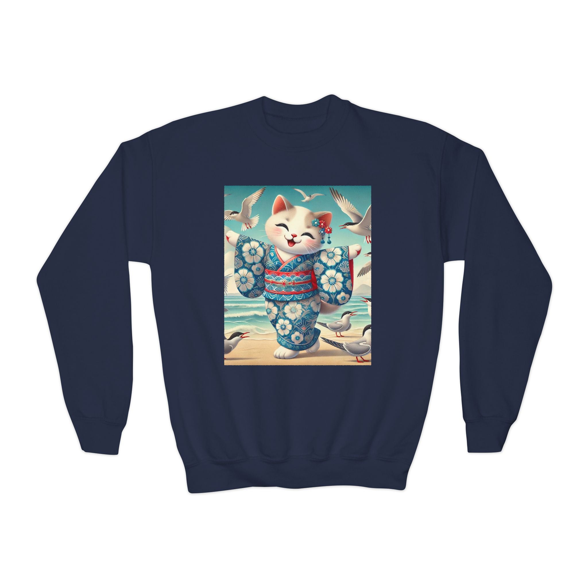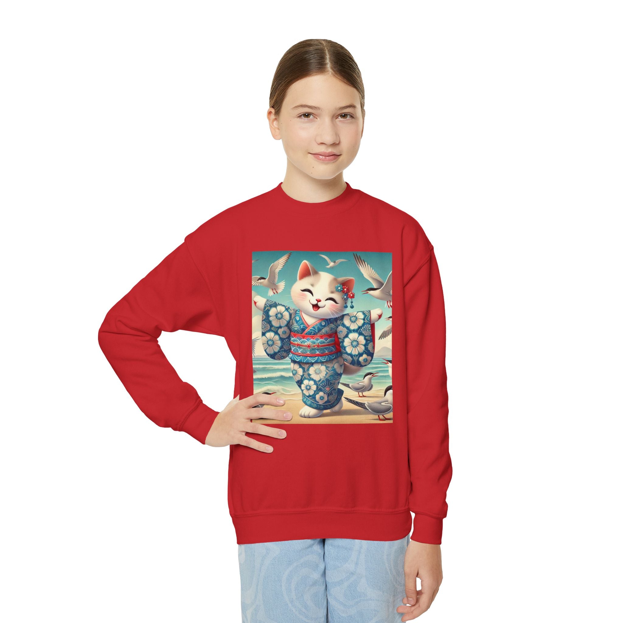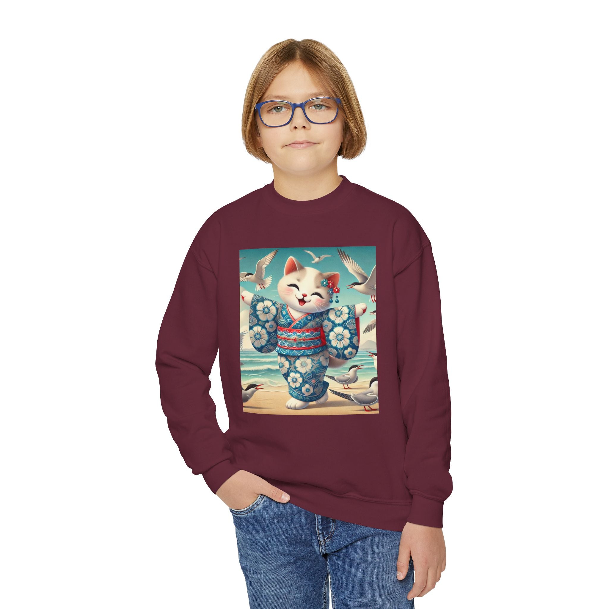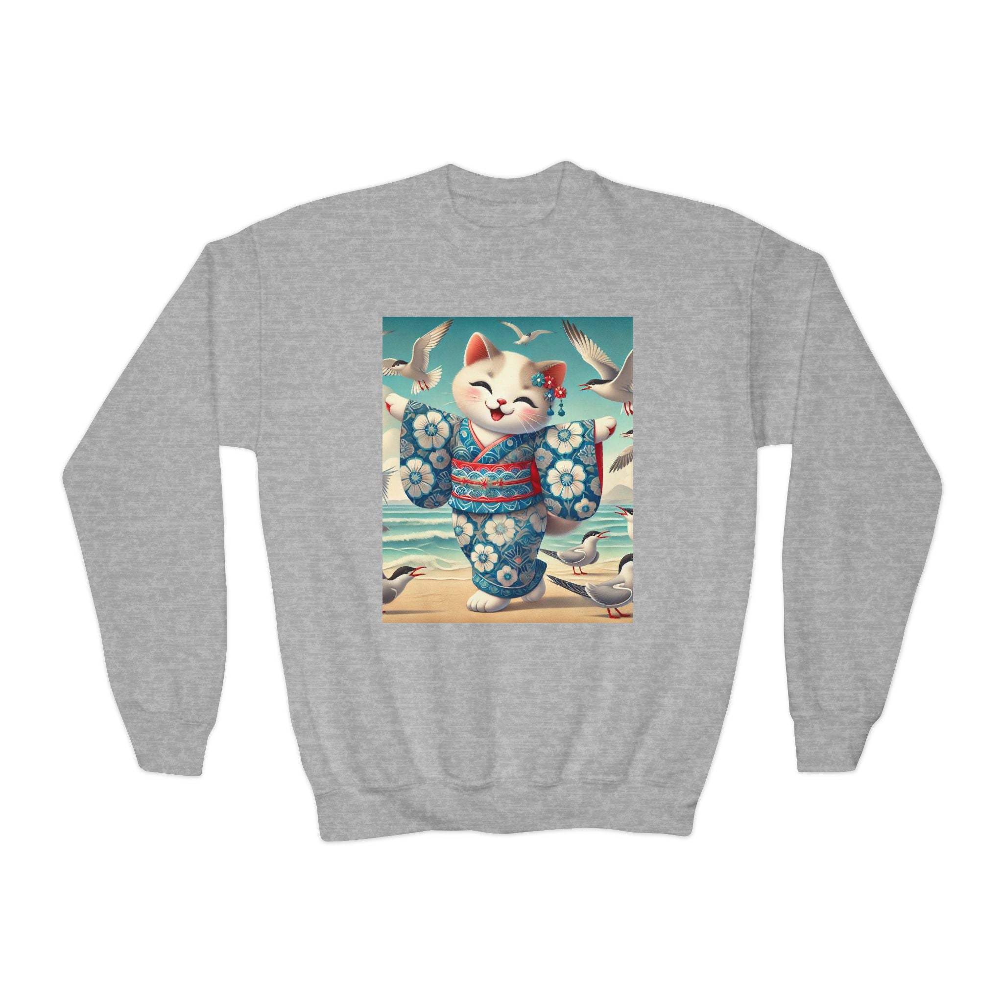 Geisha Kitten by the Seaside Youth Crewneck Sweatshirt brings together cozy comfort, joyful artistry, and coastal charm. Made from a soft and balanced blend of 50% cotton and 50% polyester, this Gildan 18000B sweatshirt offers warmth, durability, and a relaxed fit perfect for school, play, or casual outings. The medium-heavy fabric ensures a cozy feel, while the tear-away label adds extra comfort. Please note: due to the fabric properties, the White color variant may appear slightly off-white.