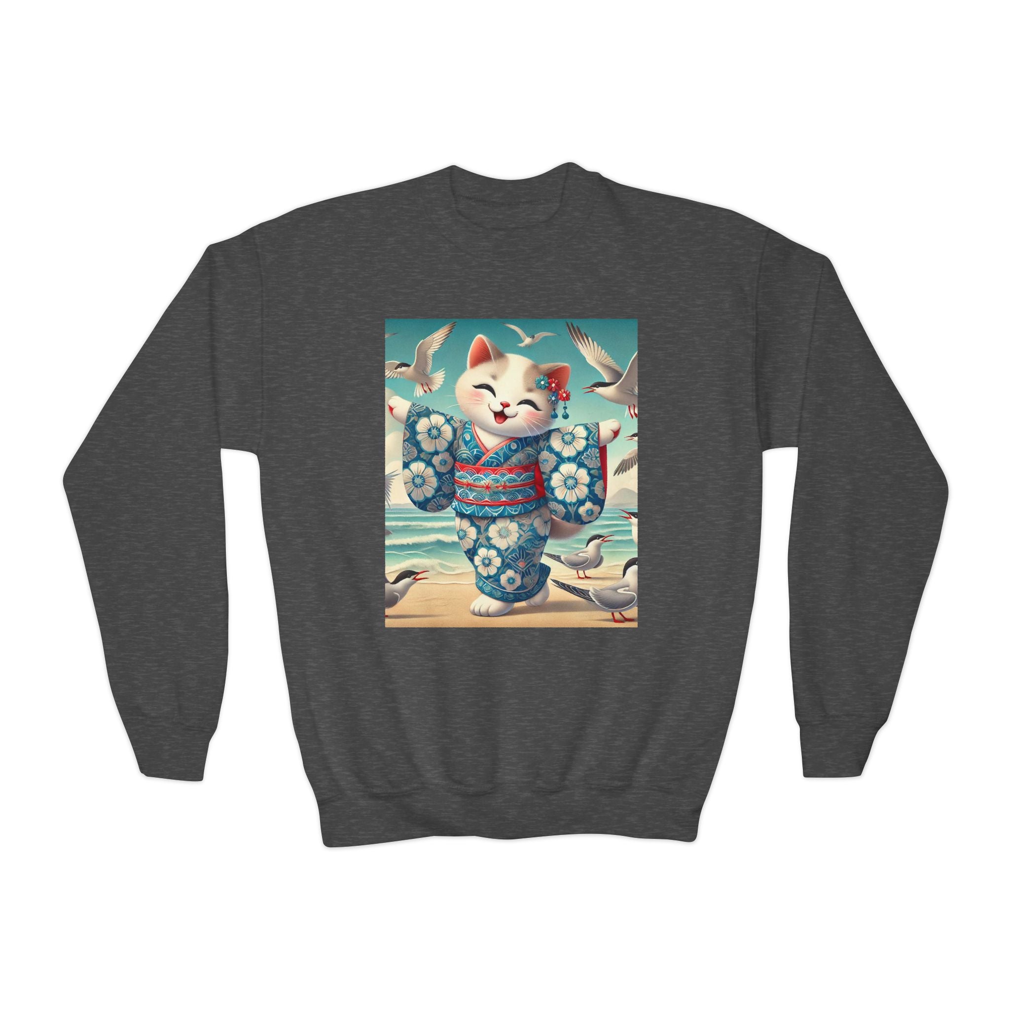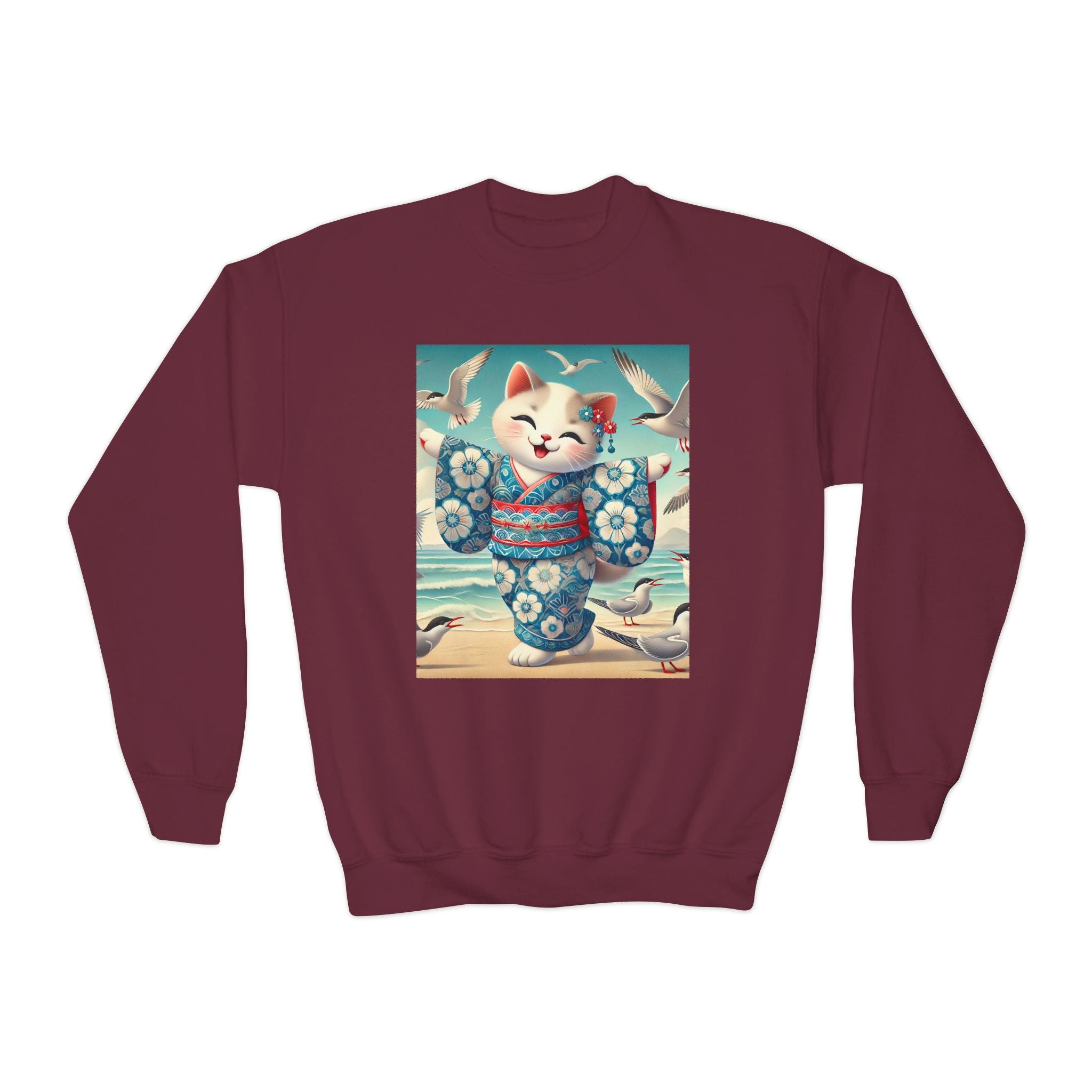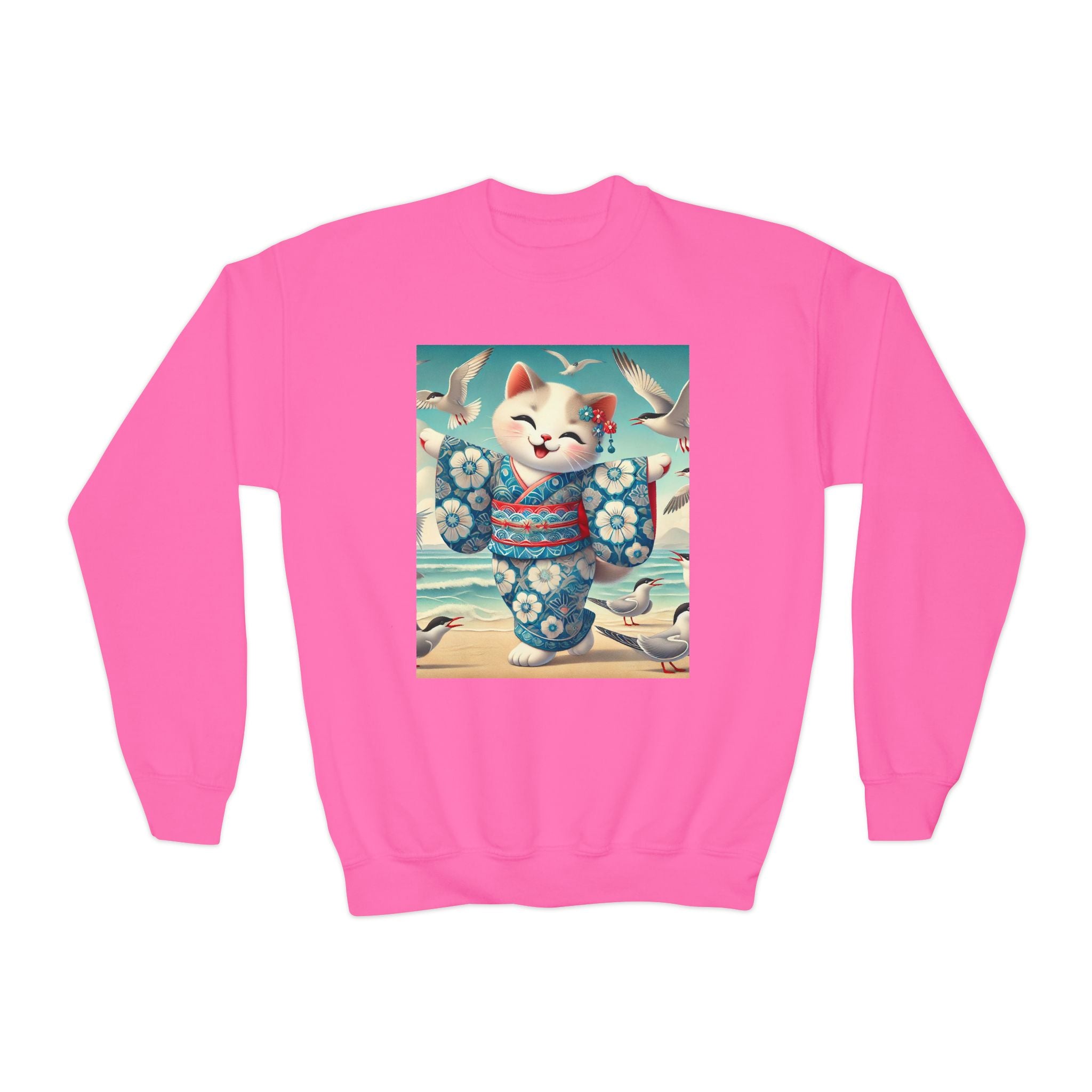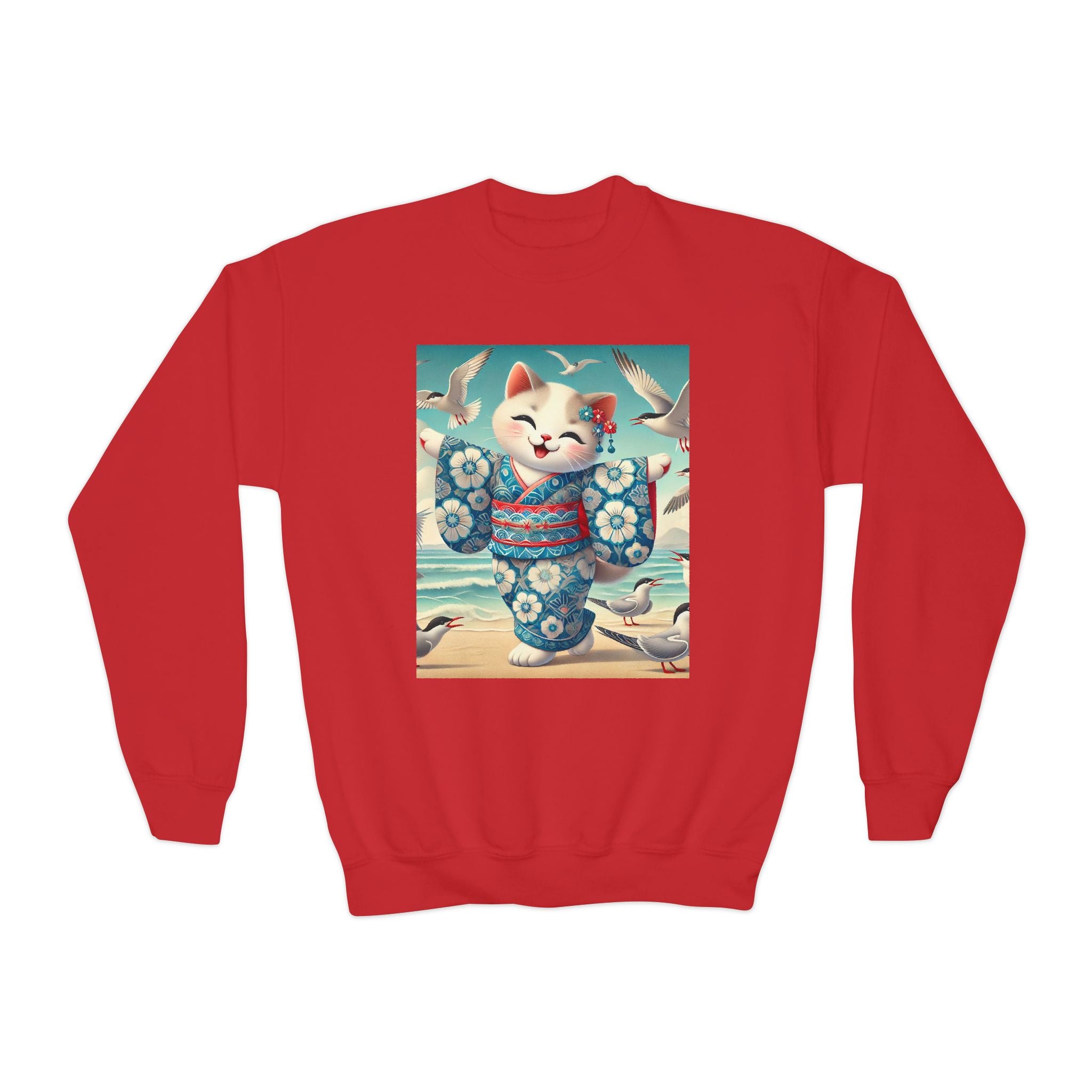 Geisha Kitten by the Seaside Youth Crewneck Sweatshirt brings together cozy comfort, joyful artistry, and coastal charm. Made from a soft and balanced blend of 50% cotton and 50% polyester, this Gildan 18000B sweatshirt offers warmth, durability, and a relaxed fit perfect for school, play, or casual outings. The medium-heavy fabric ensures a cozy feel, while the tear-away label adds extra comfort. Please note: due to the fabric properties, the White color variant may appear slightly off-white.