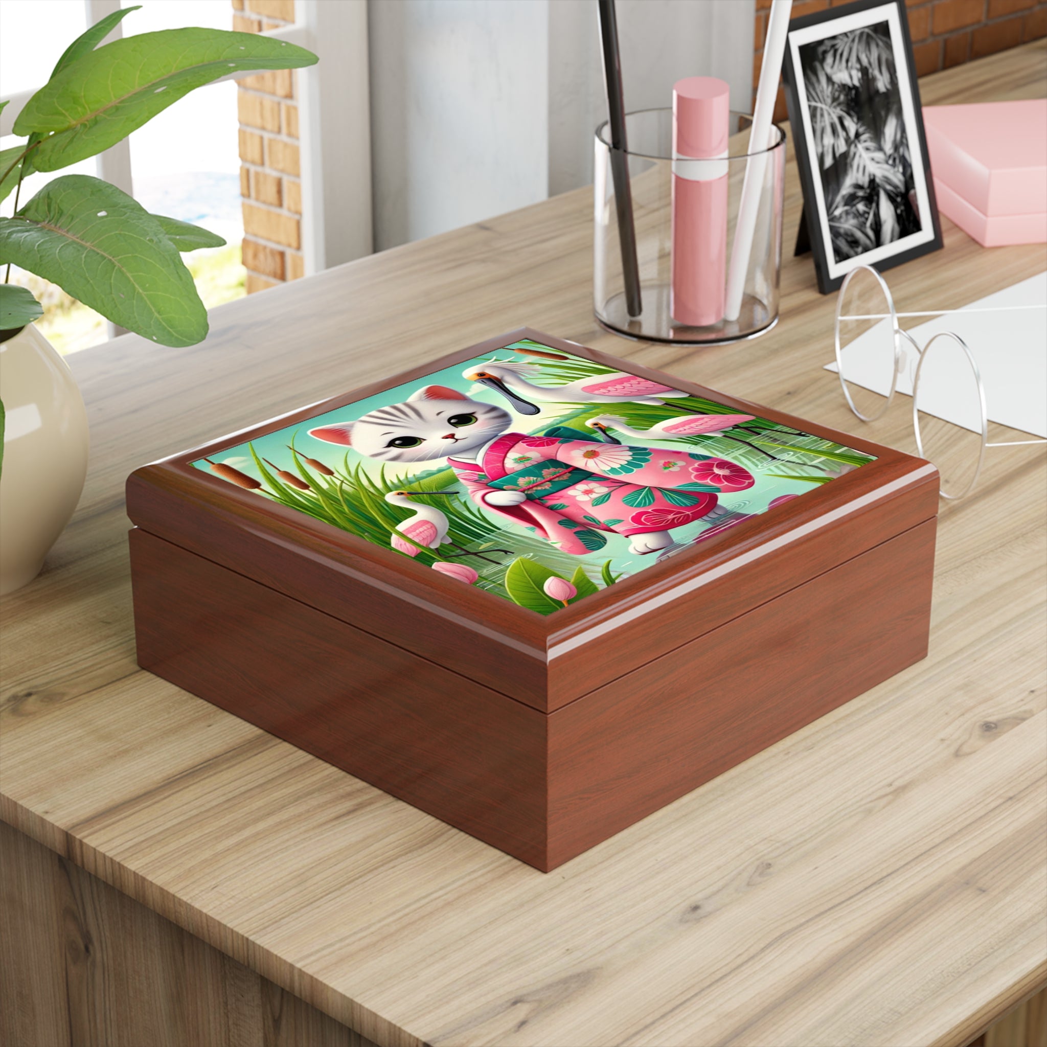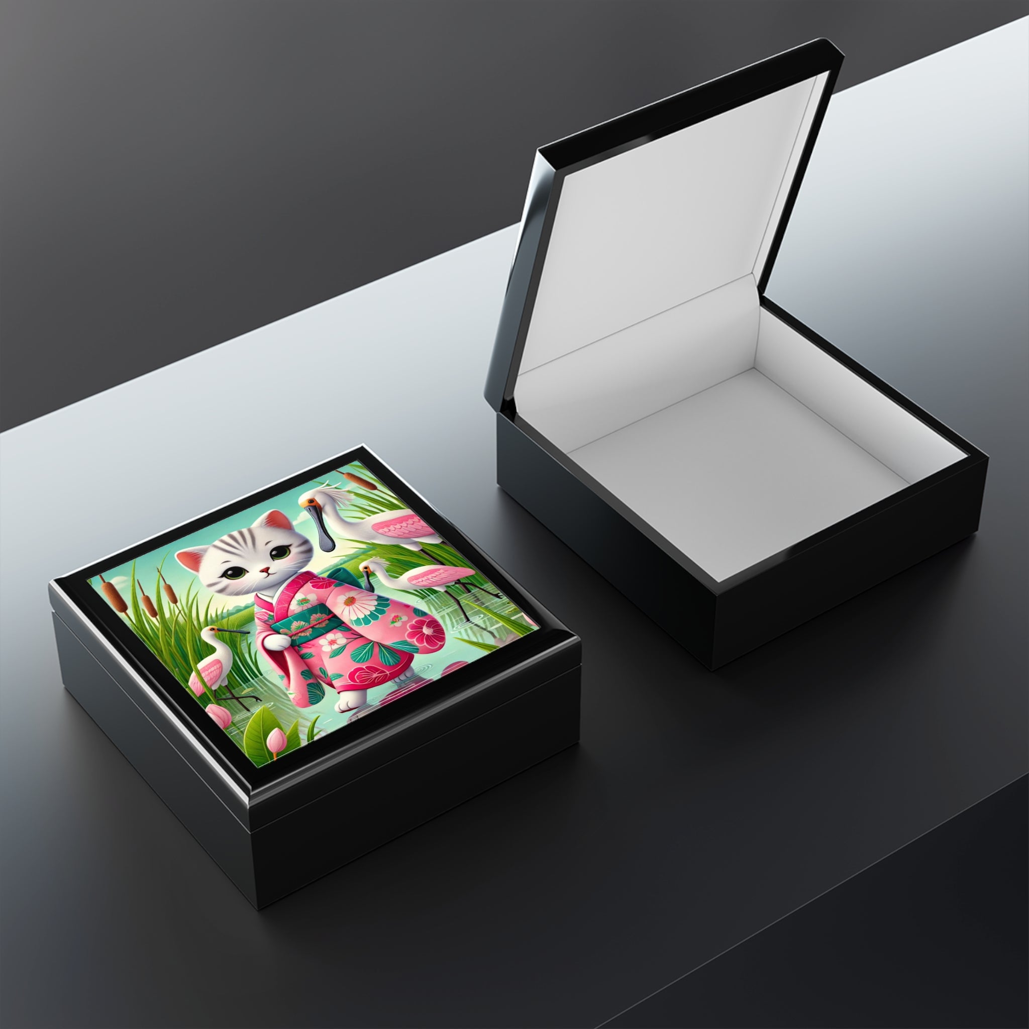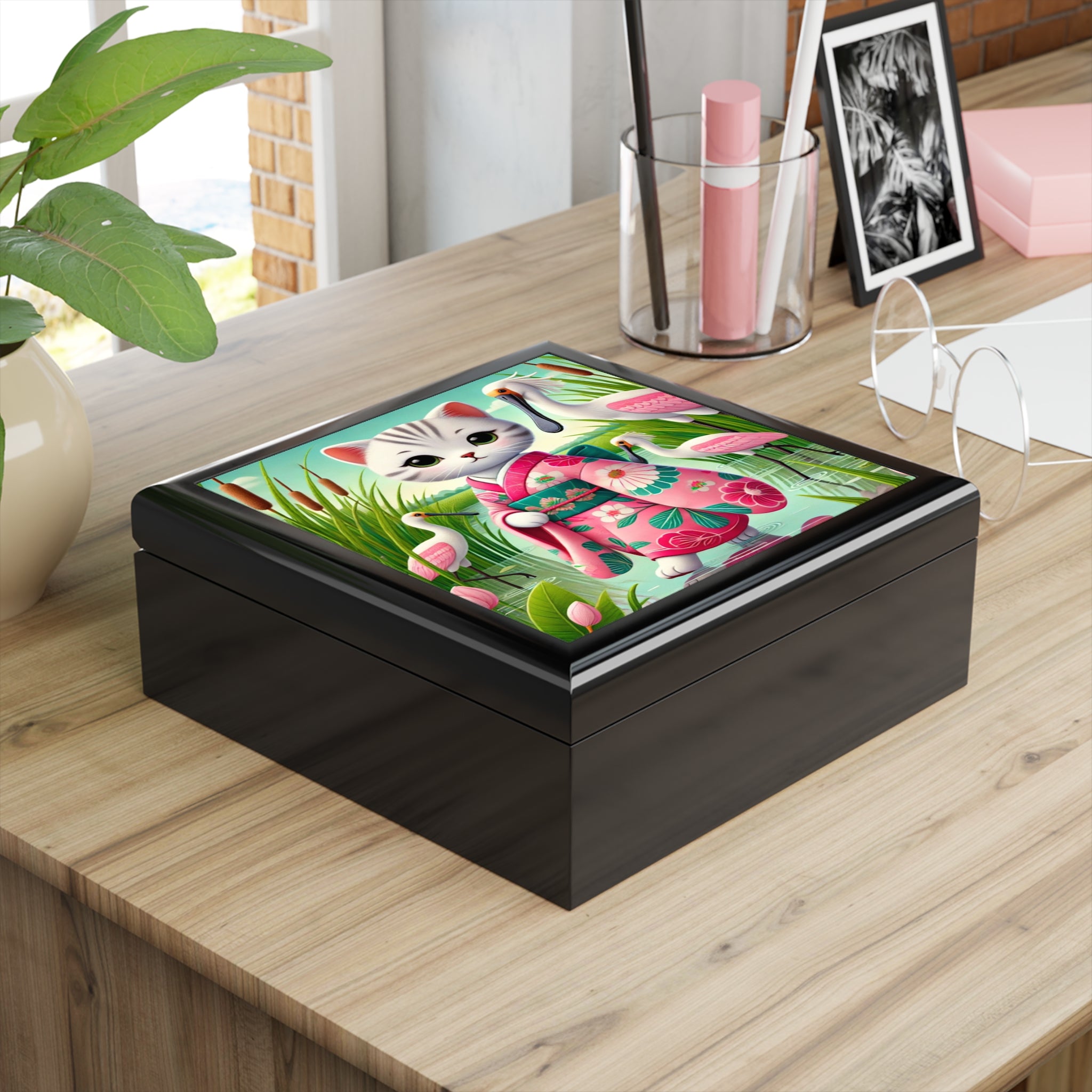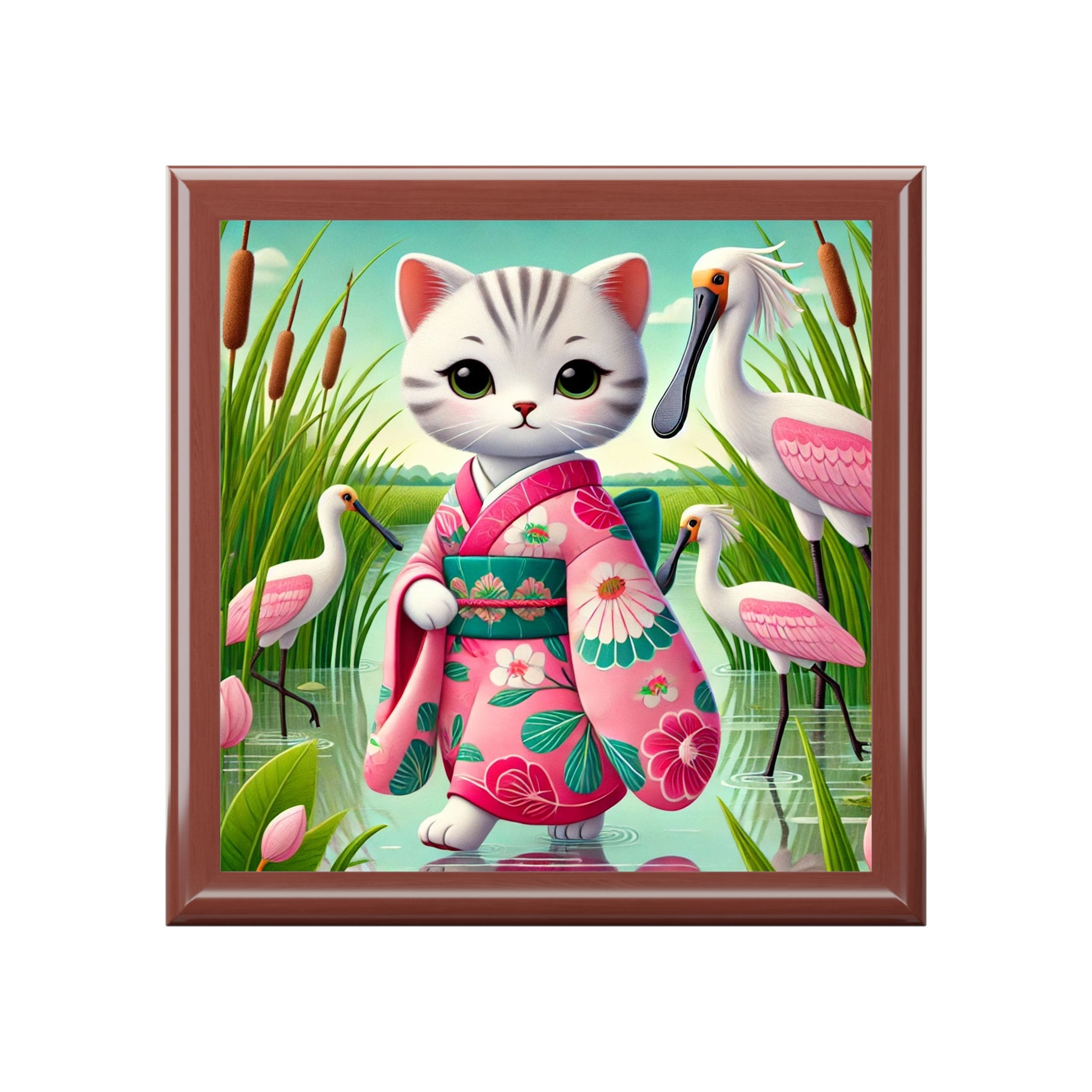 Geisha Kitten Strolls Among the Spoonbills Jewelry Box brings a serene storybook moment to your dresser. On the glossy ceramic tile lid, a young geisha kitten in a beautifully detailed floral kimono strolls gracefully through a tranquil marsh. Around her, elegant spoonbills wade through shallow waters, their long legs and curved beaks echoing the quiet rhythm of the landscape. The scene gently blends the beauty of nature with the charm of traditional Japanese aesthetics, turning your jewelry box into a tiny, peaceful world of its own.