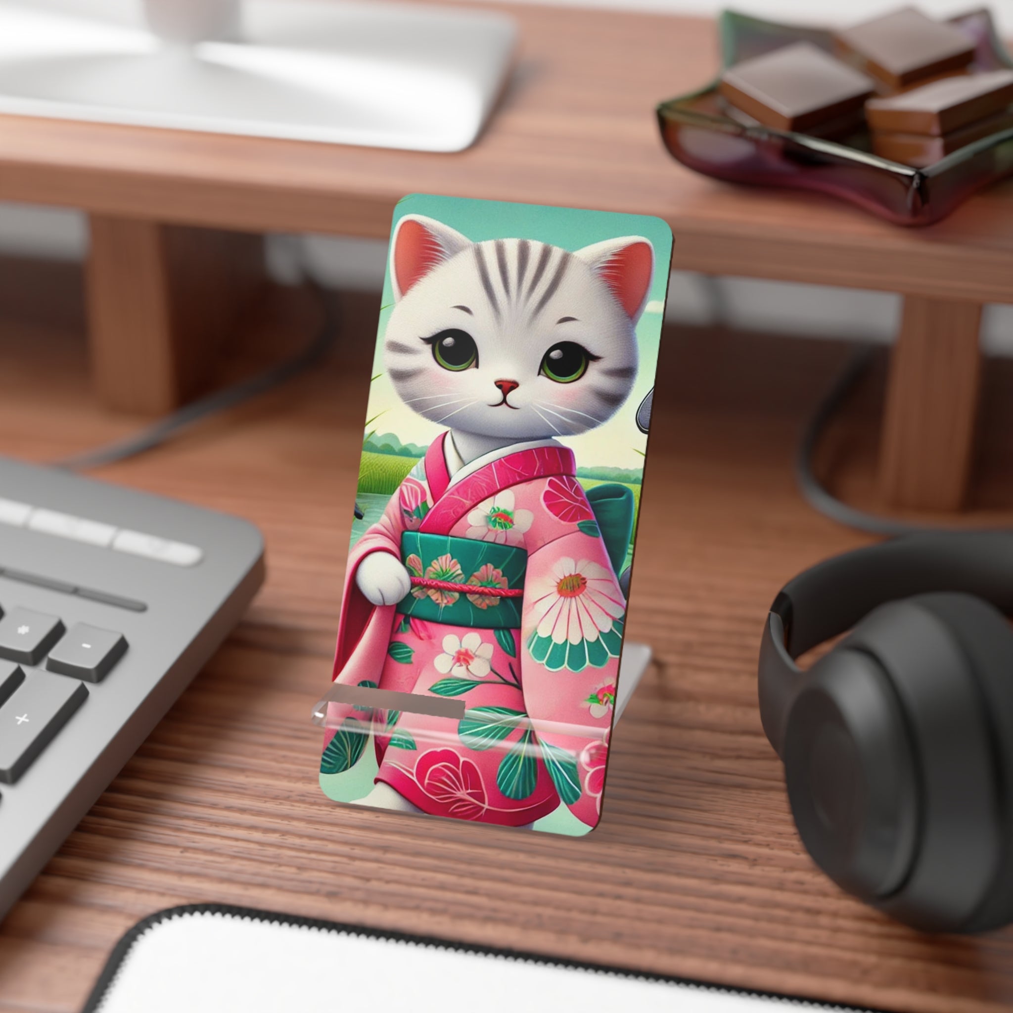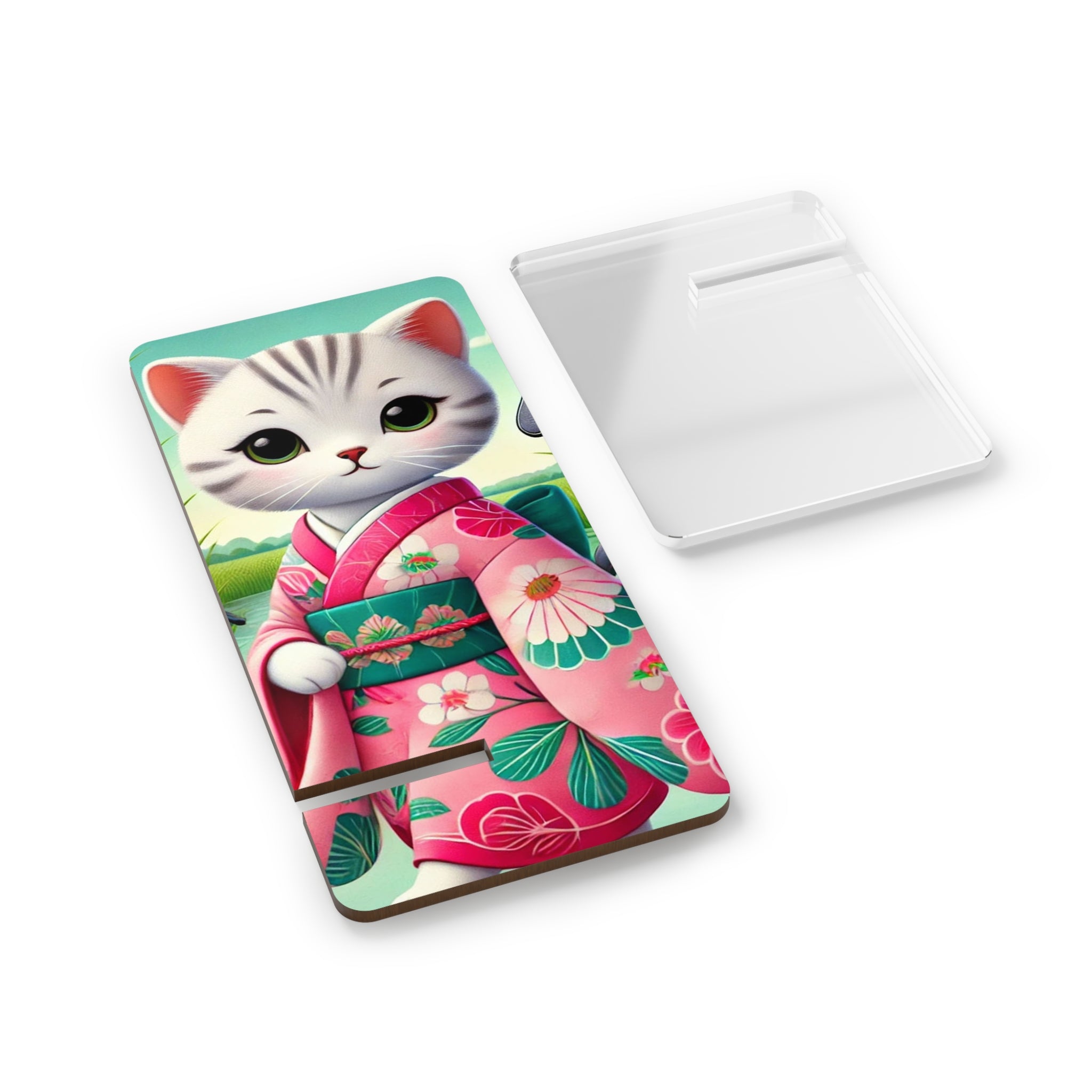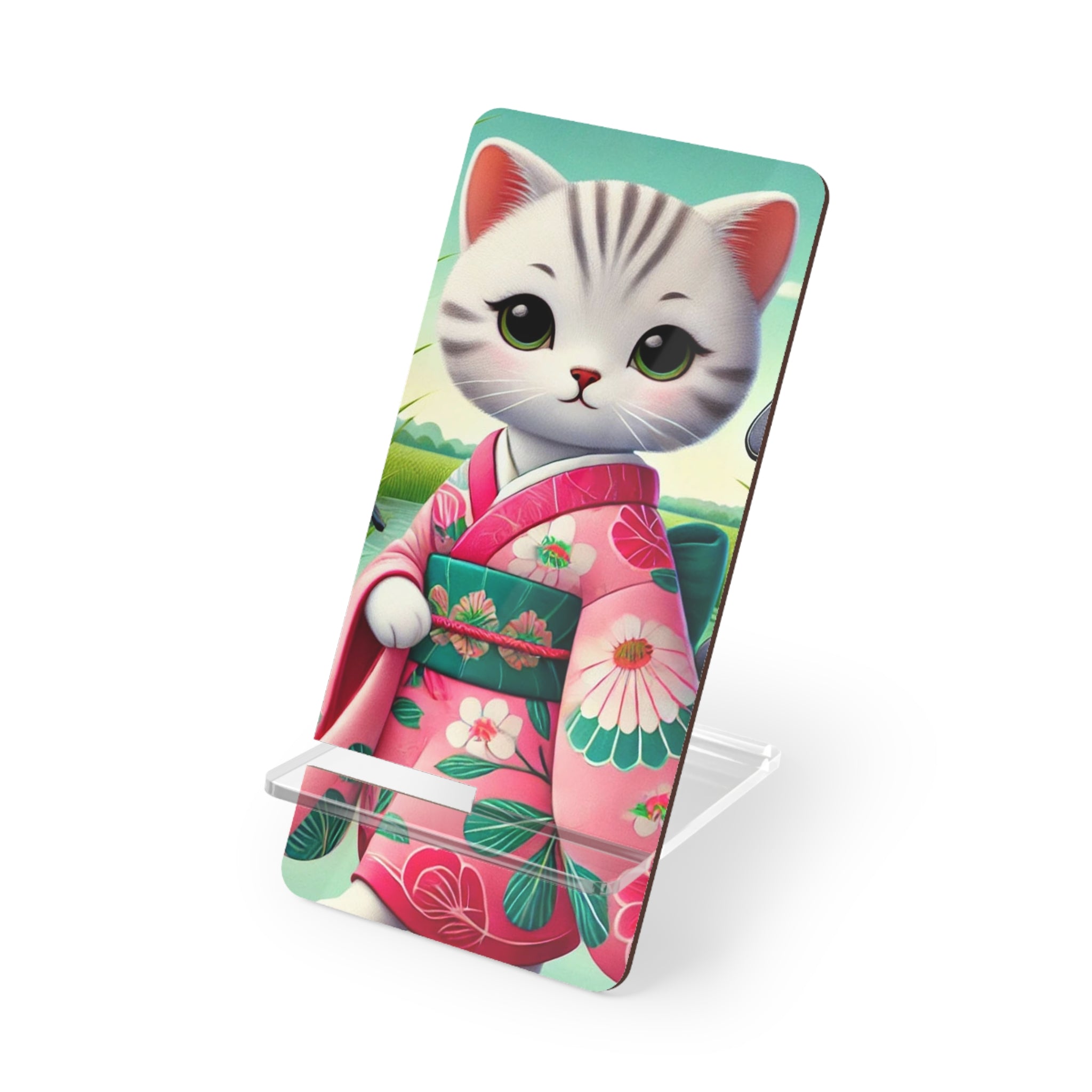 The stand features whimsical artwork of a young geisha kitten strolling gracefully through a tranquil marsh. She’s dressed in a beautifully detailed kimono adorned with vibrant floral patterns, surrounded by elegant spoonbills wading in the shallow waters. This serene scene blends the charm of traditional aesthetics with the peaceful beauty of nature.