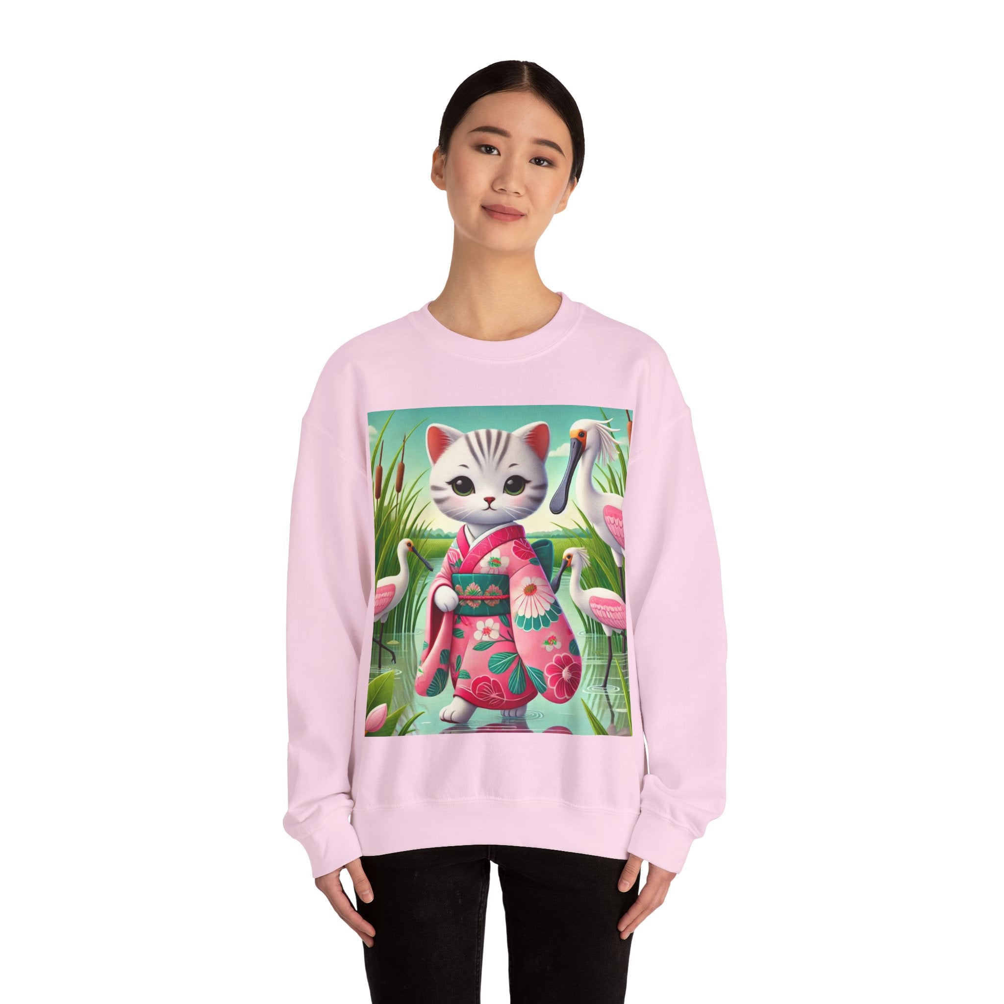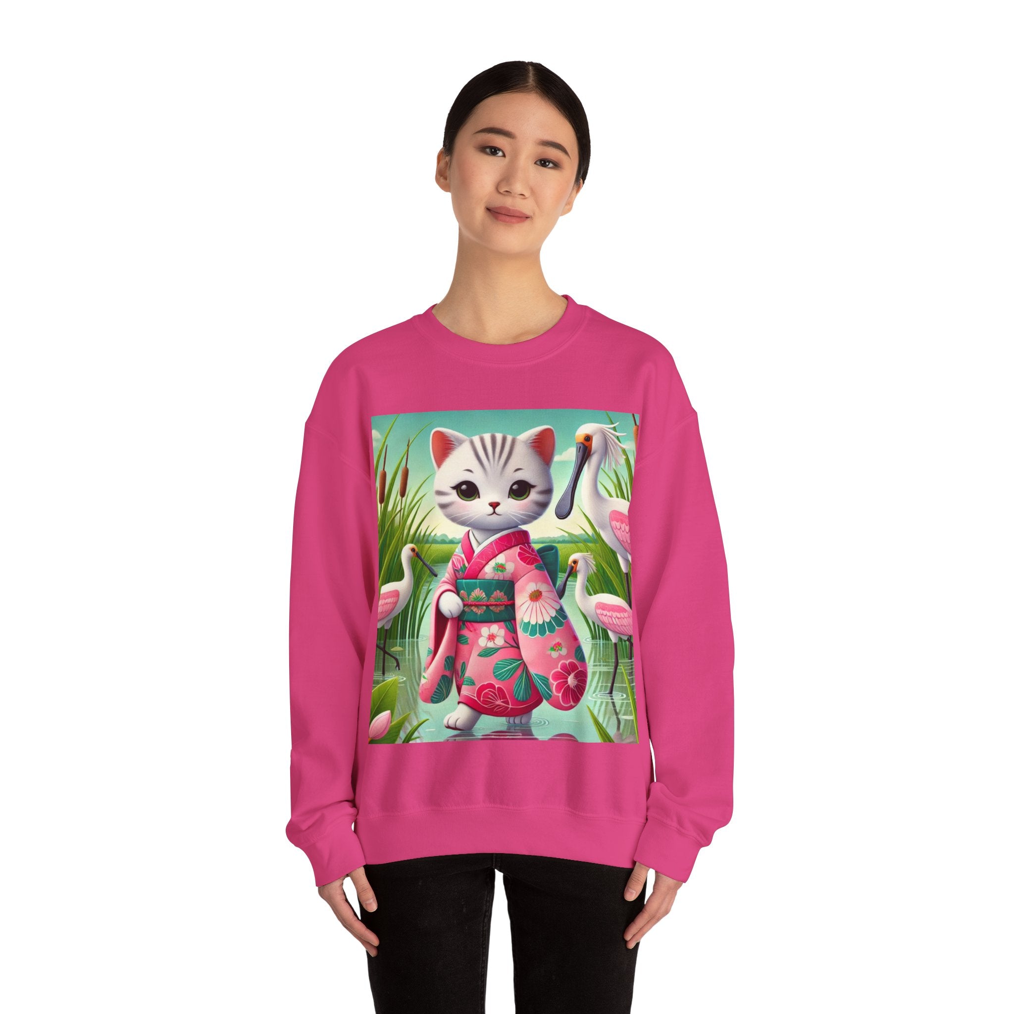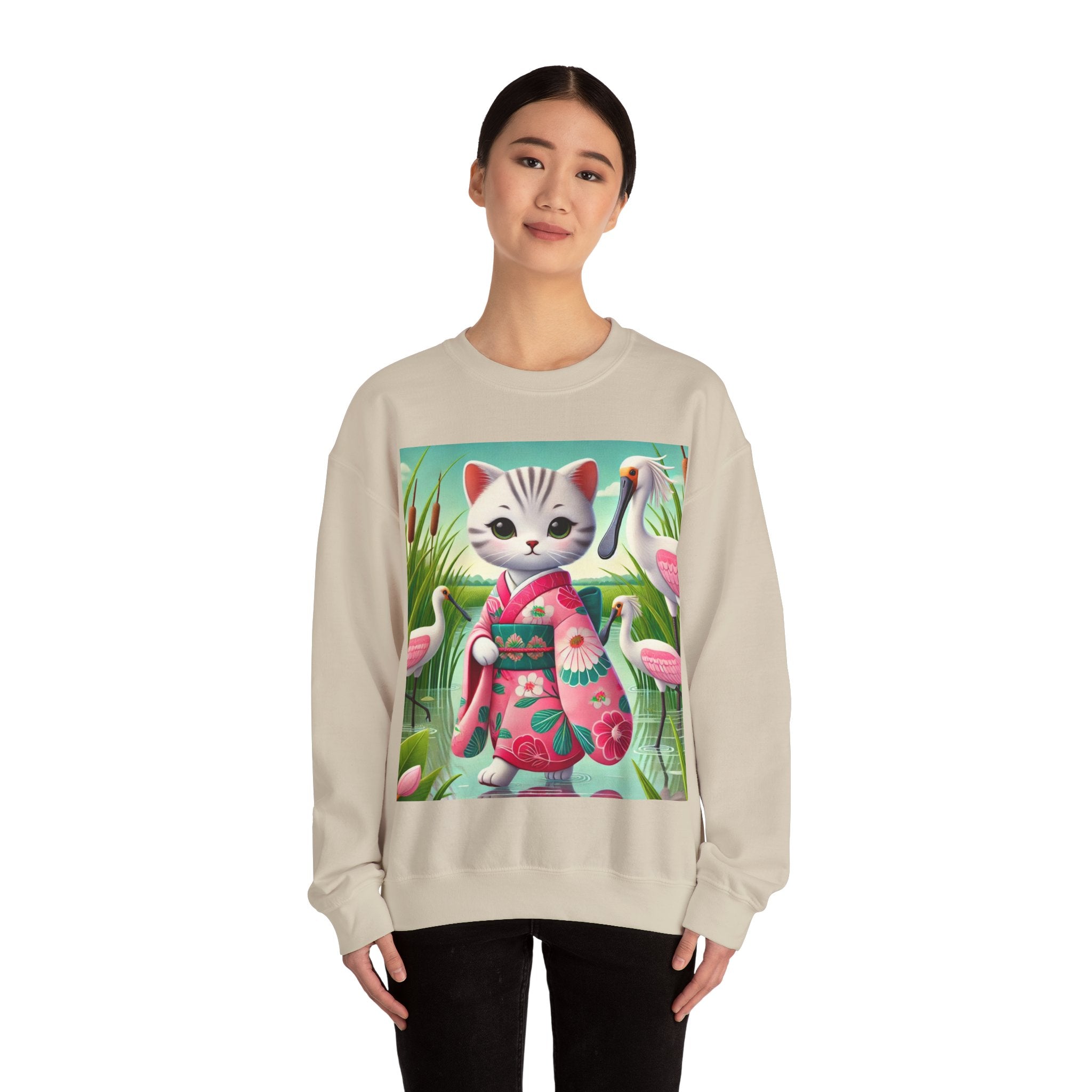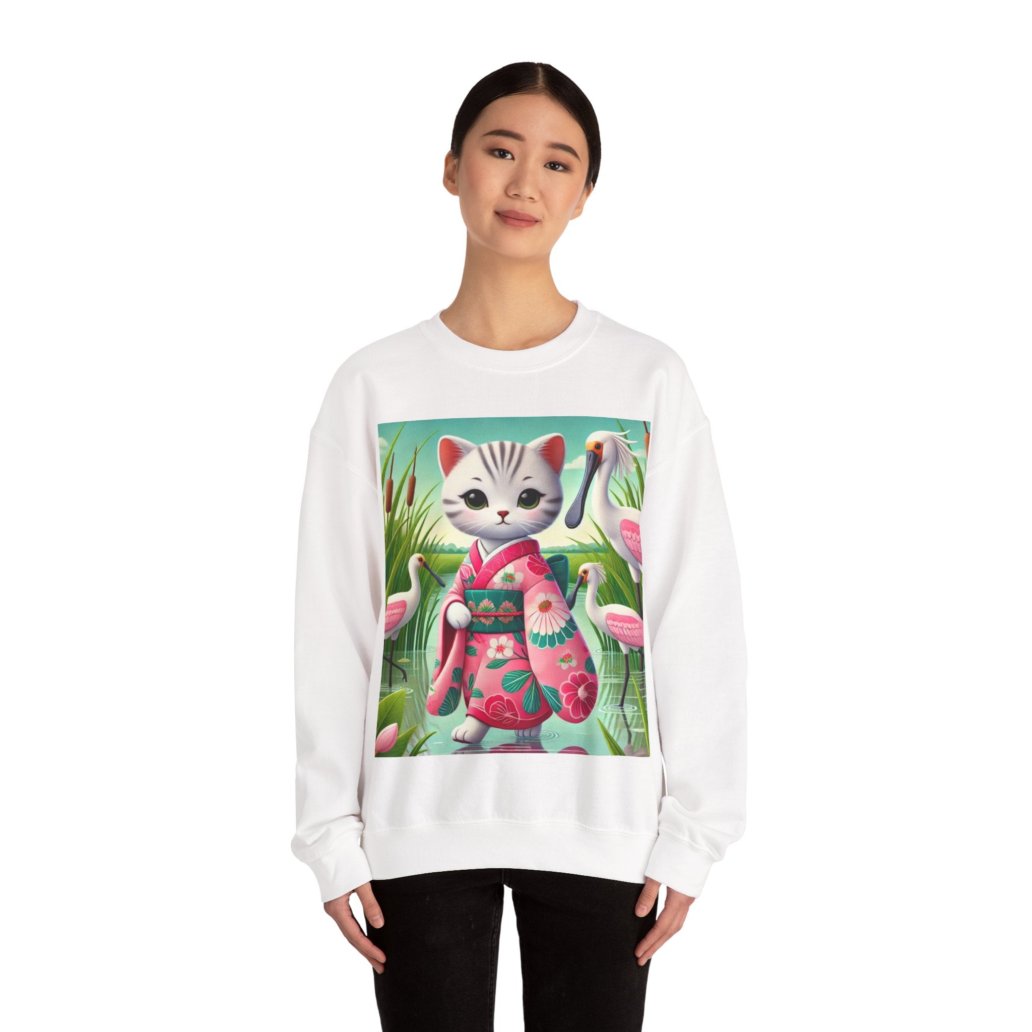 Geisha Kitten Strolls Among the Spoonbills Unisex Heavy Blend™ Crewneck Sweatshirt brings a touch of serene charm and whimsical elegance to everyday wear. This Gildan 18000 sweatshirt is a unisex heavy blend crewneck made from a 50/50 cotton-polyester fabric, combining softness with lasting durability. Its smooth surface supports crisp, vibrant prints, while the seamless body design helps reduce irritation. A ribbed-knit collar and reinforced cuffs help the fit hold steady through repeated wear, making it a practical and comfortable layer for cooler days.